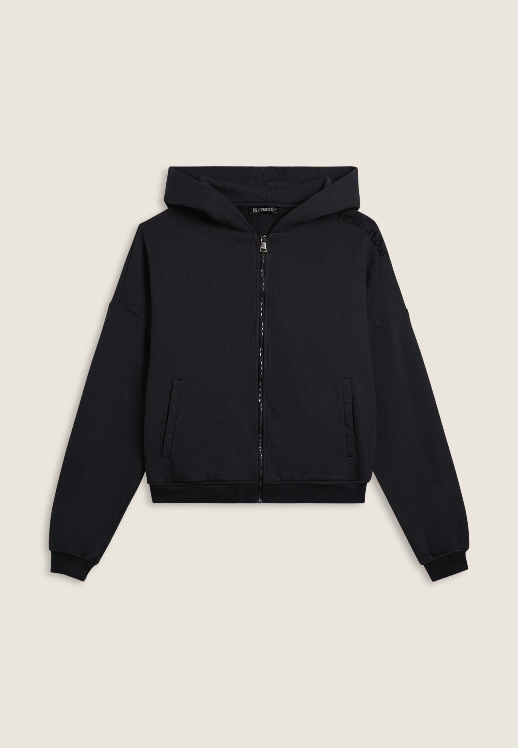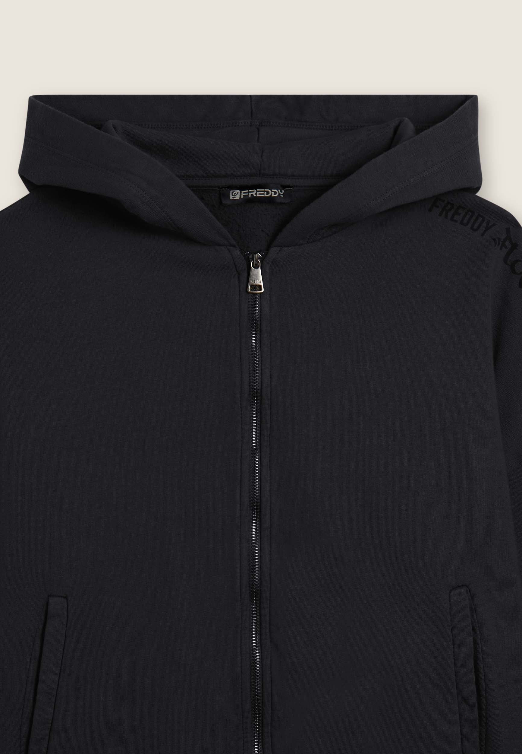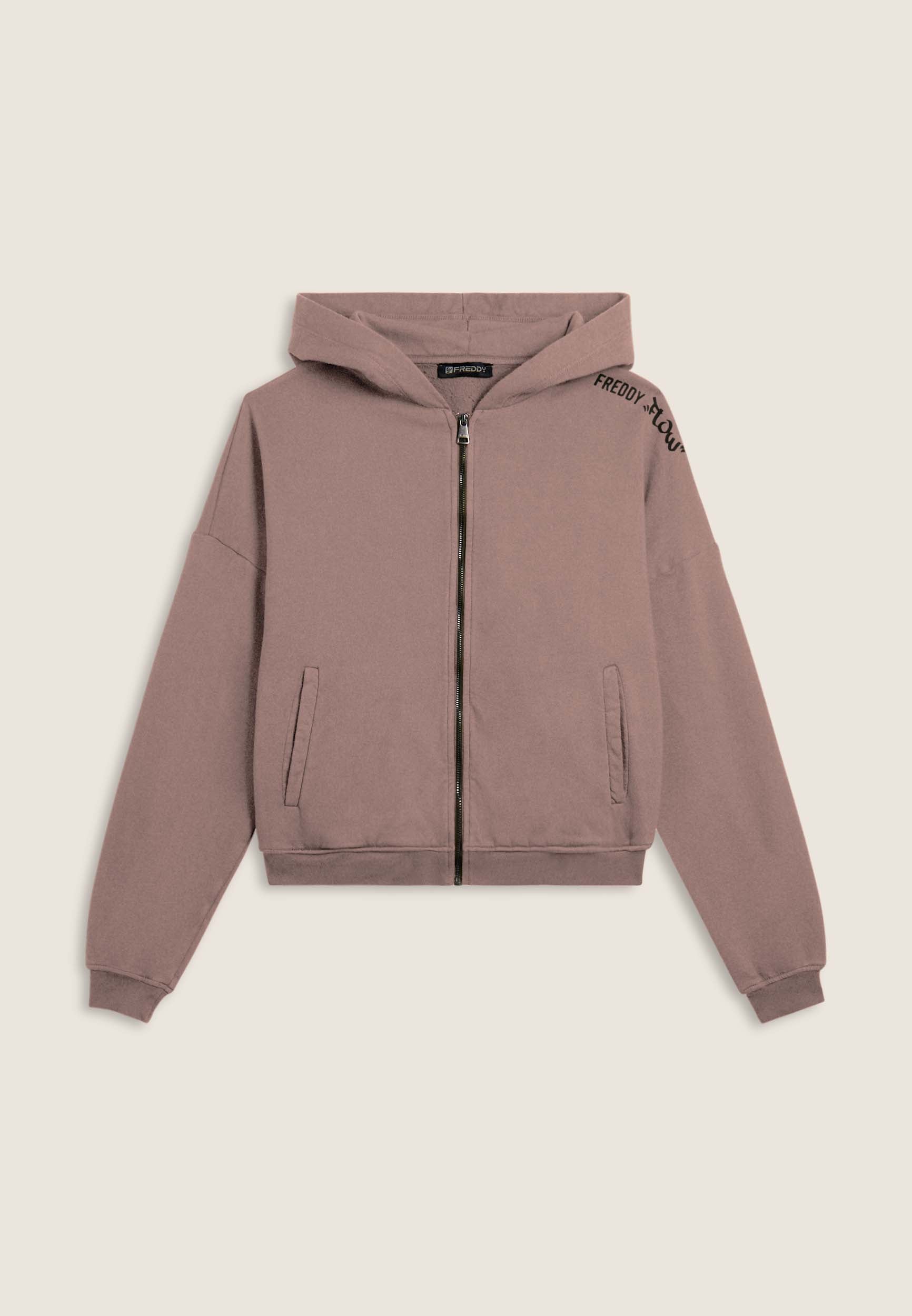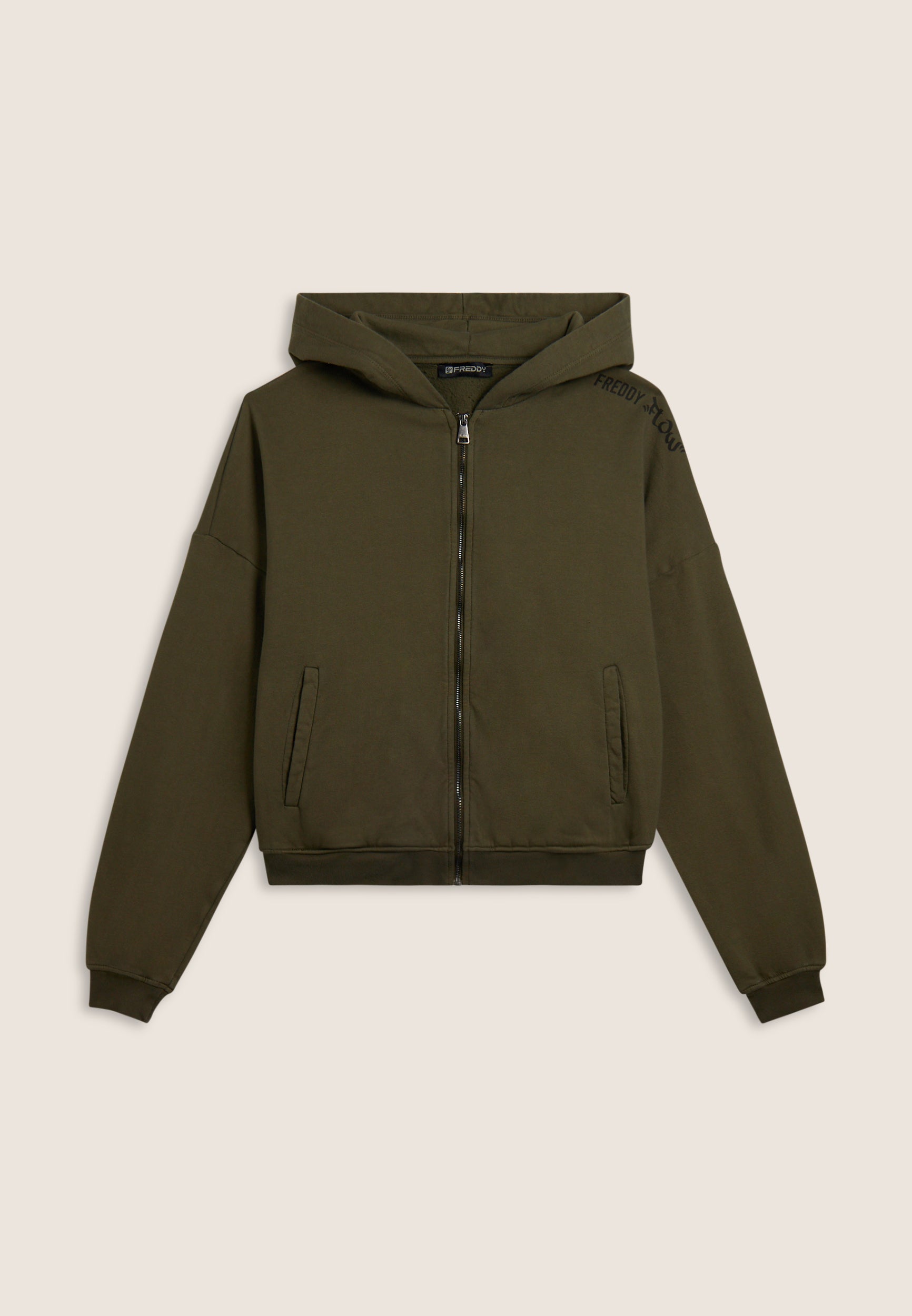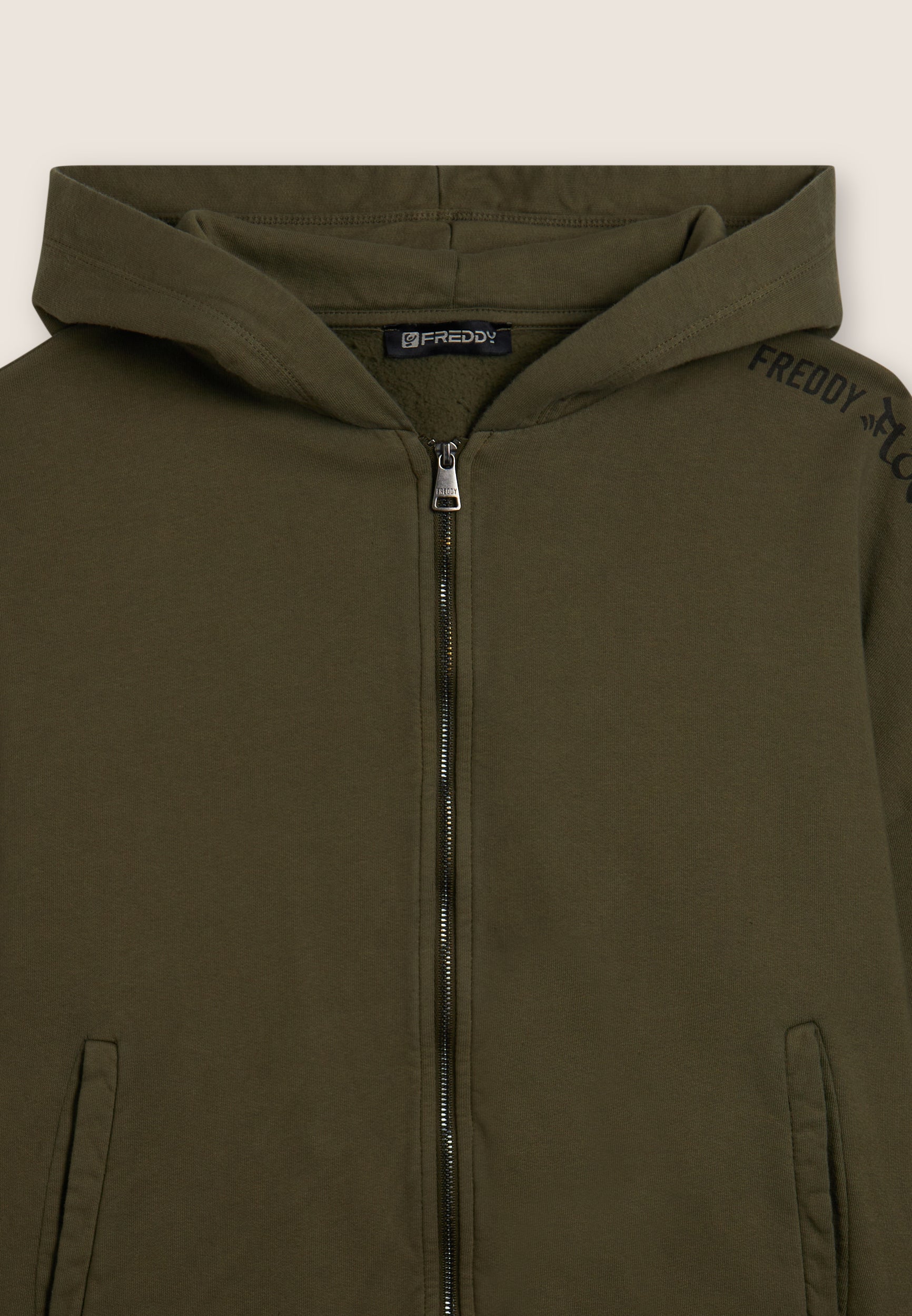 Comfortable, warm and super street: this oversized cropped full-zip sweatshirt mixes urban style with cool details. The large "Flow" print on the back and FREDDY logo on the left shoulder create a look that stands out. The brushed fleece, dyed with enzymes, provides bright colours and crazy comfort. Lined hood, besom pockets and oversized fit for relaxed everyday wear.