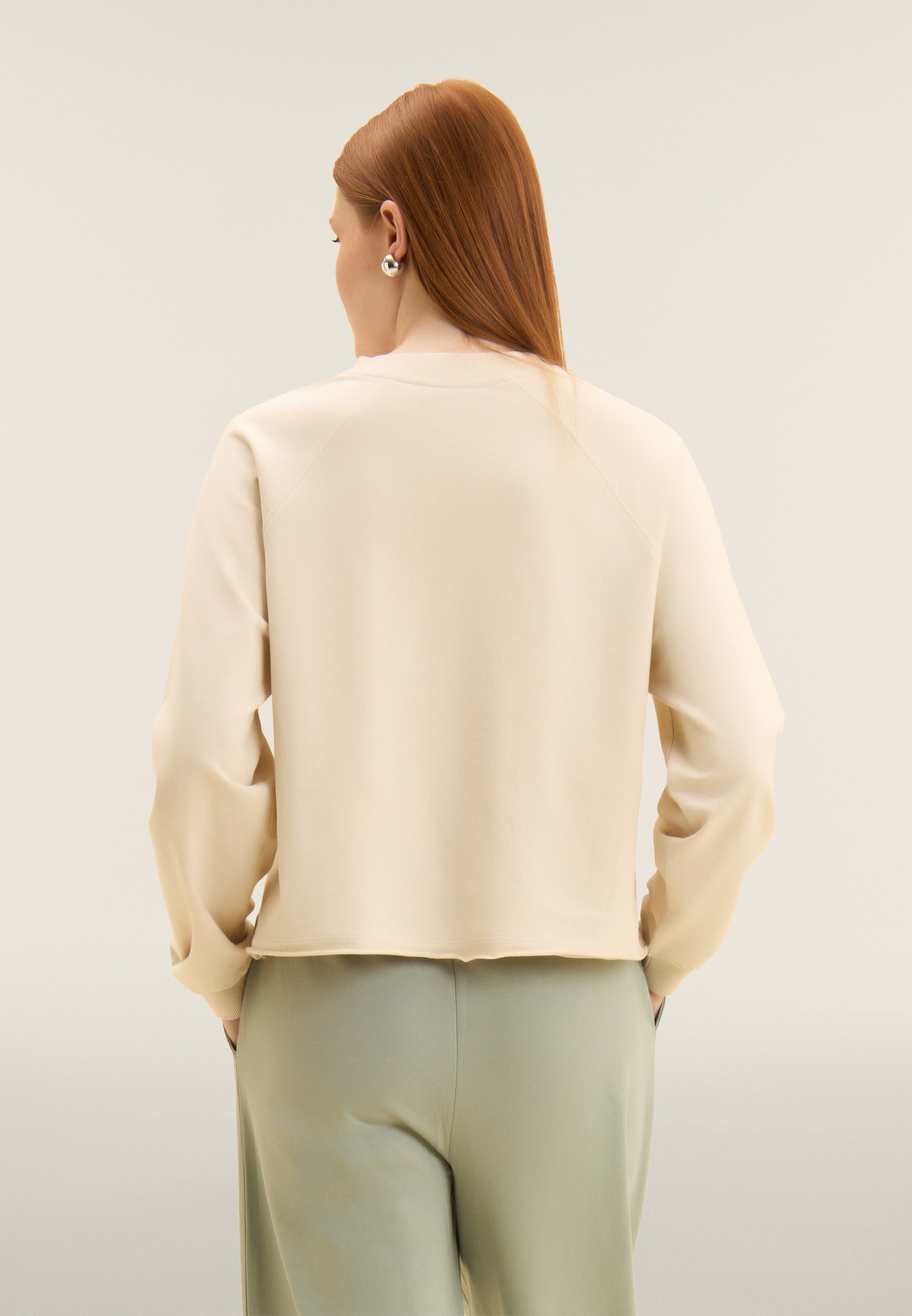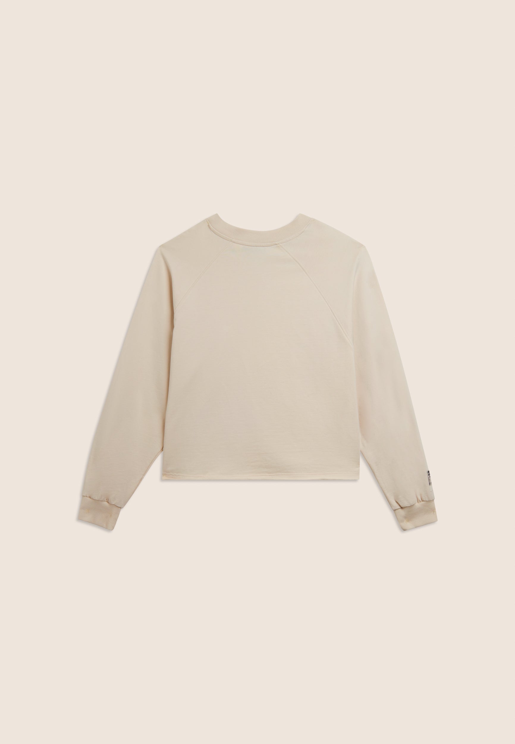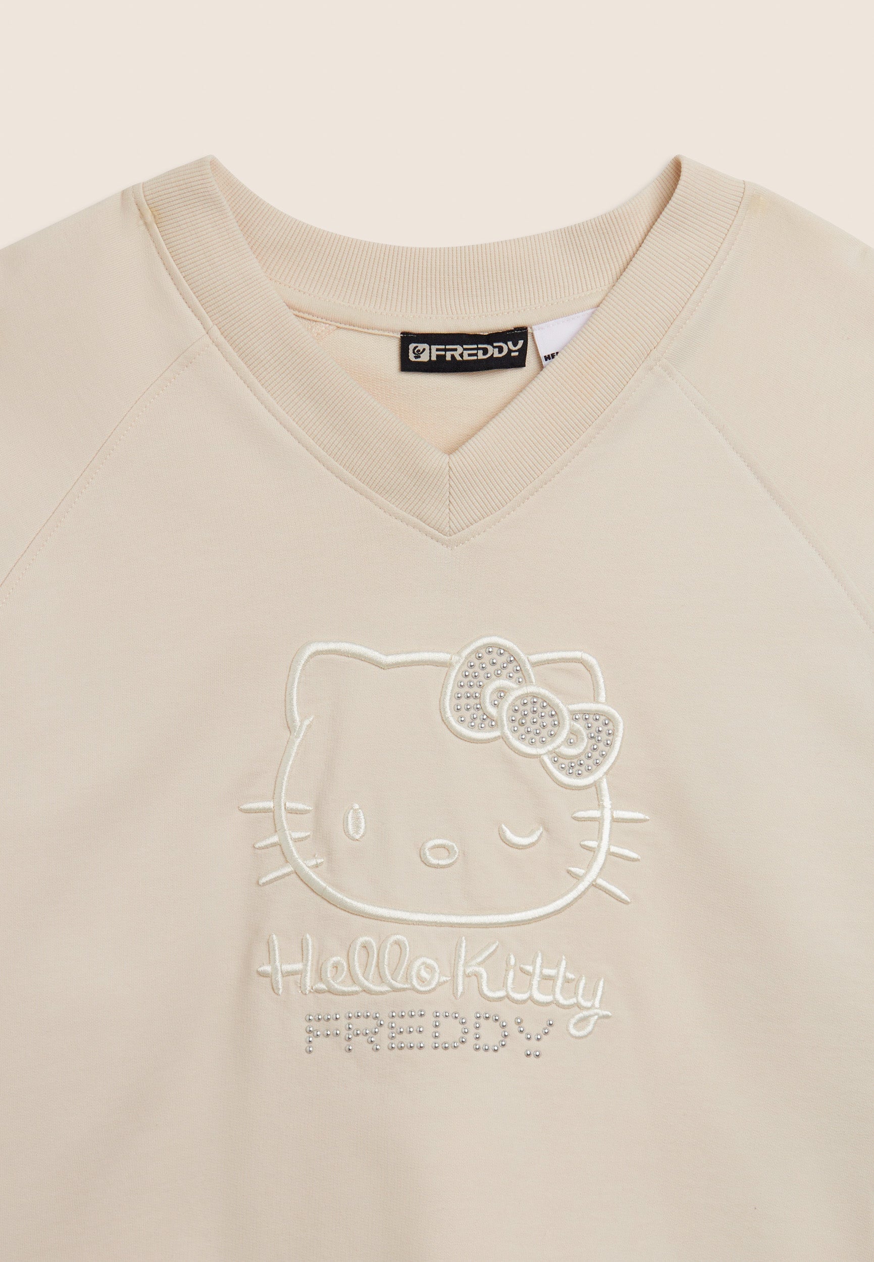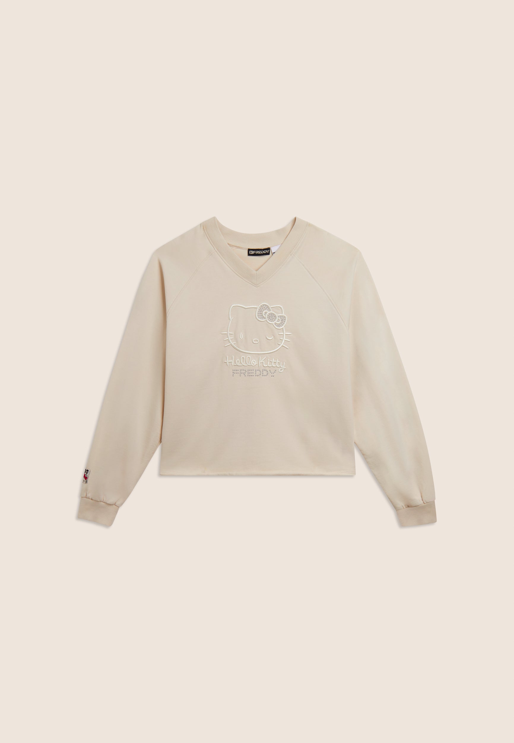 Comfortable and versatile sweatshirt with a regular length and straight unfinished effect bottom. The design is enhanced by a ribbed V-neck and raglan sleeves with cuffs for a dynamic touch. The tone-on-tone Hello Kitty embroidery is embellished with studs that decorate the bow and the FREDDY logo, for a discreet yet sophisticated effect. Made of 100% cotton French terry, it is ideal for leisure in style.