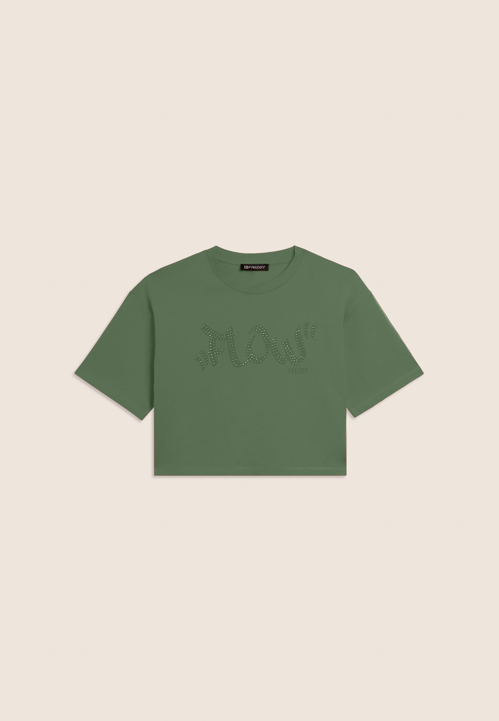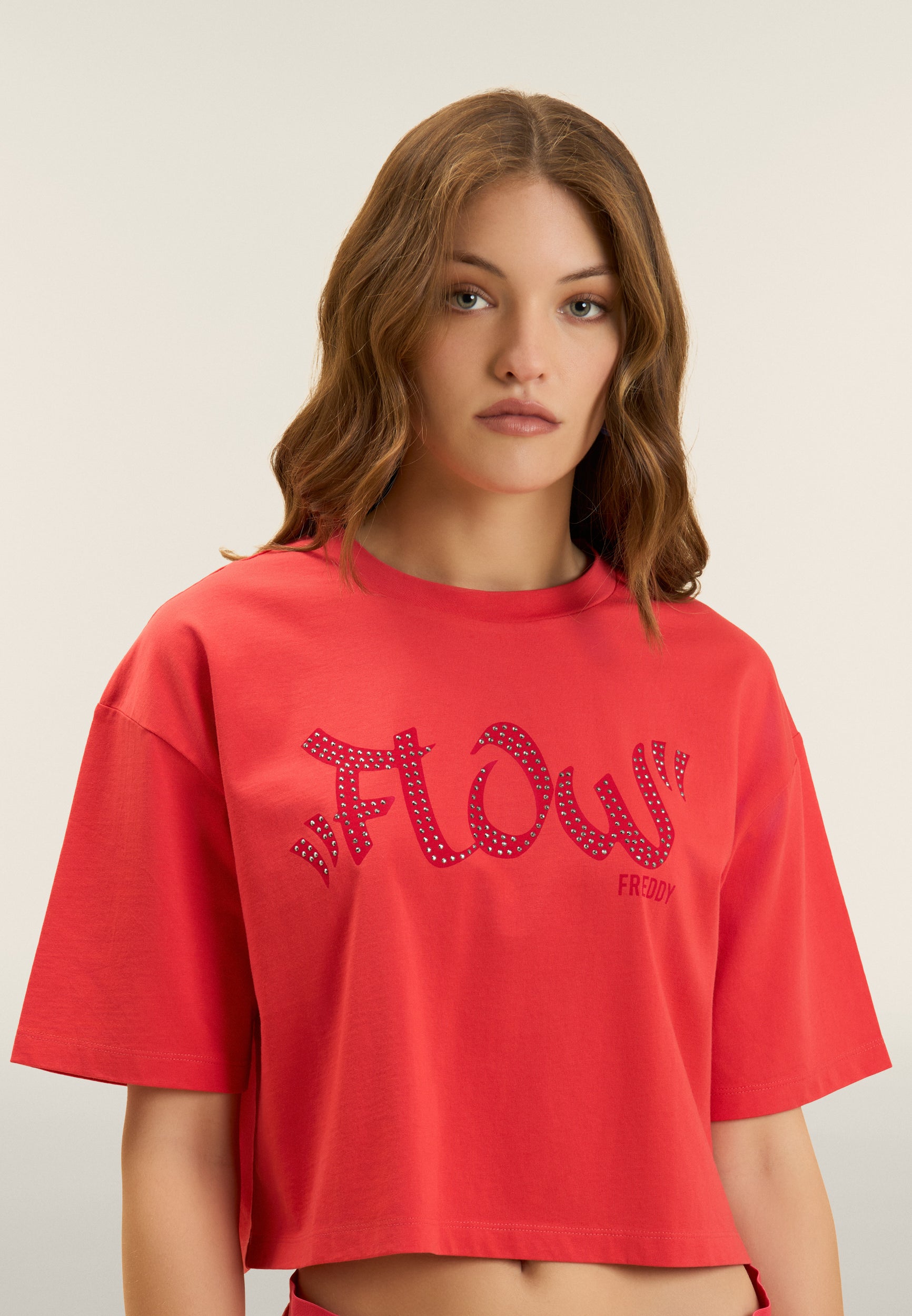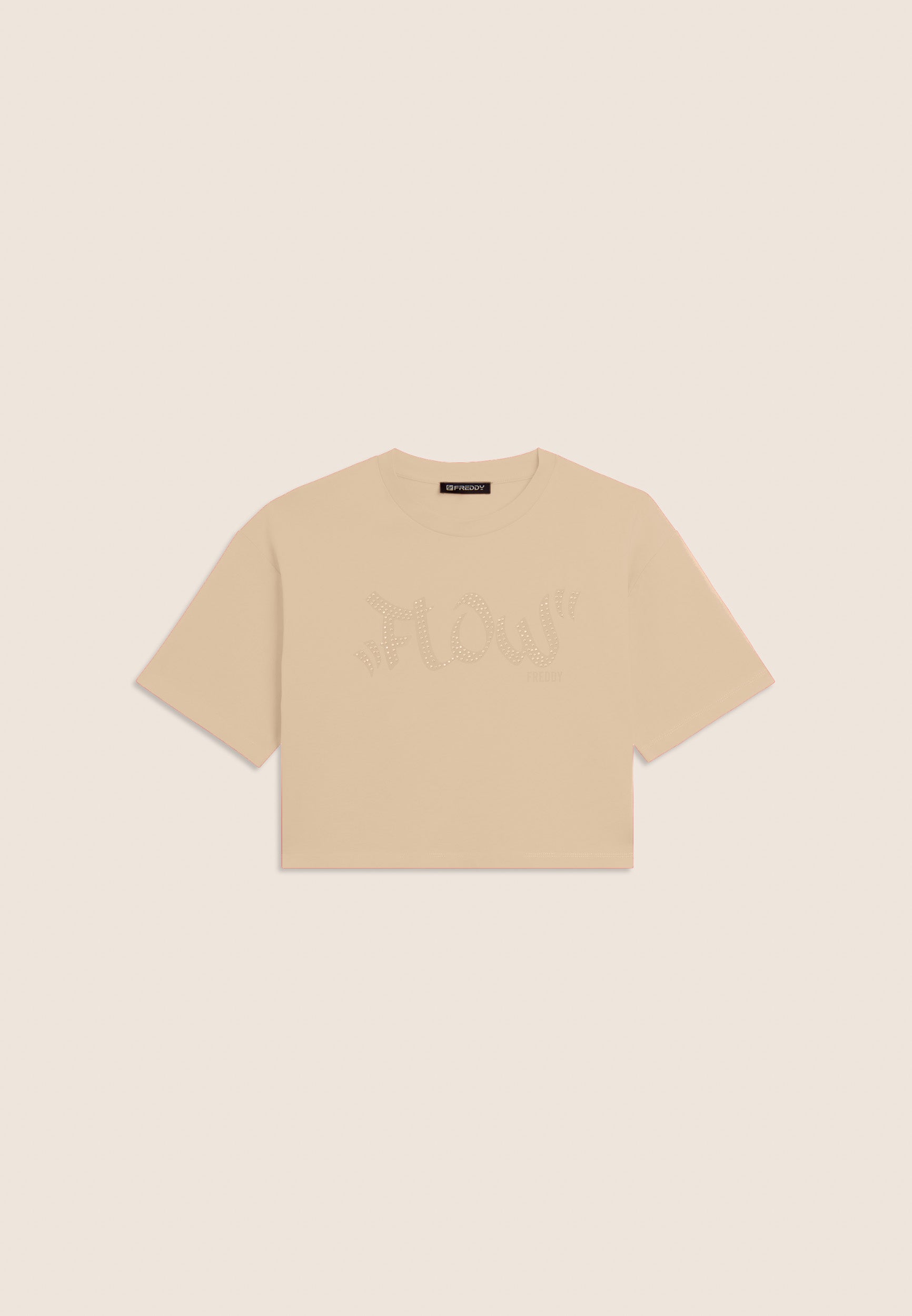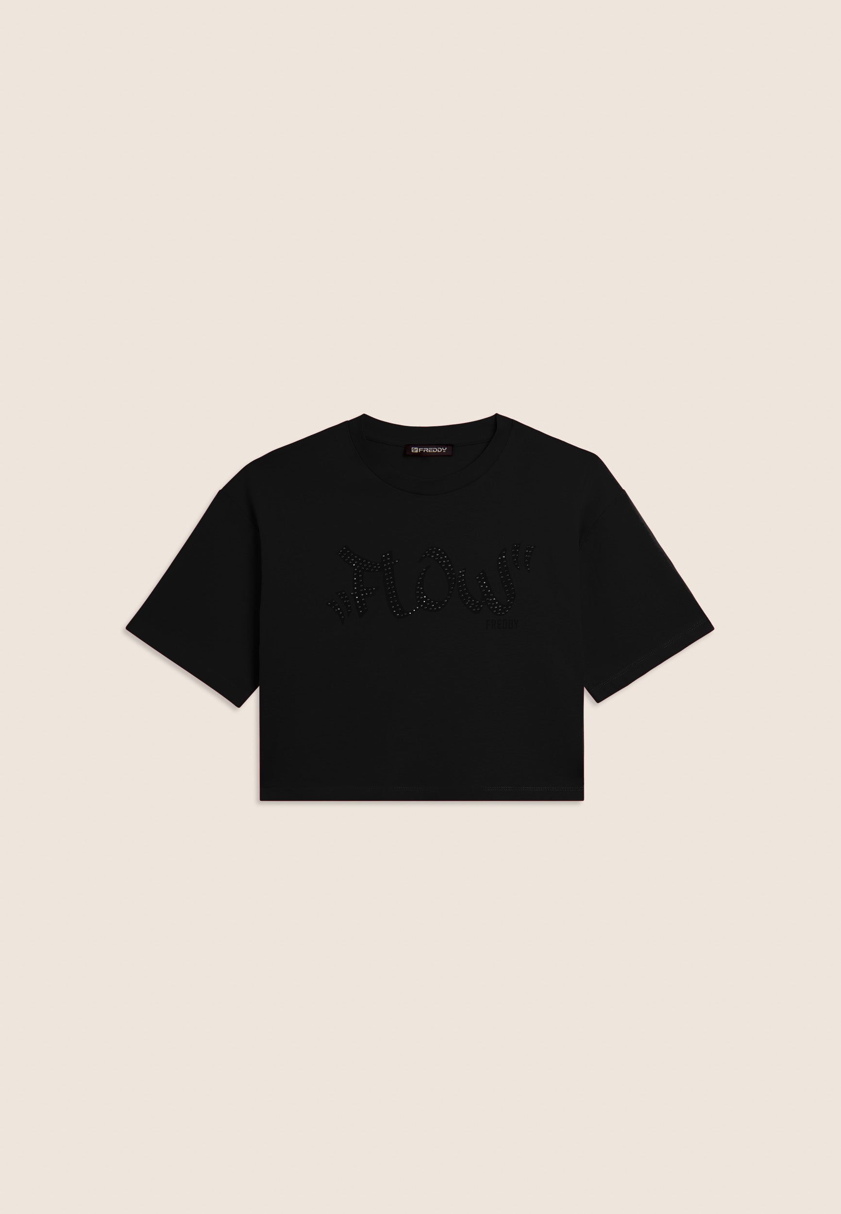Cropped t-shirt in 100% cotton jersey, treated with enzymes to ensure softness and resistance. The straight hem and short sleeves with dropped shoulders contribute to a relaxed fit, and the large “FLOW” print on the front, decorated with studs, captures the urban essence of street art. A fresh and dynamic garment for every casual and sporty occasion.