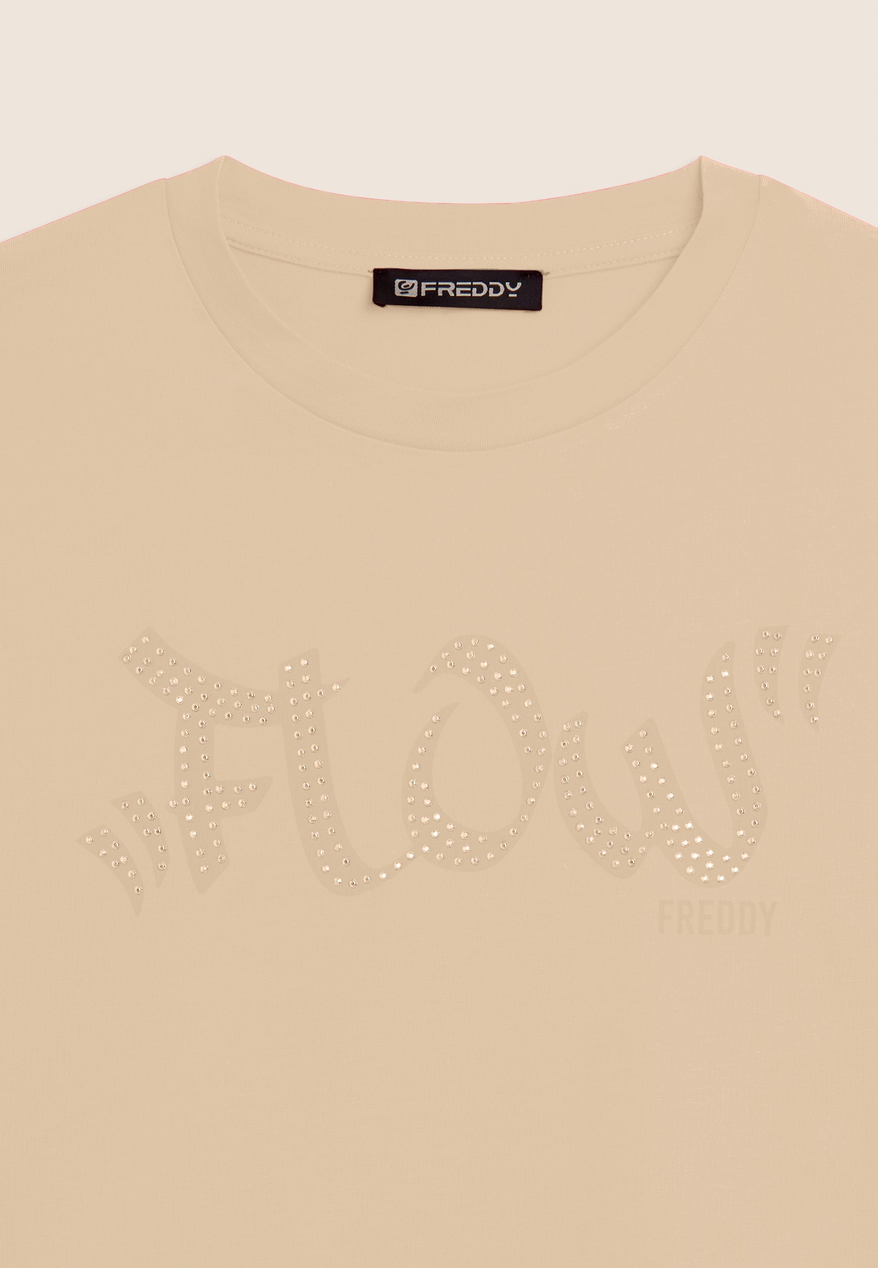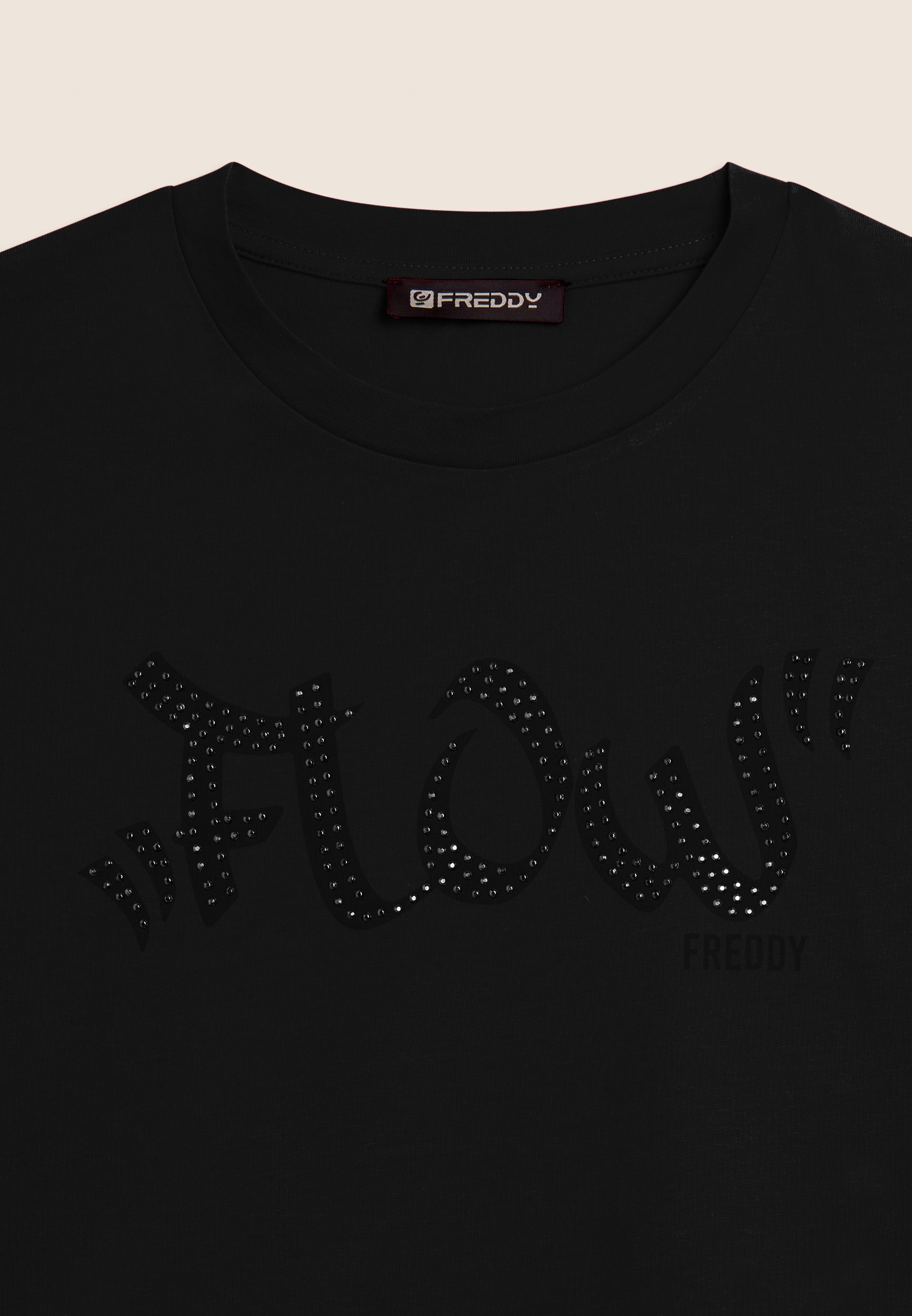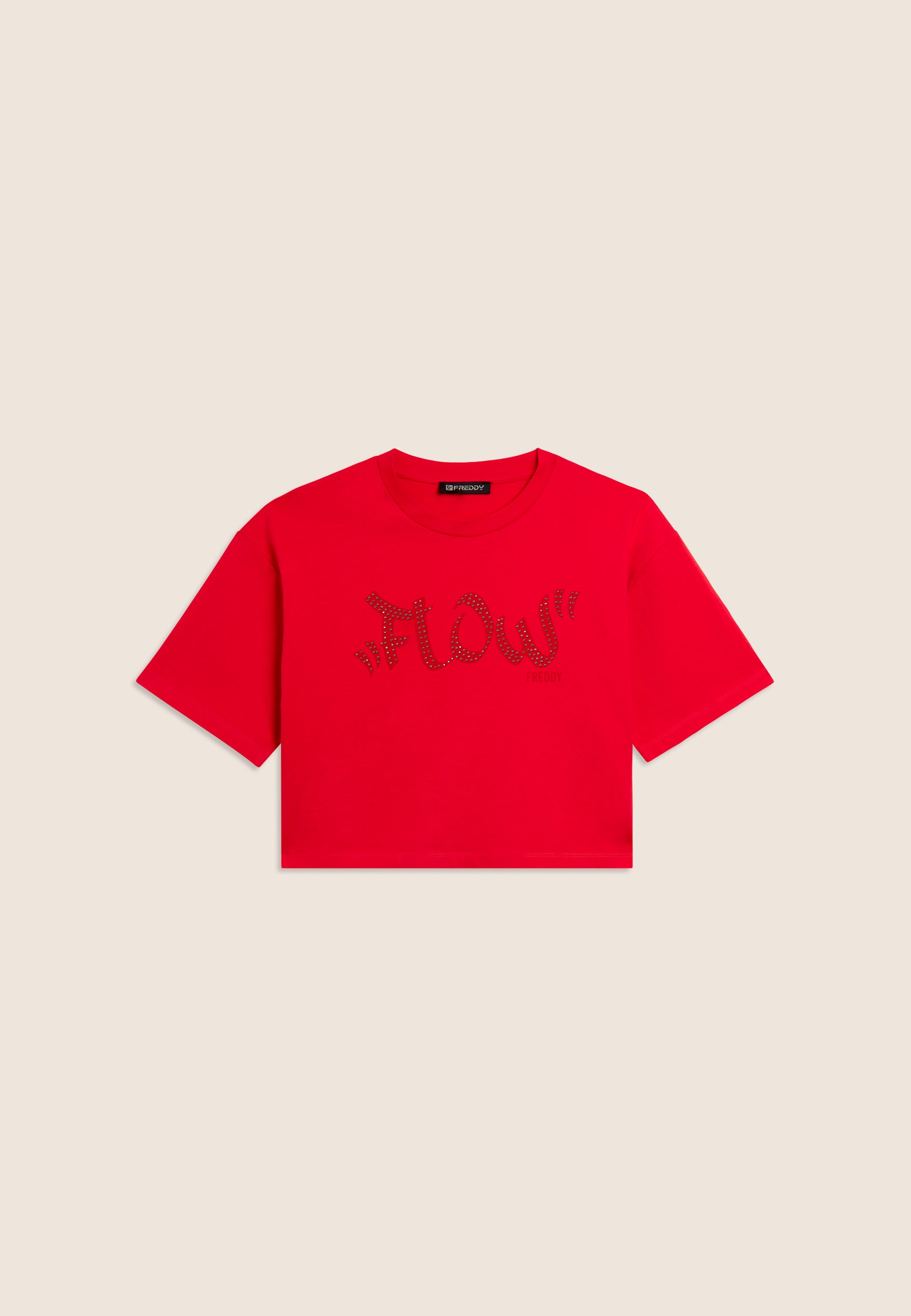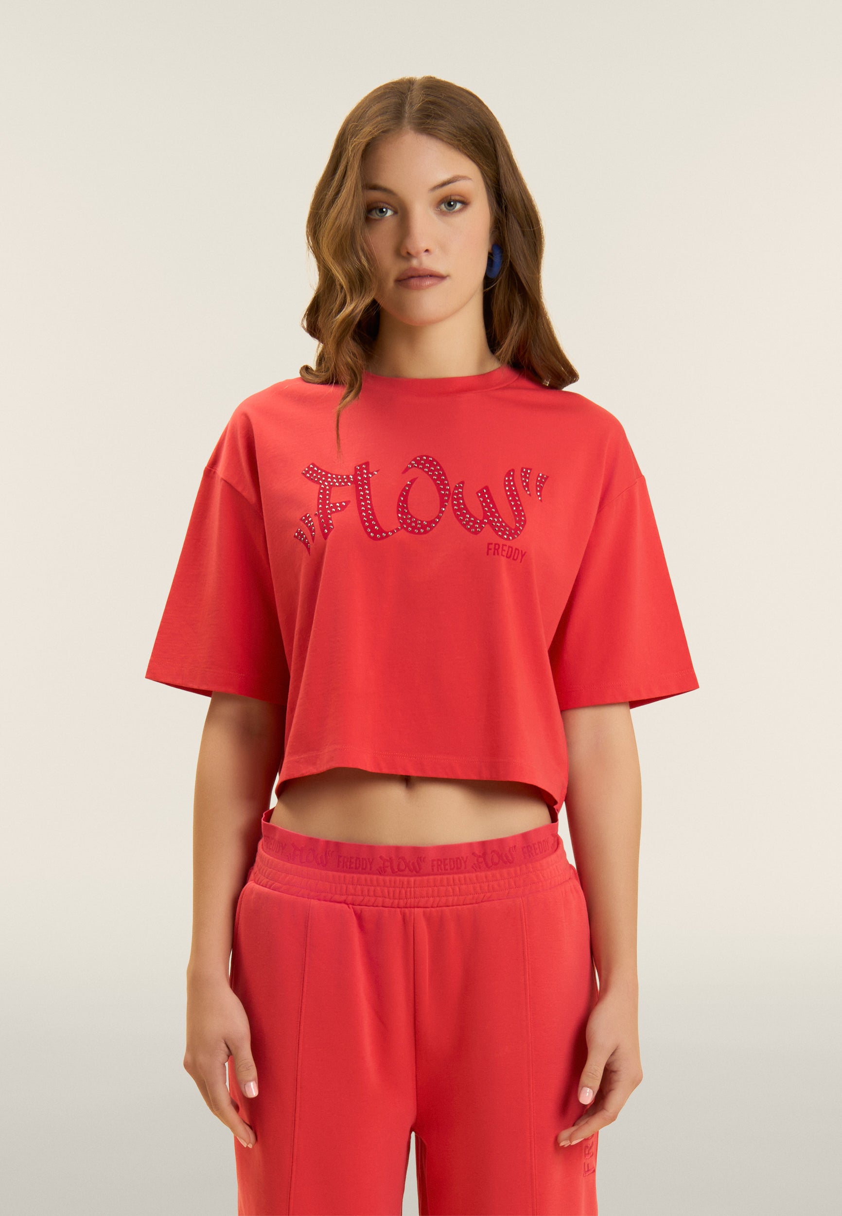 Cropped t-shirt in 100% cotton jersey, treated with enzymes to ensure softness and resistance. The straight hem and short sleeves with dropped shoulders contribute to a relaxed fit, and the large “FLOW” print on the front, decorated with studs, captures the urban essence of street art. A fresh and dynamic garment for every casual and sporty occasion.
