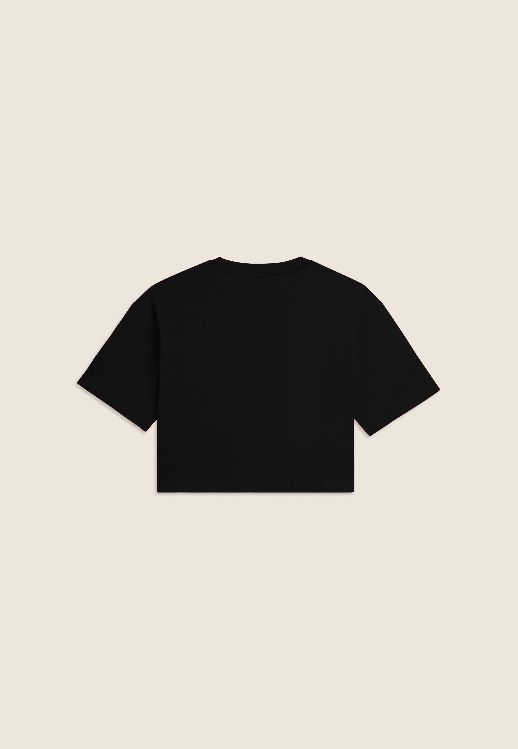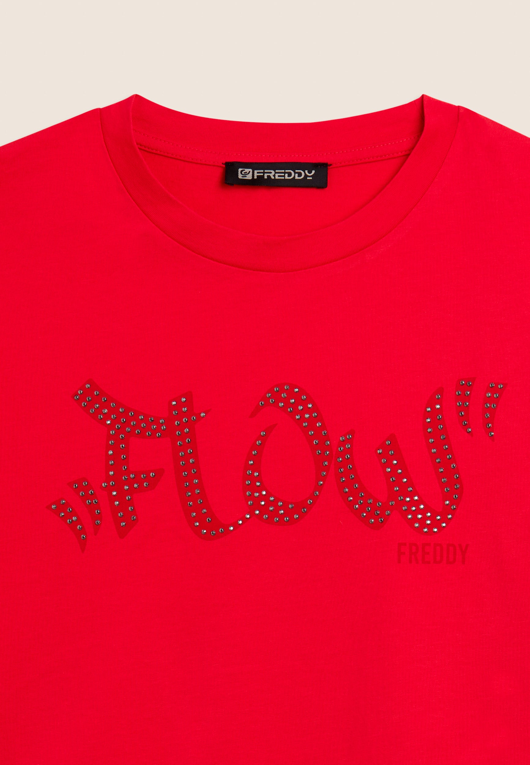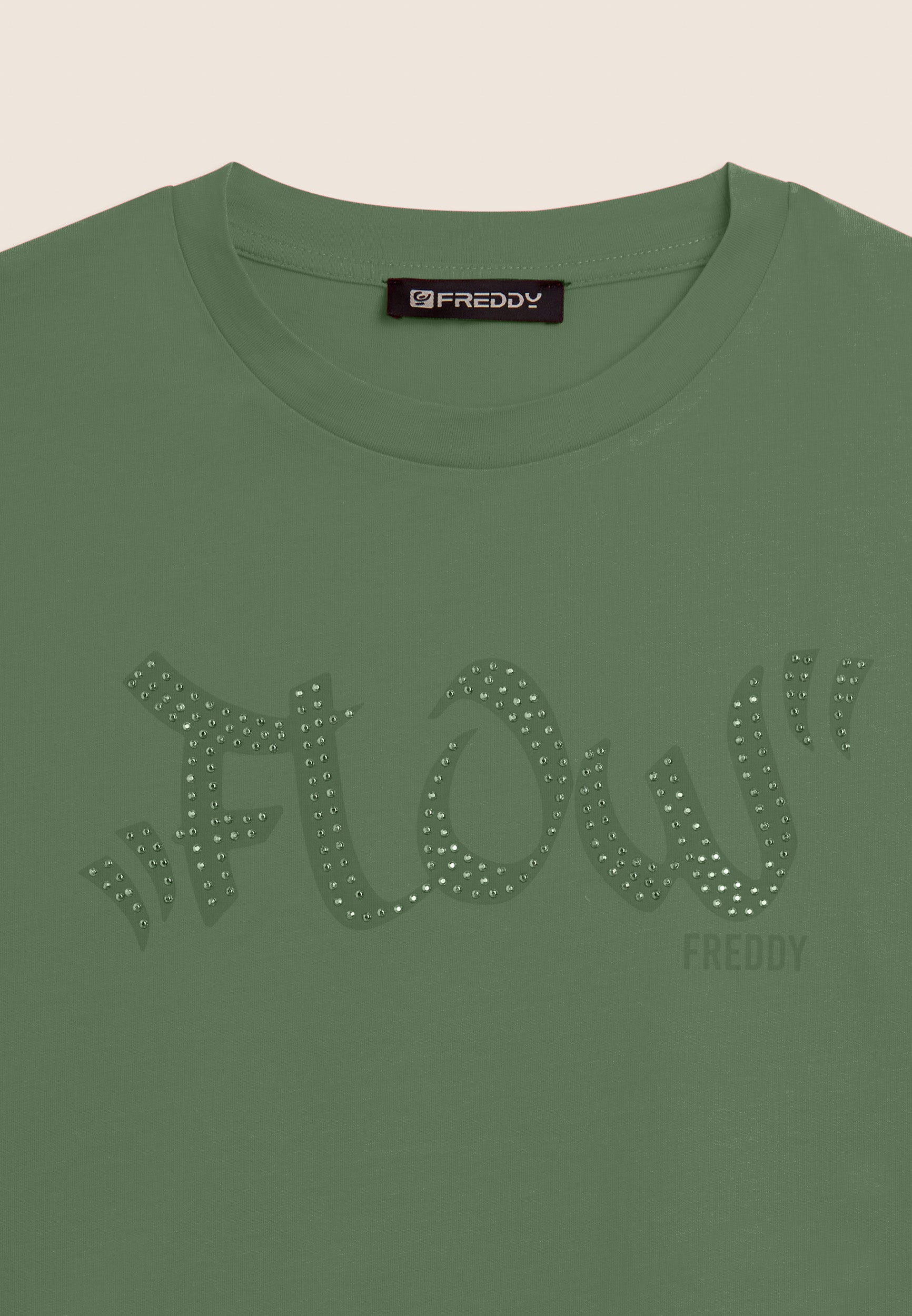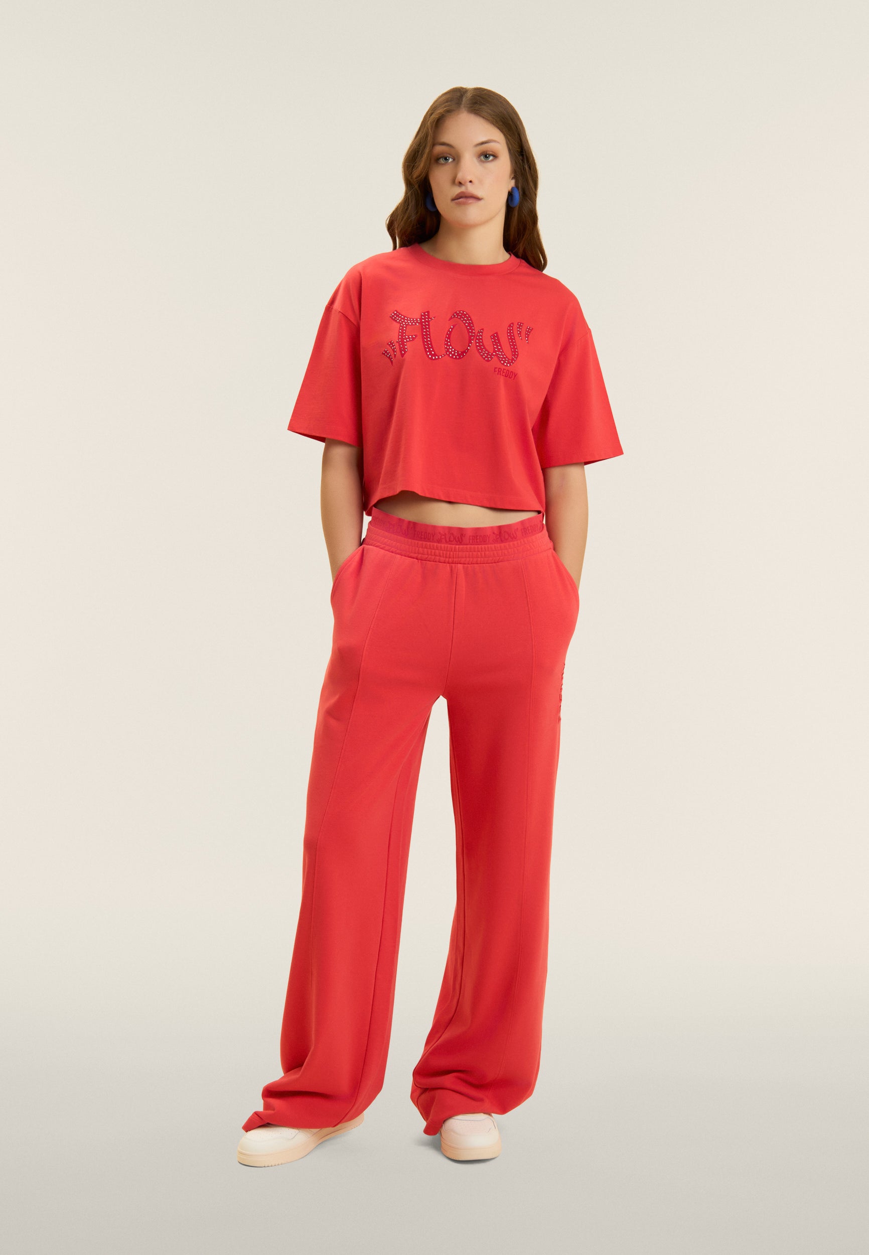 Cropped t-shirt in 100% cotton jersey, treated with enzymes to ensure softness and resistance. The straight hem and short sleeves with dropped shoulders contribute to a relaxed fit, and the large “FLOW” print on the front, decorated with studs, captures the urban essence of street art. A fresh and dynamic garment for every casual and sporty occasion.