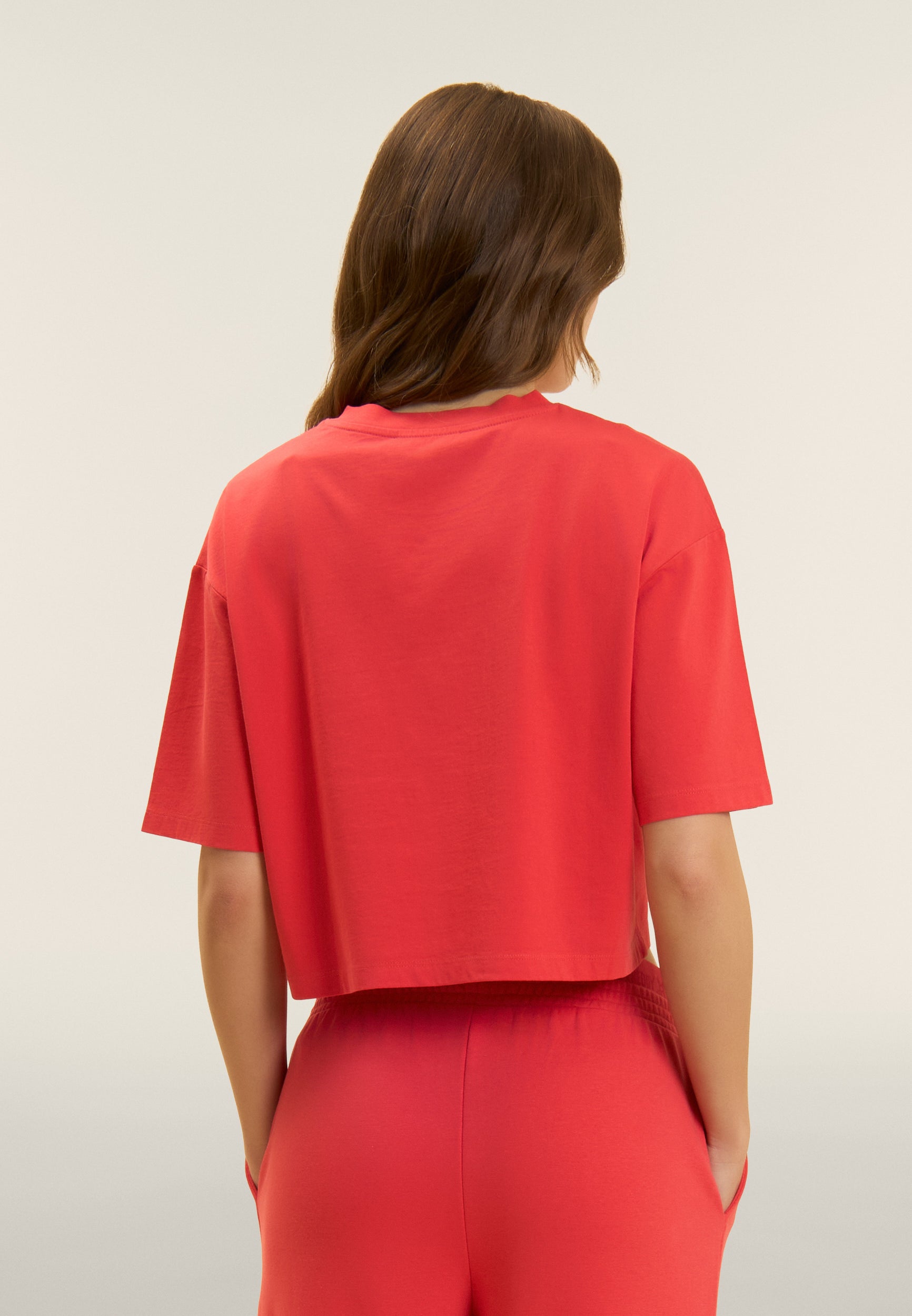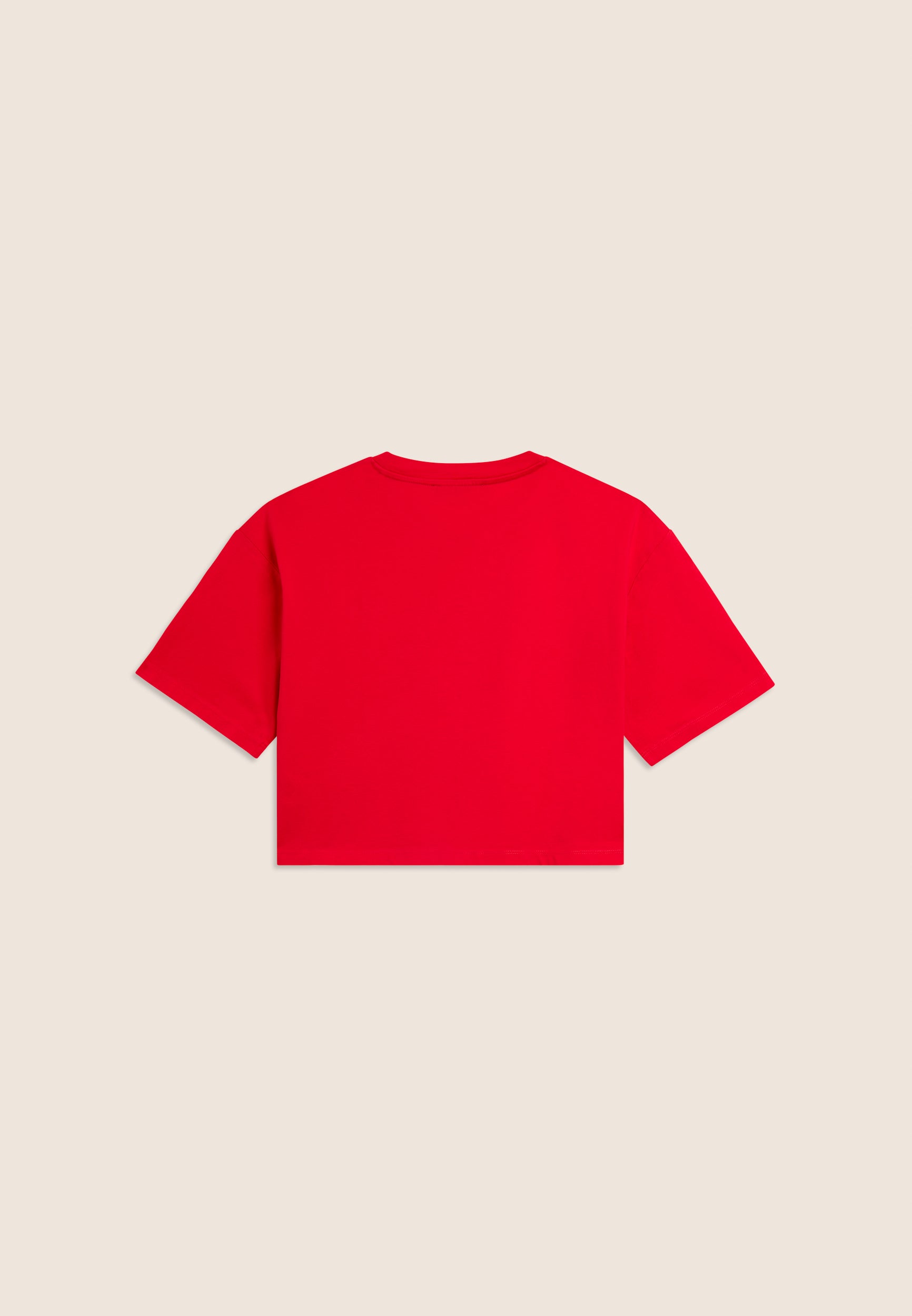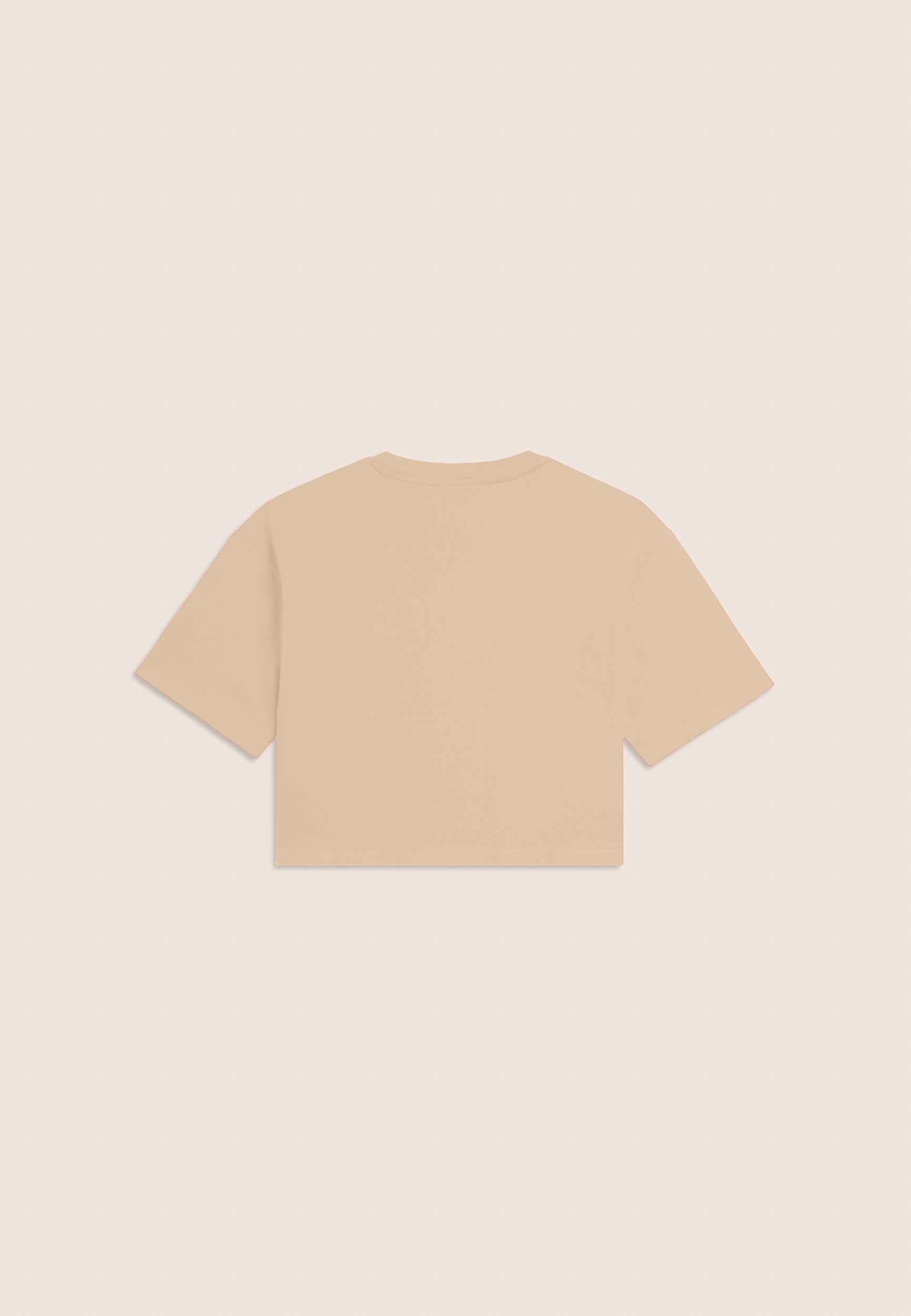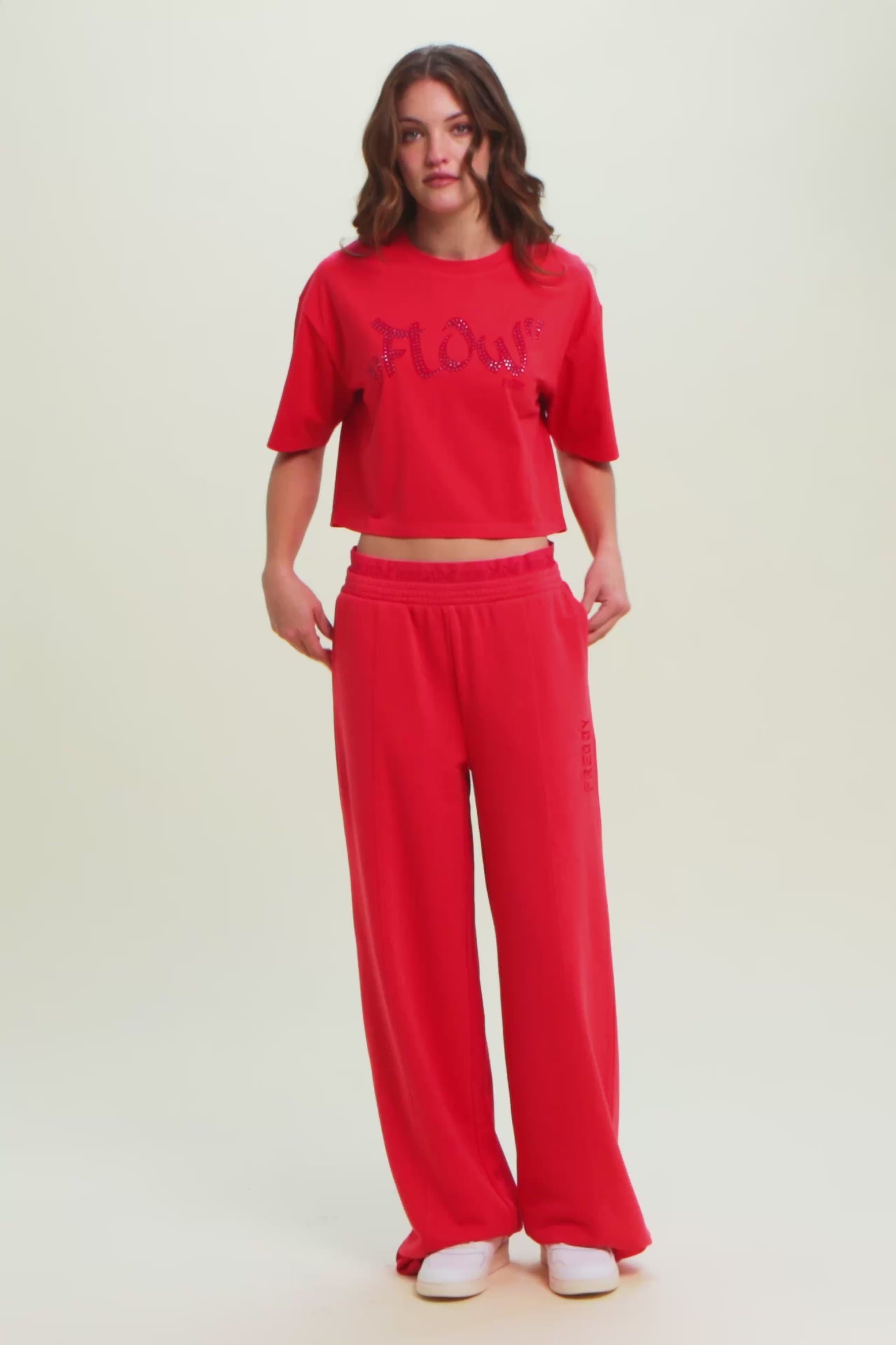 Cropped t-shirt in 100% cotton jersey, treated with enzymes to ensure softness and resistance. The straight hem and short sleeves with dropped shoulders contribute to a relaxed fit, and the large “FLOW” print on the front, decorated with studs, captures the urban essence of street art. A fresh and dynamic garment for every casual and sporty occasion.