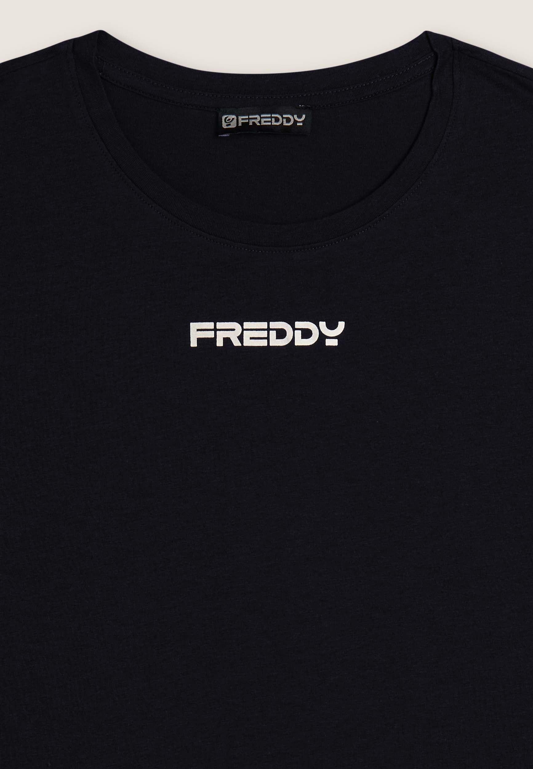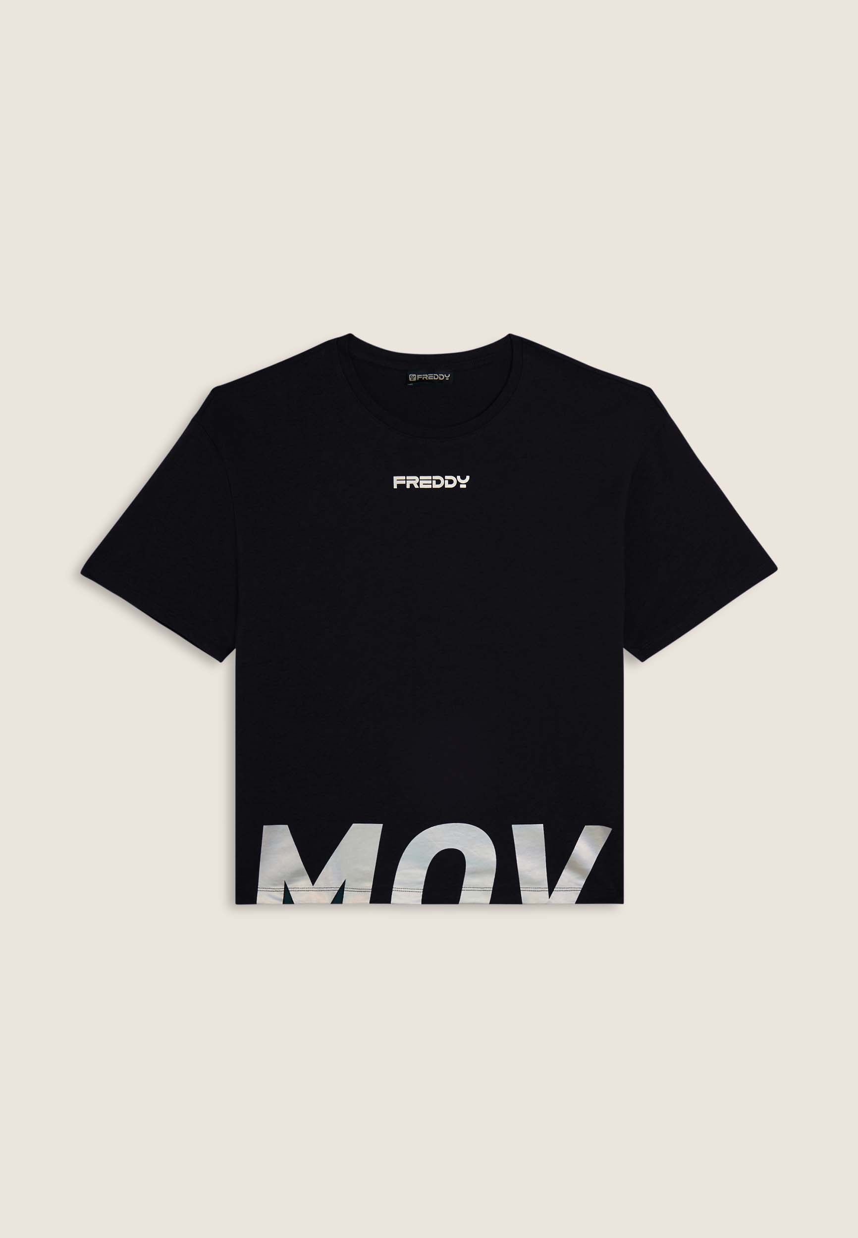 Comfort fit T-shirt with slightly cropped cut and small side vents that give movement to the silhouette. Wide sleeves with dropped shoulders offer freedom of movement. The “MOV” pearl-effect print, cut-out at the base, and the logo under the neckline complete this lightweight jersey garment, ideal for training and for leisure.