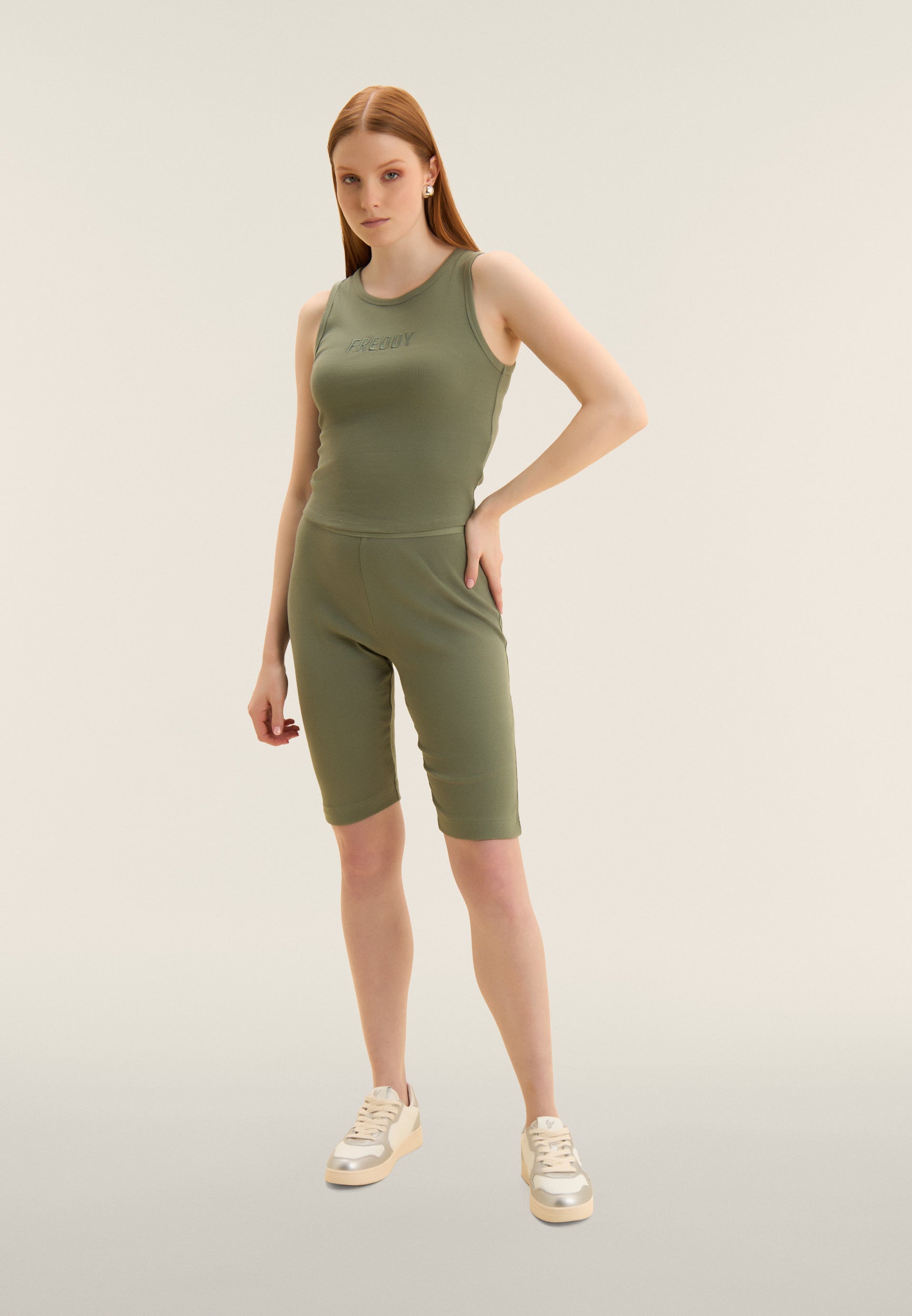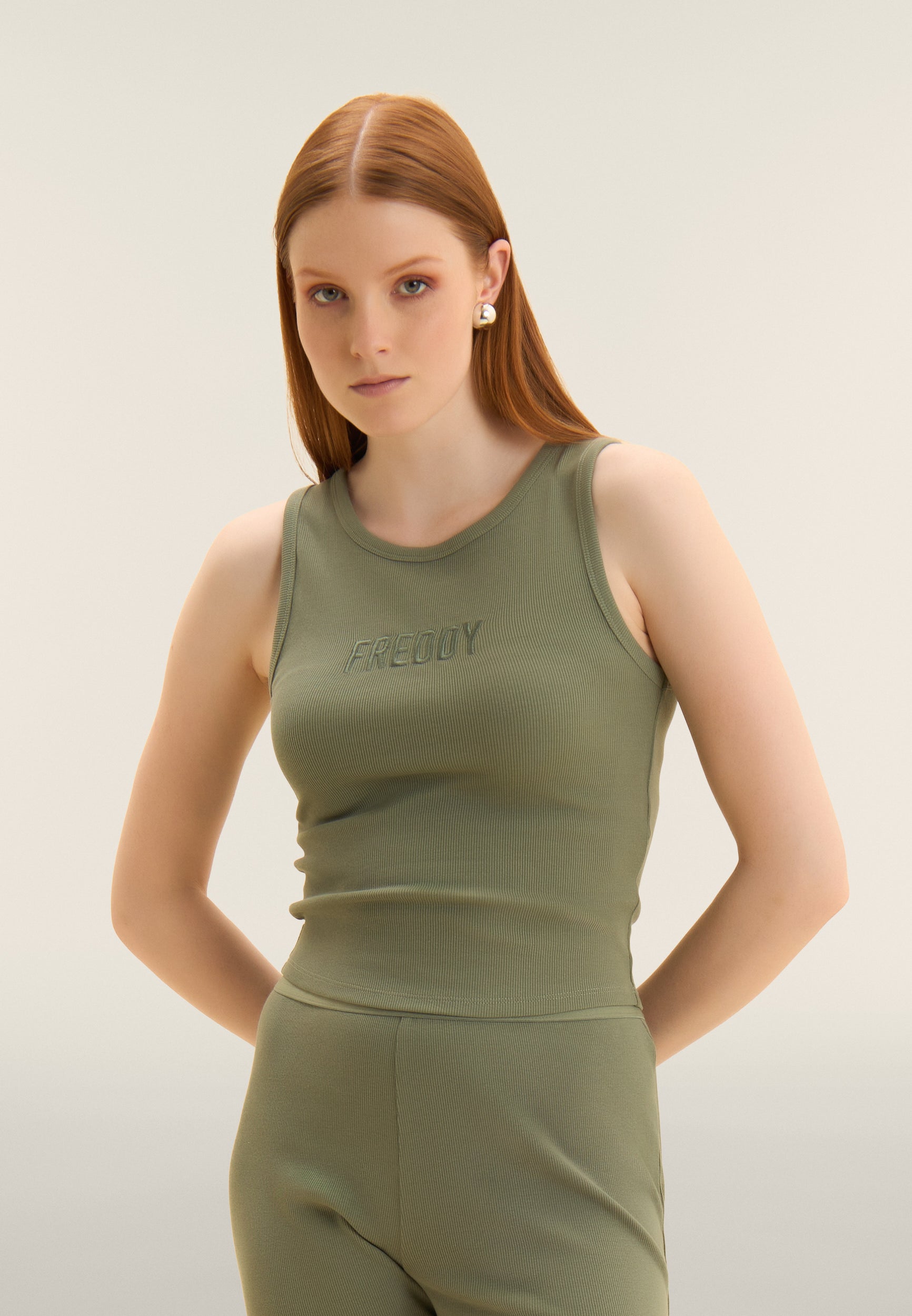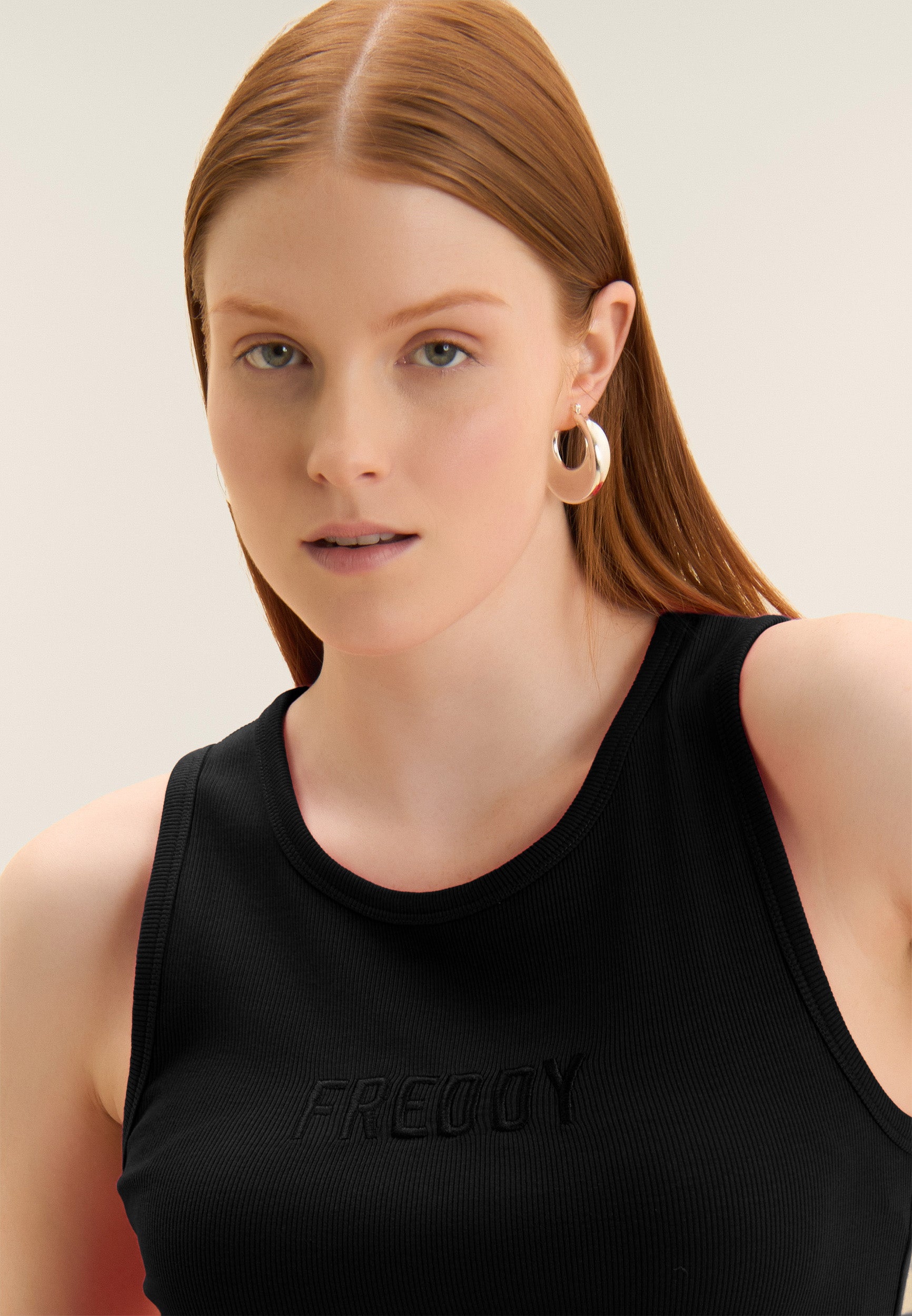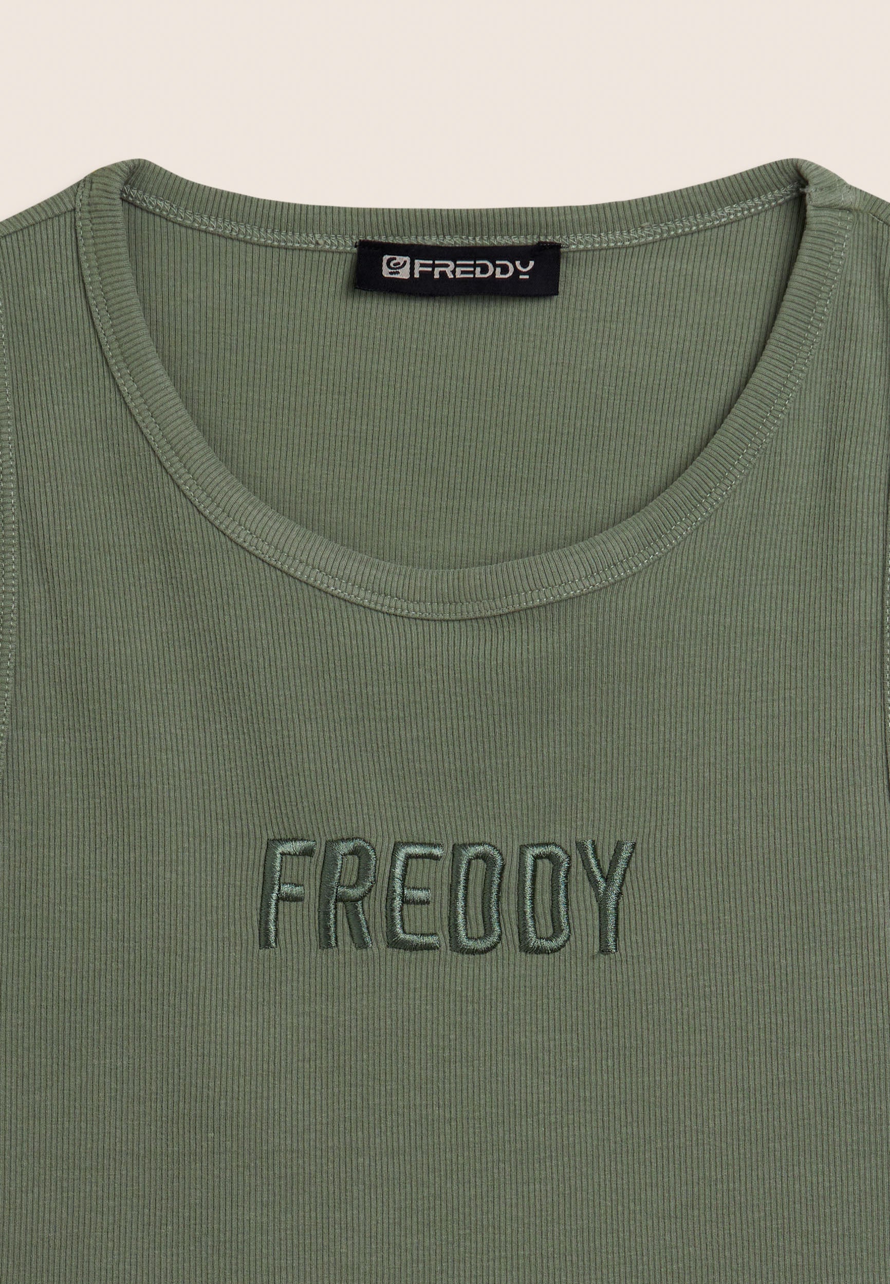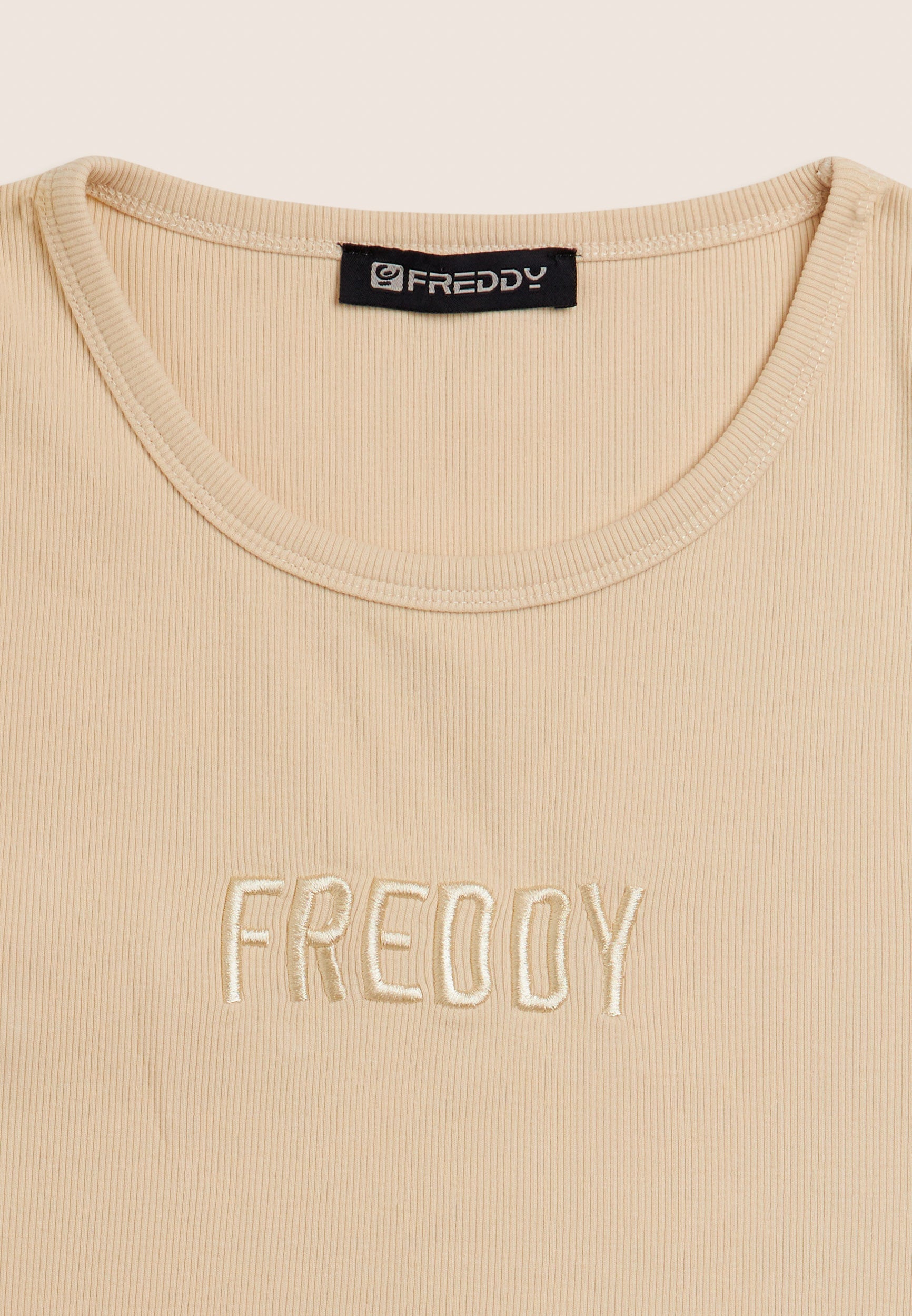 Close-fitting cropped tank top in stretch ribbed cotton, treated with enzymes for optimal colour movement and long-lasting softness. The round neck ad regular shoulder straps ensure a comfortable fit. The embroidered “FREDDY” logo on the front adds a distinctive and refined touch. A perfect garment for those seeking comfort and urban style, with a dynamic design inspired by street art.