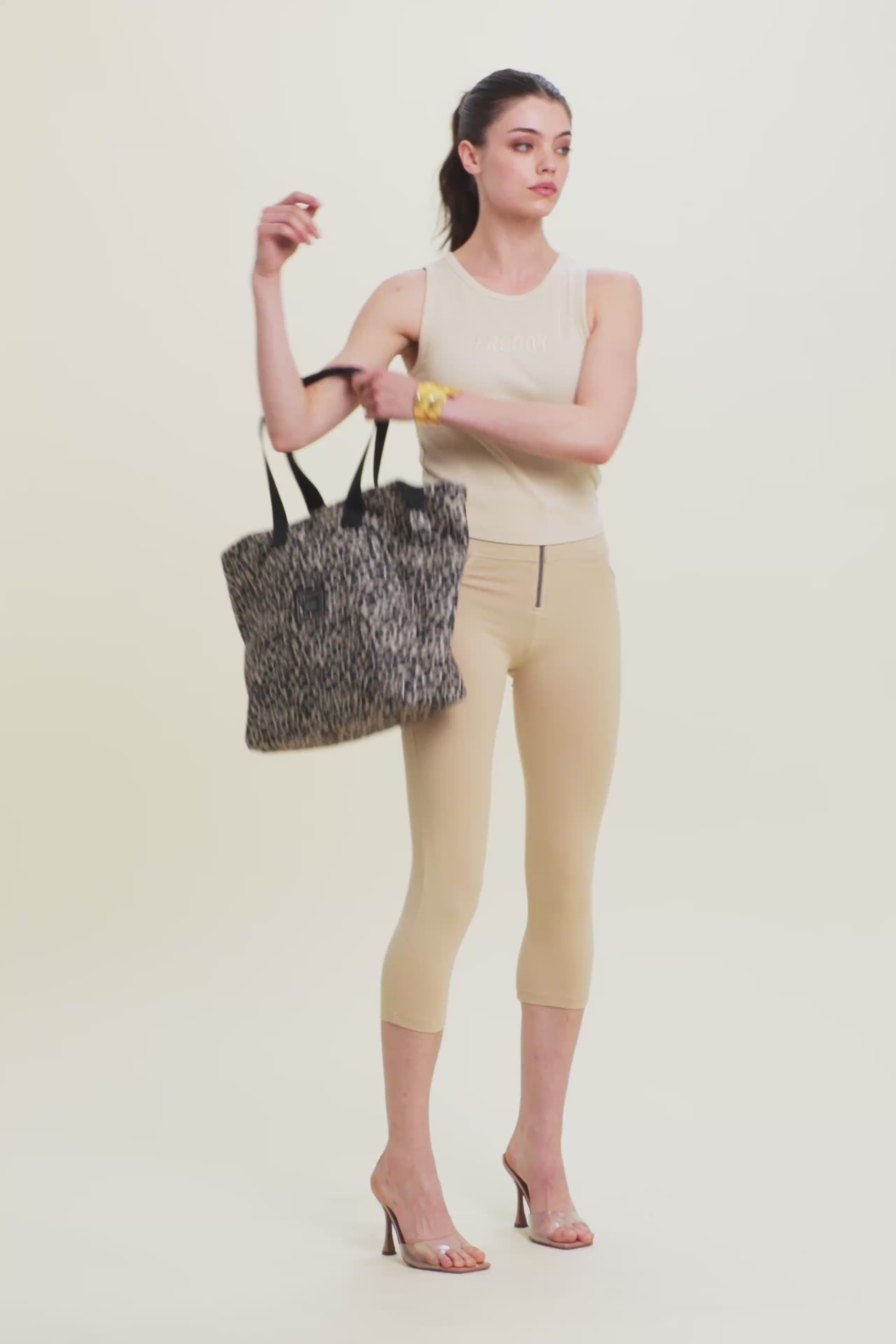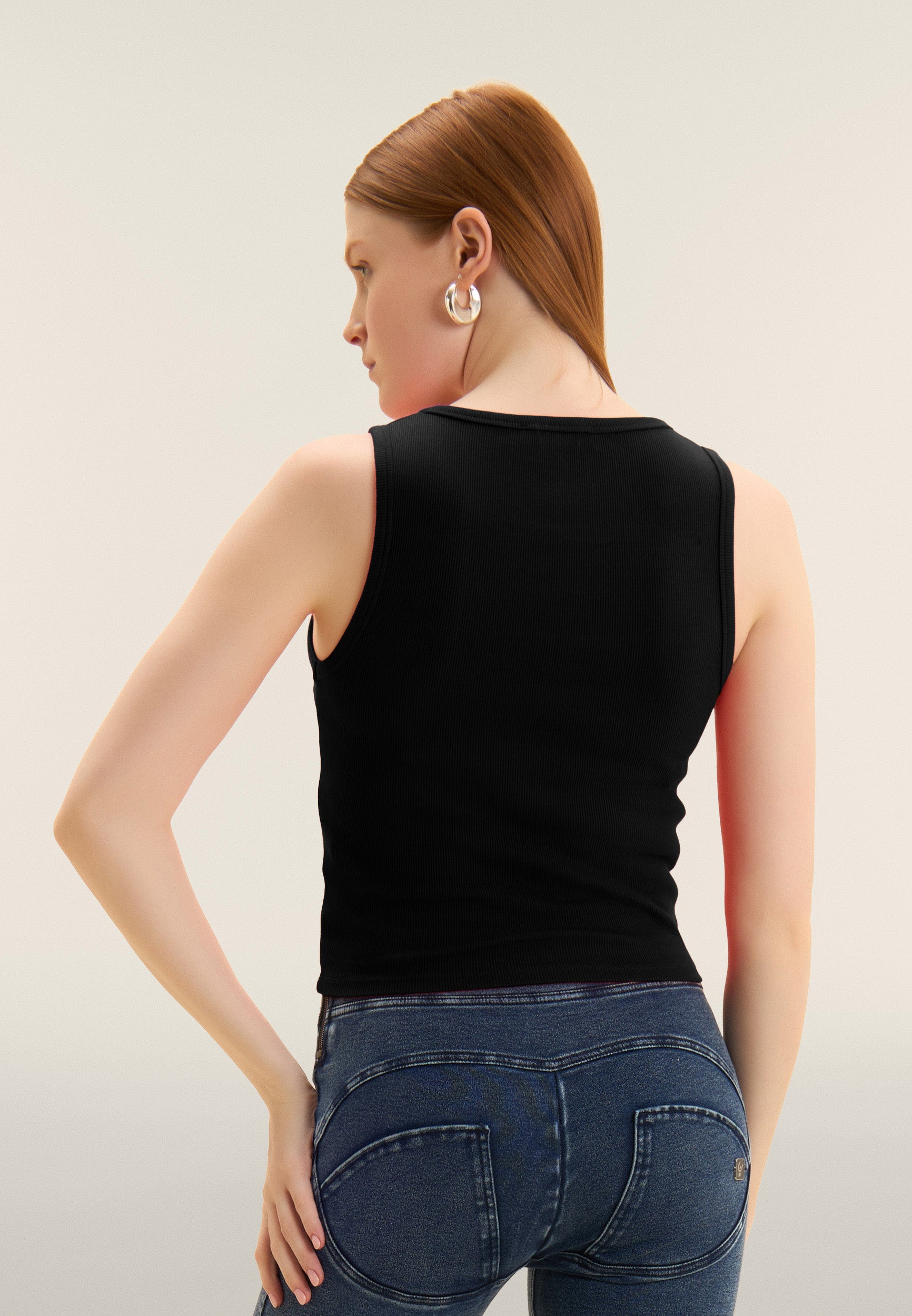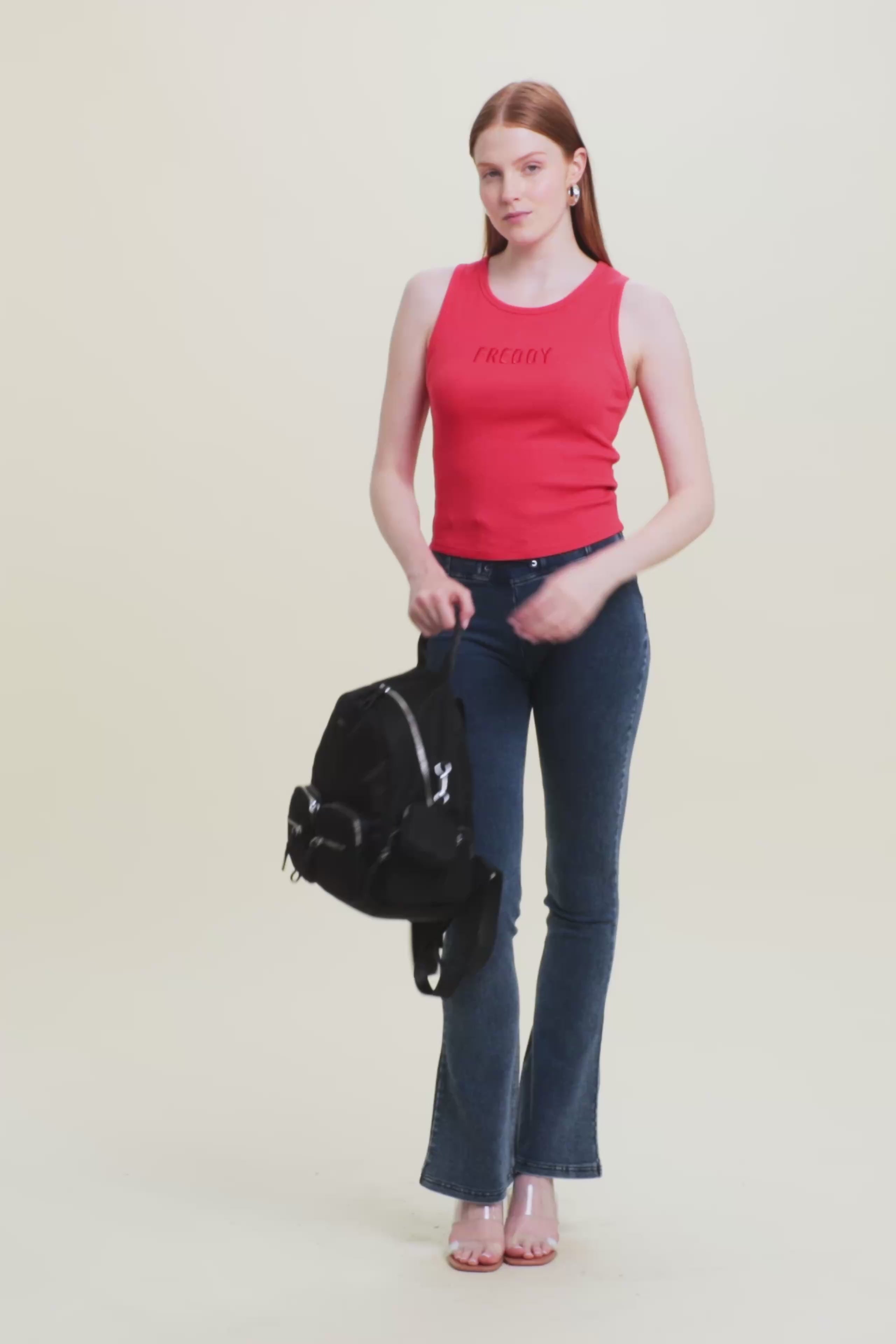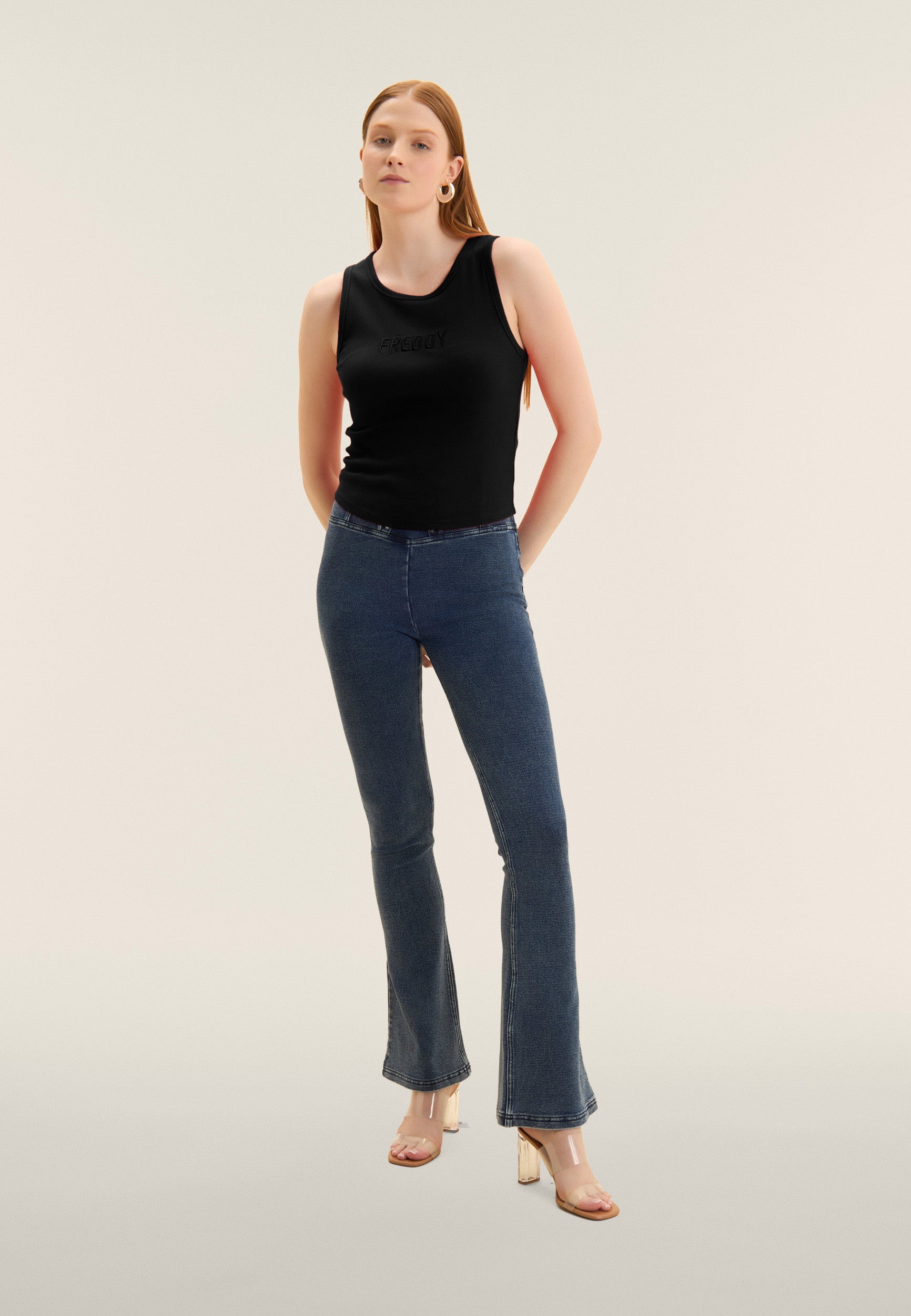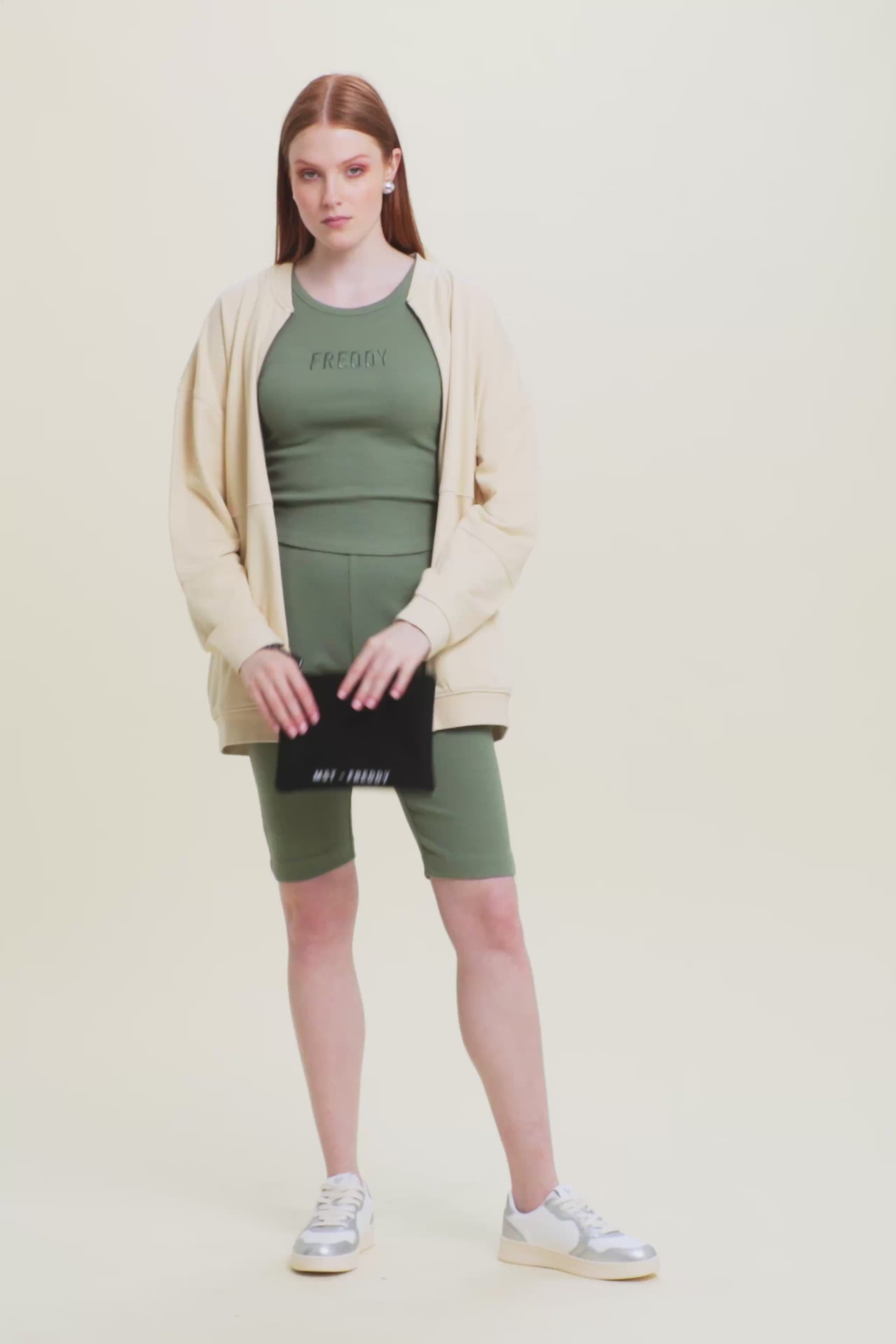 Close-fitting cropped tank top in stretch ribbed cotton, treated with enzymes for optimal colour movement and long-lasting softness. The round neck ad regular shoulder straps ensure a comfortable fit. The embroidered “FREDDY” logo on the front adds a distinctive and refined touch. A perfect garment for those seeking comfort and urban style, with a dynamic design inspired by street art.