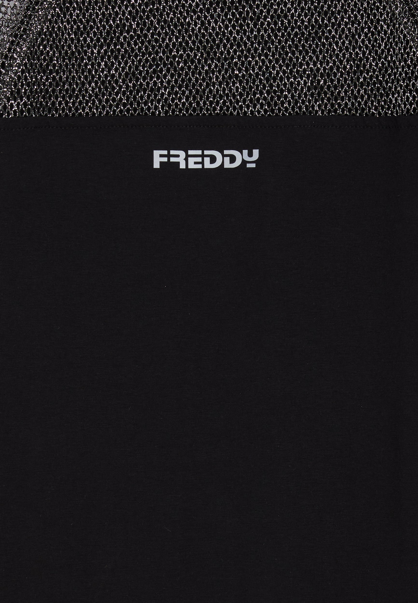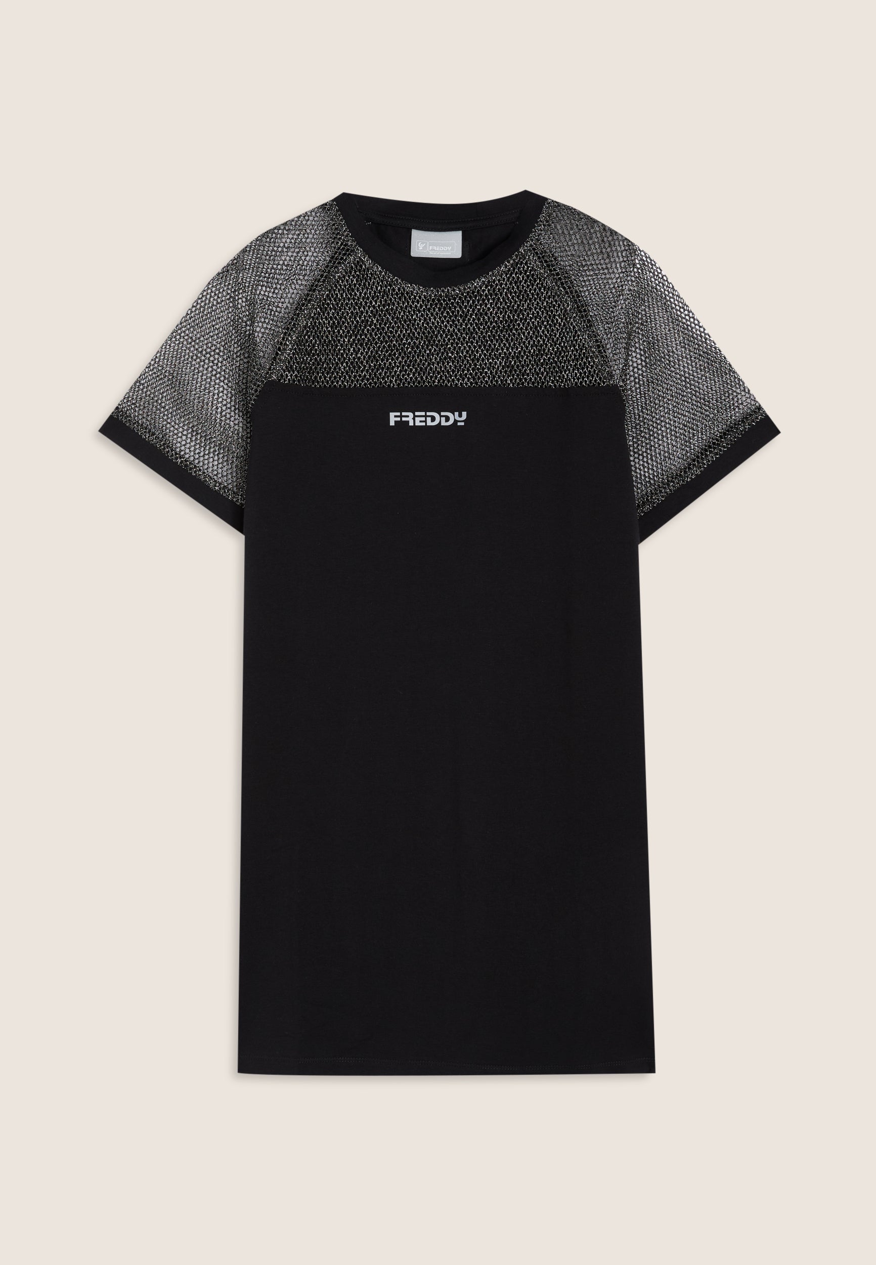 Sportivo e femminile, questo vestitino da bambina in stile maxi t-shirt è realizzato in morbido jersey di cotone elasticizzato, per offrire comfort e libertà di movimento in ogni momento della giornata. Le spalle e le maniche corte raglan sono in rete mesh con filo lurex, che donano un tocco brillante e moderno al look. Lo scollo girocollo, le maniche bordate e il fondo dritto completano il design pratico e curato nei dettagli. Il piccolo logo FREDDY stampato al centro del petto aggiunge una firma discreta ma riconoscibile. Ideale da indossare da solo o abbinato a leggings per un outfit dinamico.