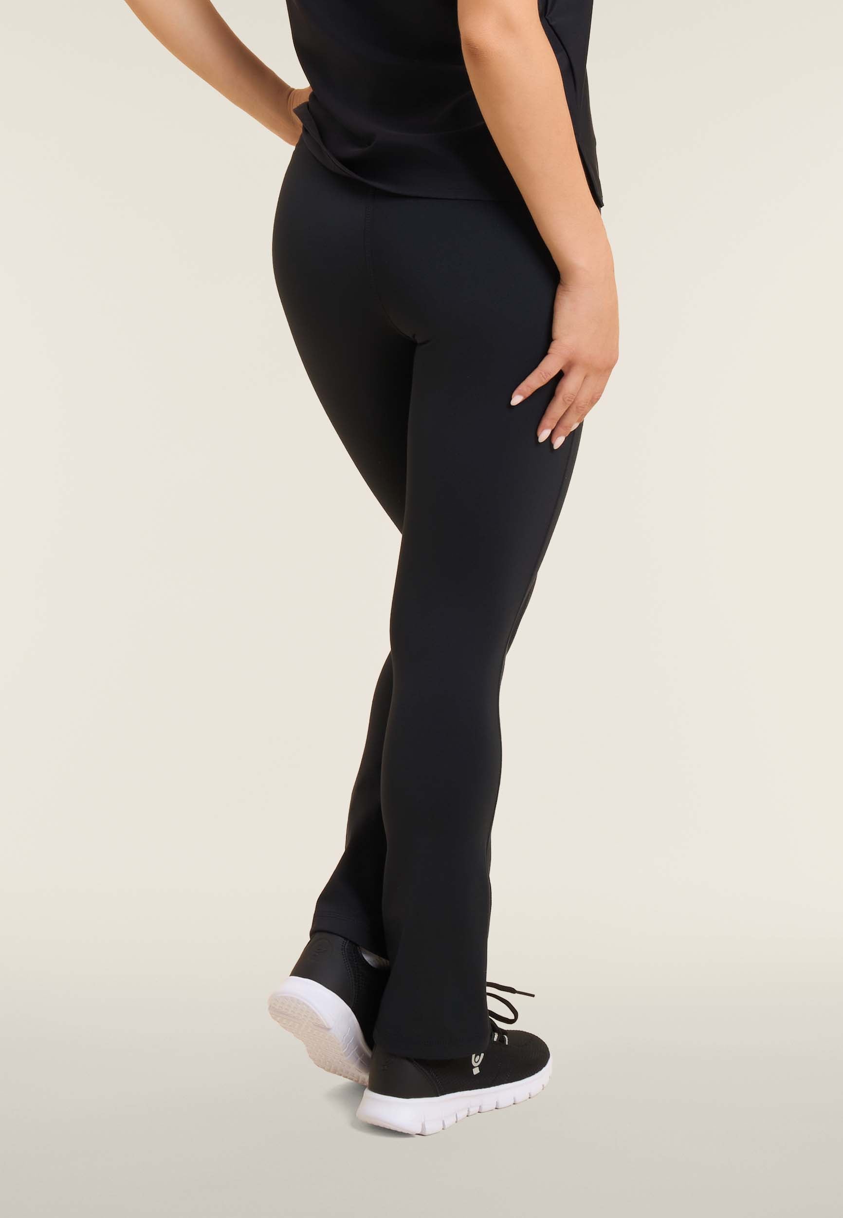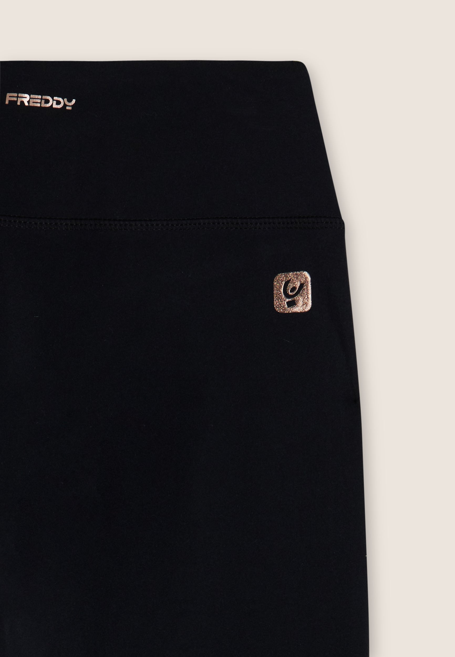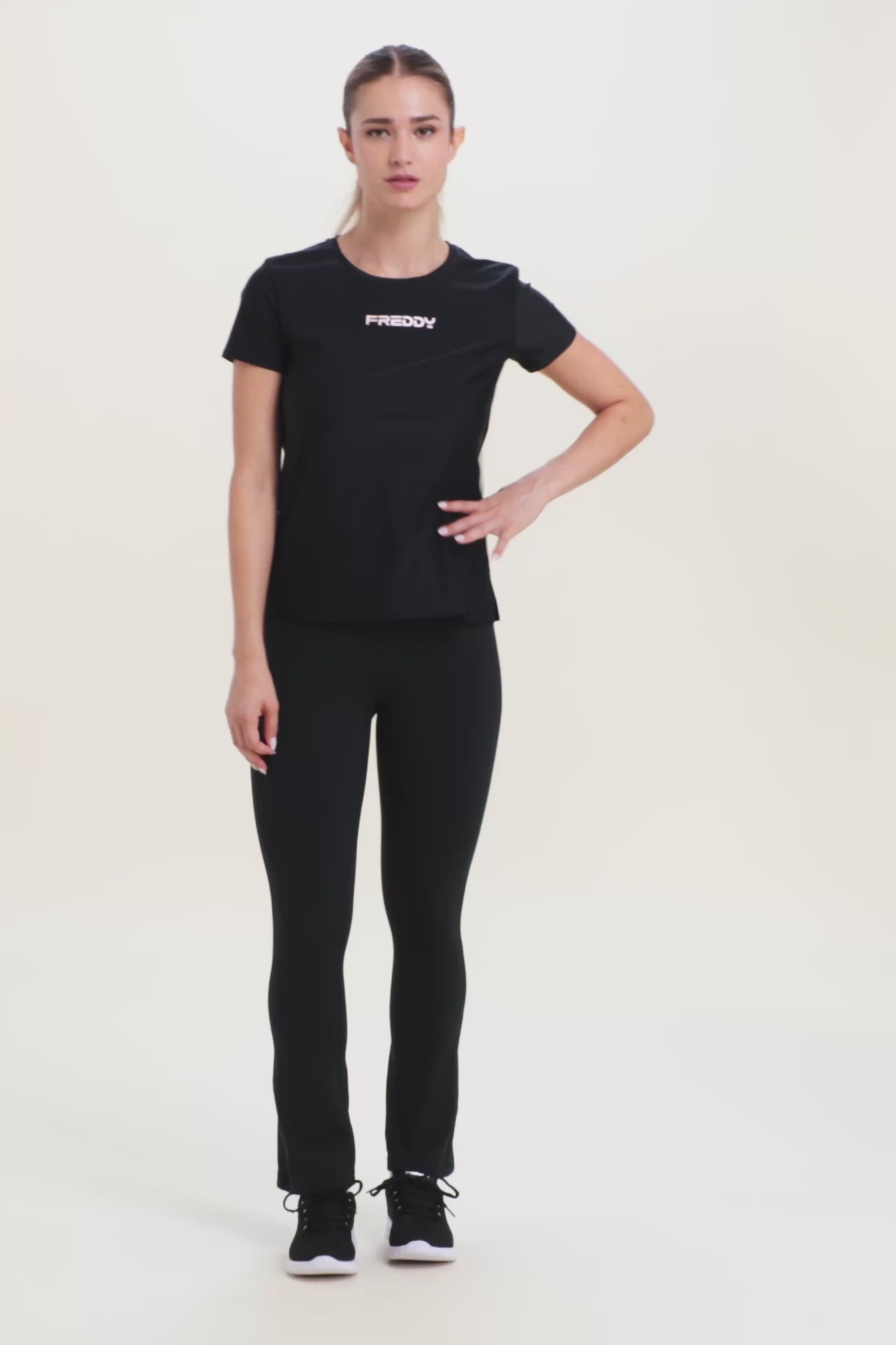 Sports leggings with flared bottom and modern cut, designed for style and maximum functionality. The high waistband is equipped with silicone inserts for a stable hold during movement, with no front seams for impeccable comfort. Freddy's patented D.I.W.O.® fabric promotes perspiration and maintains a constant skin temperature. The motivational print on the back waistband, logo details and a practical besom pocket complete the garment.