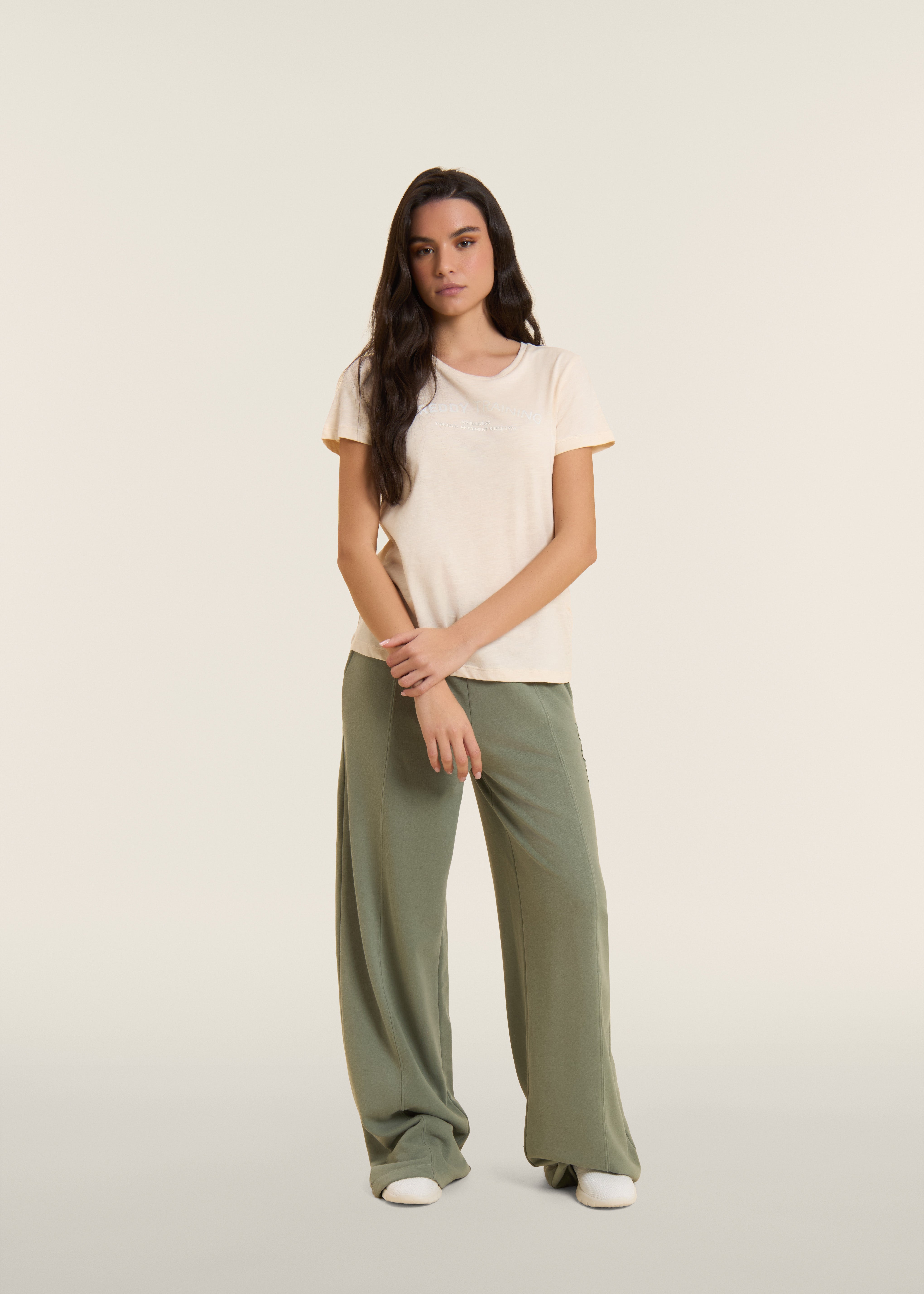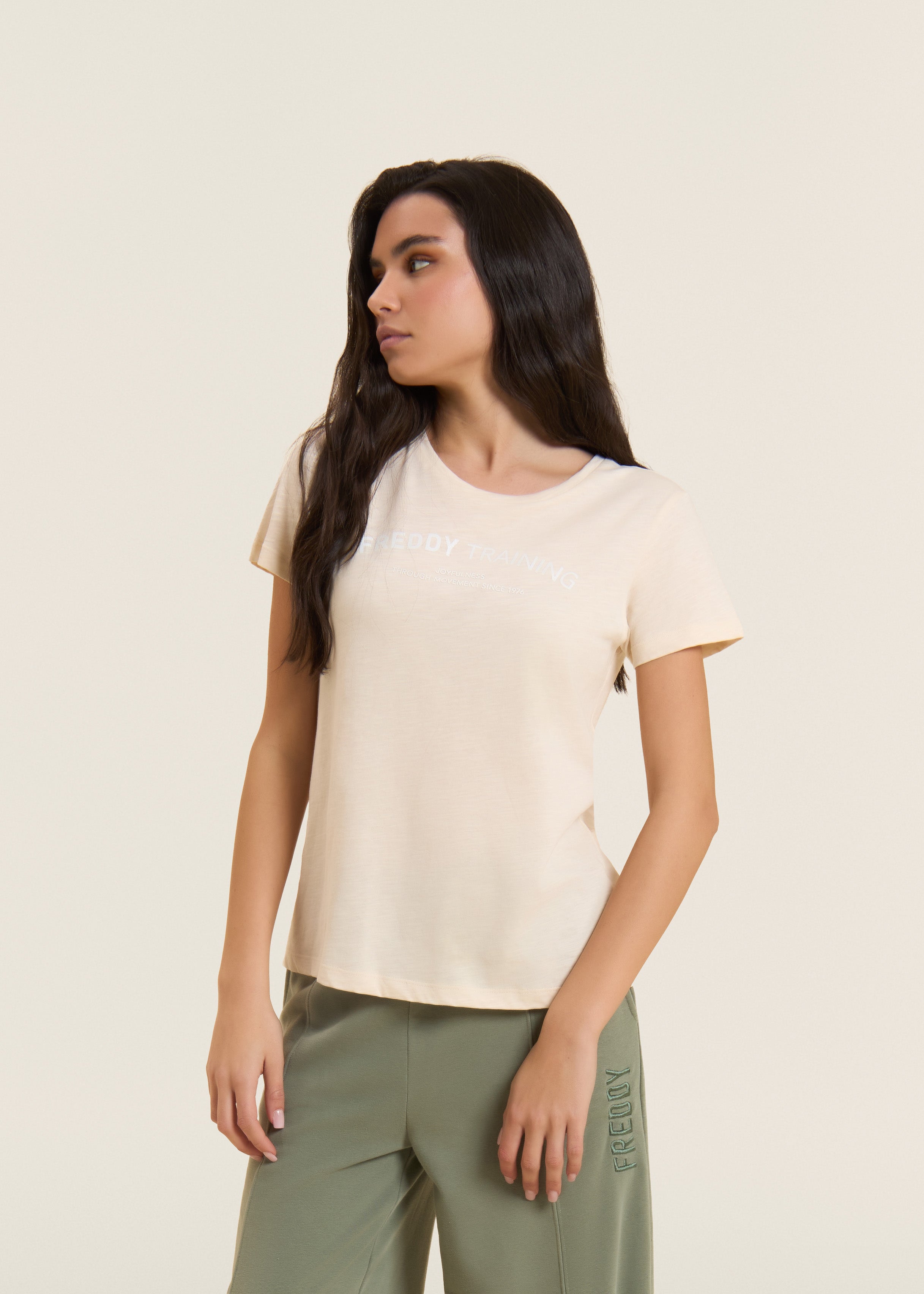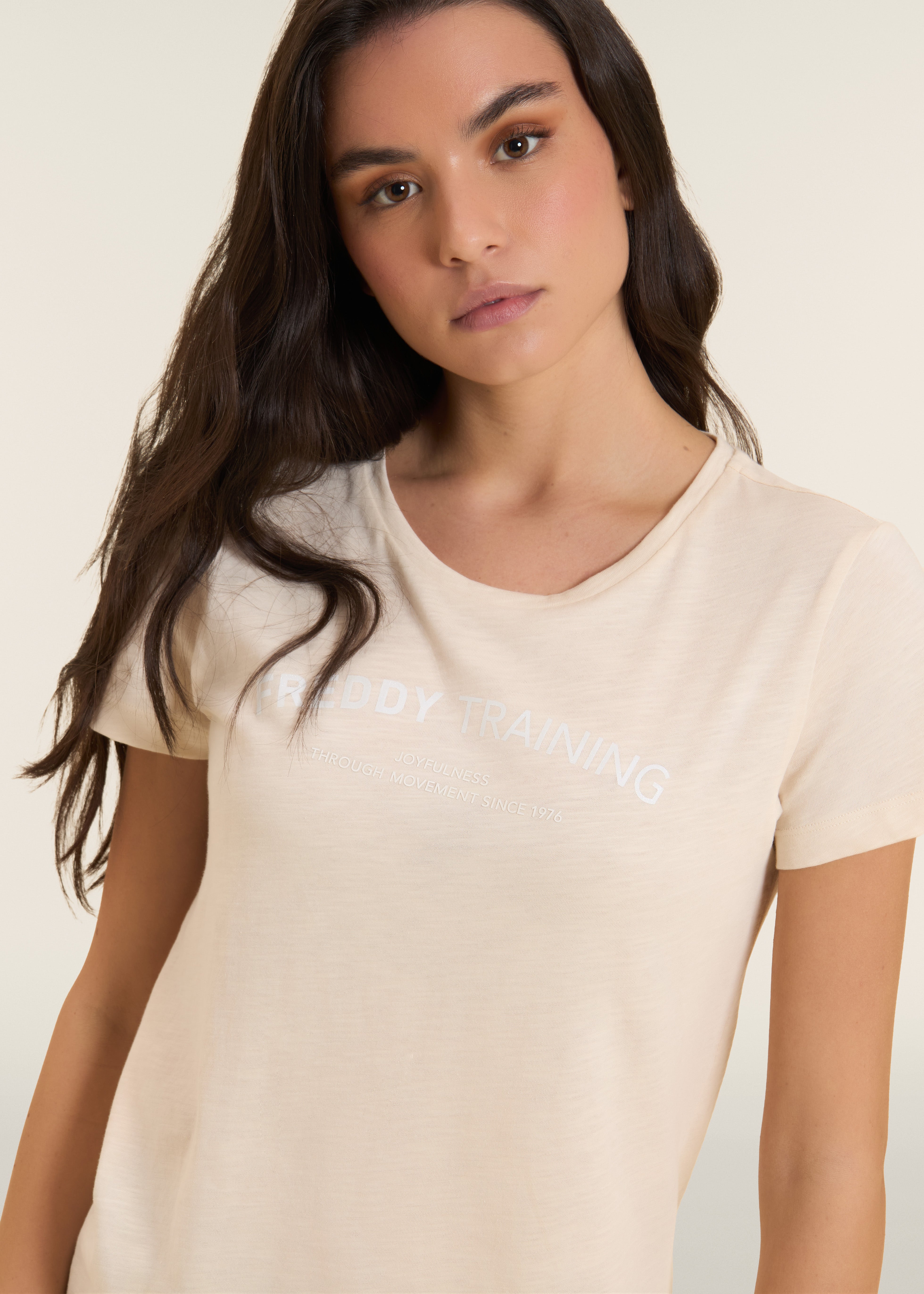 Short sleeve t-shirt with a regular fit and straight hem, made of lightweight slub jersey for a delicate melange effect. The crew neck and short sleeves make it a versatile leisure garment. The 'FREDDY TRAINING' graphic on the front in white glitter adds energy and style to the look.