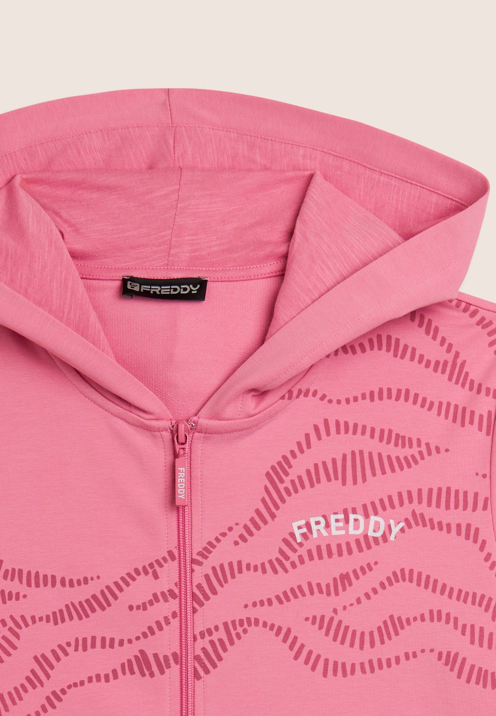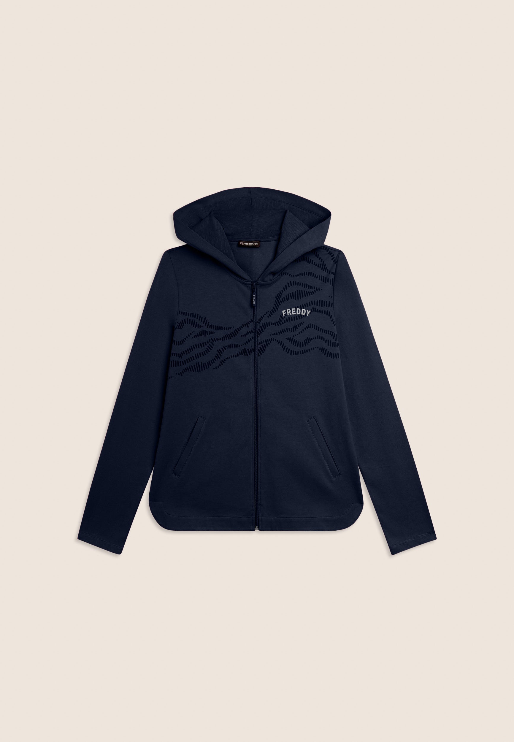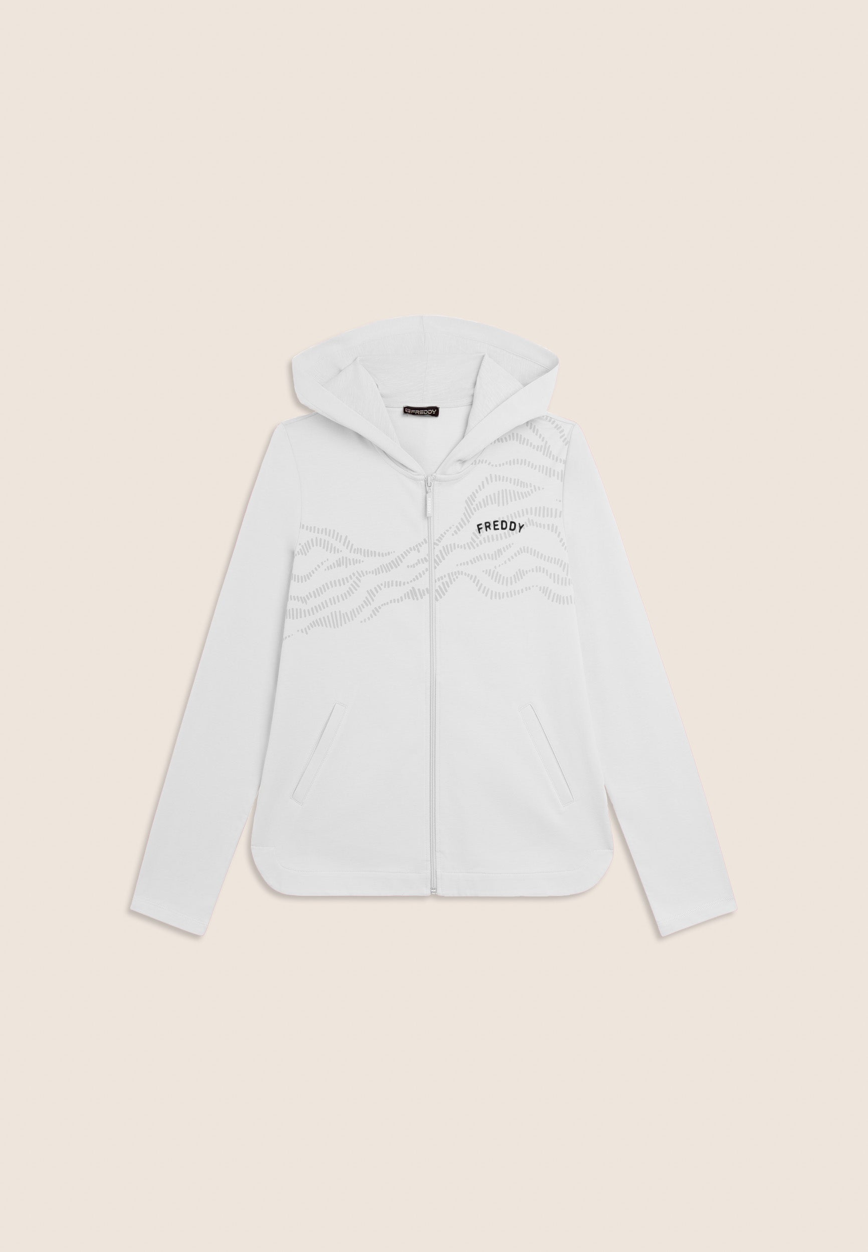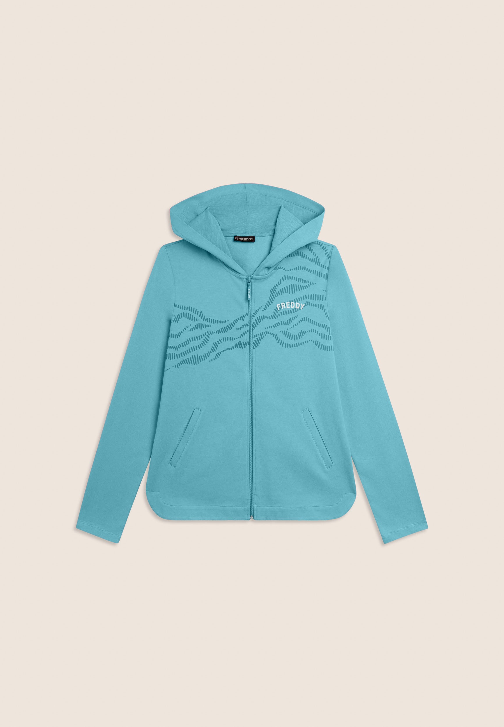 Zip hoodie with a regular fit, featuring a rounded hem with side slits and a longer back. The slub jersey lined hood adds comfort, and the straight long sleeves without cuffs add a modern look. The wavy graphic pattern printed on the front in a colour tone and the FREDDY logo in white glitter on the heart are the distinctive detail. Front besom pockets complete the practicality. Made of stretch French terry, this sweatshirt is perfect for mid-season or versatile use.