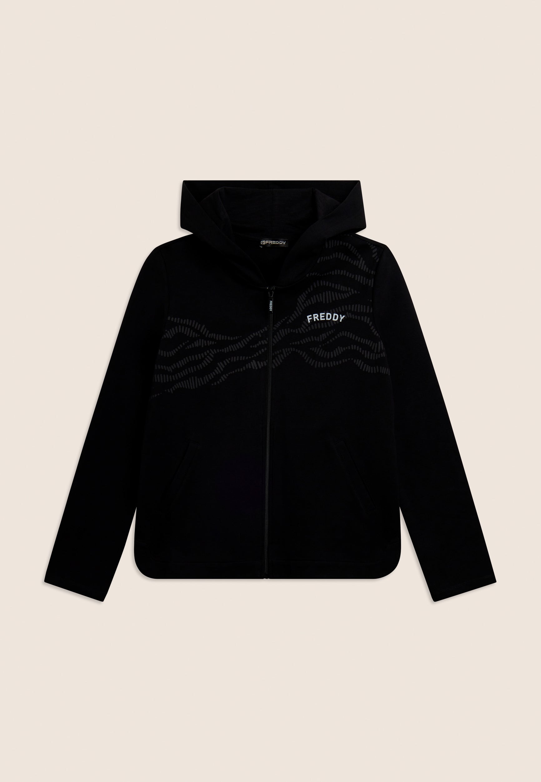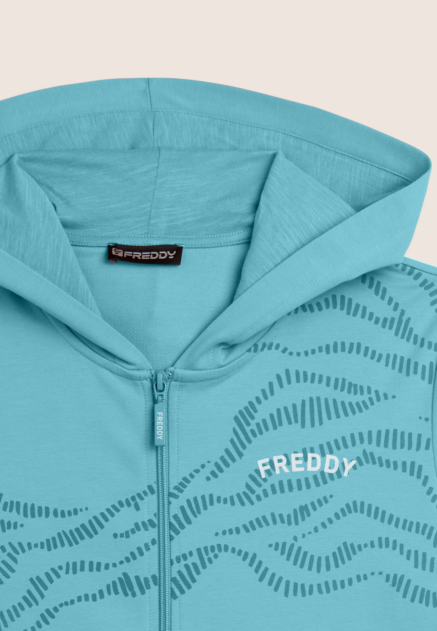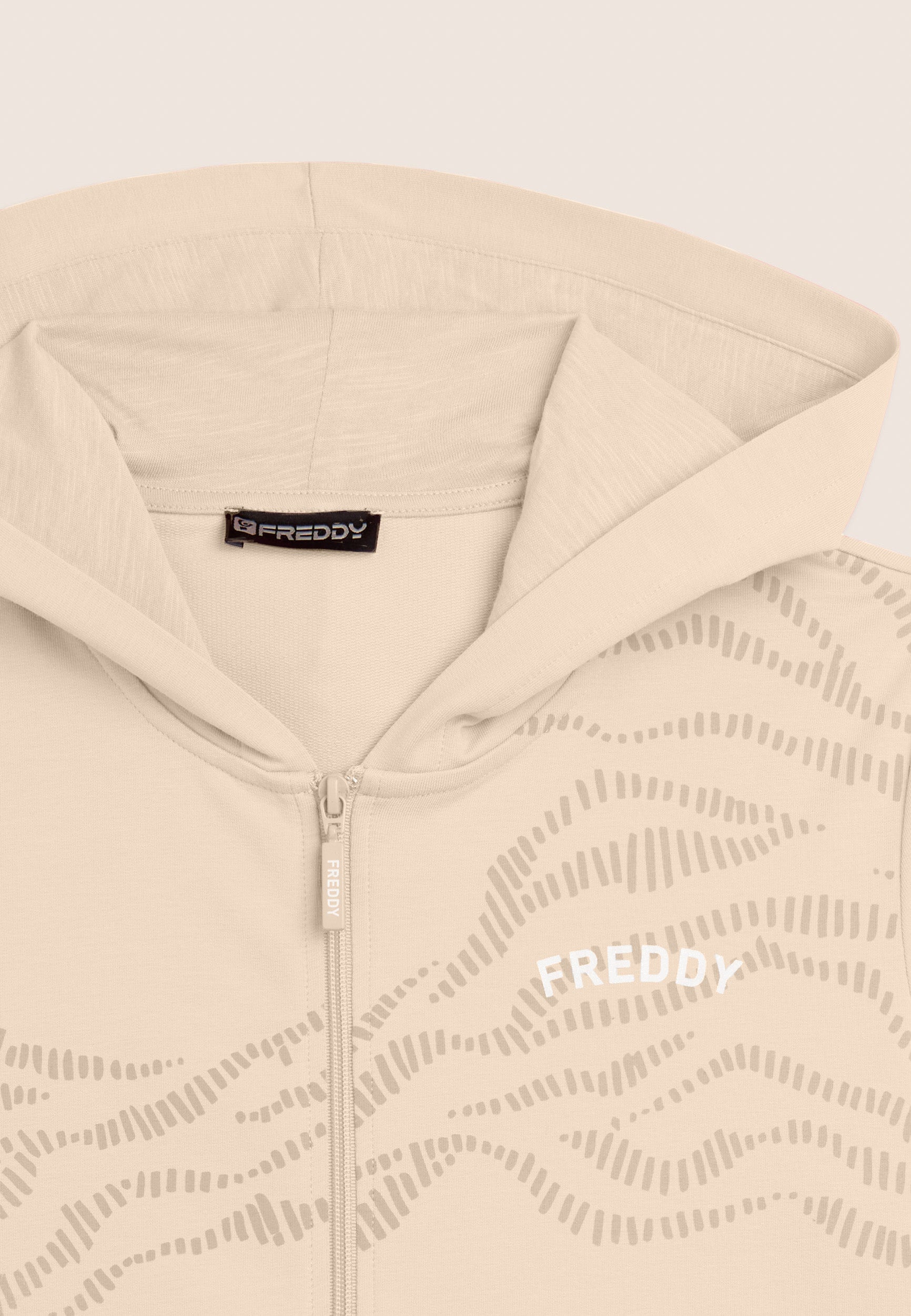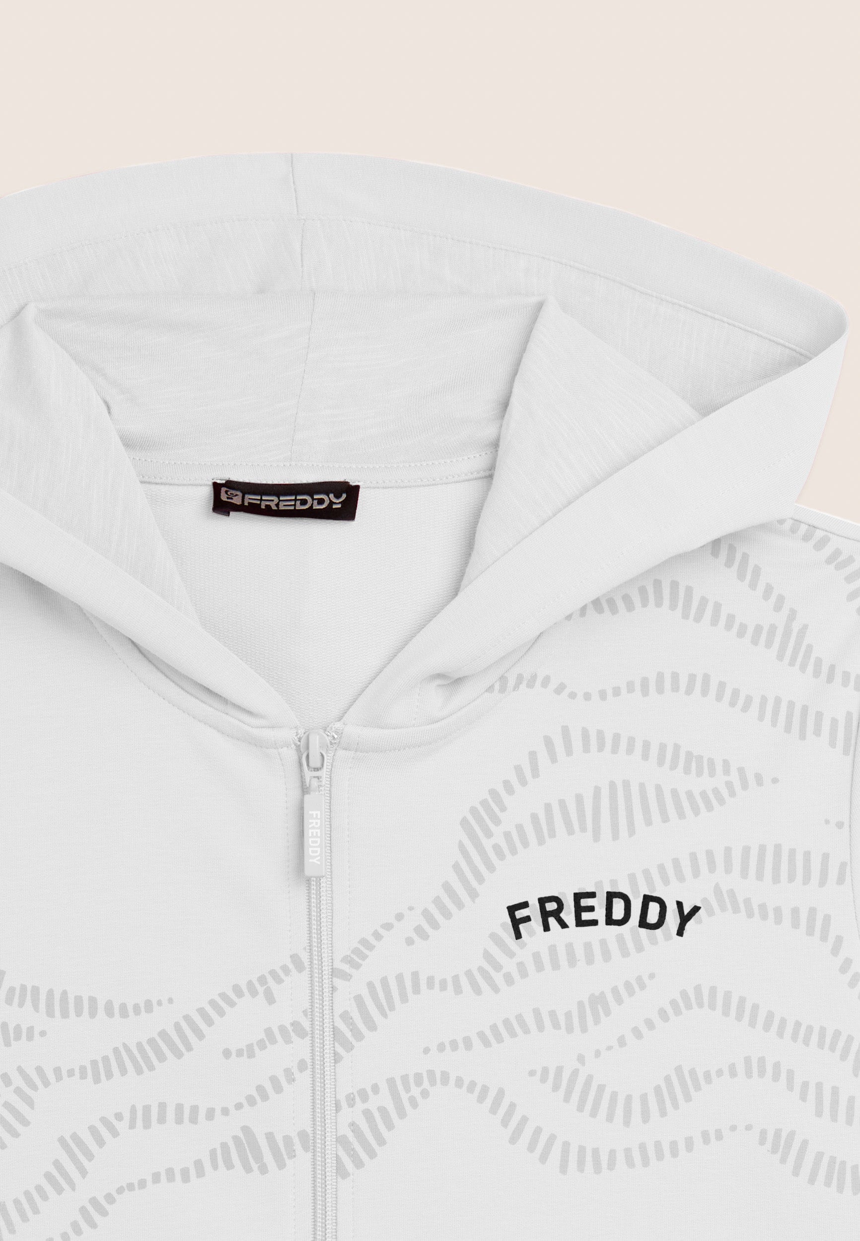 Zip hoodie with a regular fit, featuring a rounded hem with side slits and a longer back. The slub jersey lined hood adds comfort, and the straight long sleeves without cuffs add a modern look. The wavy graphic pattern printed on the front in a colour tone and the FREDDY logo in white glitter on the heart are the distinctive detail. Front besom pockets complete the practicality. Made of stretch French terry, this sweatshirt is perfect for mid-season or versatile use.