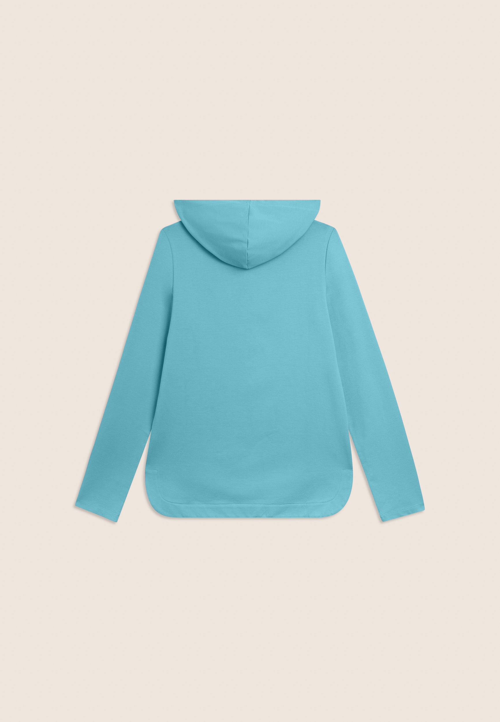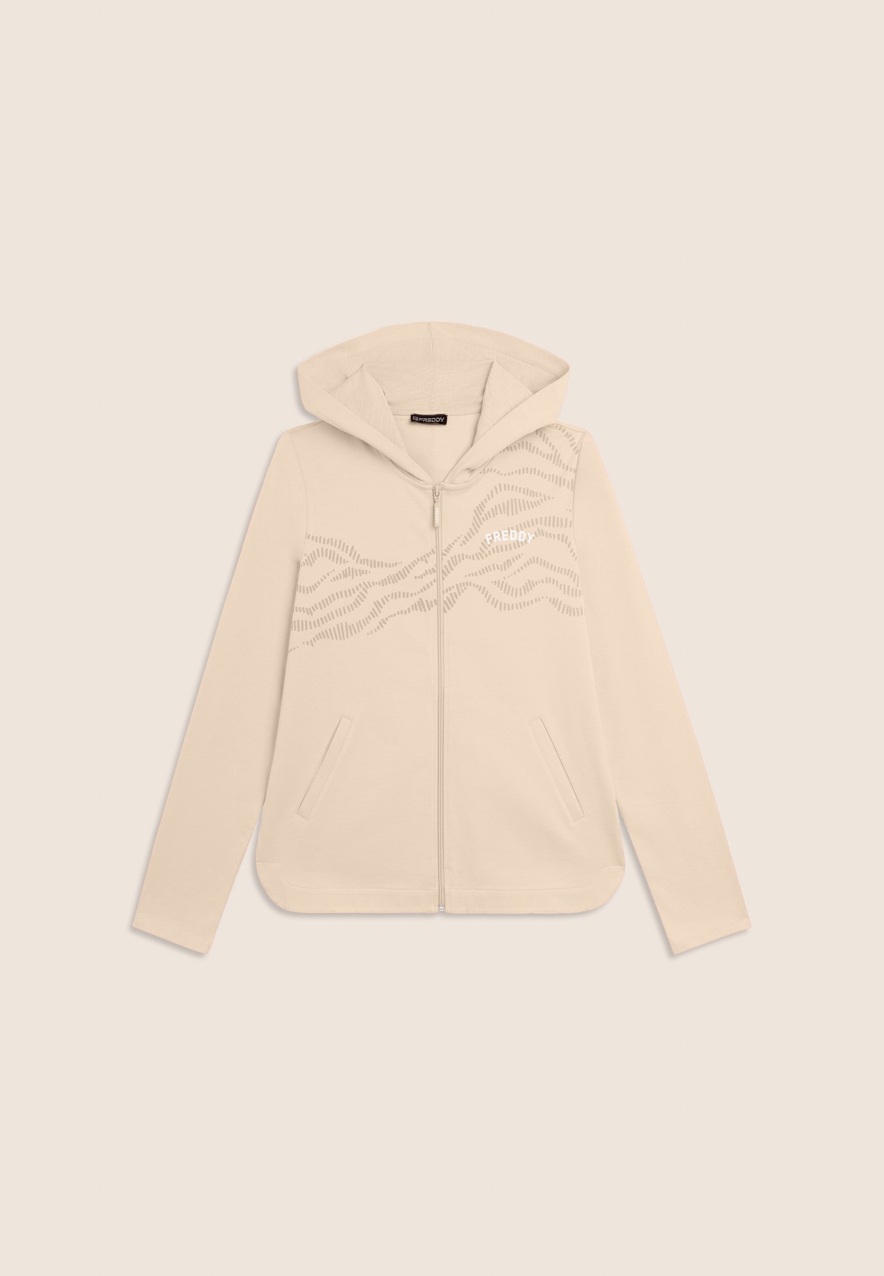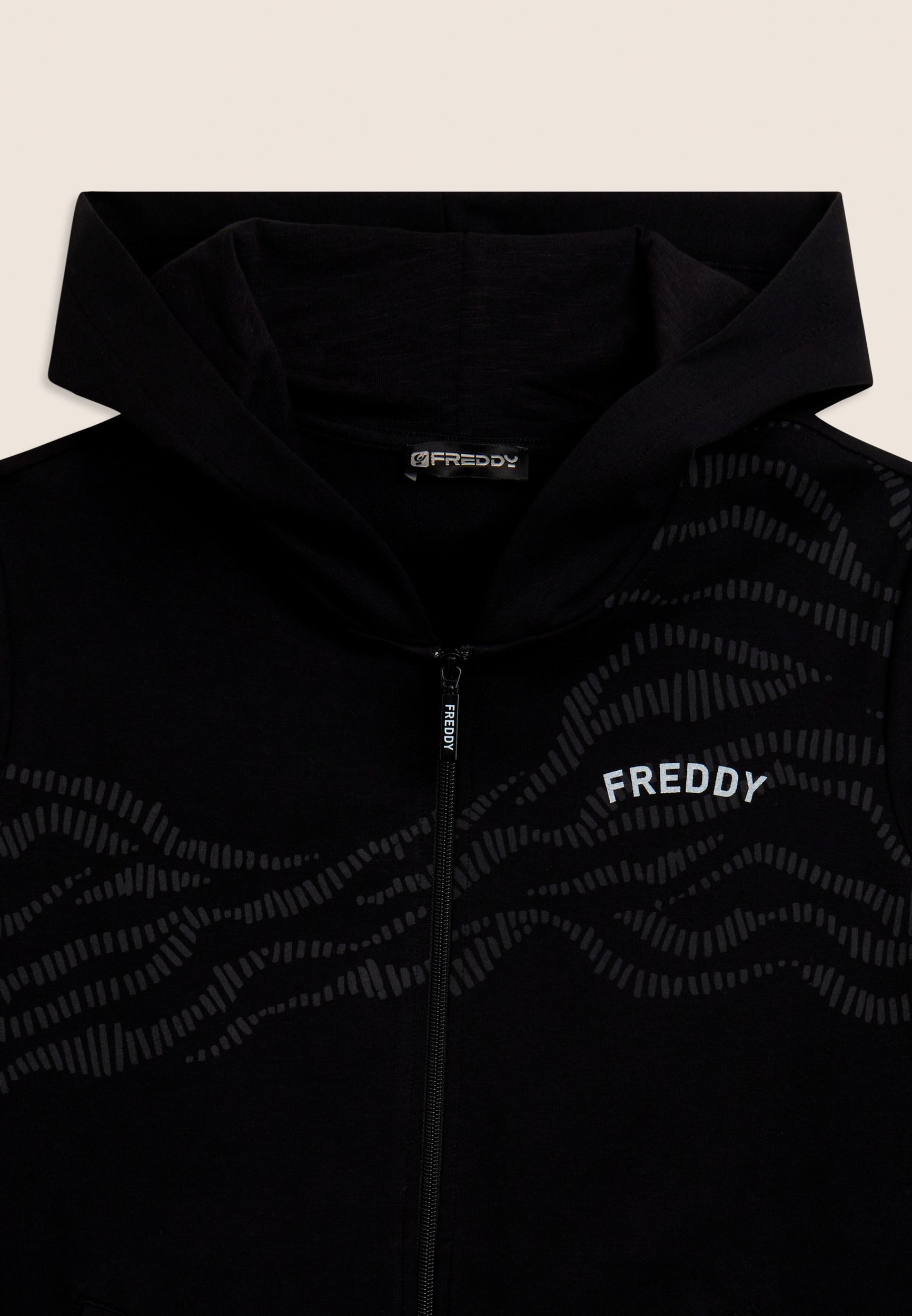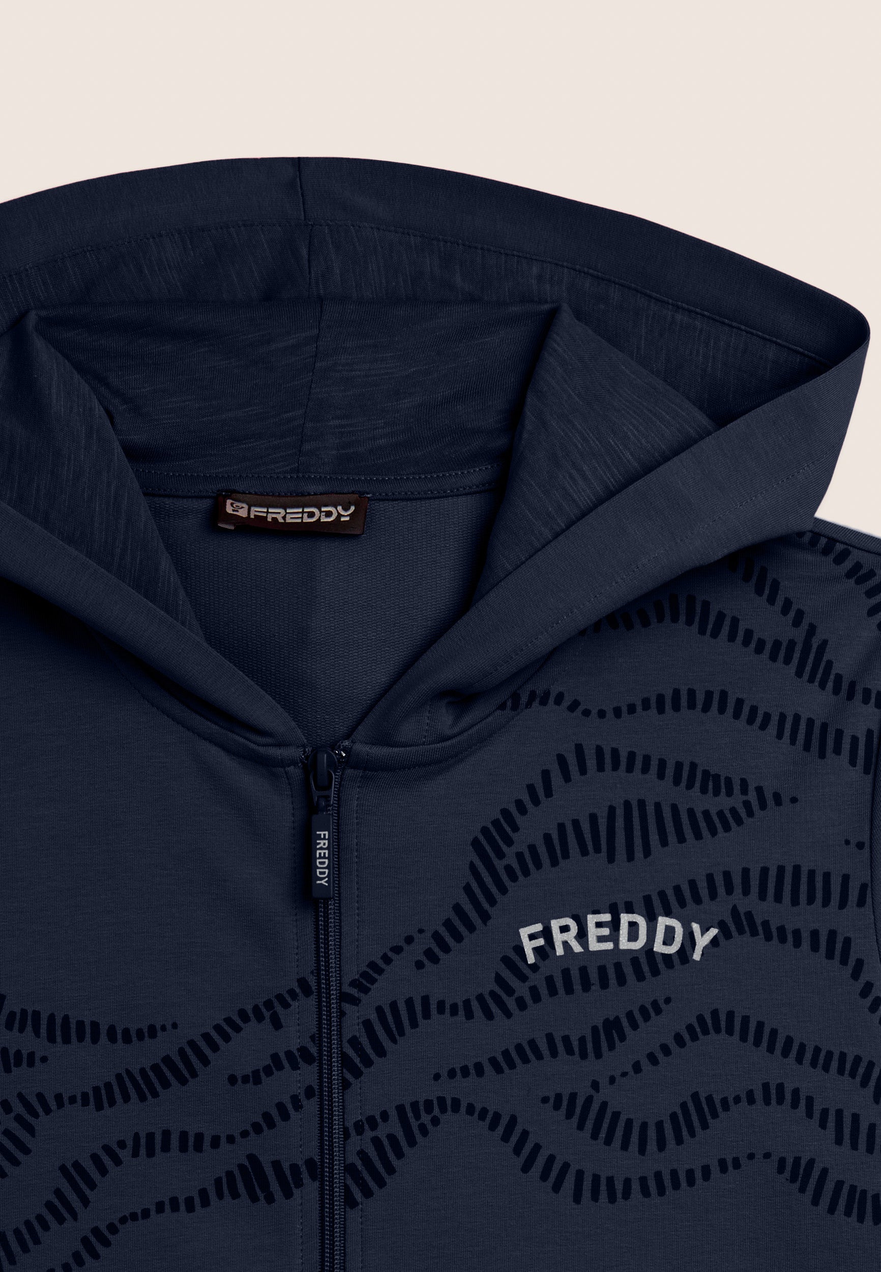 Zip hoodie with a regular fit, featuring a rounded hem with side slits and a longer back. The slub jersey lined hood adds comfort, and the straight long sleeves without cuffs add a modern look. The wavy graphic pattern printed on the front in a colour tone and the FREDDY logo in white glitter on the heart are the distinctive detail. Front besom pockets complete the practicality. Made of stretch French terry, this sweatshirt is perfect for mid-season or versatile use.