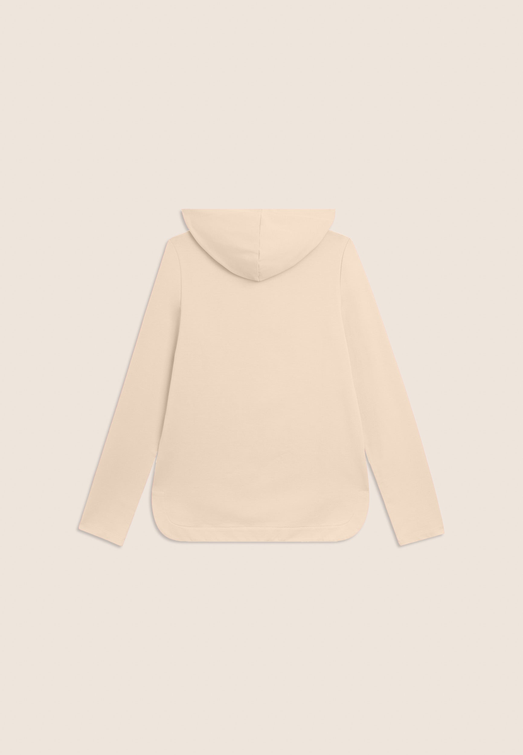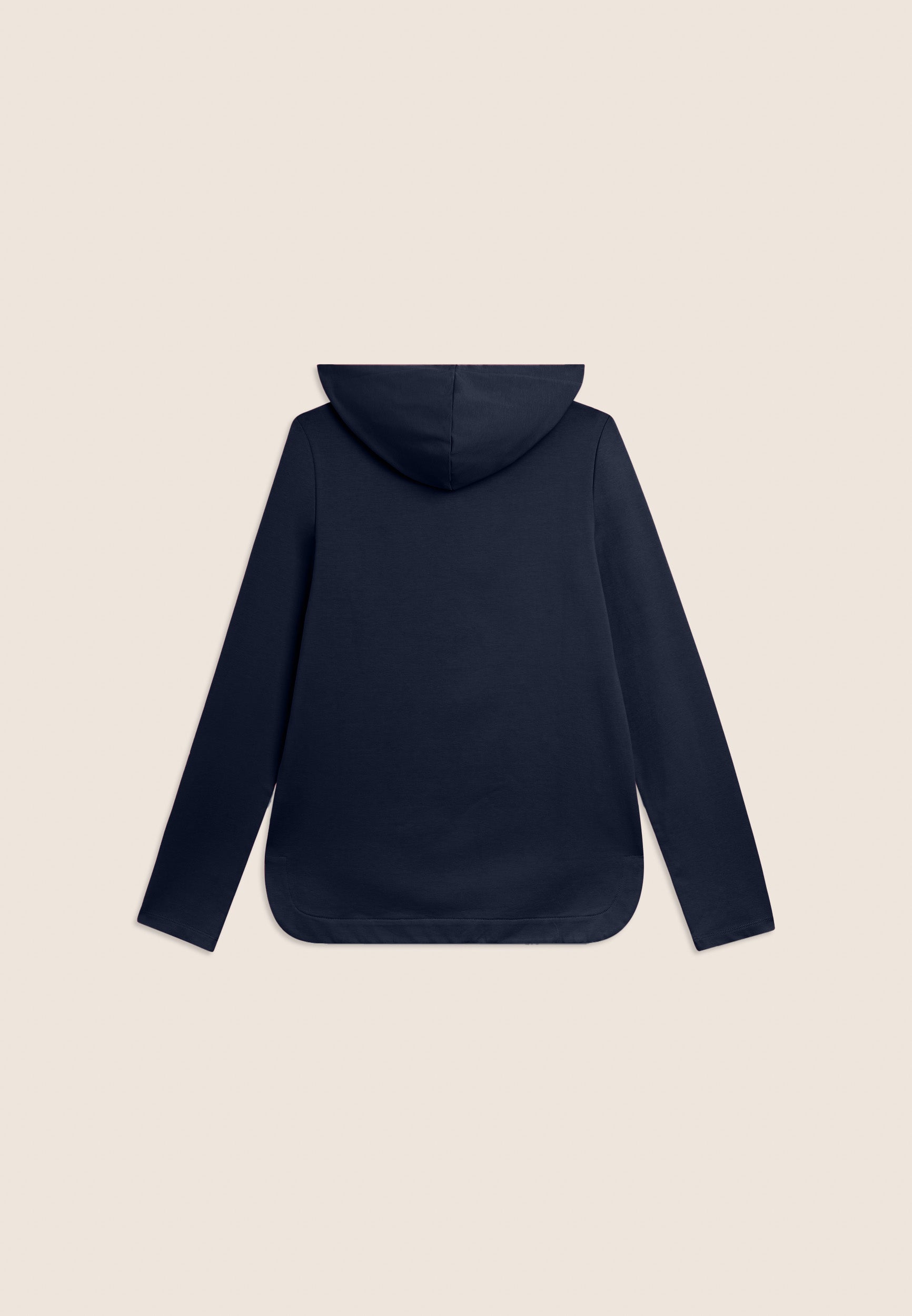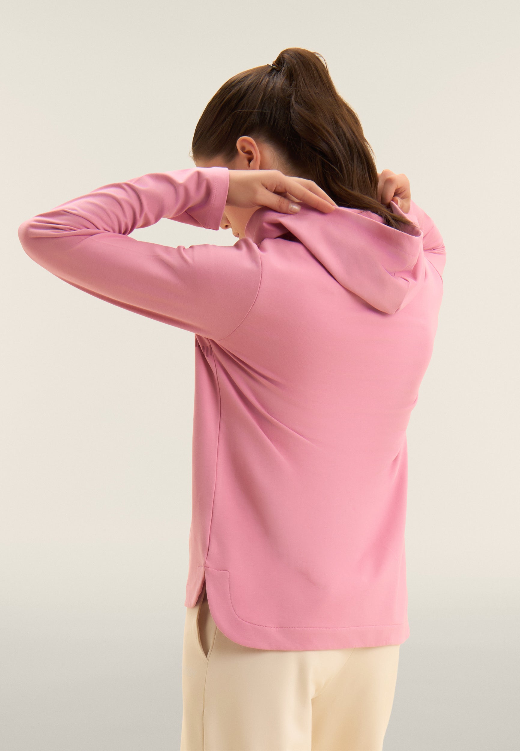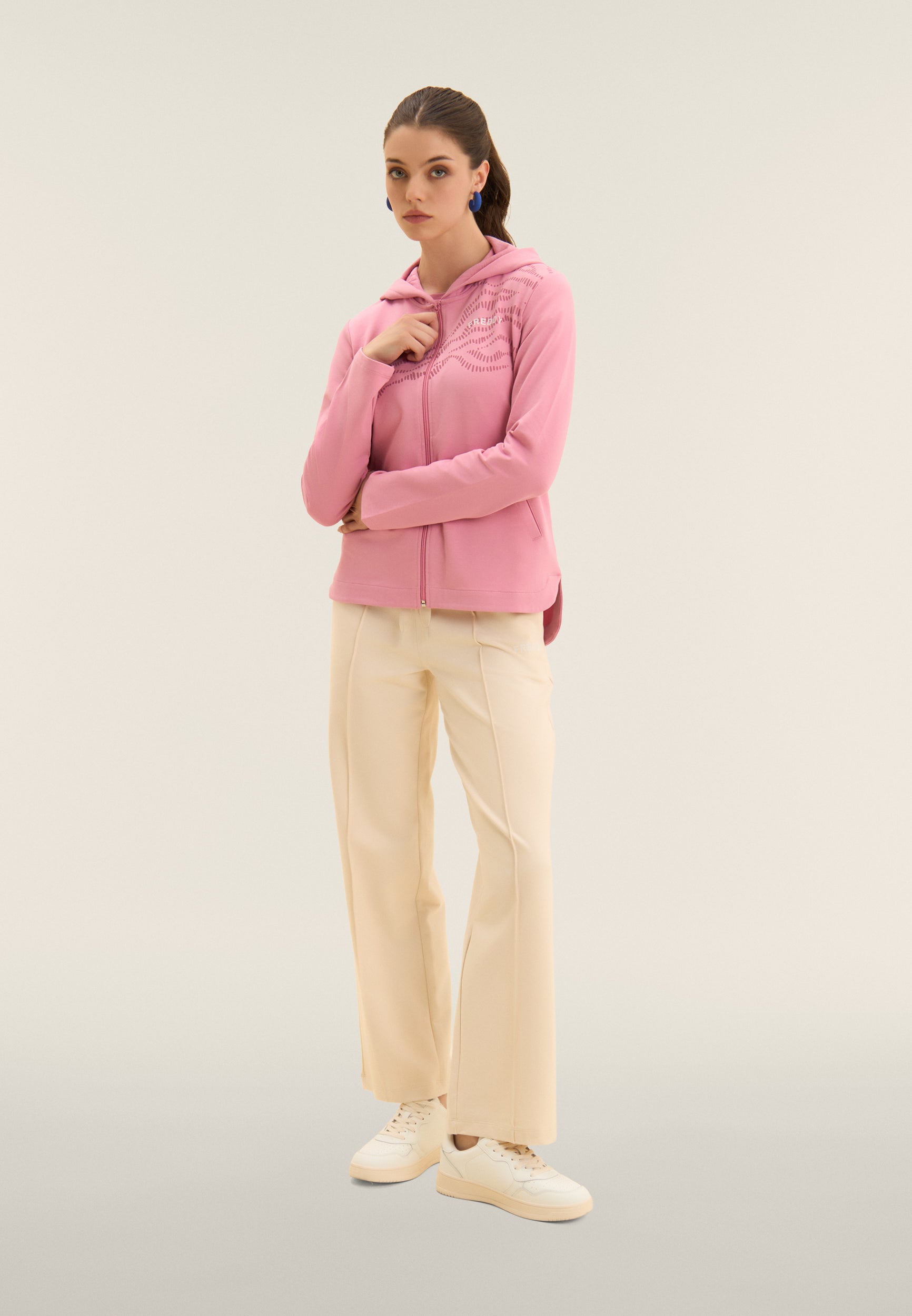 Zip hoodie with a regular fit, featuring a rounded hem with side slits and a longer back. The slub jersey lined hood adds comfort, and the straight long sleeves without cuffs add a modern look. The wavy graphic pattern printed on the front in a colour tone and the FREDDY logo in white glitter on the heart are the distinctive detail. Front besom pockets complete the practicality. Made of stretch French terry, this sweatshirt is perfect for mid-season or versatile use.