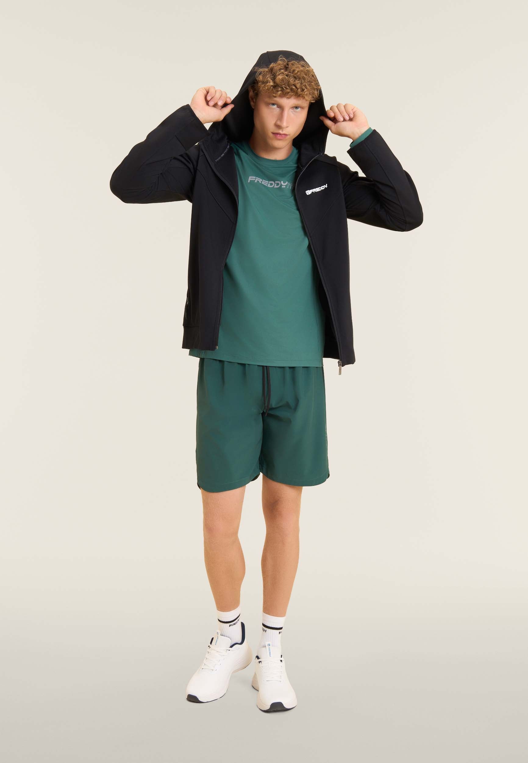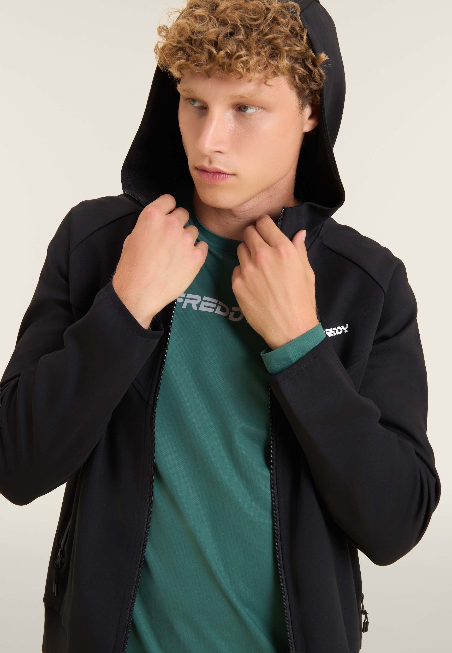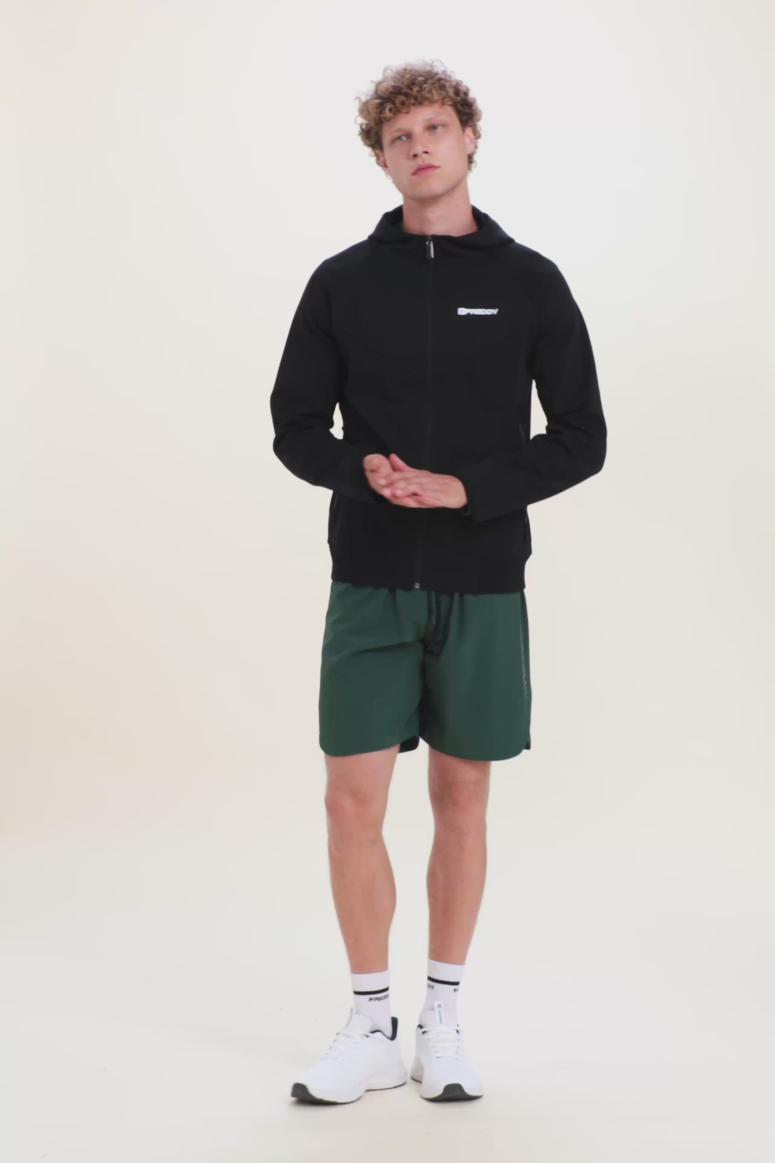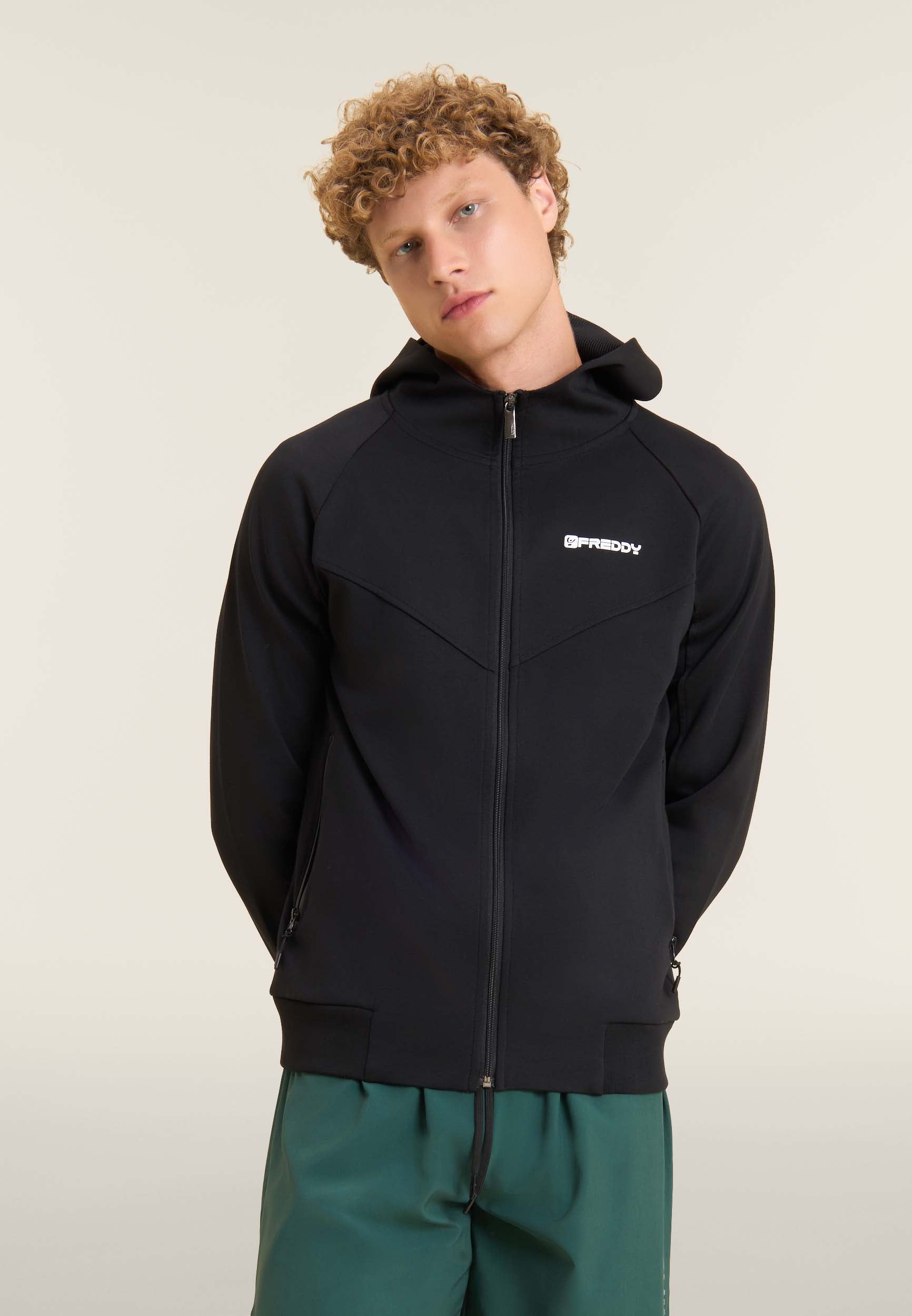 Men's sweatshirt with full-zip fastening, regular fit and ribbed bottom. It features a hood with mesh lining and sleeves with a rib-knit internal cuff for a snug fit. Block seams enhance the design in the chest and shoulder area. Zipped besom pockets. The stretch interlock fabric ensures softness, durability and maximum freedom of movement.