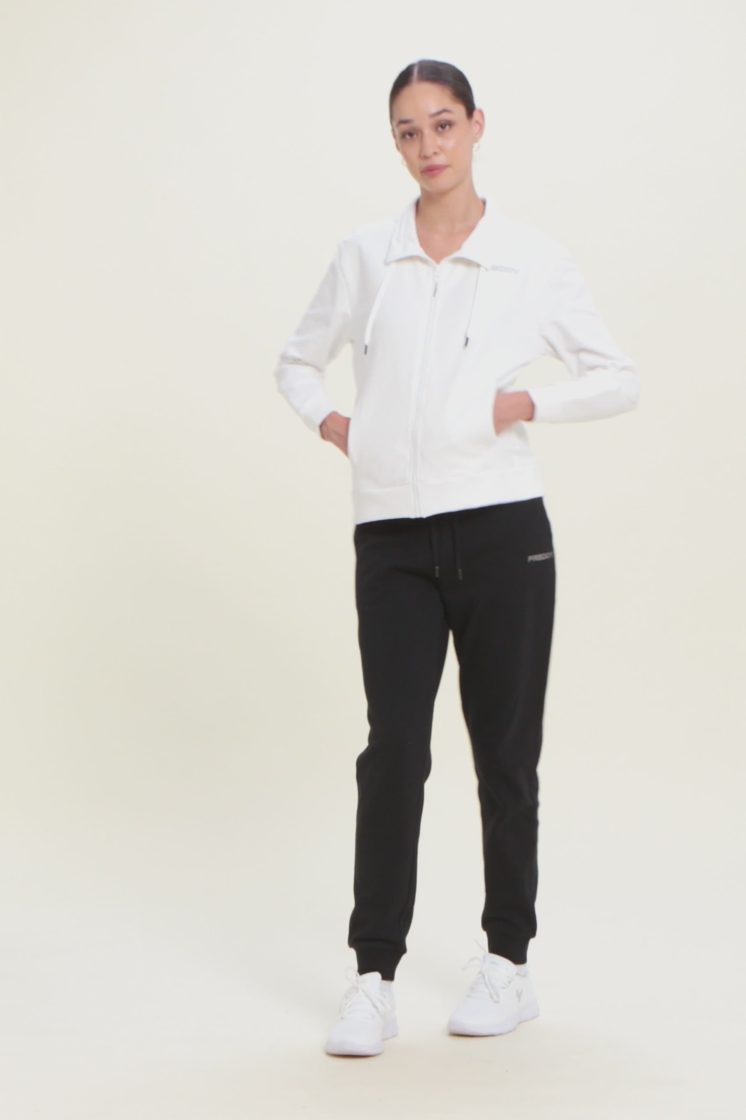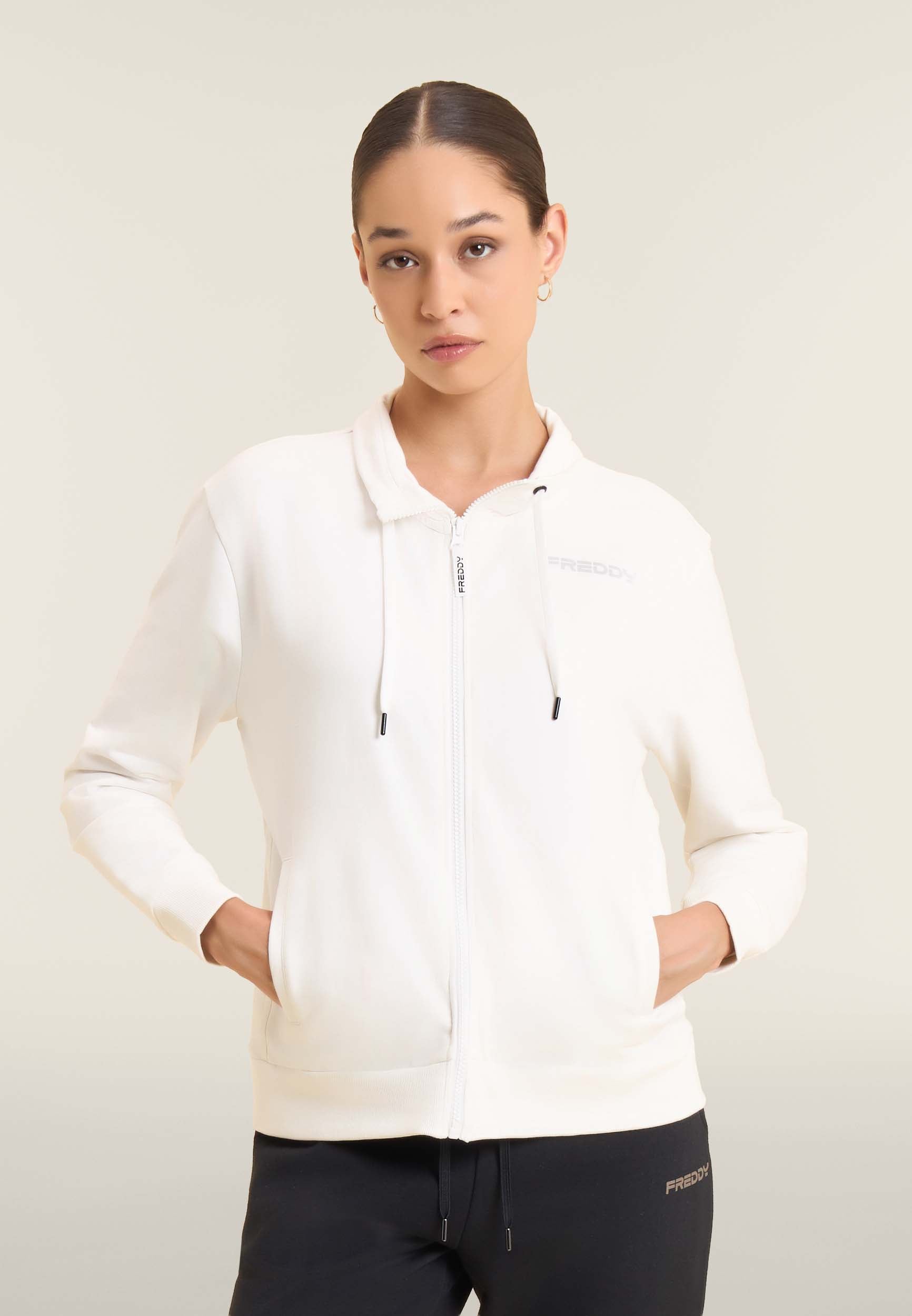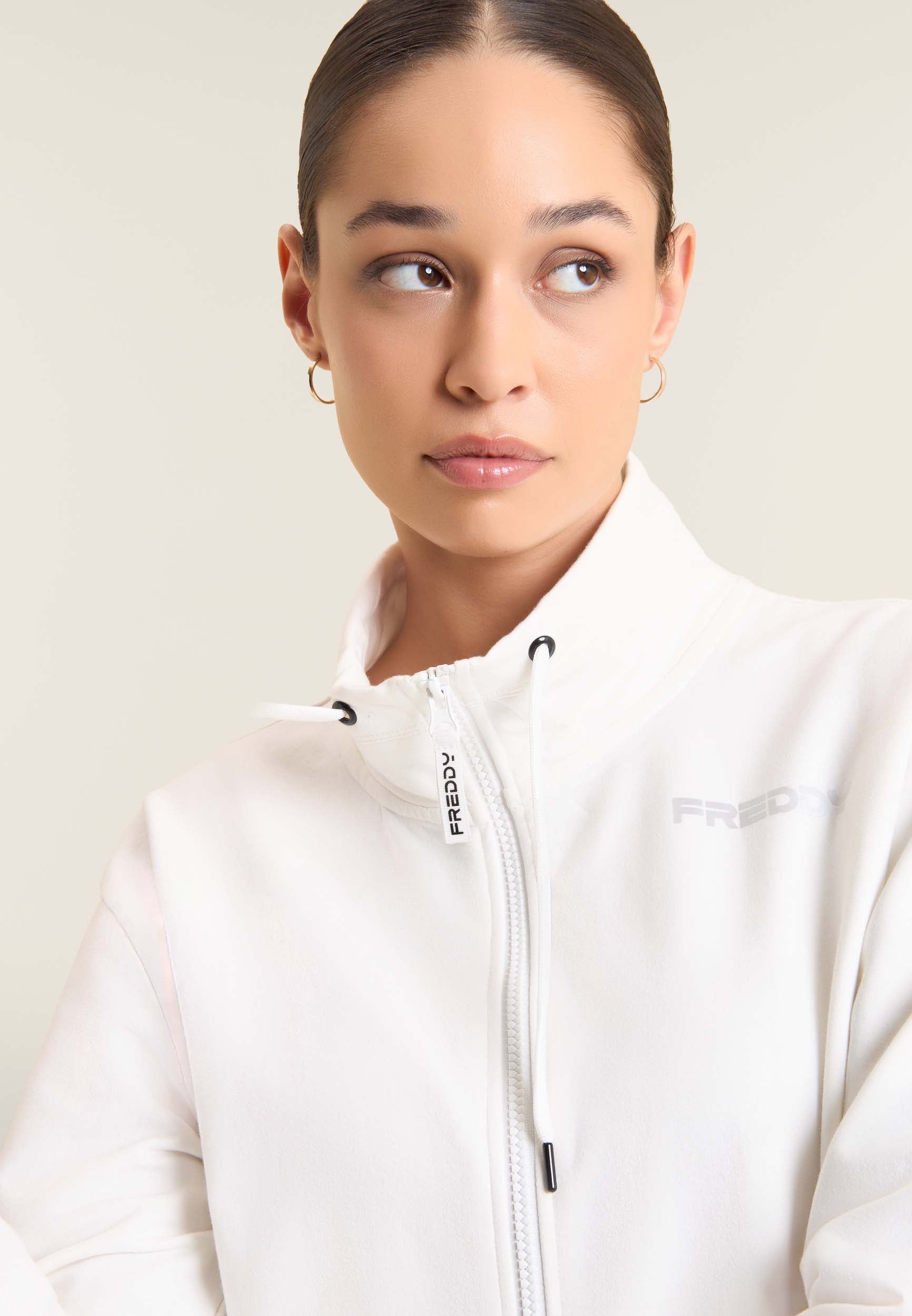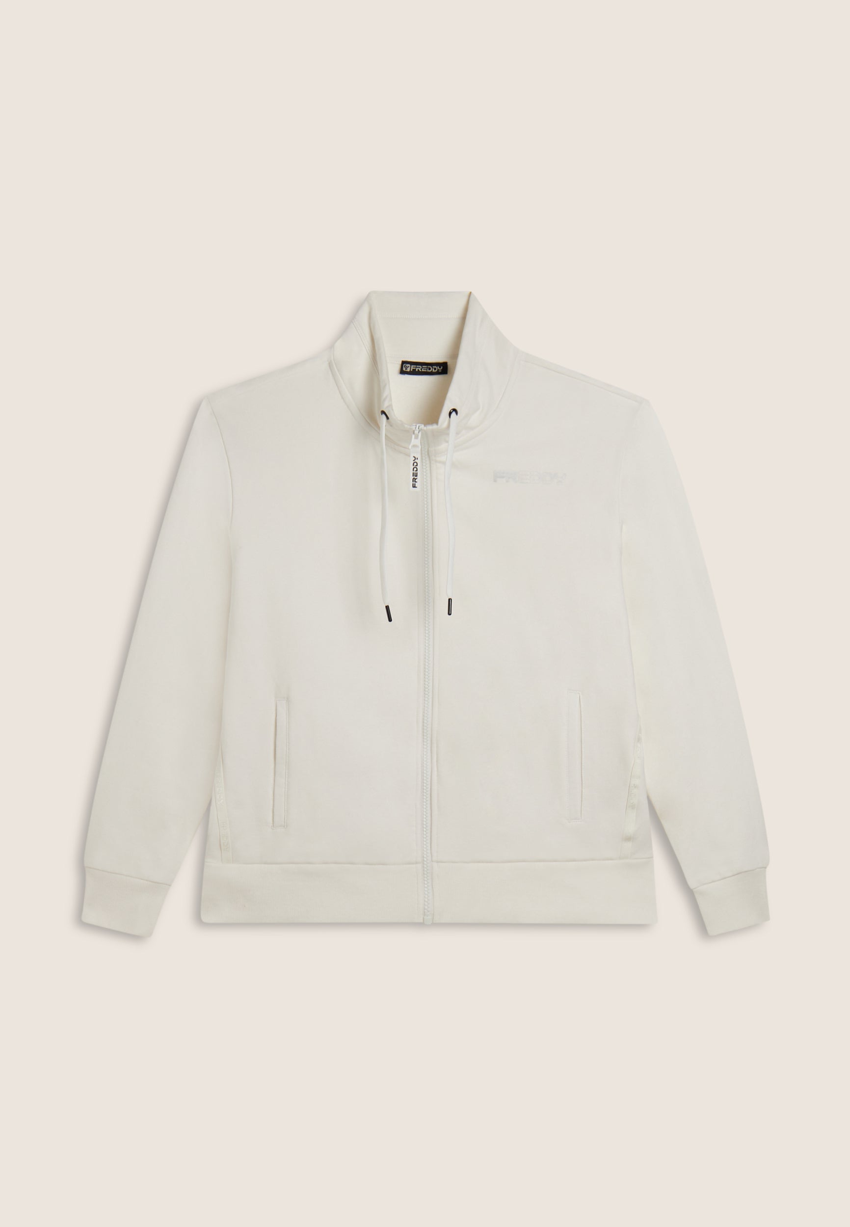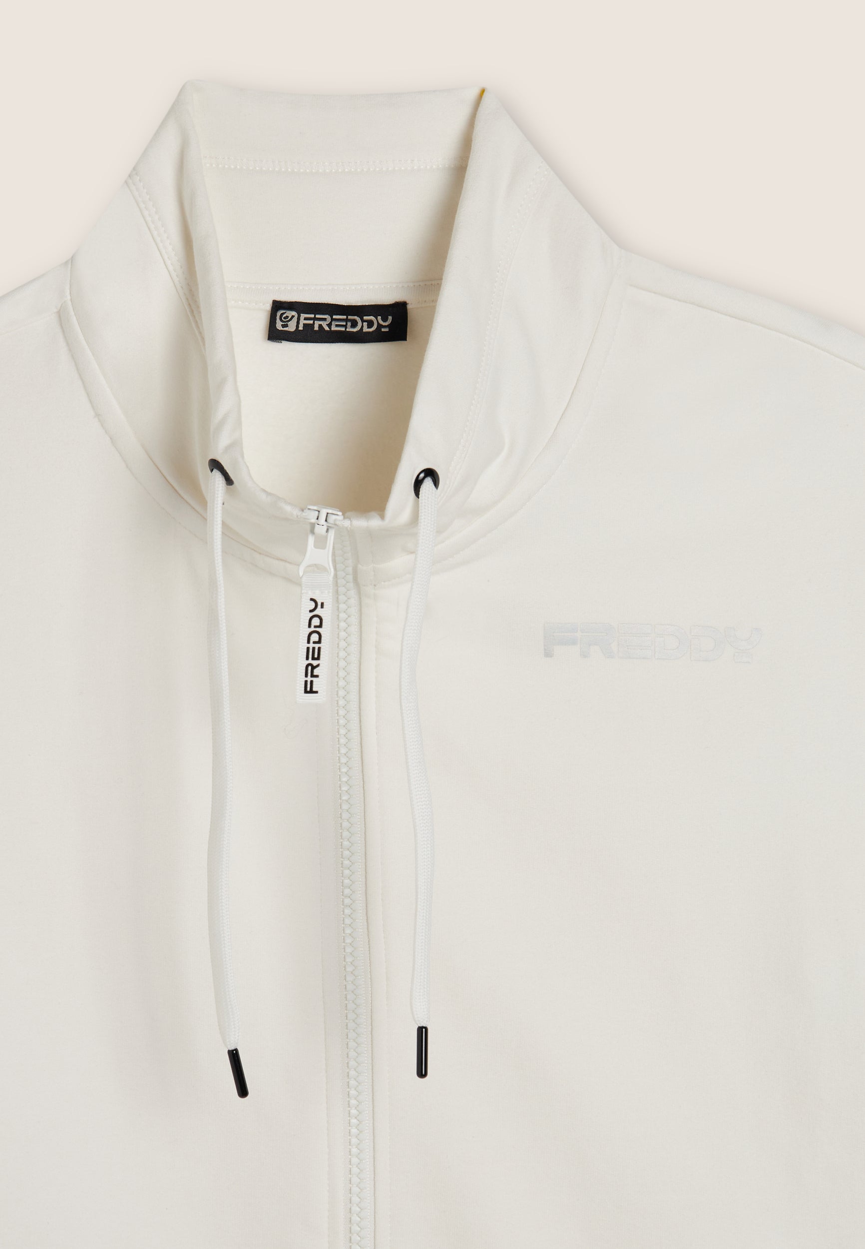 Designed for everyday comfort, this full-zip sweatshirt has an adjustable turtleneck collar and cuffed sleeves. Printed side bands with a repeated “MOV” motif and the Freddy logo on the chest add a distinctive graphic touch. Welted pockets and stretch brushed fleece for maximum comfort.