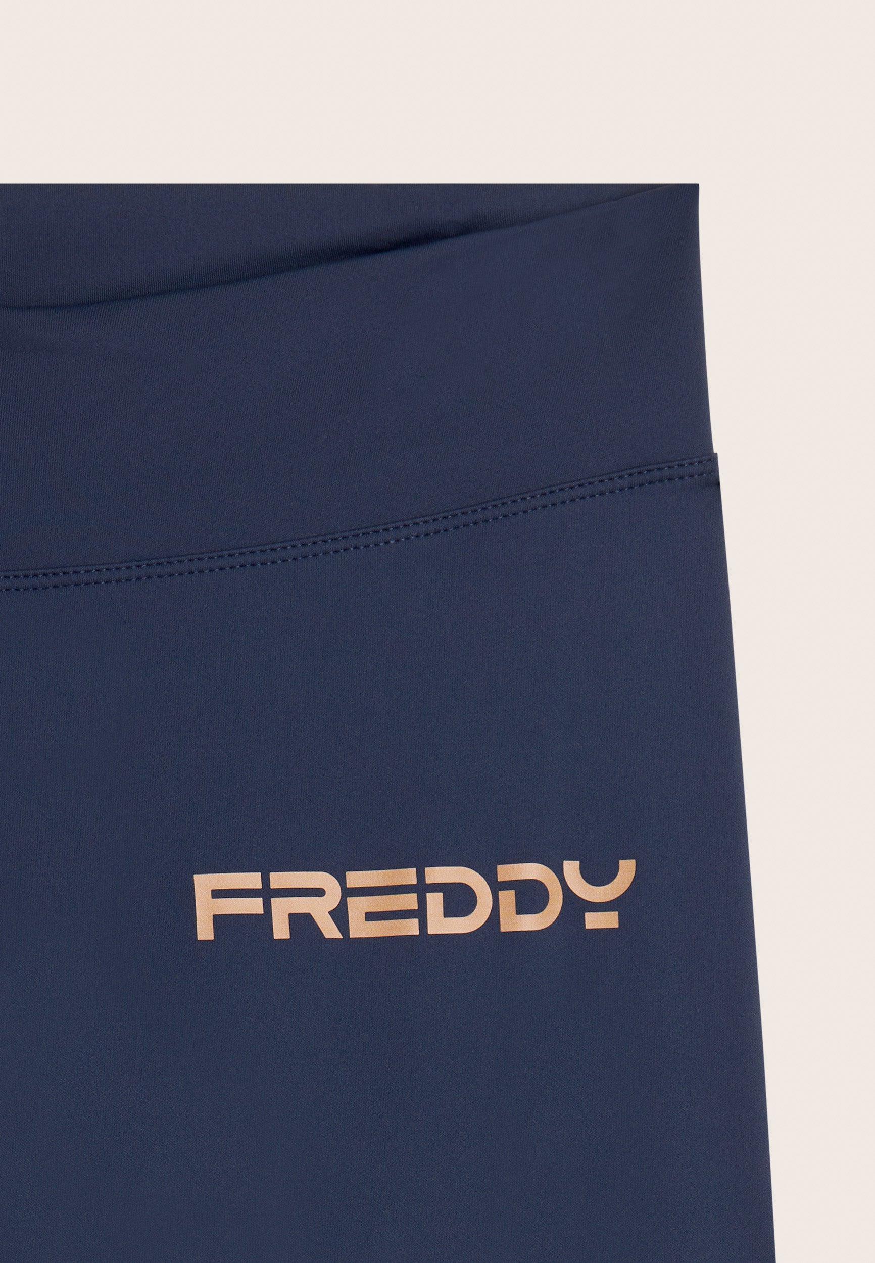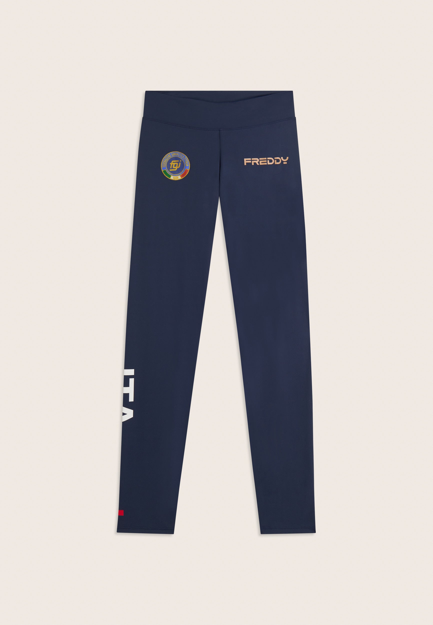 The design celebrates the Italian pride with the vertical ITA print on the right leg, the Italian tricolour print detail on the bottom and the Freddy and Italian Gymnastics Federation institutional logos printed on the sides. A garment crafted with meticulous care, designed to make every little girl feel like a star of the Italian team.