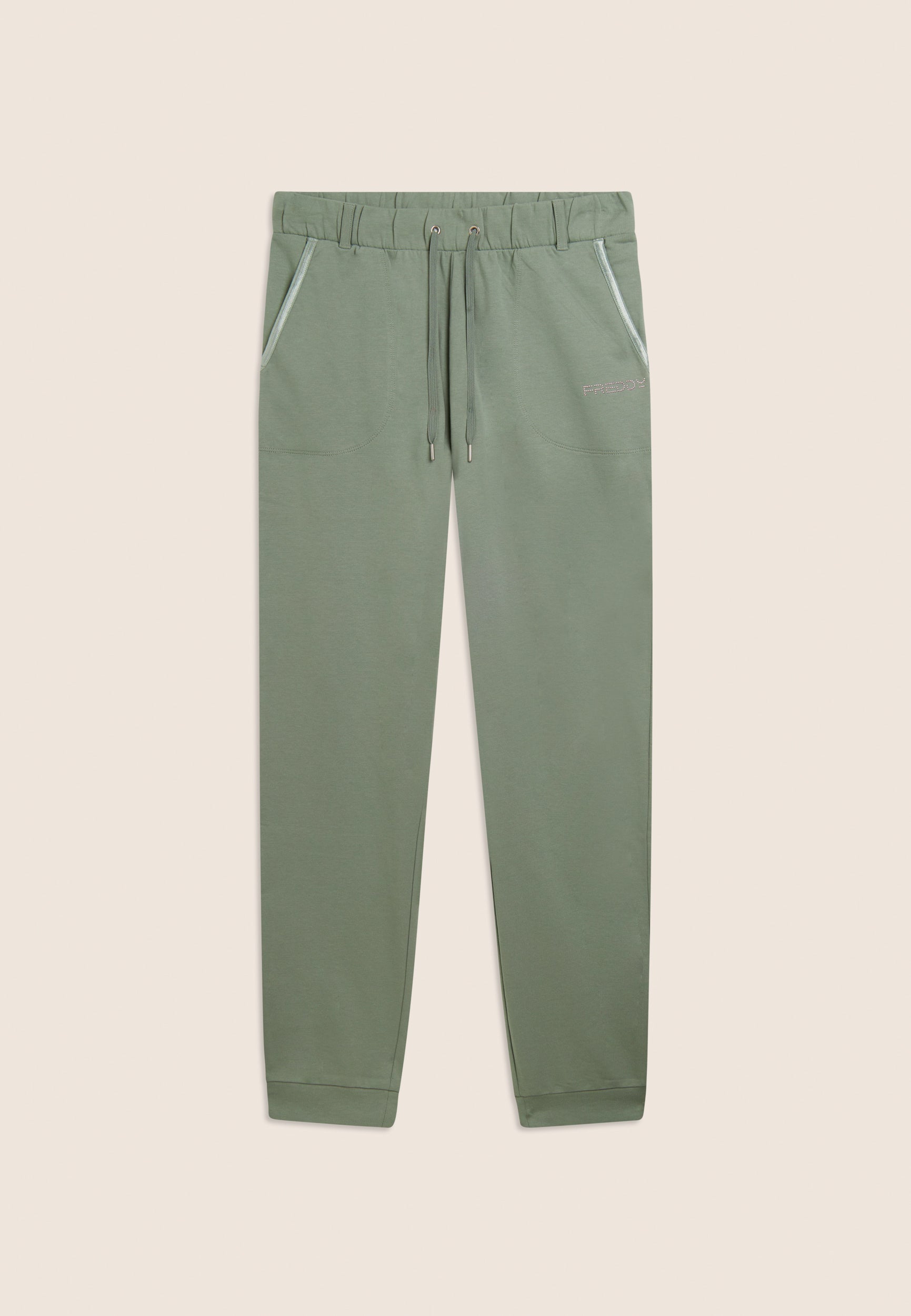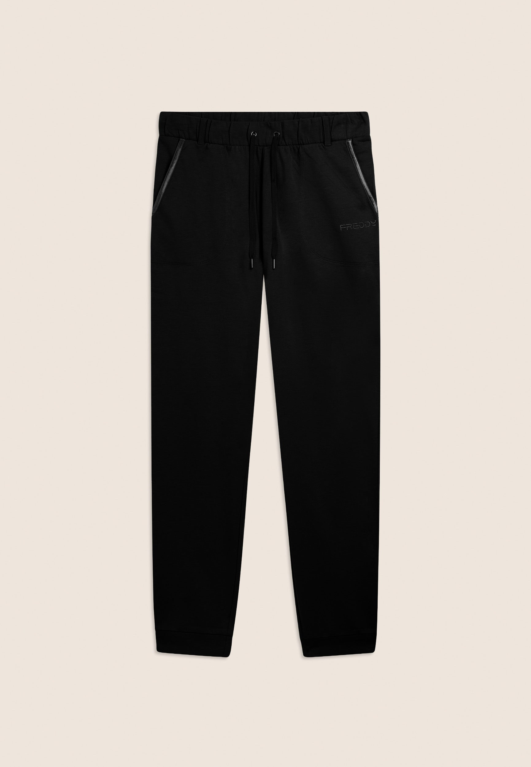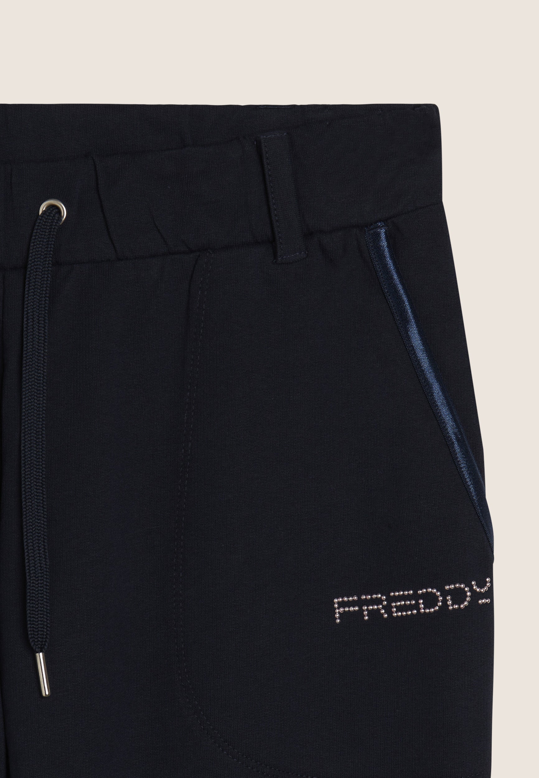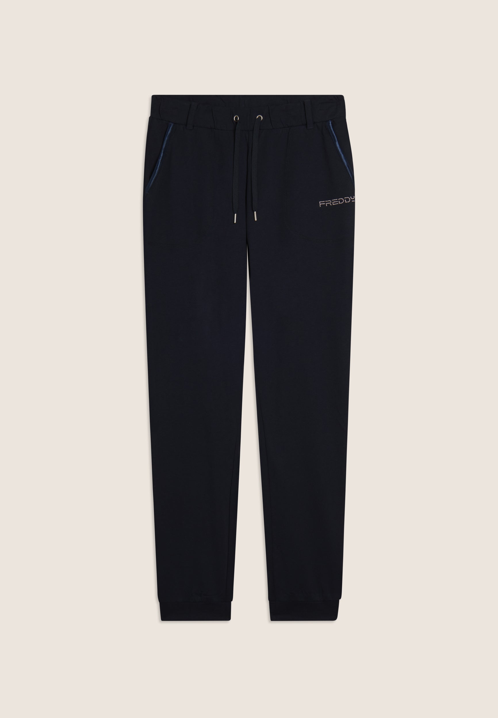 Athletic trousers with a regular fit and cuffed hem, ideal for a dynamic and comfortable look. The regular waist with belt loops and drawstrings ensures a customisable fit. The FREDDY logo on the left pocket, composed of light pink beads, adds a distinctive touch. Front camp pockets, with an opening edged with shiny elastic, complete the design. Made of heavy cotton stretch jersey, they are perfect for leisure and light exercise.