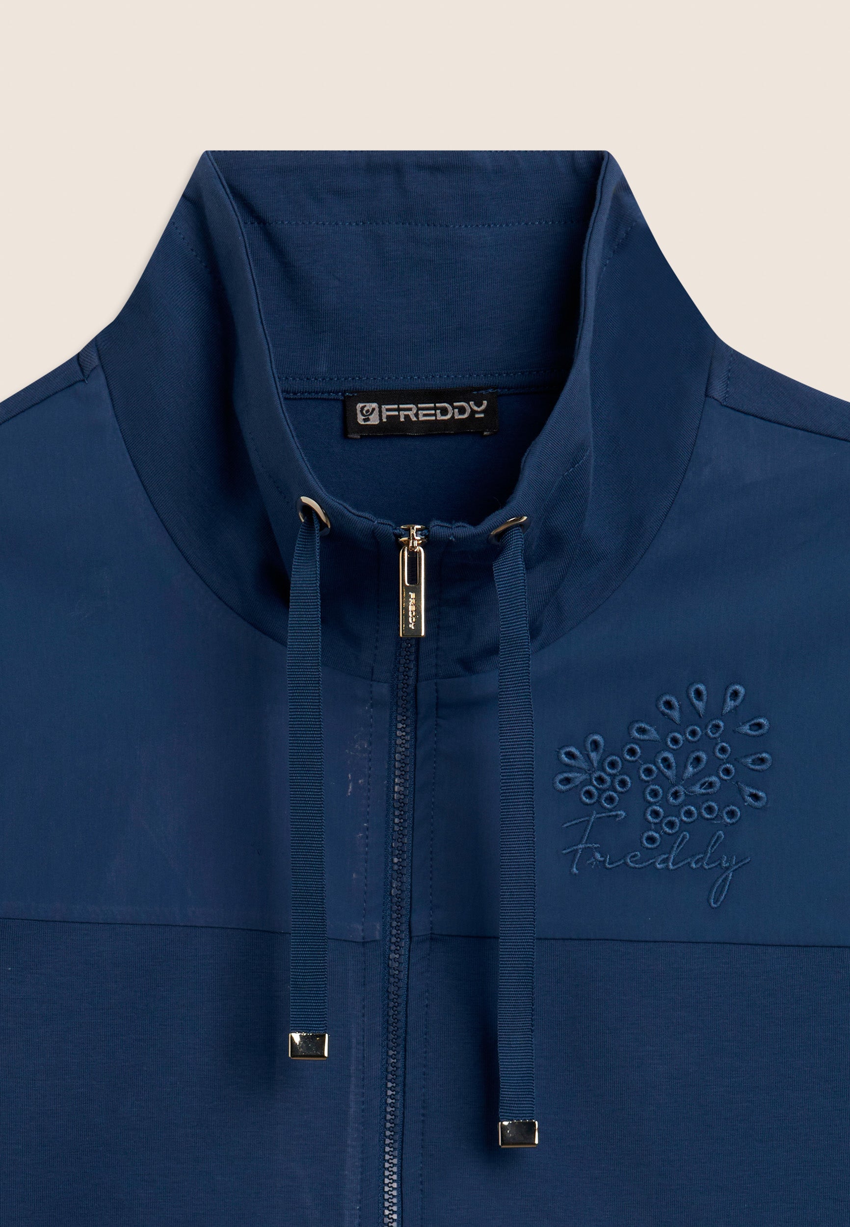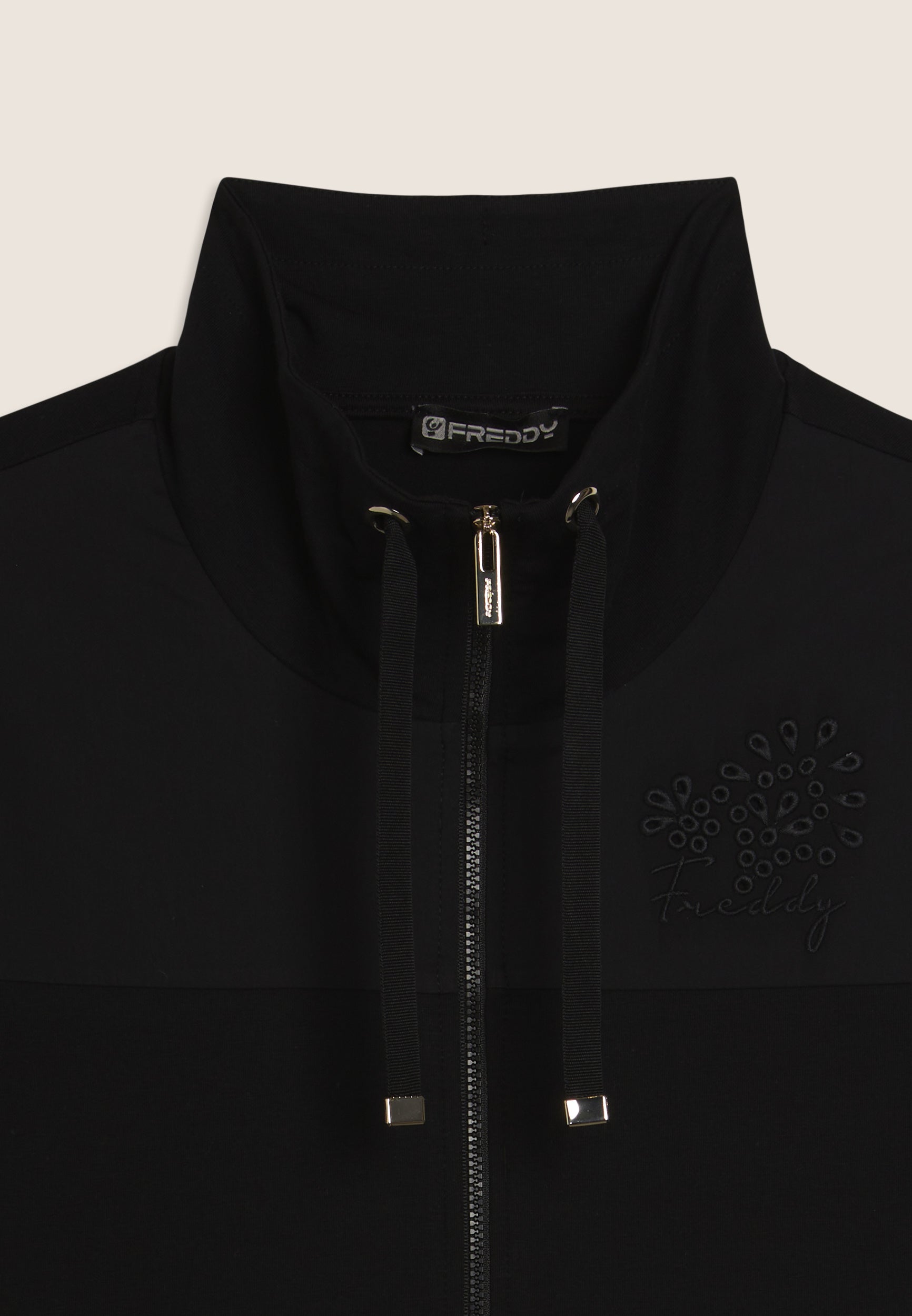 Zip sweatshirt with a regular fit and length, featuring a zip fastening and a hem with a band open at the sides by two small slits. The high neck is internally lined and equipped with matching drawstrings. The long sleeves are finished with ribbed cuffs. The chest is decorated with a stretch poplin fabric insert with broderie anglaise-style floral embroidery over the heart, and a gold FREDDY logo tab enriches the opening of the left pocket. Made of heavy cotton stretch jersey, this sweatshirt combines comfort and refined details.