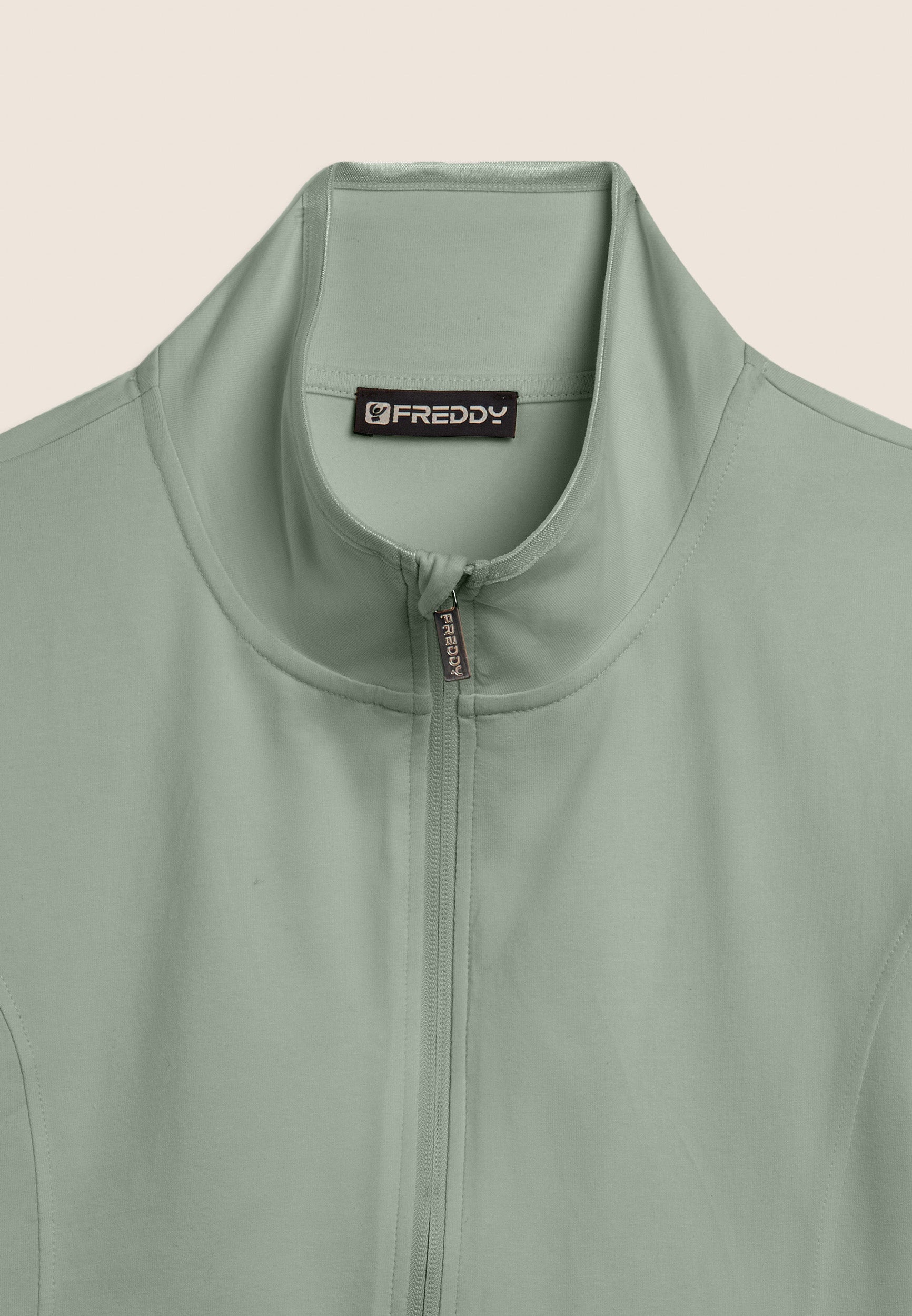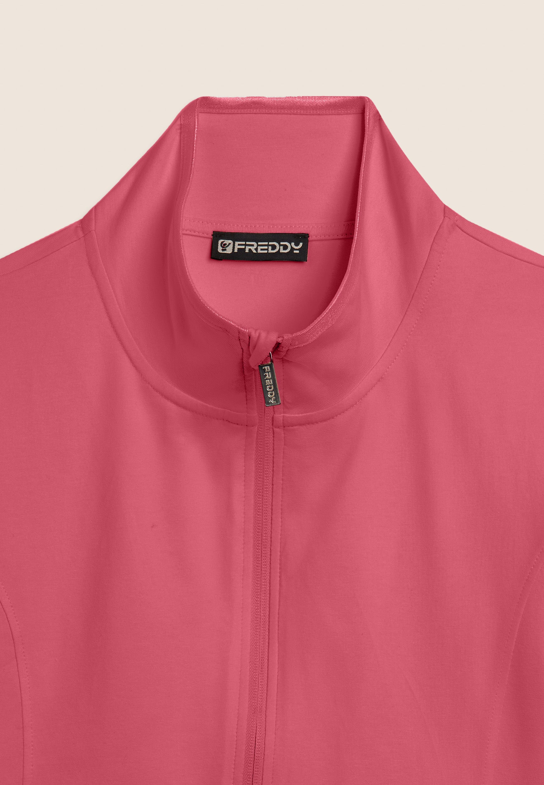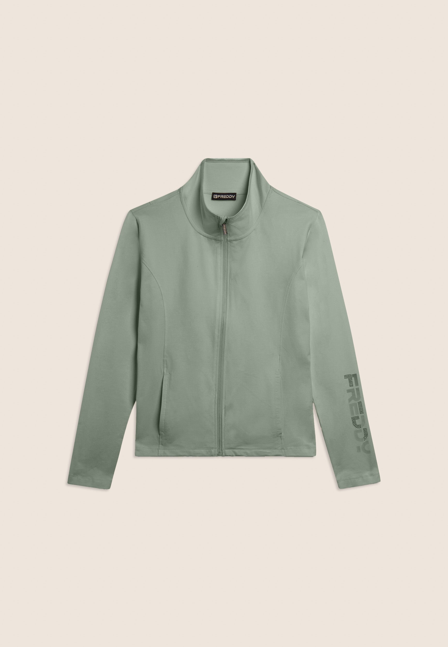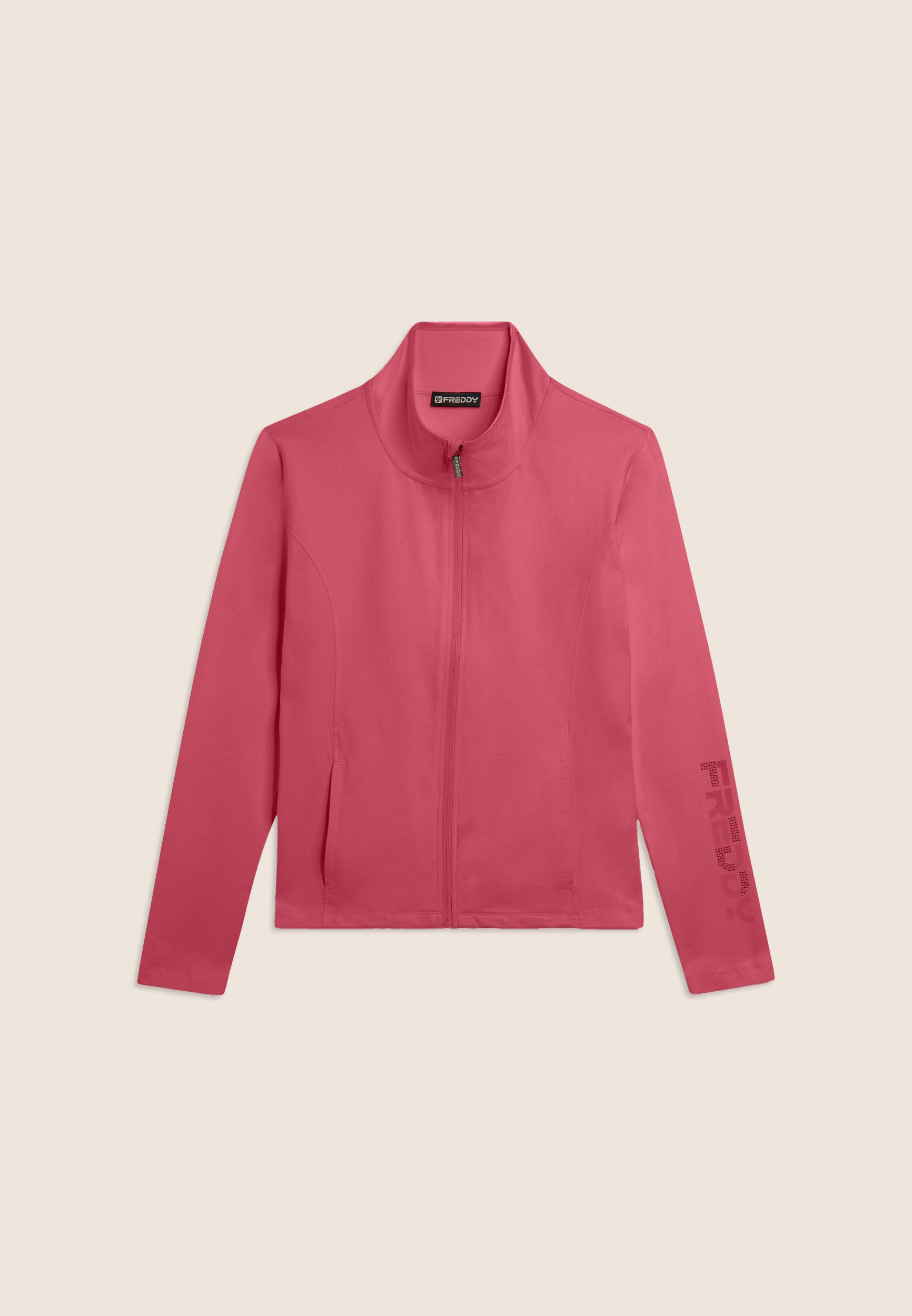 Zip sweatshirt with high neck edged with a shiny elastic band, ideal for dynamic leisure. The regular fit and straight bottom with side slits offer comfort and practicality. The light pink tone of the small FREDDY logo in beads and the large holographic logo on the bottom sleeve add a romantic touch. Made of heavy cotton stretch jersey, it is perfect for low-intensity sports.