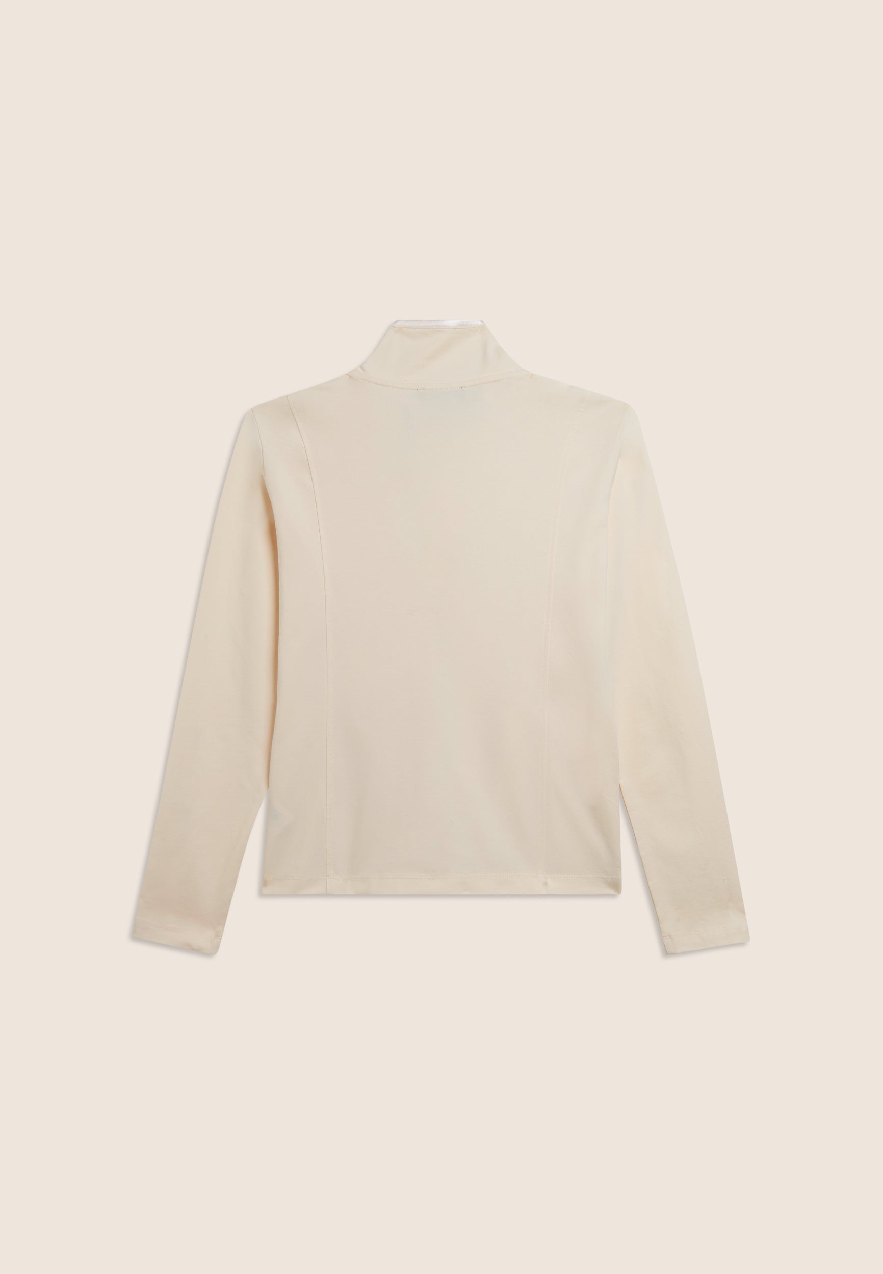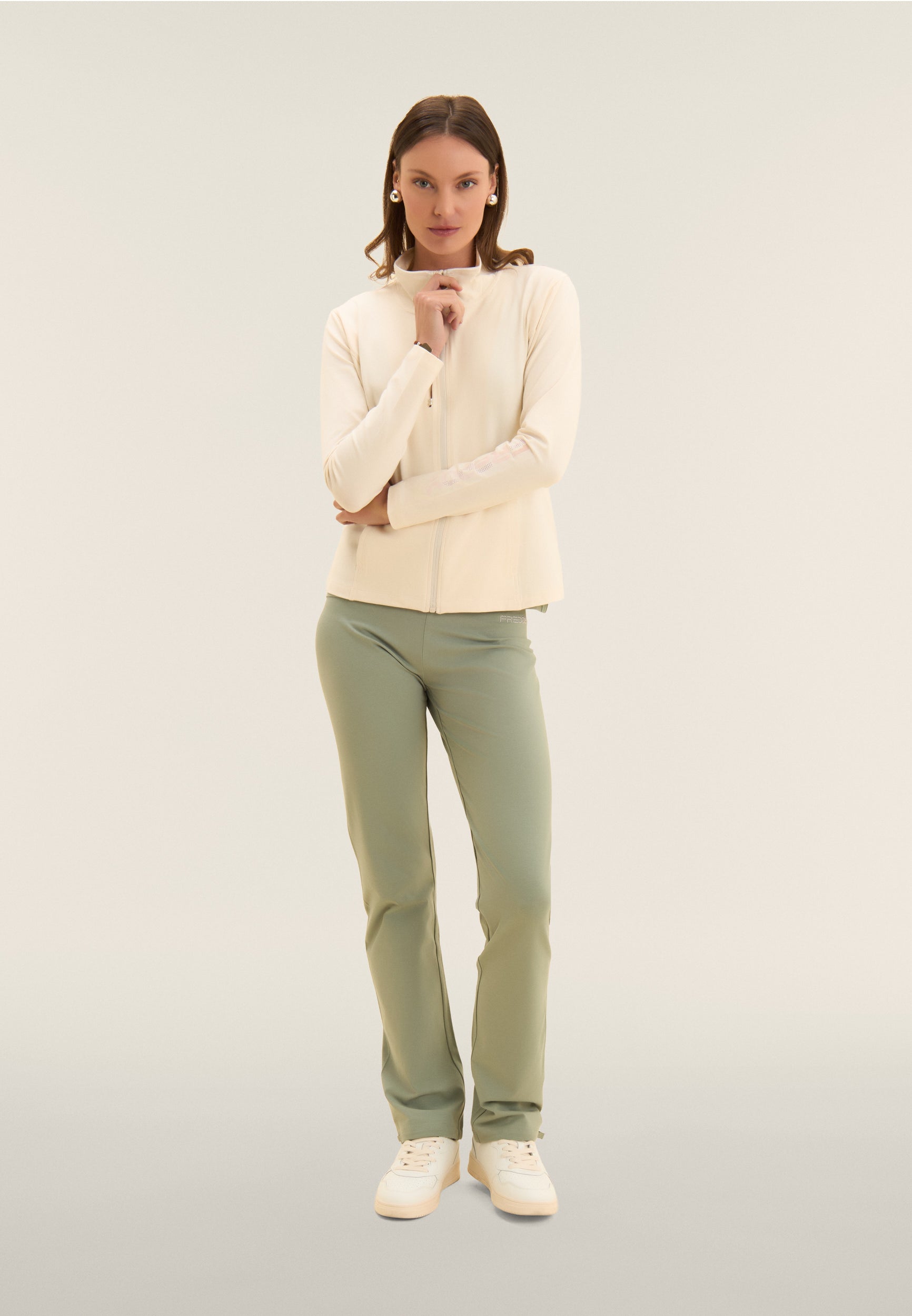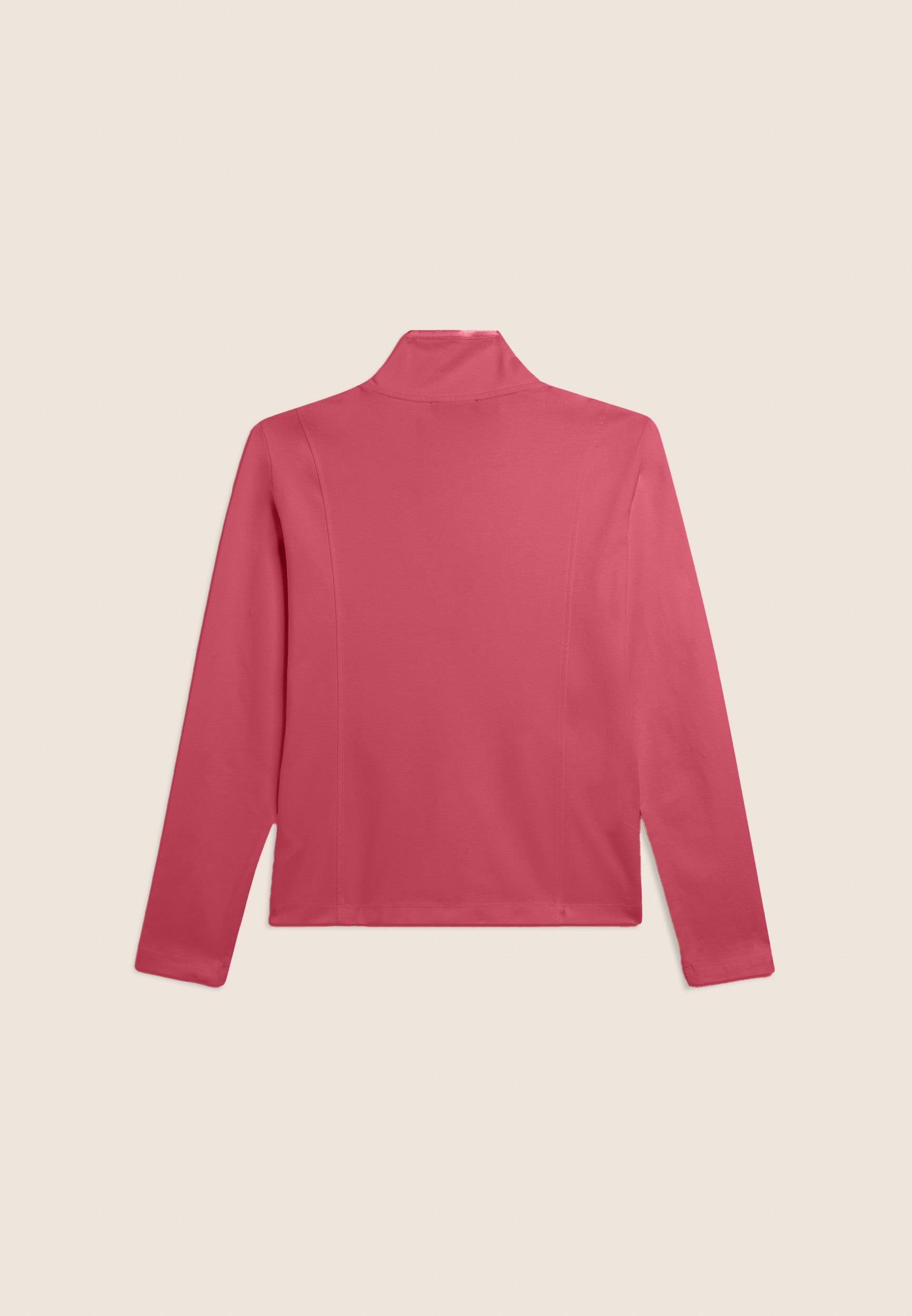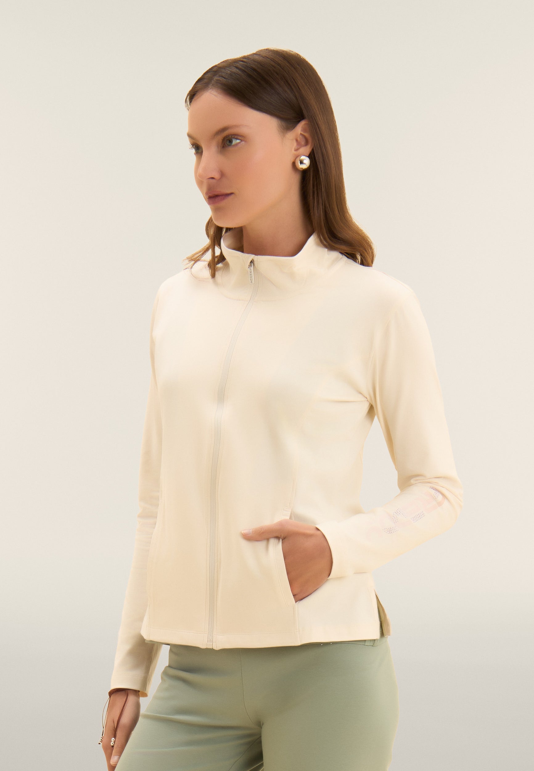 Zip sweatshirt with high neck edged with a shiny elastic band, ideal for dynamic leisure. The regular fit and straight bottom with side slits offer comfort and practicality. The light pink tone of the small FREDDY logo in beads and the large holographic logo on the bottom sleeve add a romantic touch. Made of heavy cotton stretch jersey, it is perfect for low-intensity sports.