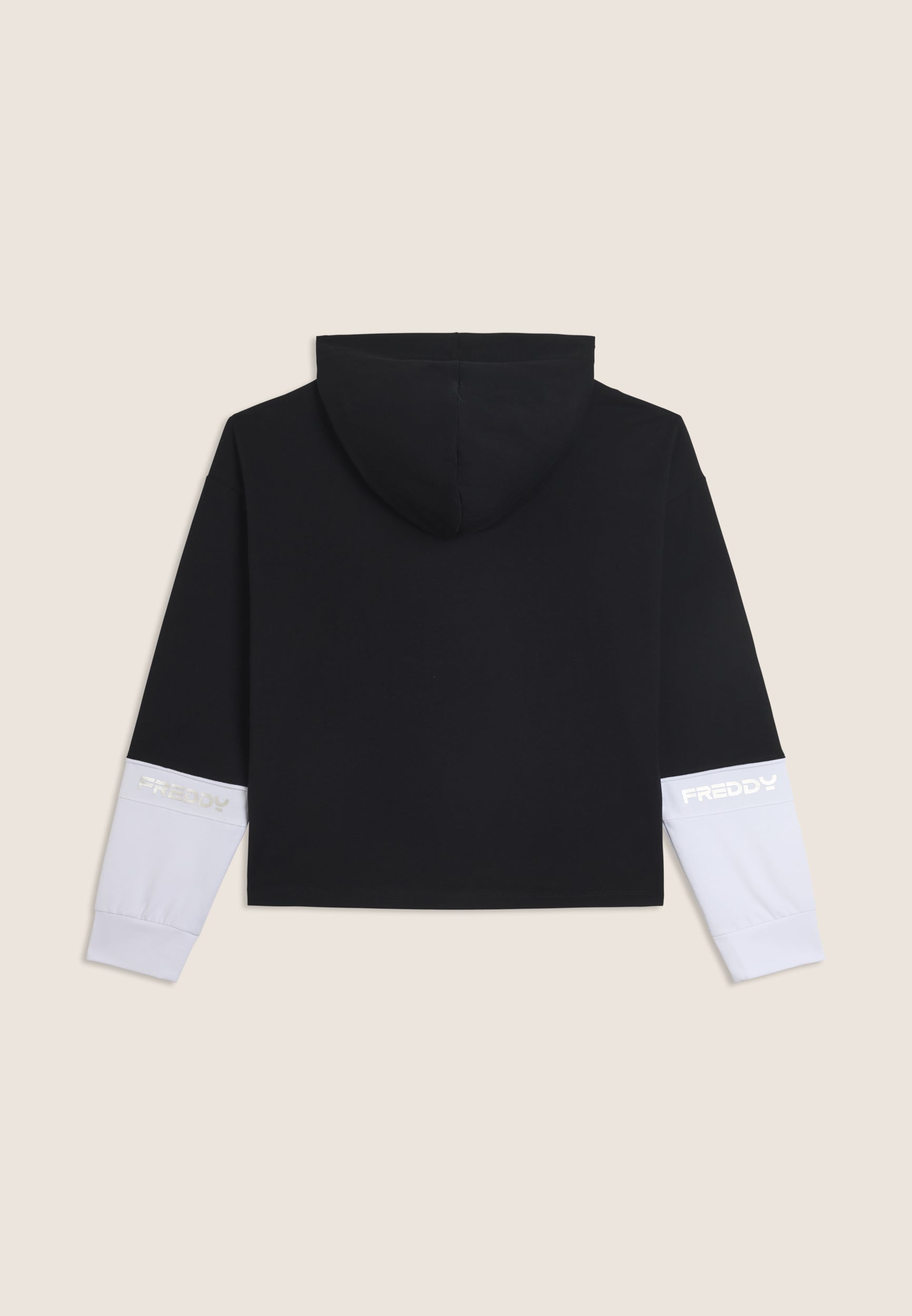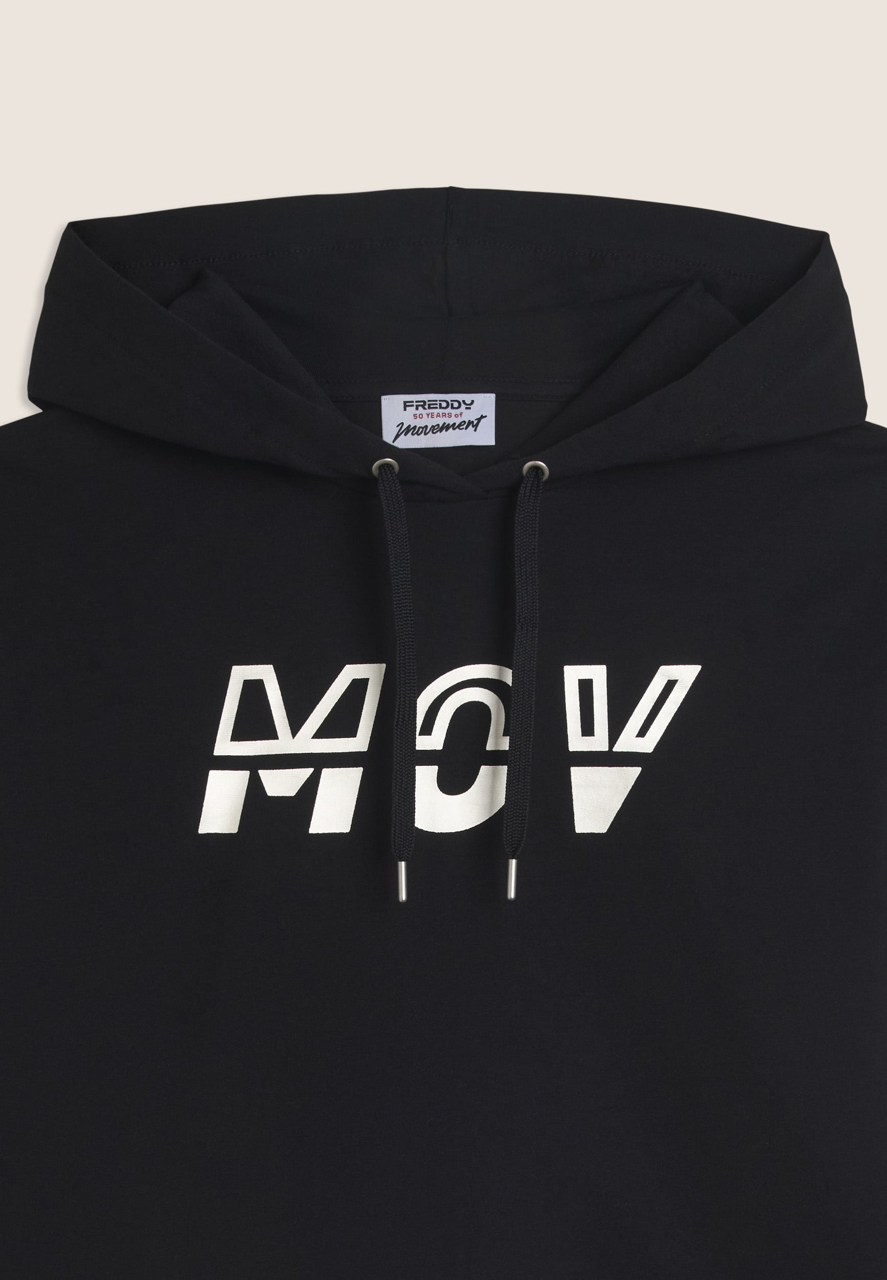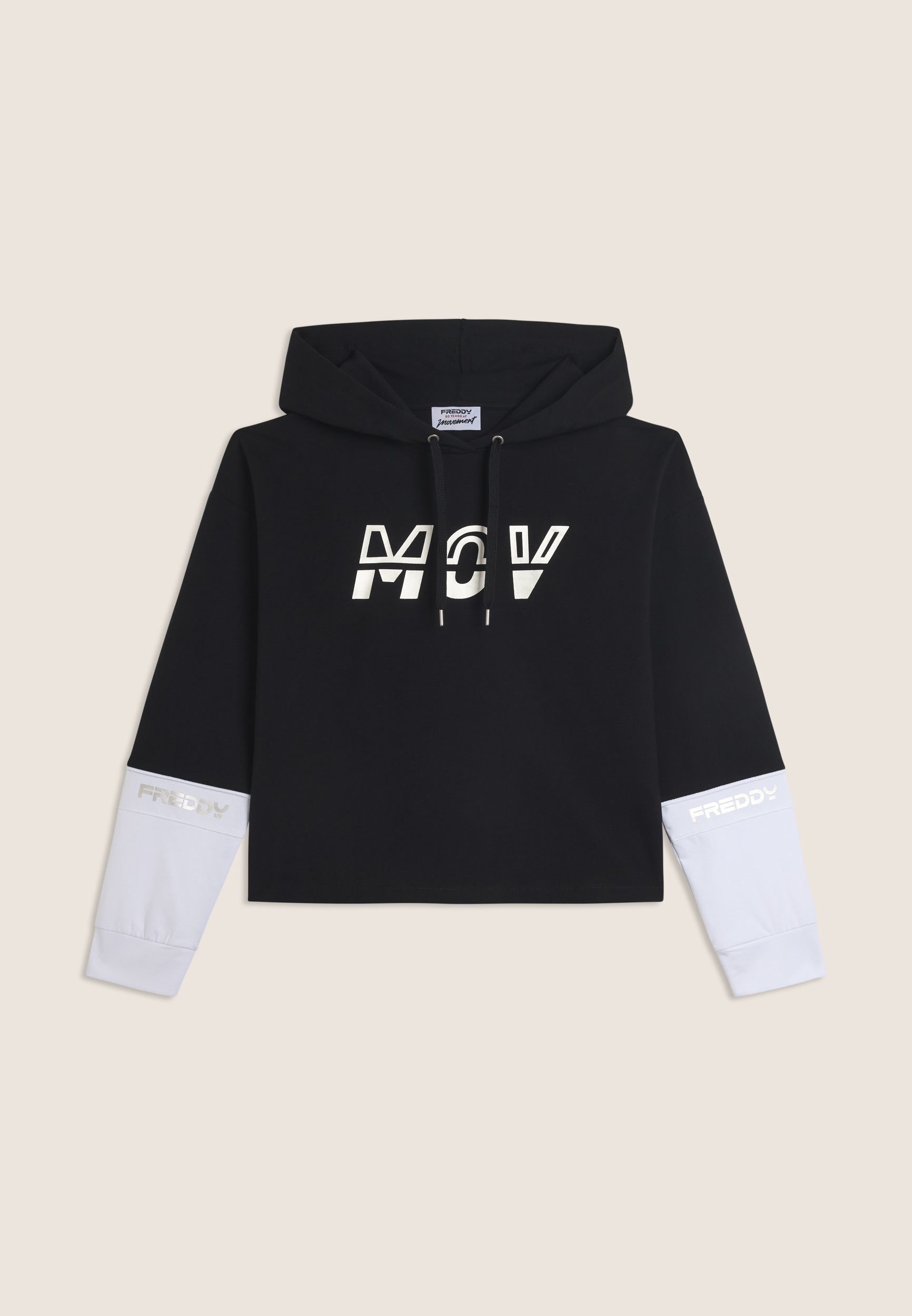 Hoodie designed to show off your style and comfort on your active days. Made of heavy cotton stretch jersey, it has a comfortable fit and a length that reaches just above the hips. The hood is jersey-lined and fitted with an adjustable drawstring, and the sleeves feature an original colour block design with a logo-printed jersey insert dividing the contrasting sections. The bottom is straight for a natural fit. On the front, the maxi pearl MOV print stands out, symbolising your desire to move freely. Ideal for sport and leisure.