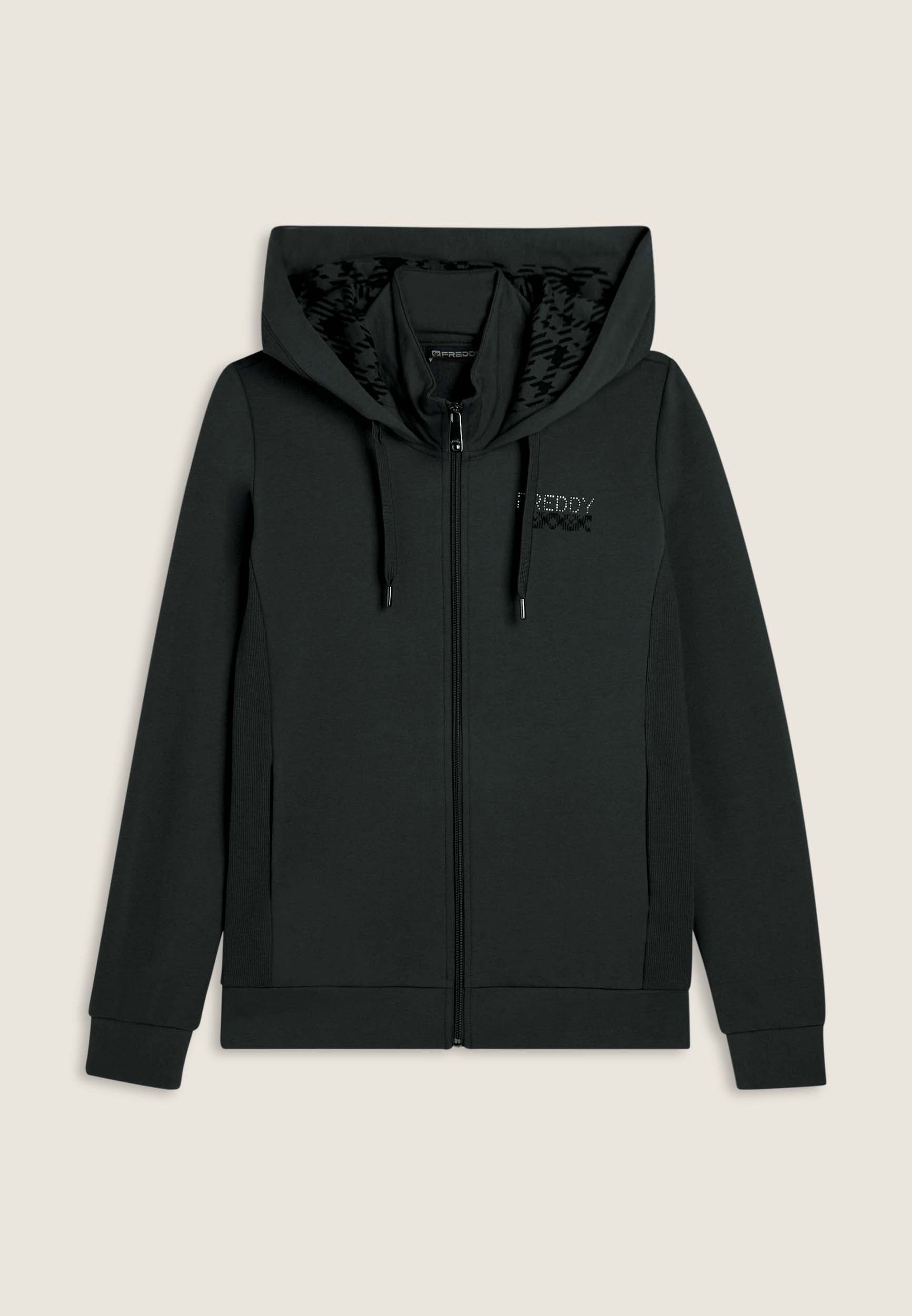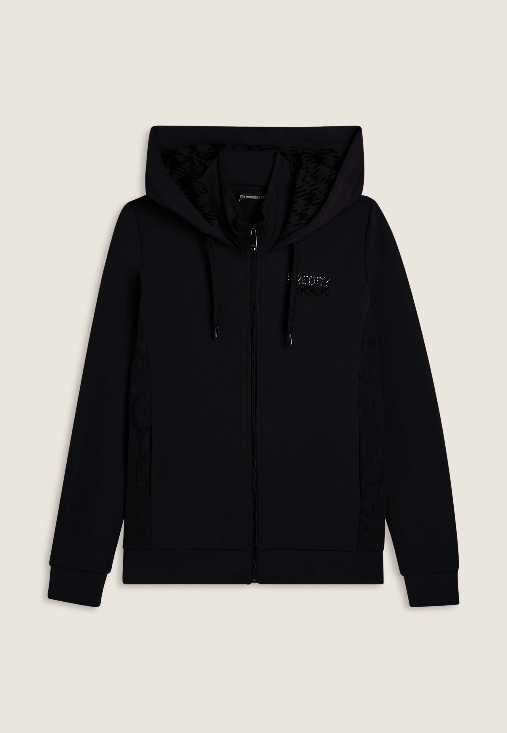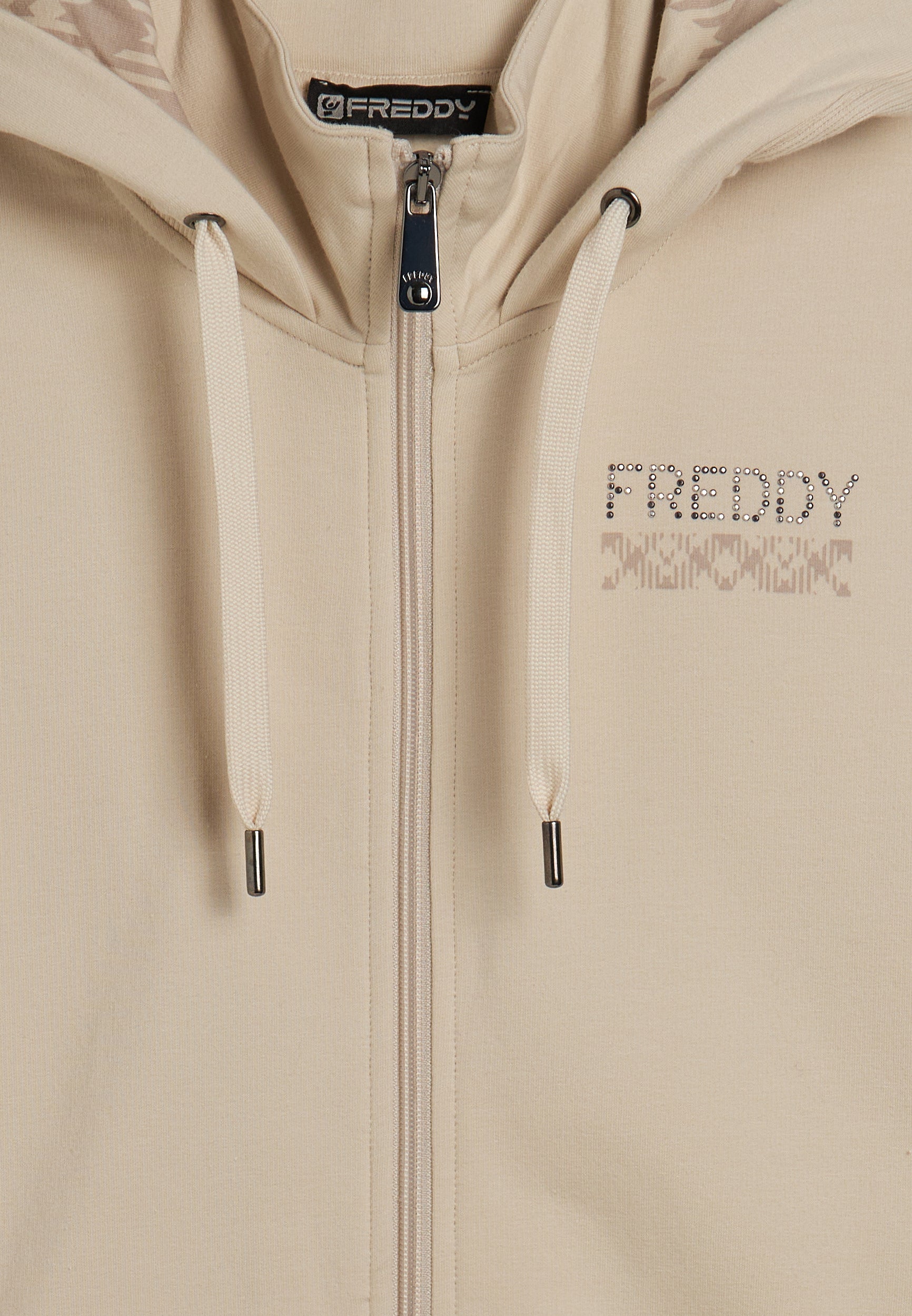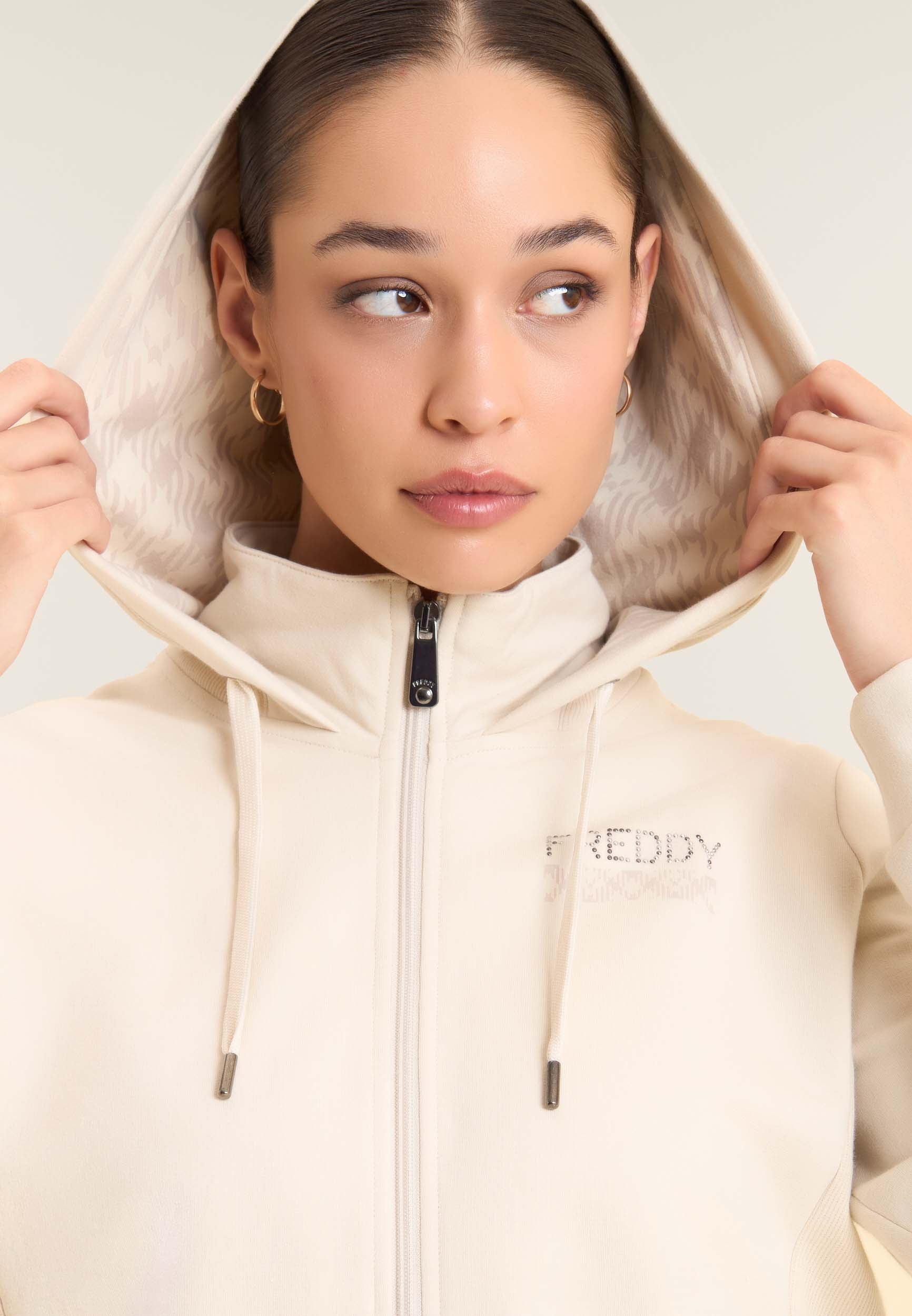 Full-zip sweatshirt with side vents at the bottom, geometric print jersey doubled hood and ribbed outer lining. Integrated turtleneck, ribbed side inserts and FREDDY studded logo complete the garment, together with besom pockets.
