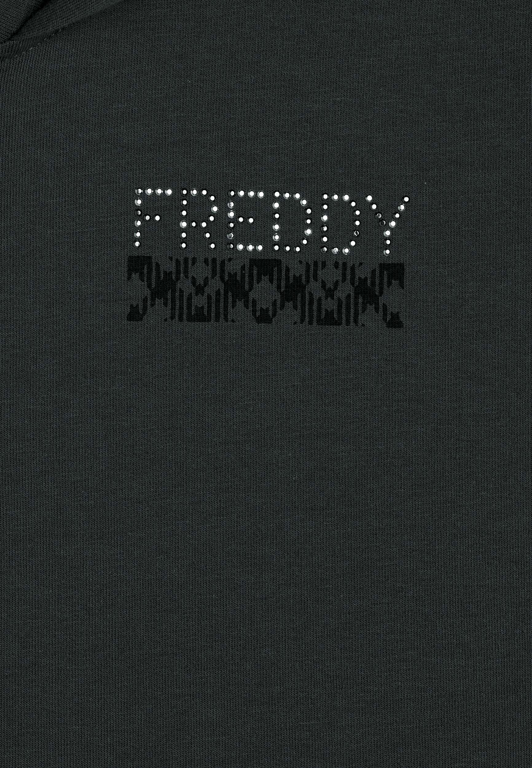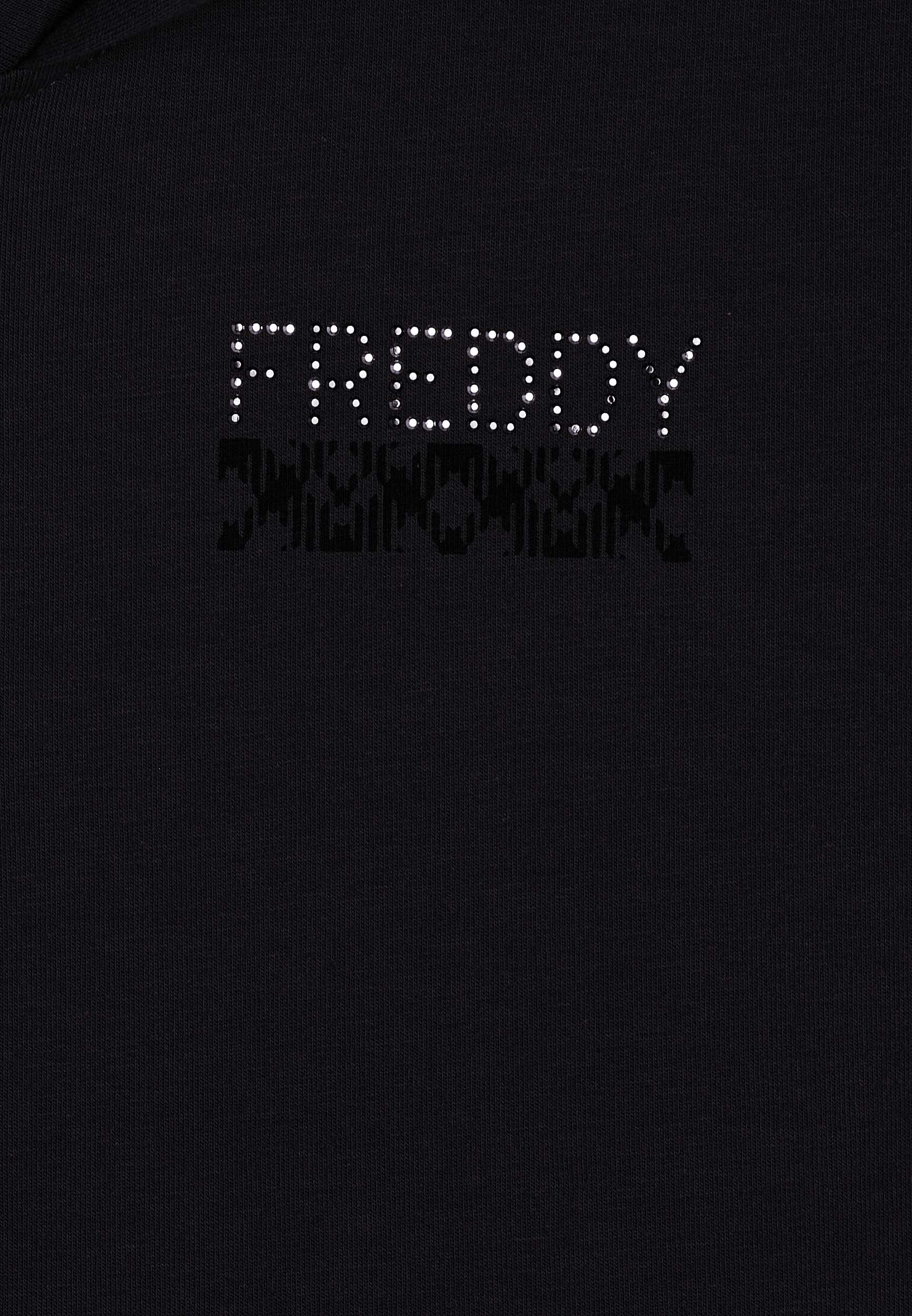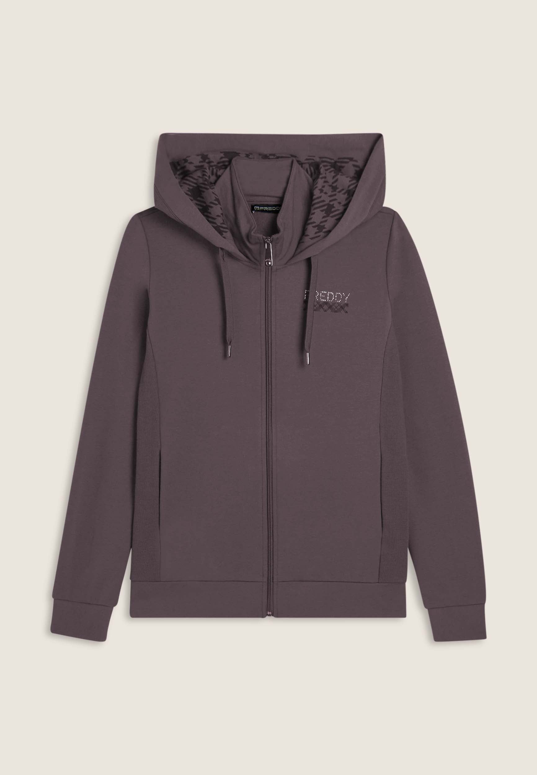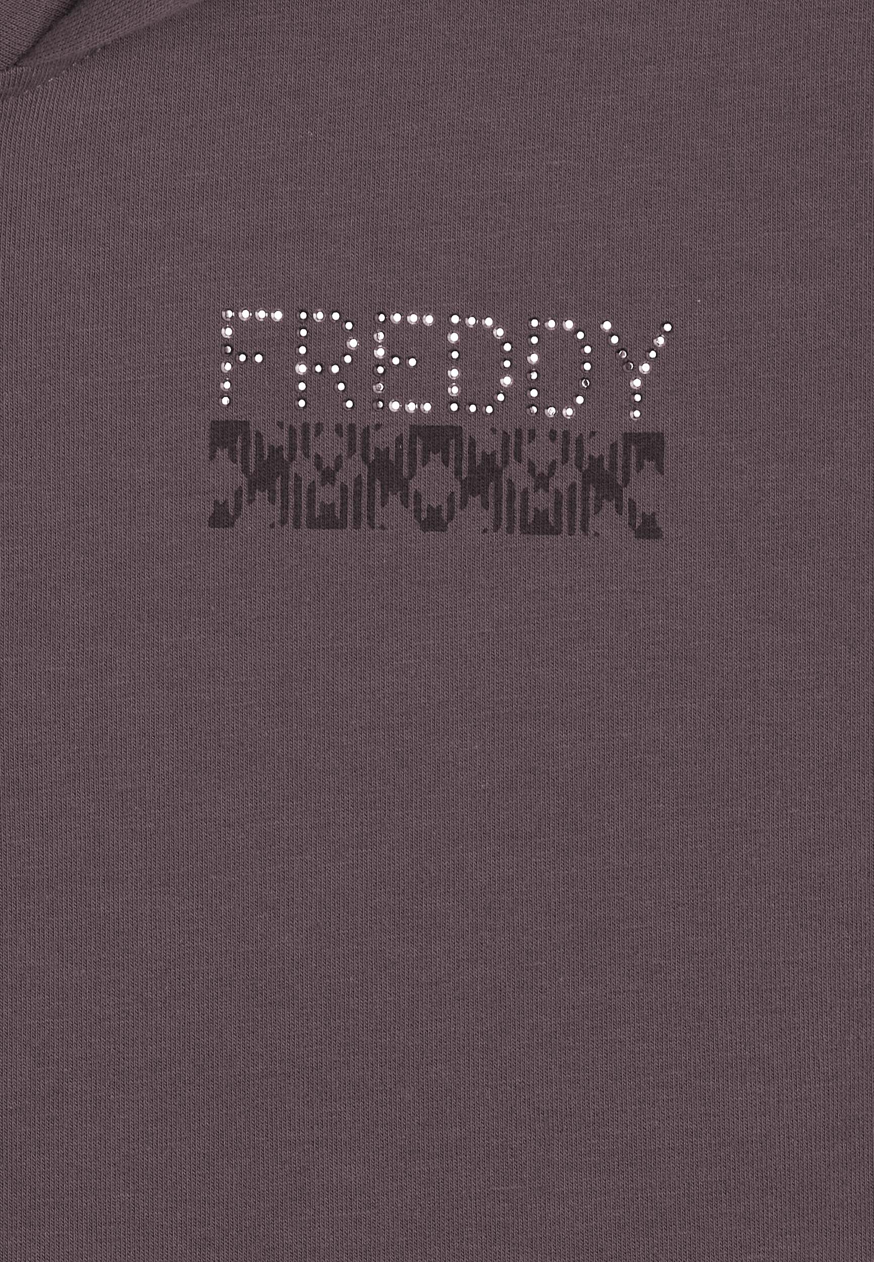 Full-zip sweatshirt with side vents at the bottom, geometric print jersey doubled hood and ribbed outer lining. Integrated turtleneck, ribbed side inserts and FREDDY studded logo complete the garment, together with besom pockets.