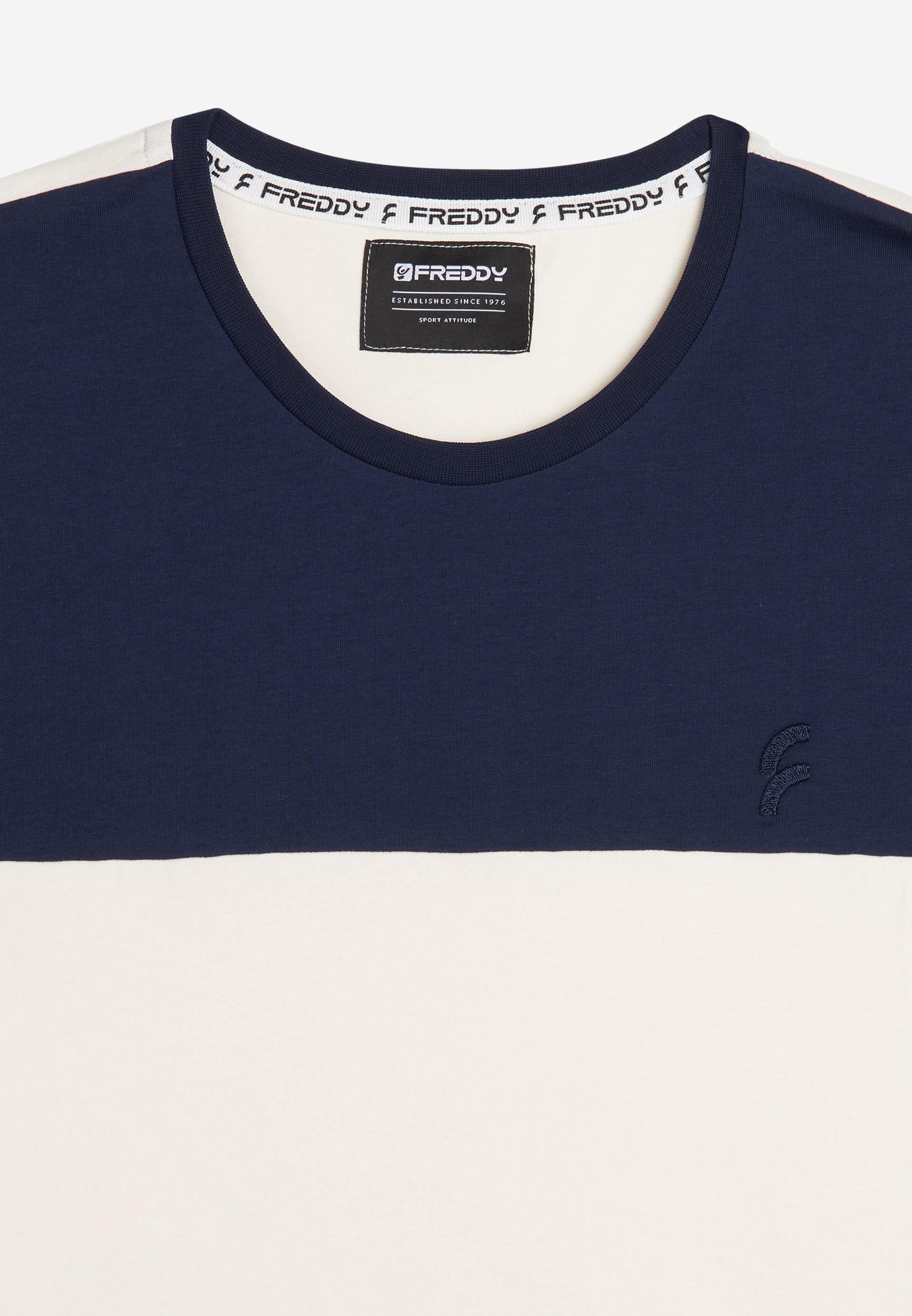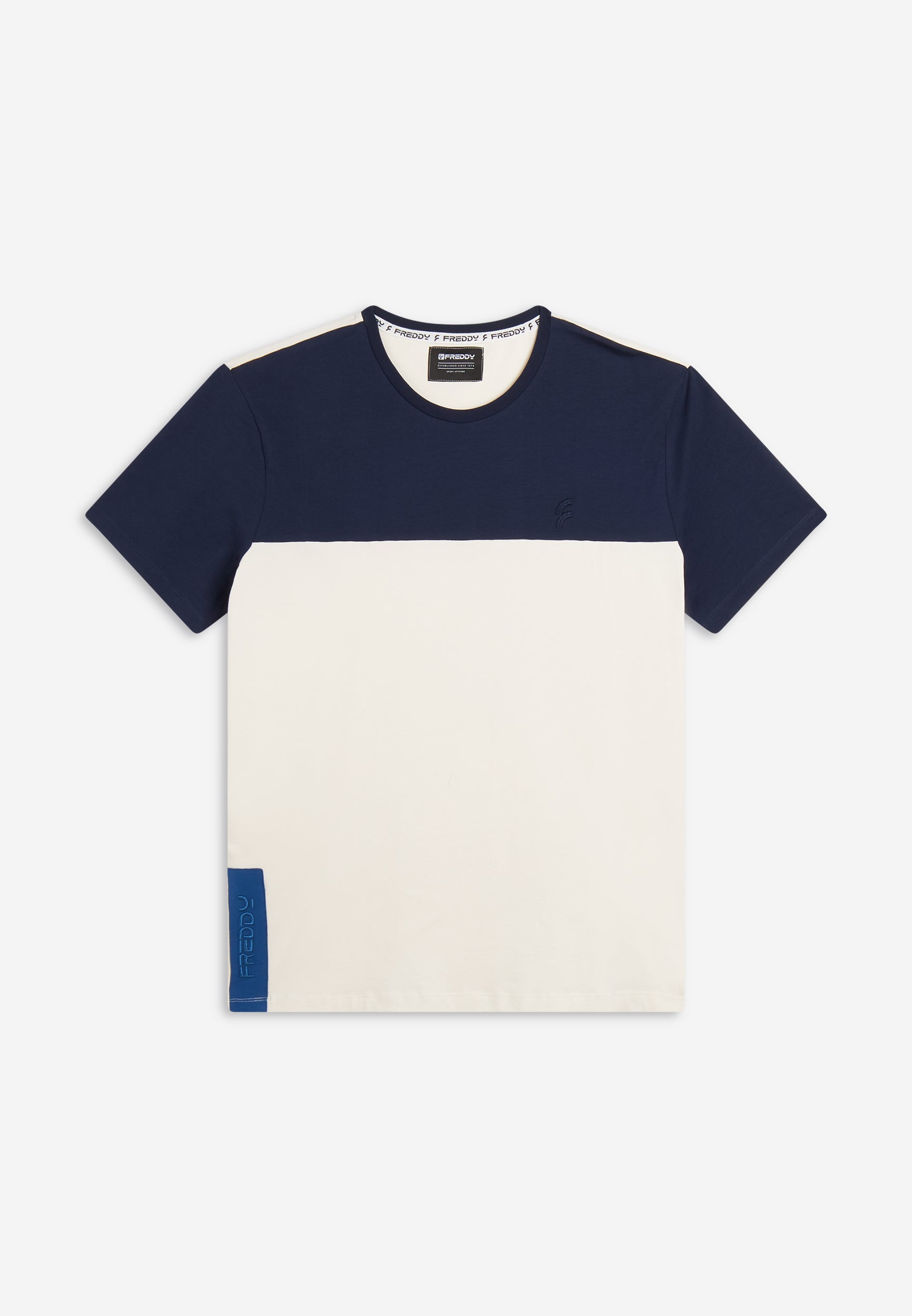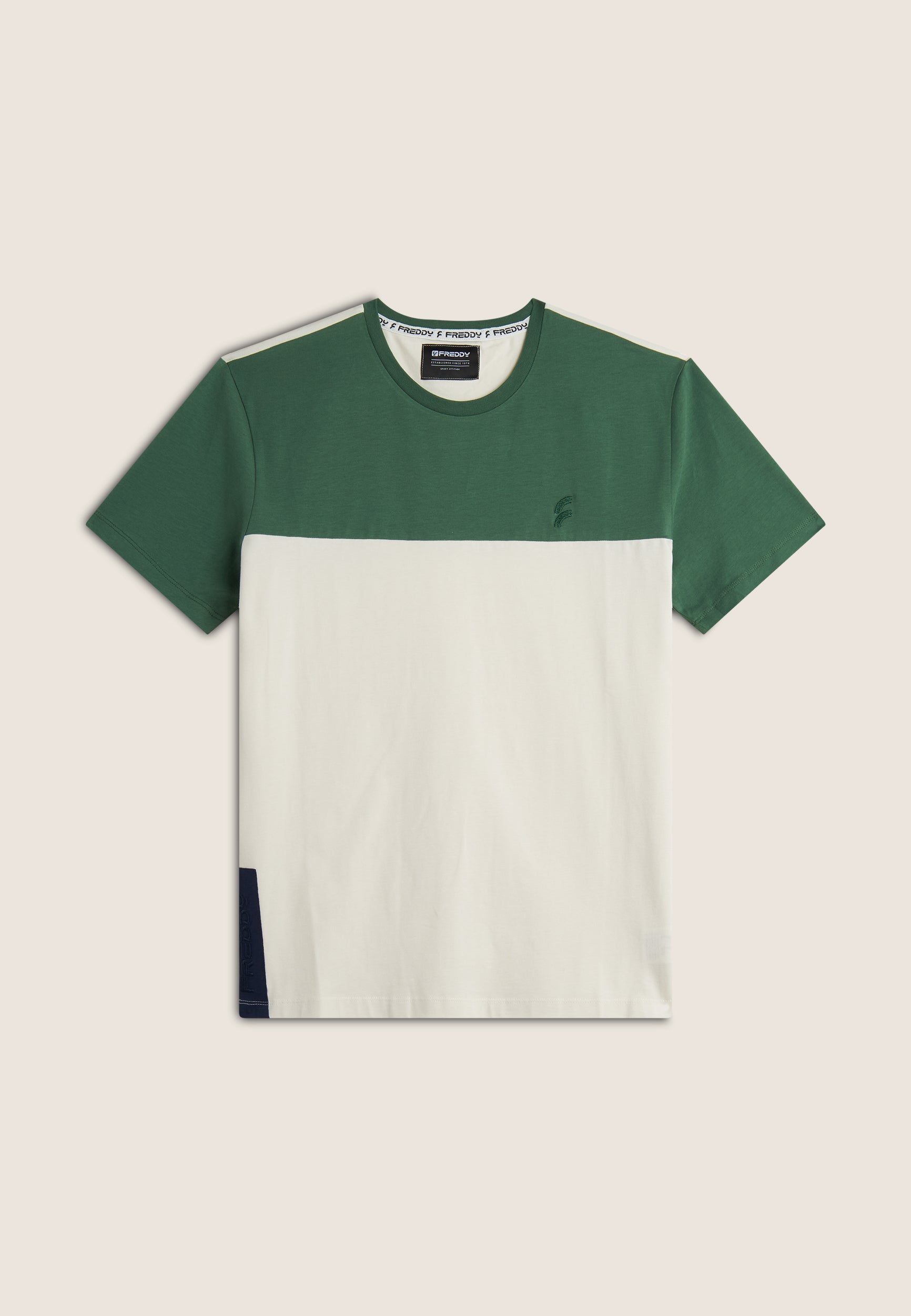 This stretch cotton t-shirt is perfect for men who like to move freely. It’s rich in stylish details such as contrast colour inserts and a logo on a colourful fabric insert on the right hip.