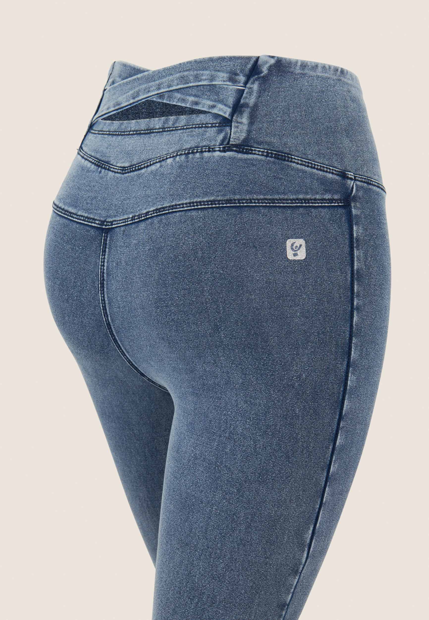 These high waist N.O.W. jeggings with crossover and cut-out detail at the back enhance every silhouette. They are made from organic cotton jersey with a denim-effect wash and spray treatment for a slight worn-in effect. The 7/8 length and super-skinny fit provide a modern and sophisticated touch. FREDDY logo on the side.
