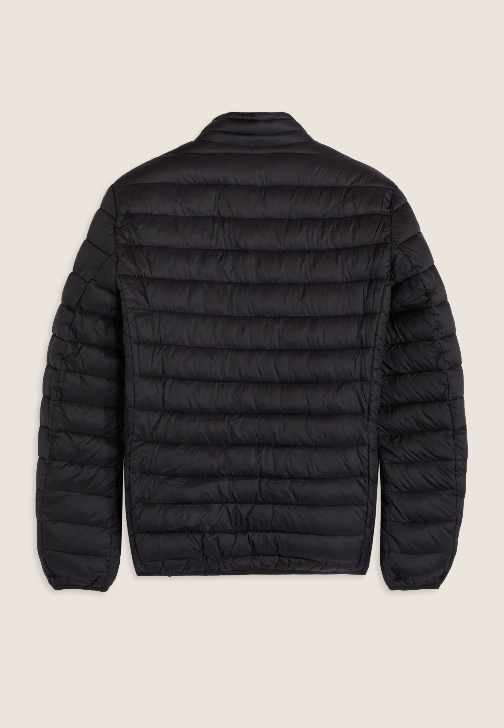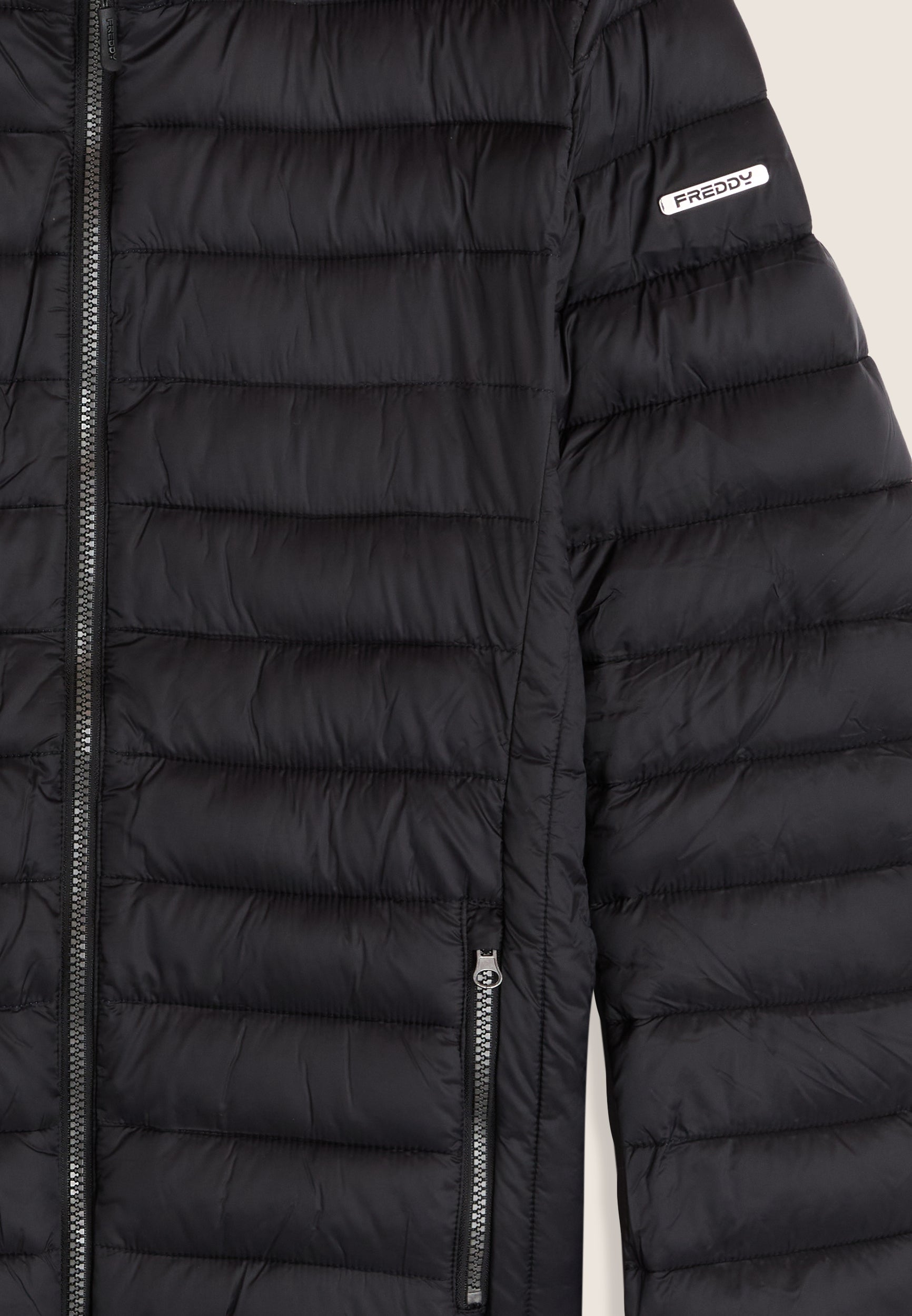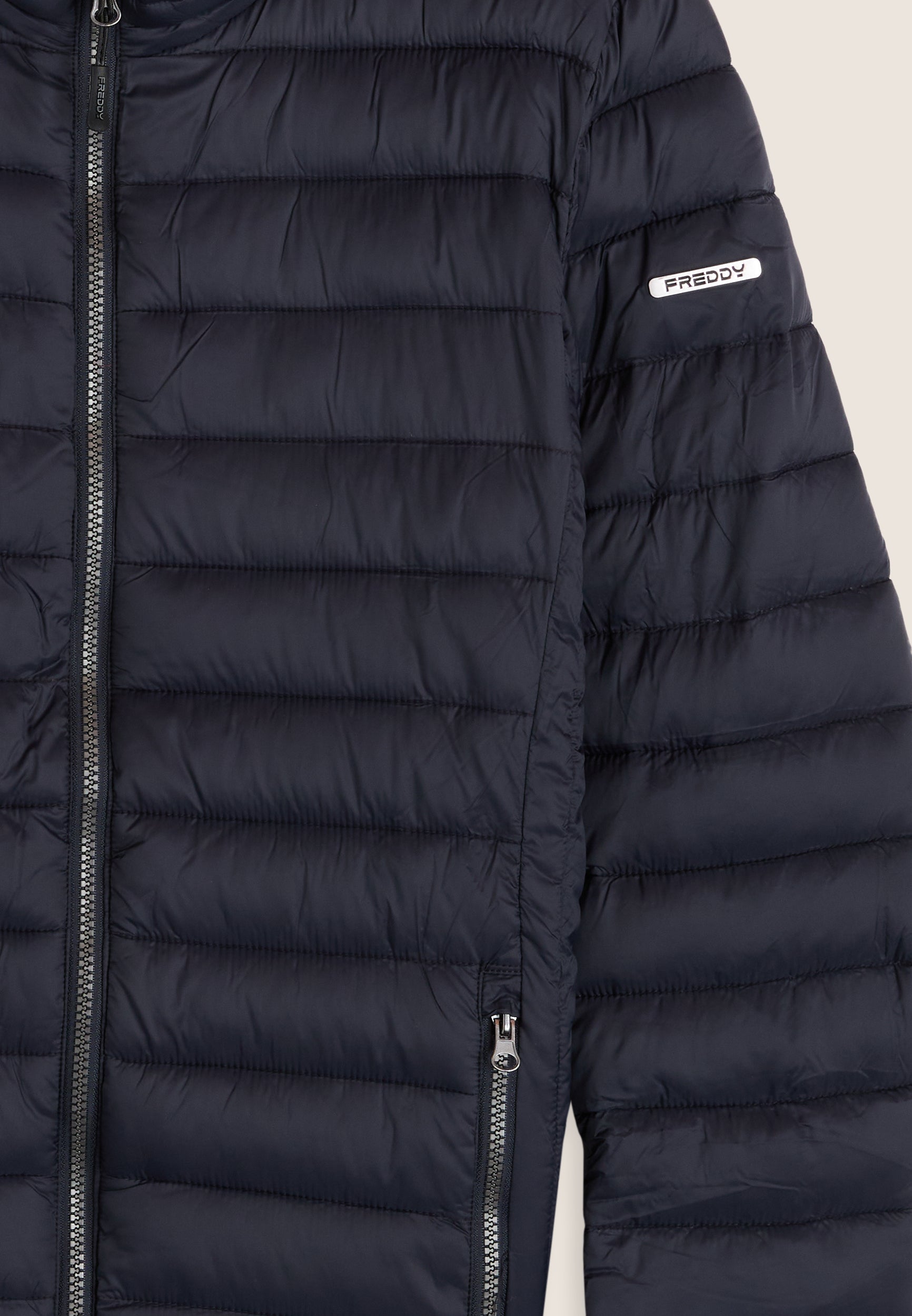 Men's down jacket with regular fit, hip length and horizontal quilting. Double-slide full-zip fastening and adjustable drawstring waist with stoppers. It has a hood and turtleneck, long sleeves with elasticated jacquard bottom. Logo applied on the left sleeve, front pockets with zip fastening. The fake-down padding is animal-friendly and provides excellent insulation, maintaining good performance even in wet conditions.