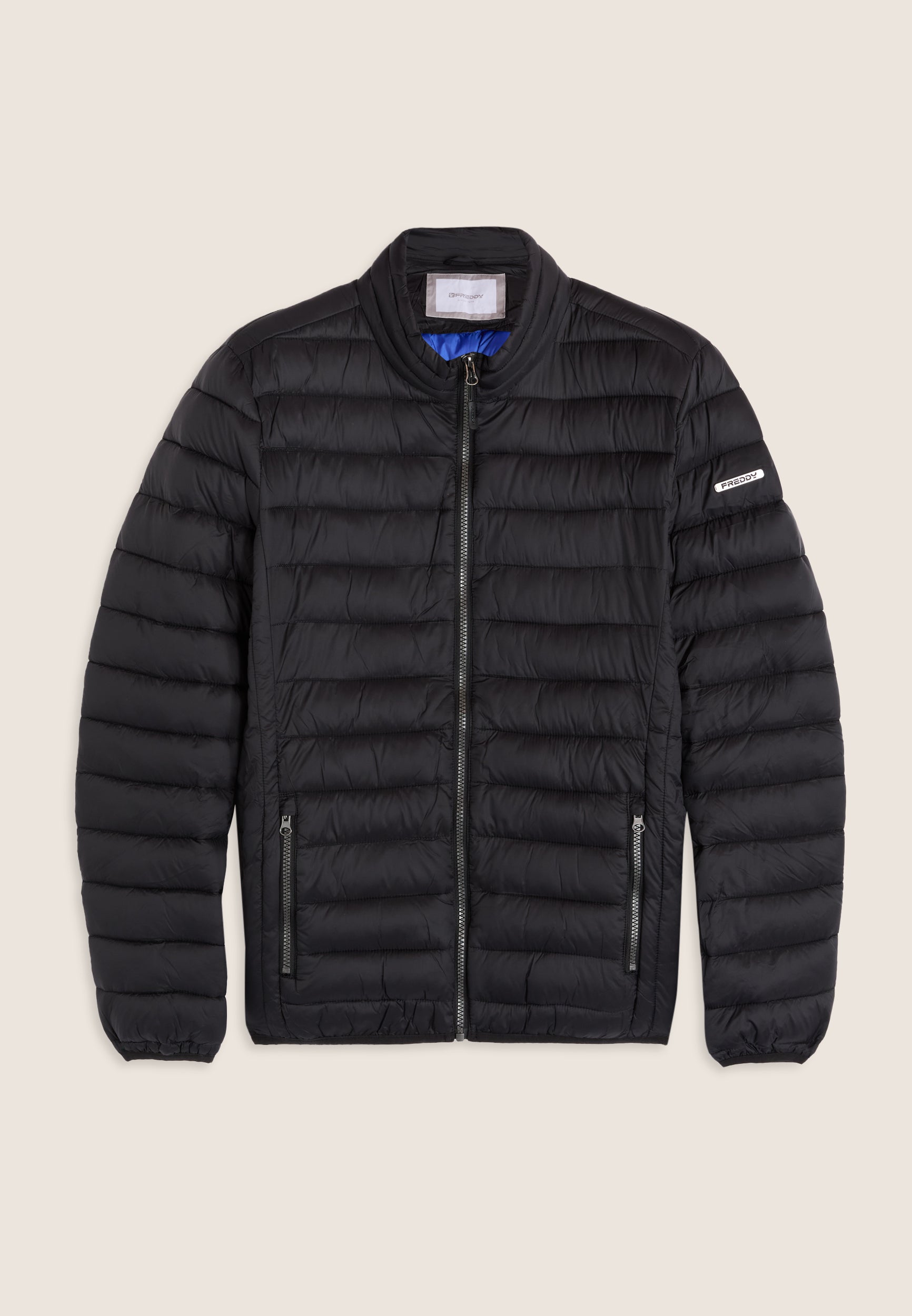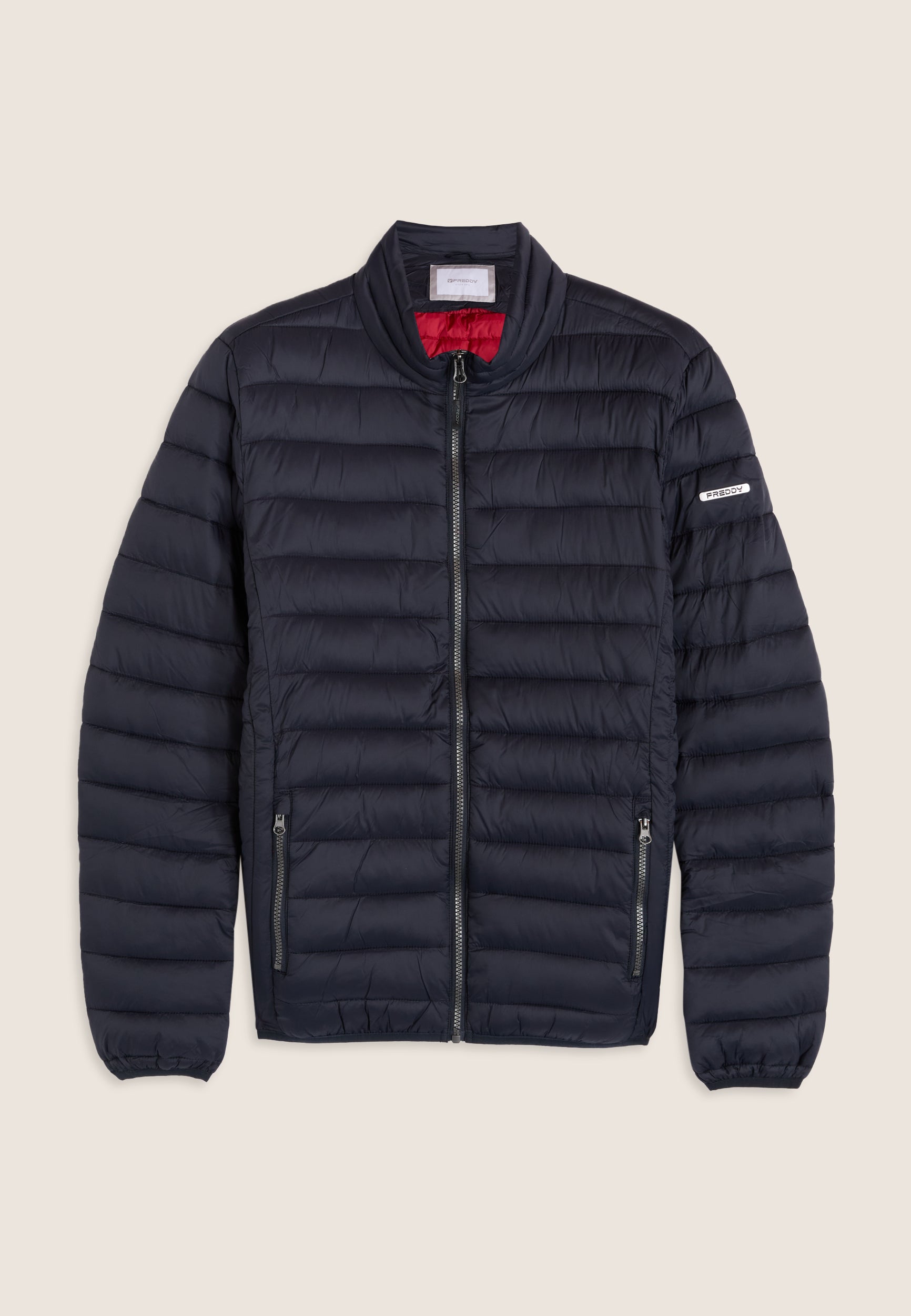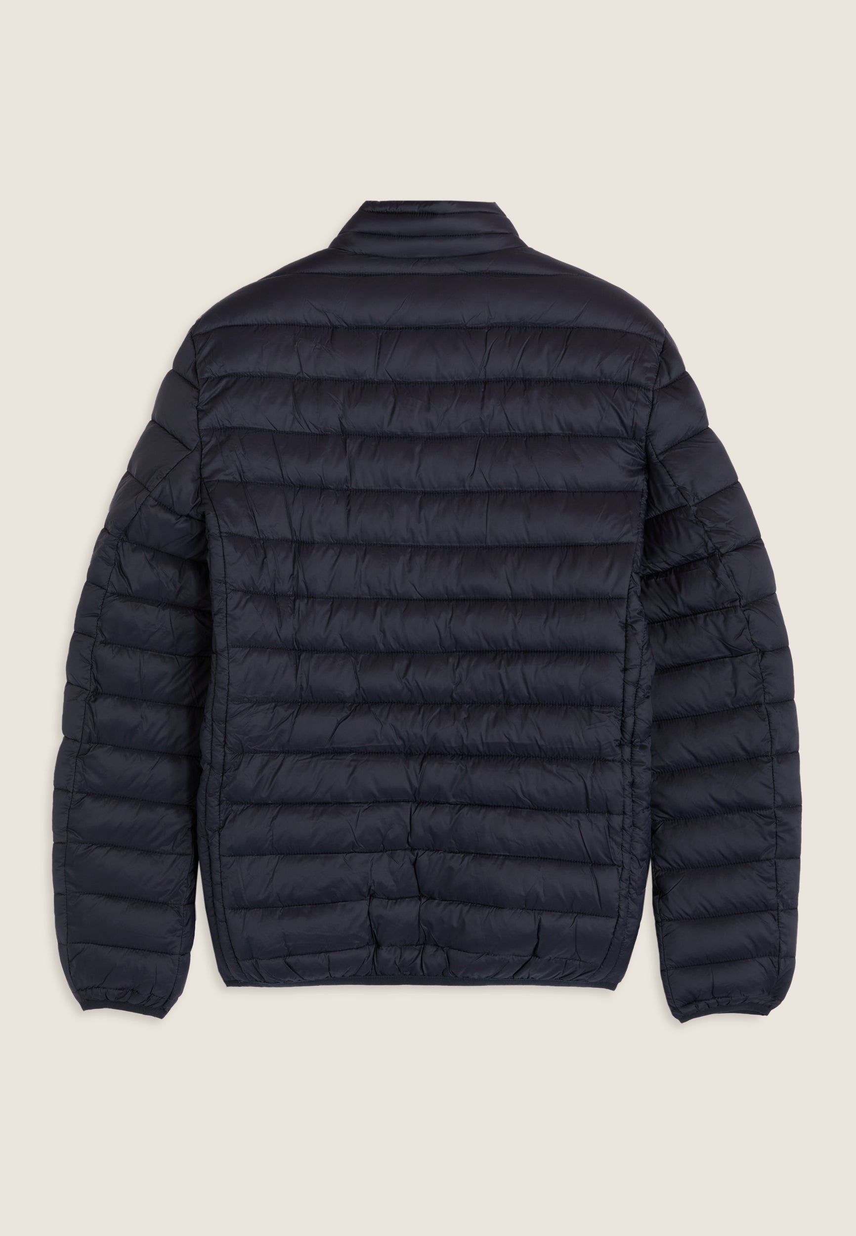 Men's down jacket with regular fit, hip length and horizontal quilting. Double-slide full-zip fastening and adjustable drawstring waist with stoppers. It has a hood and turtleneck, long sleeves with elasticated jacquard bottom. Logo applied on the left sleeve, front pockets with zip fastening. The fake-down padding is animal-friendly and provides excellent insulation, maintaining good performance even in wet conditions.