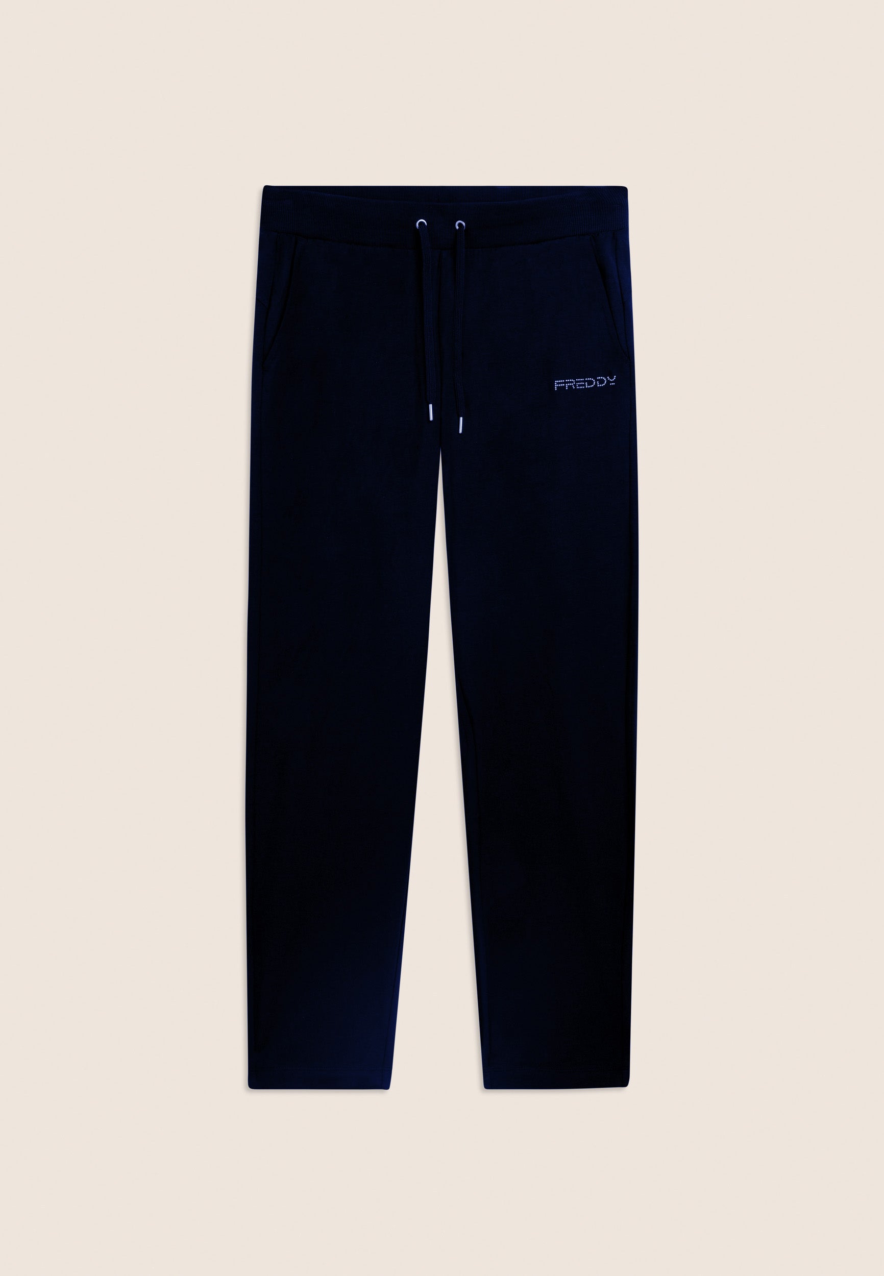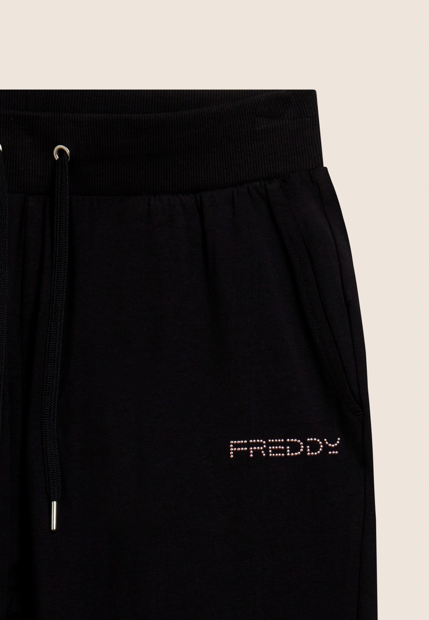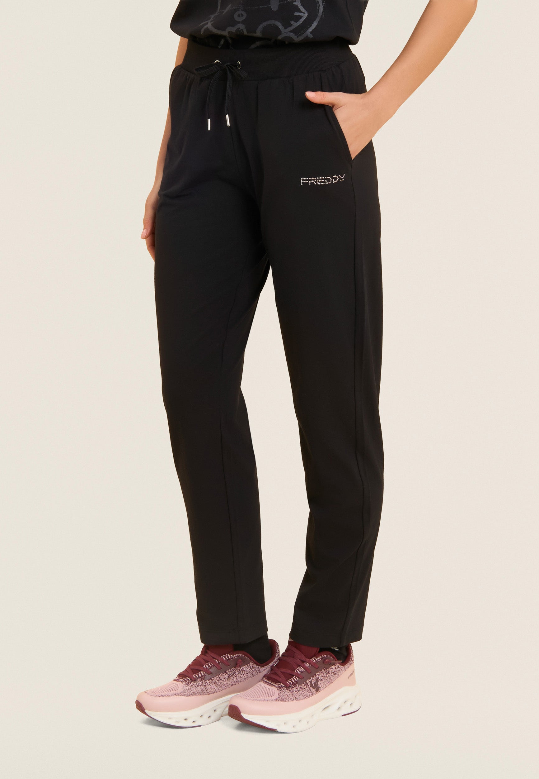 Athletic trousers with regular-fit, full-length and a regular ribbed waistband and drawstring. The FREDDY logo on the left side in light pink beads adds an elegant touch. The back yoke with heart-shaped stitching and front besom pockets complete the functional and fashionable look. Made of heavy cotton stretch jersey, they are ideal for leisure and light exercise.
