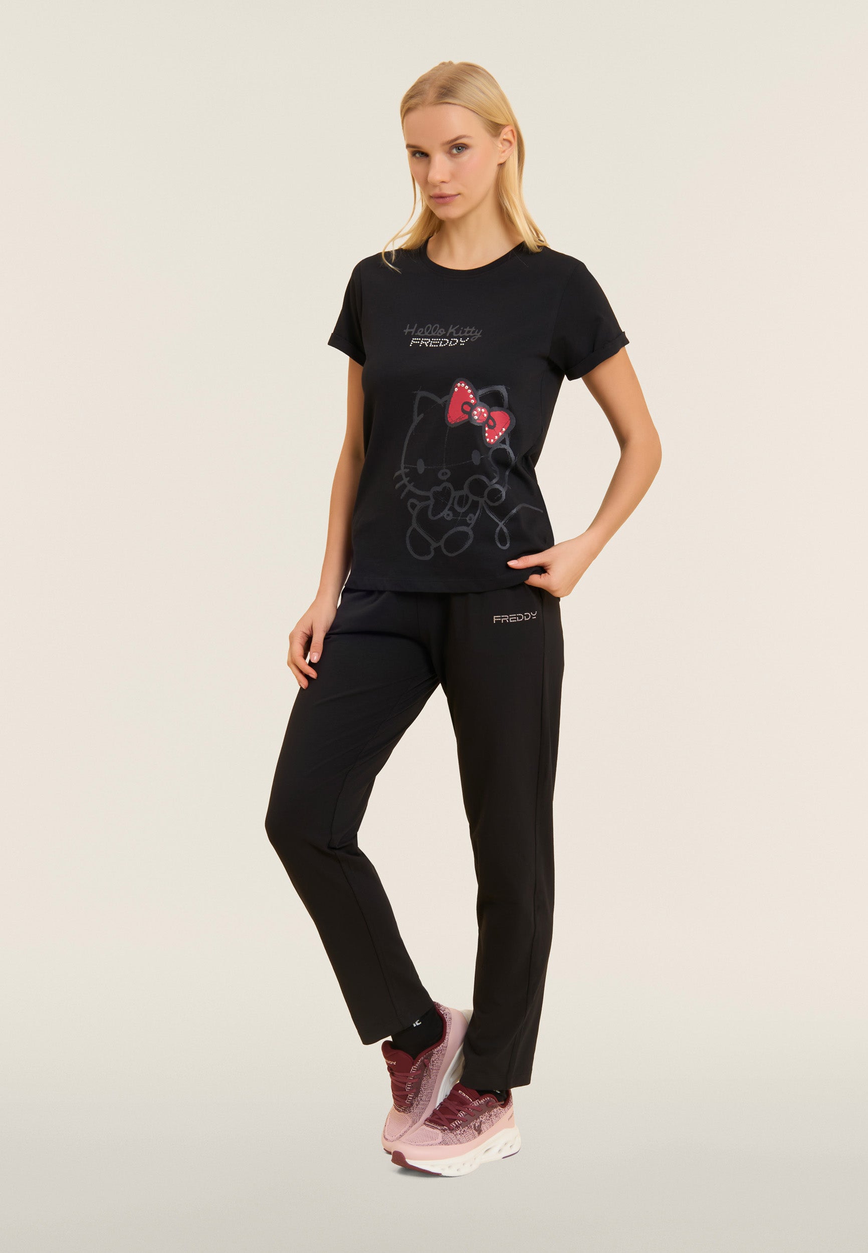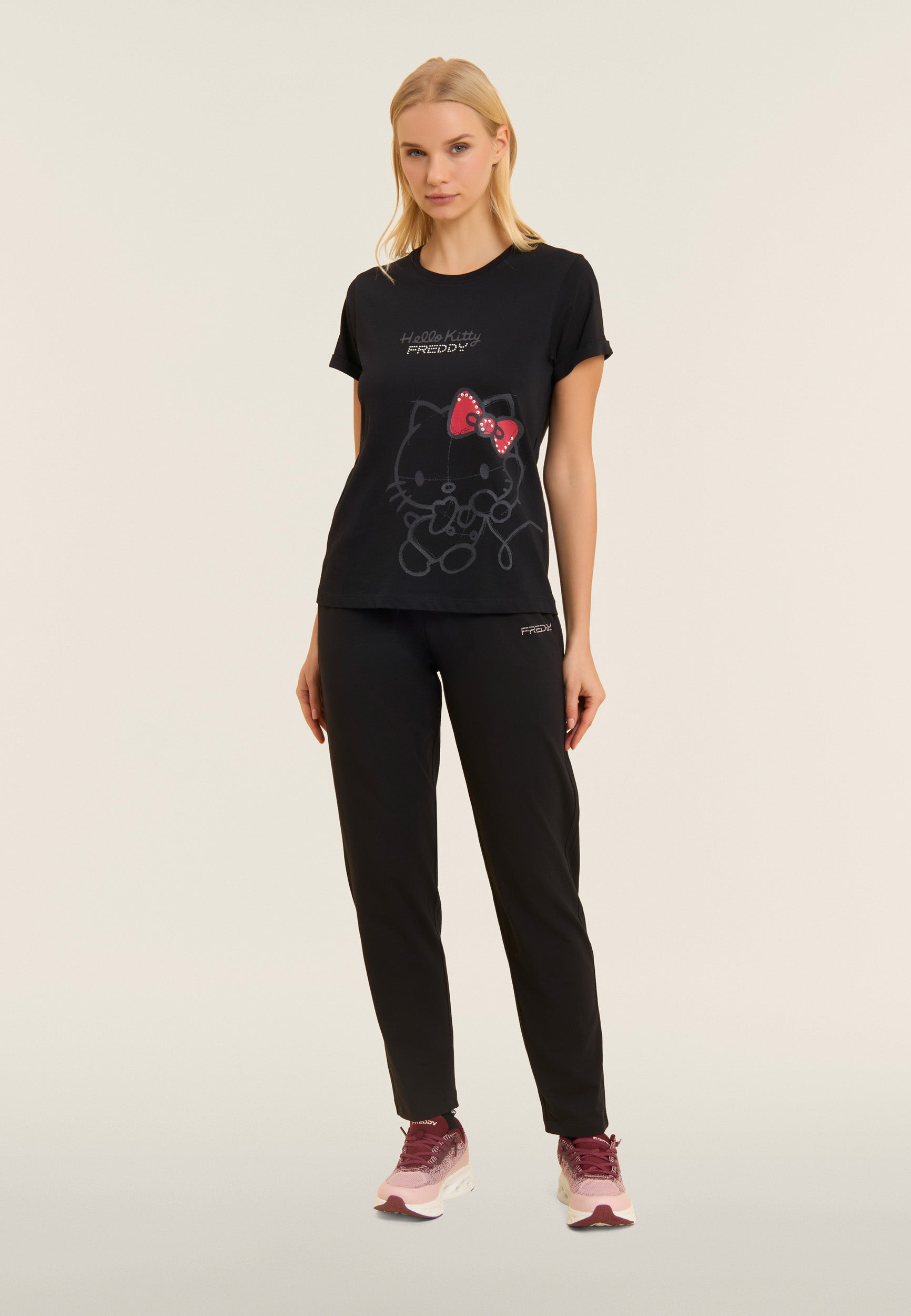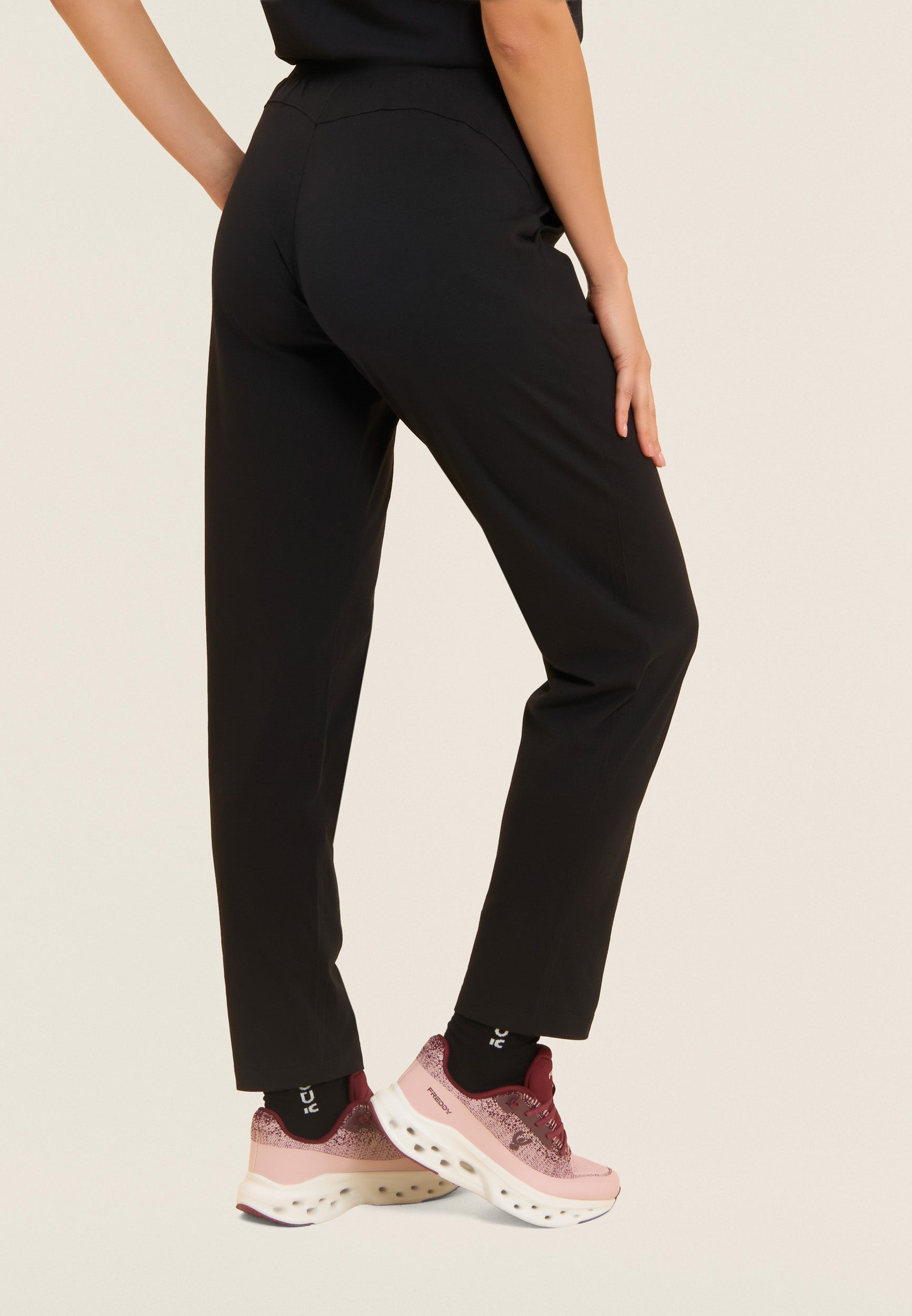 Athletic trousers with regular-fit, full-length and a regular ribbed waistband and drawstring. The FREDDY logo on the left side in light pink beads adds an elegant touch. The back yoke with heart-shaped stitching and front besom pockets complete the functional and fashionable look. Made of heavy cotton stretch jersey, they are ideal for leisure and light exercise.