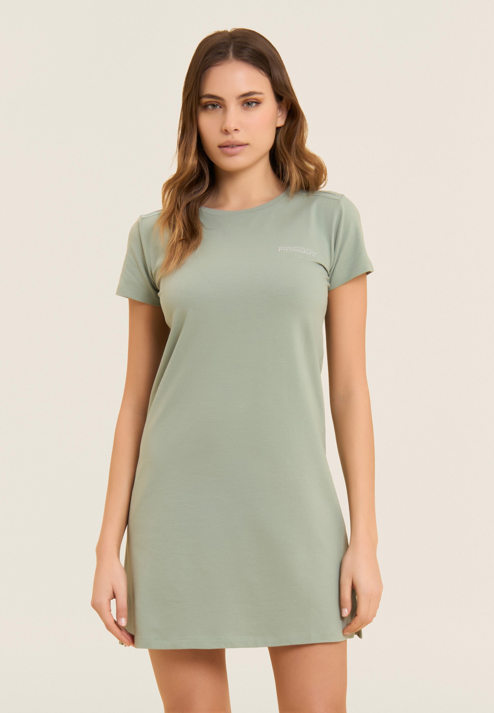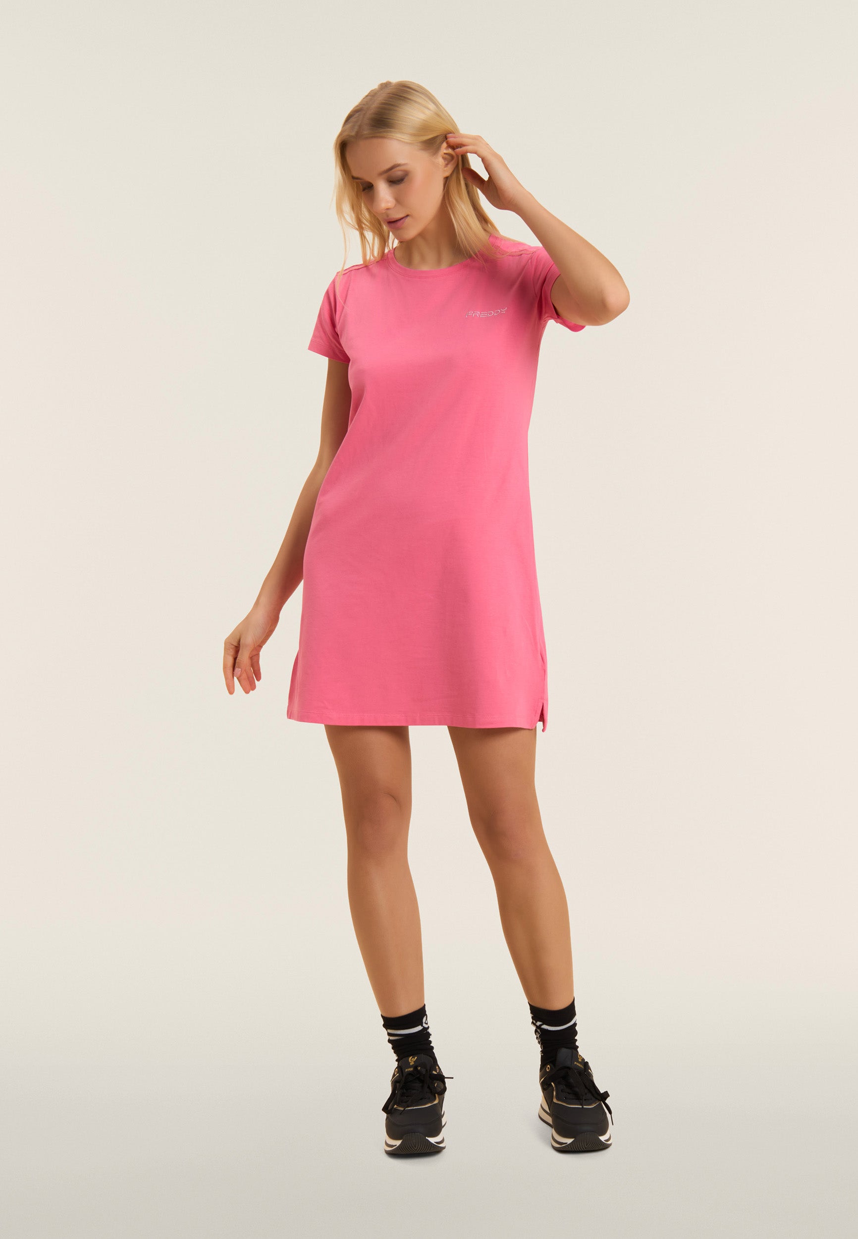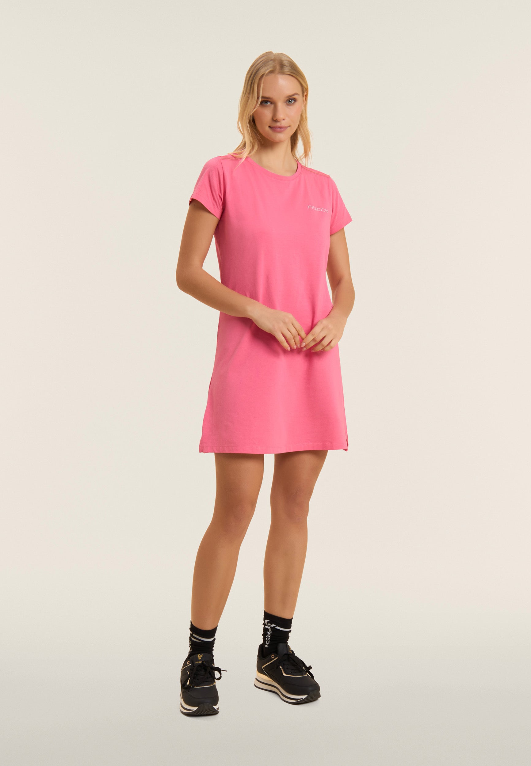 Straight dress with a regular fit and medium length, ideal for a casual and comfortable look. The straight bottom with small side slits and the crew neckline enhance the simple and elegant design. Short sleeves and the FREDDY logo in light pink beads on the heart complete the look. Made of lightweight cotton stretch jersey, it is perfect for leisure wear.