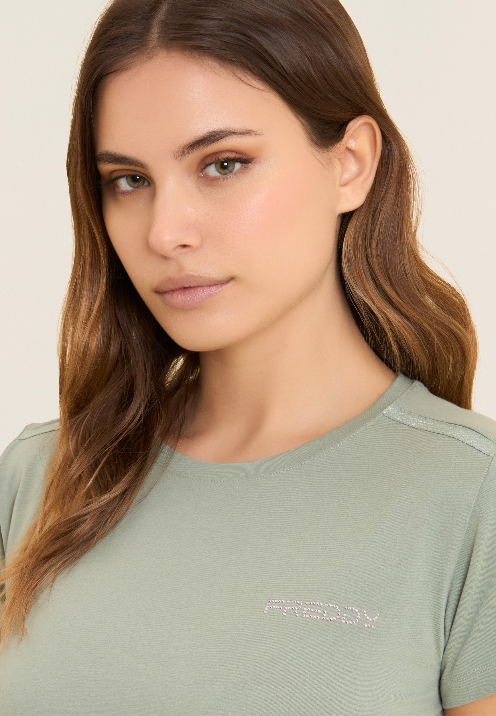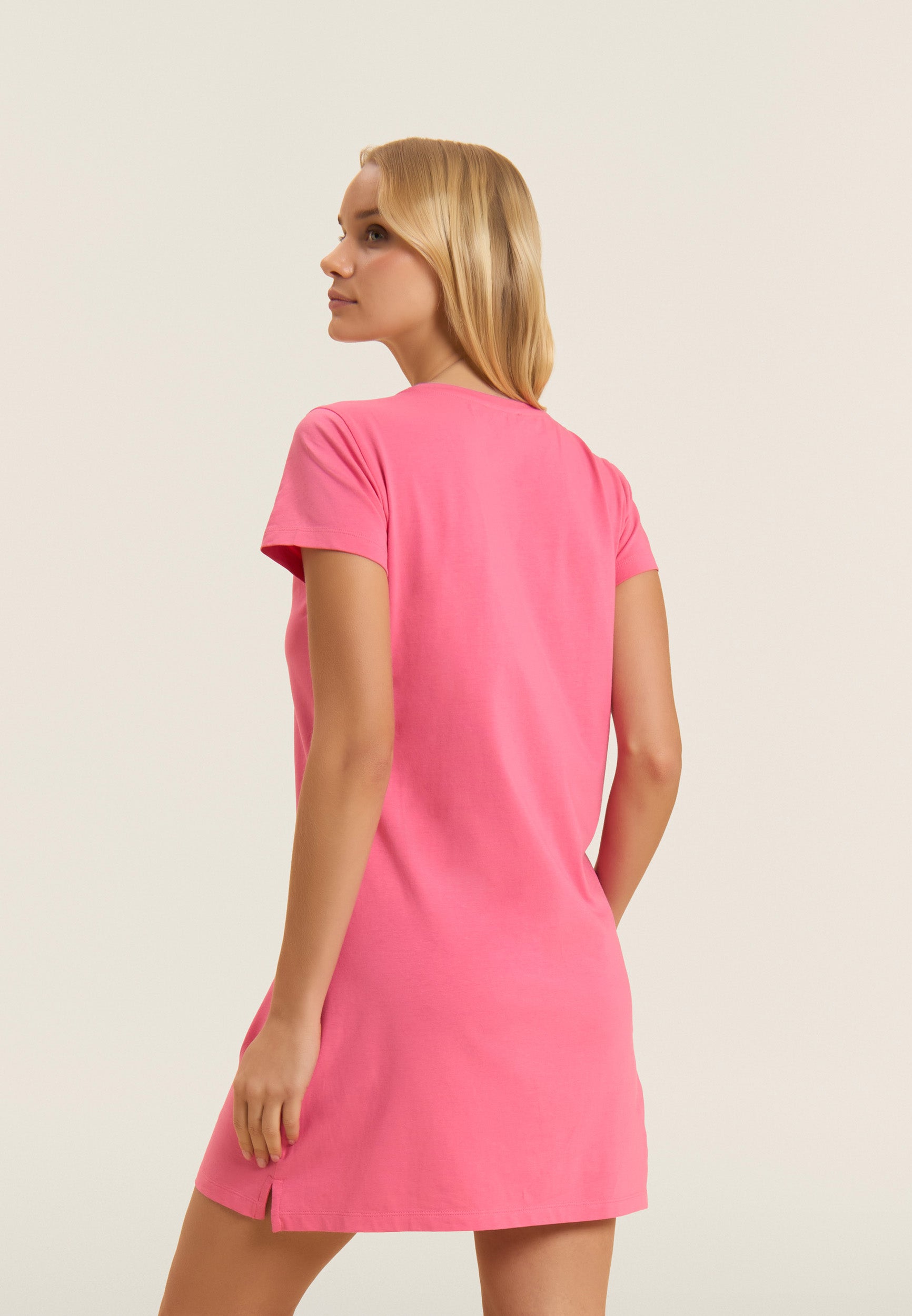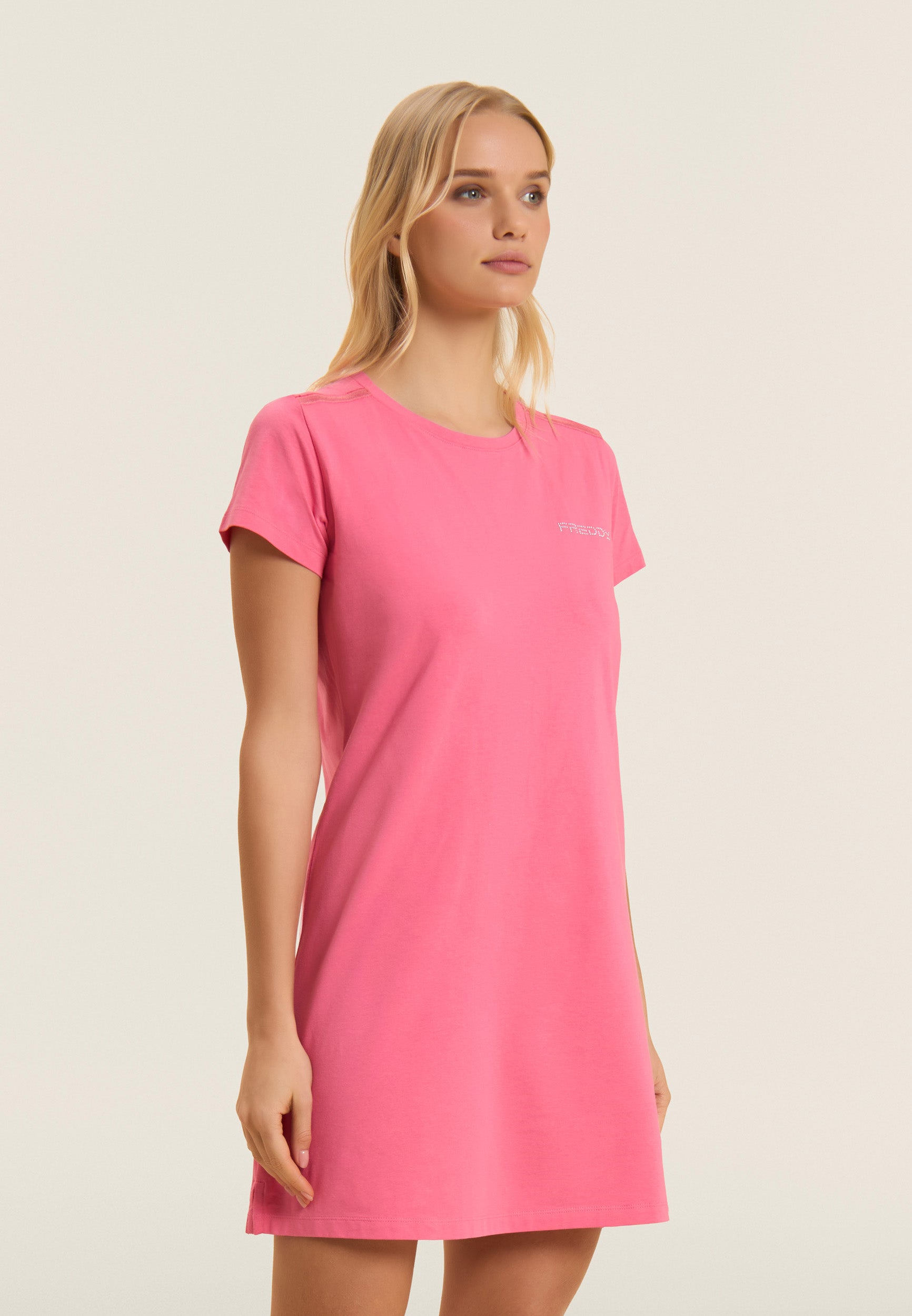 Straight dress with a regular fit and medium length, ideal for a casual and comfortable look. The straight bottom with small side slits and the crew neckline enhance the simple and elegant design. Short sleeves and the FREDDY logo in light pink beads on the heart complete the look. Made of lightweight cotton stretch jersey, it is perfect for leisure wear.