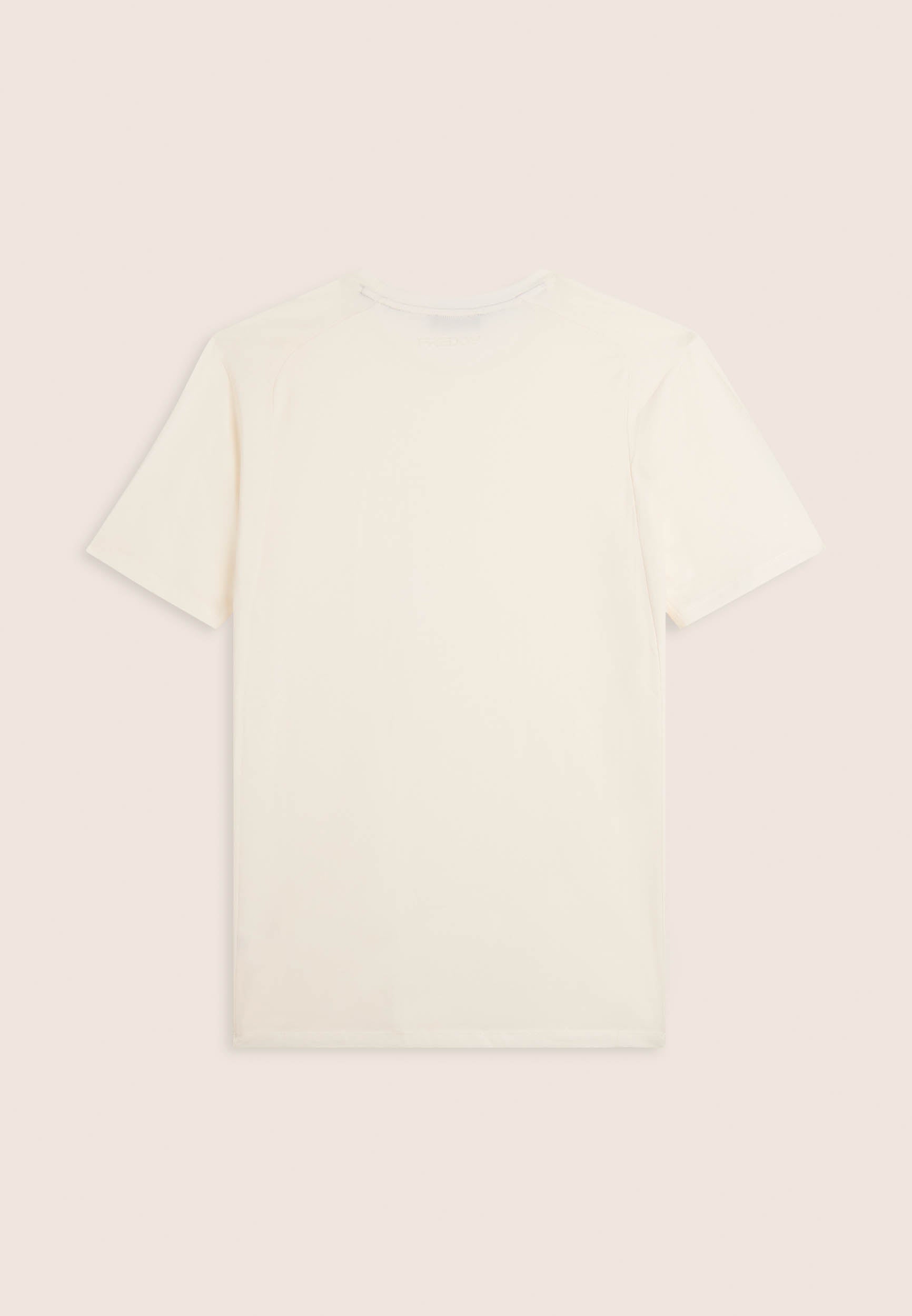 Men's cotton stretch jersey T-shirt with regular fit, straight bottom and short sleeves. The raglan shoulder seams are rounded for a sporty cut. Glossy transparent-effect prints on the front and back complete the look.