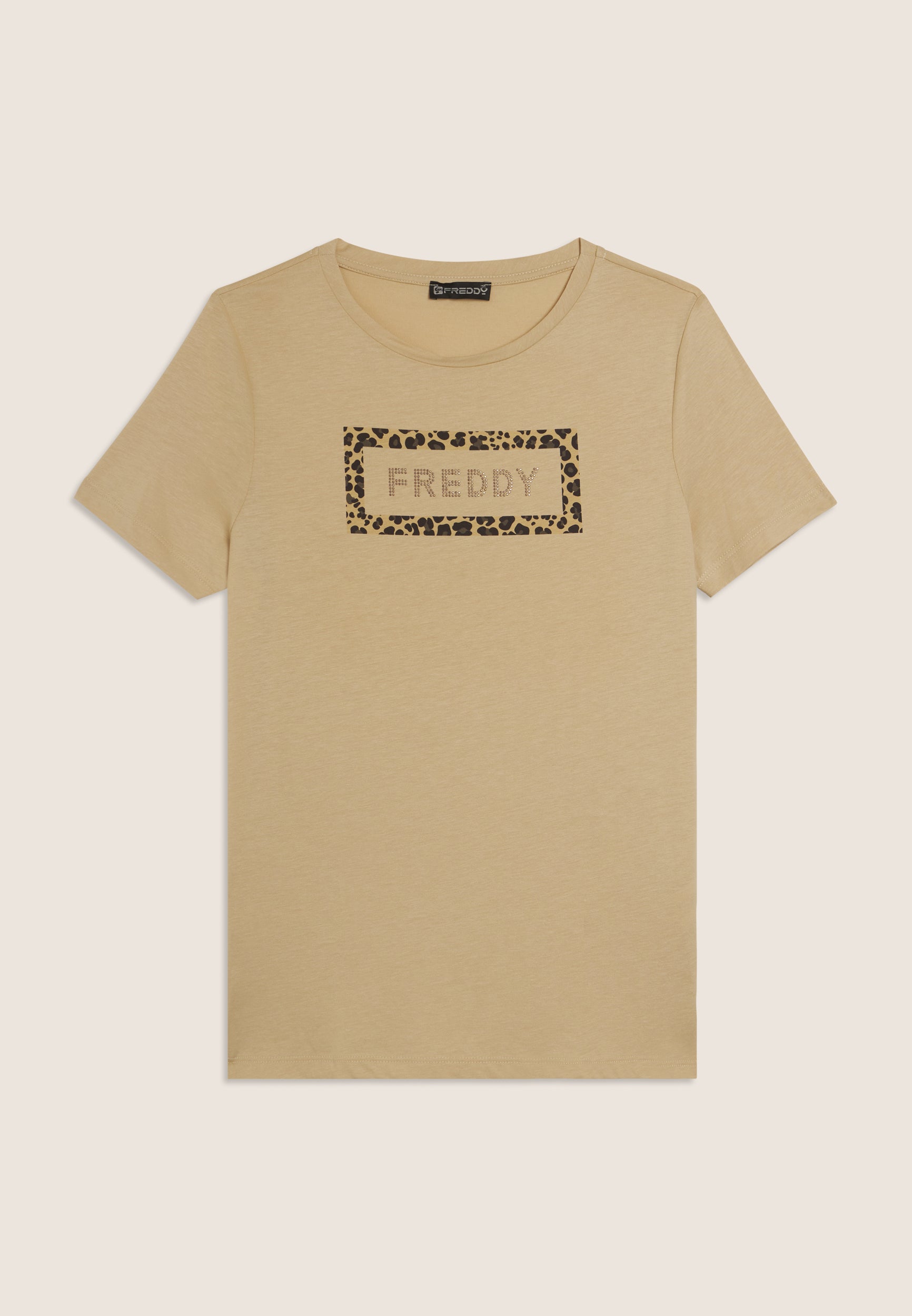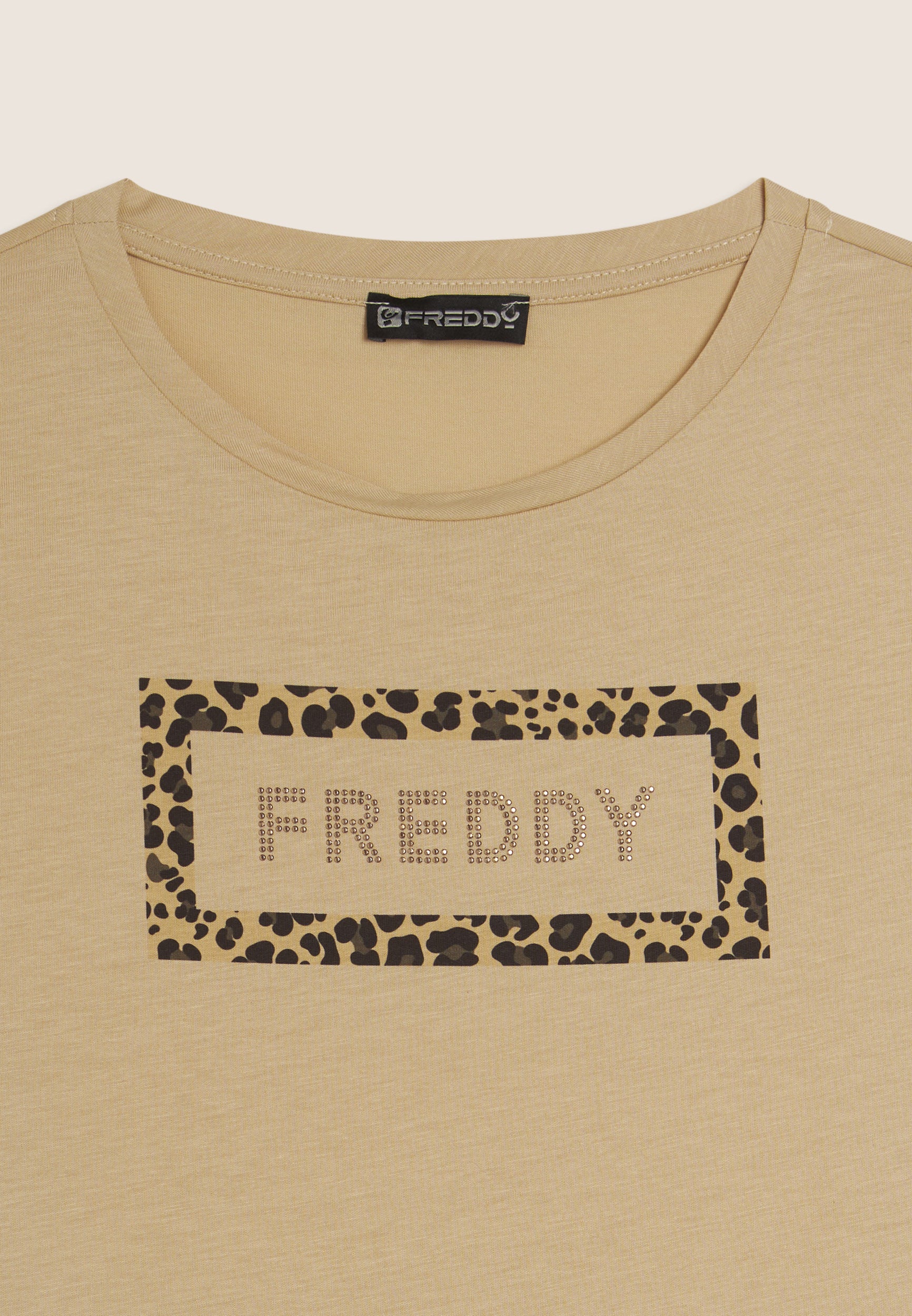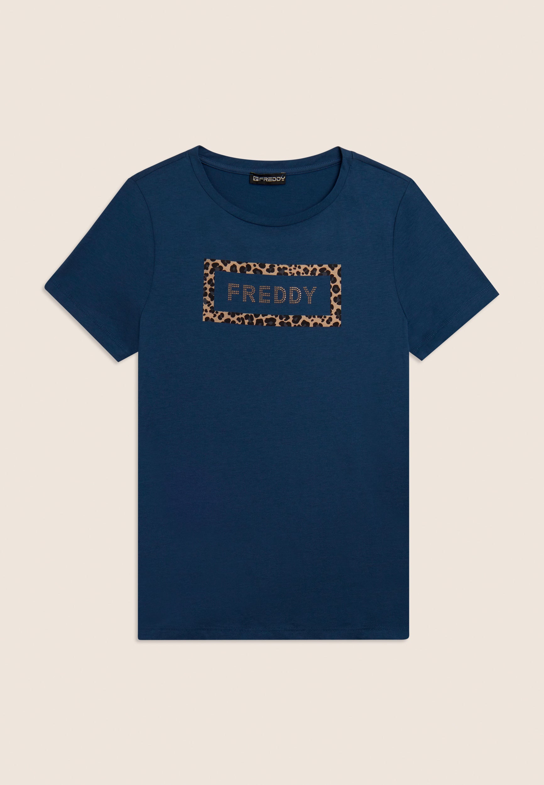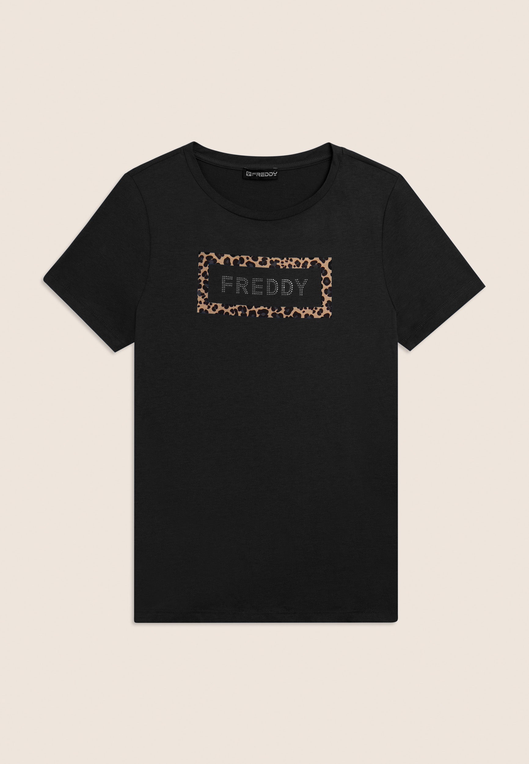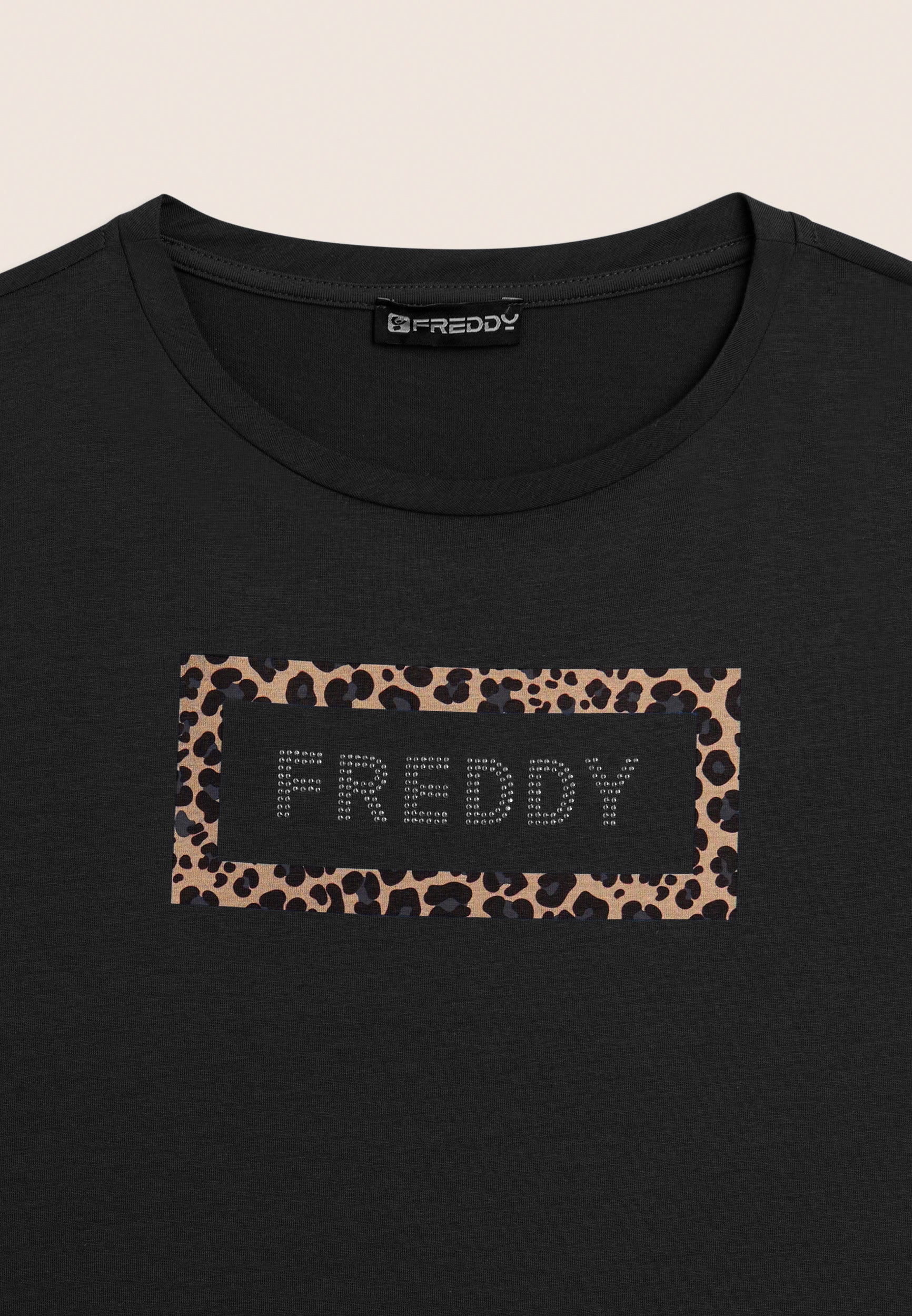 Regular fit and length t-shirt with straight hem and side slits offering greater freedom of movement. The crew neck and short sleeves complete the cool and comfortable design. The FREDDY logo on the front, surrounded by animal graphics and decorated with studs, is the star of the garment, giving it a bold and sophisticated touch. Made of cotton jersey and modal, this t-shirt is perfect for a touch of racy style to your look, and maintaining lightness and comfort.