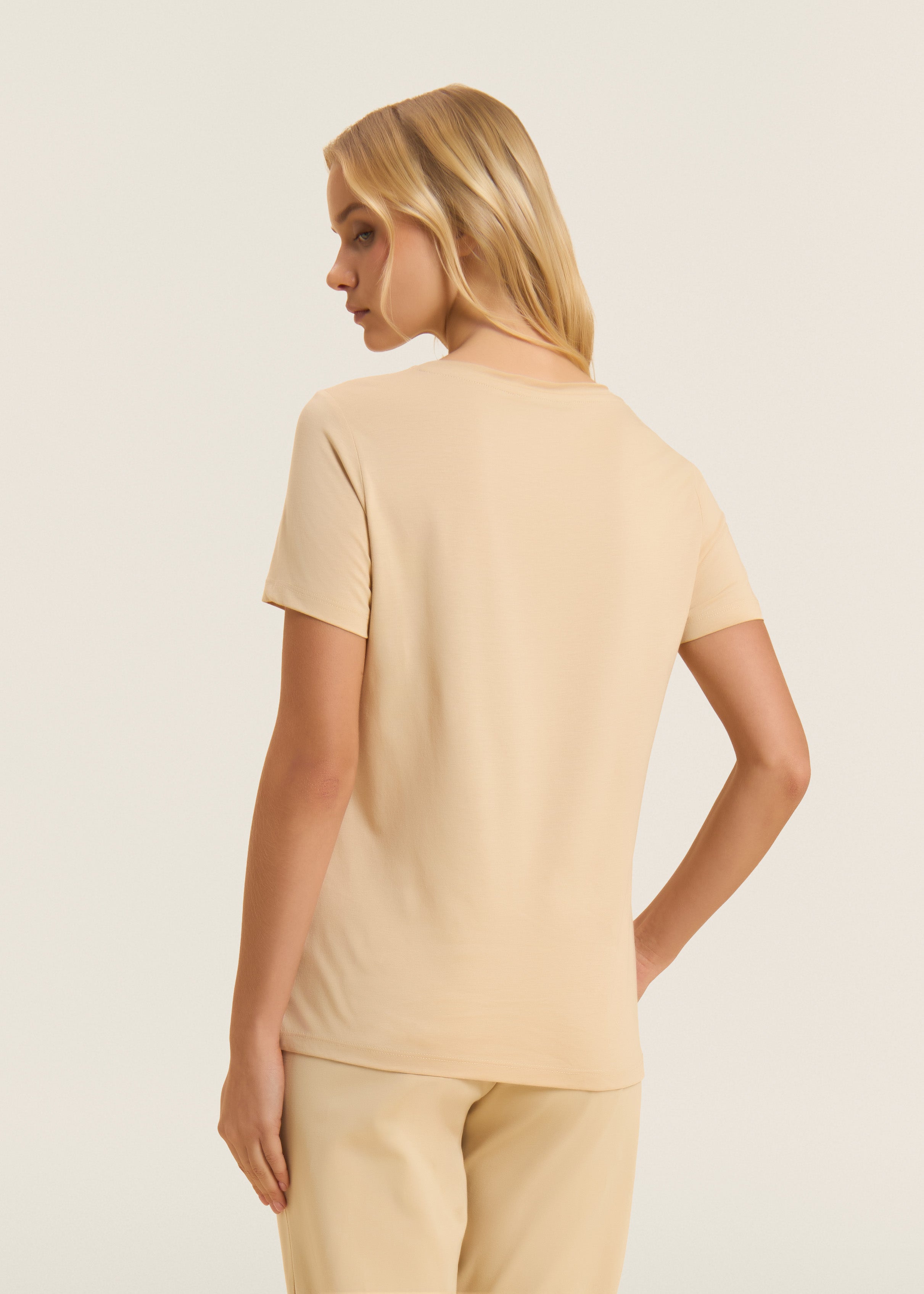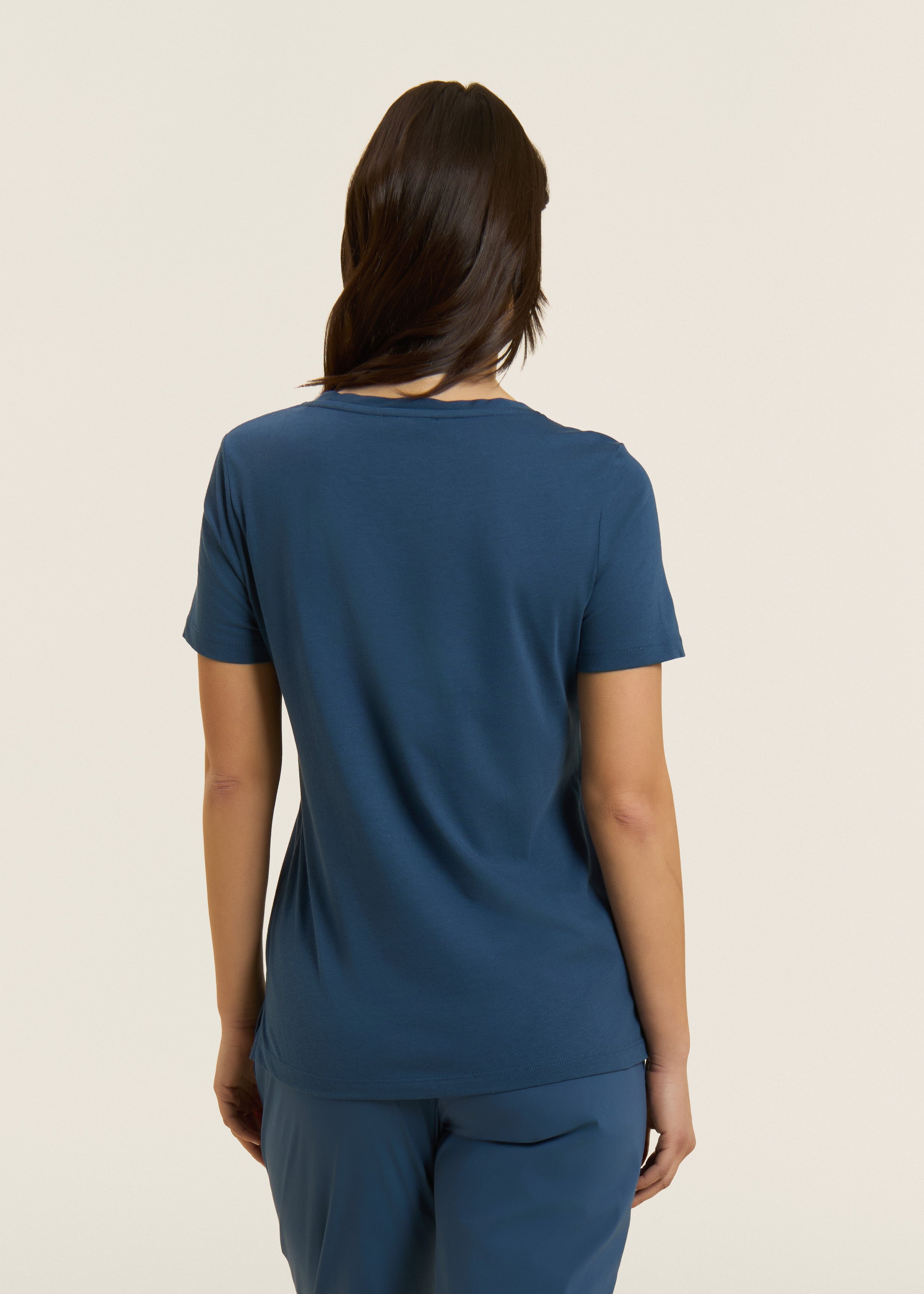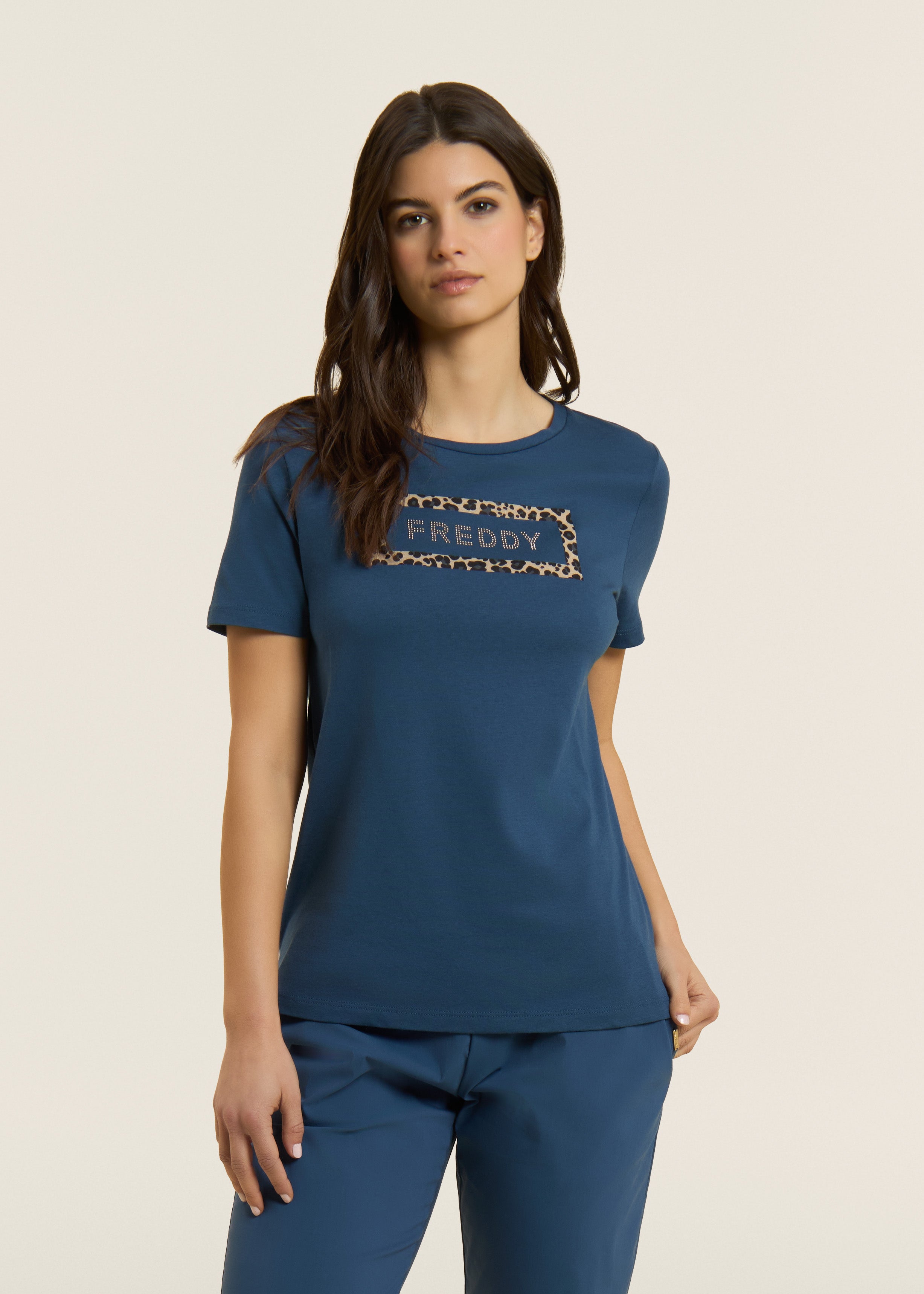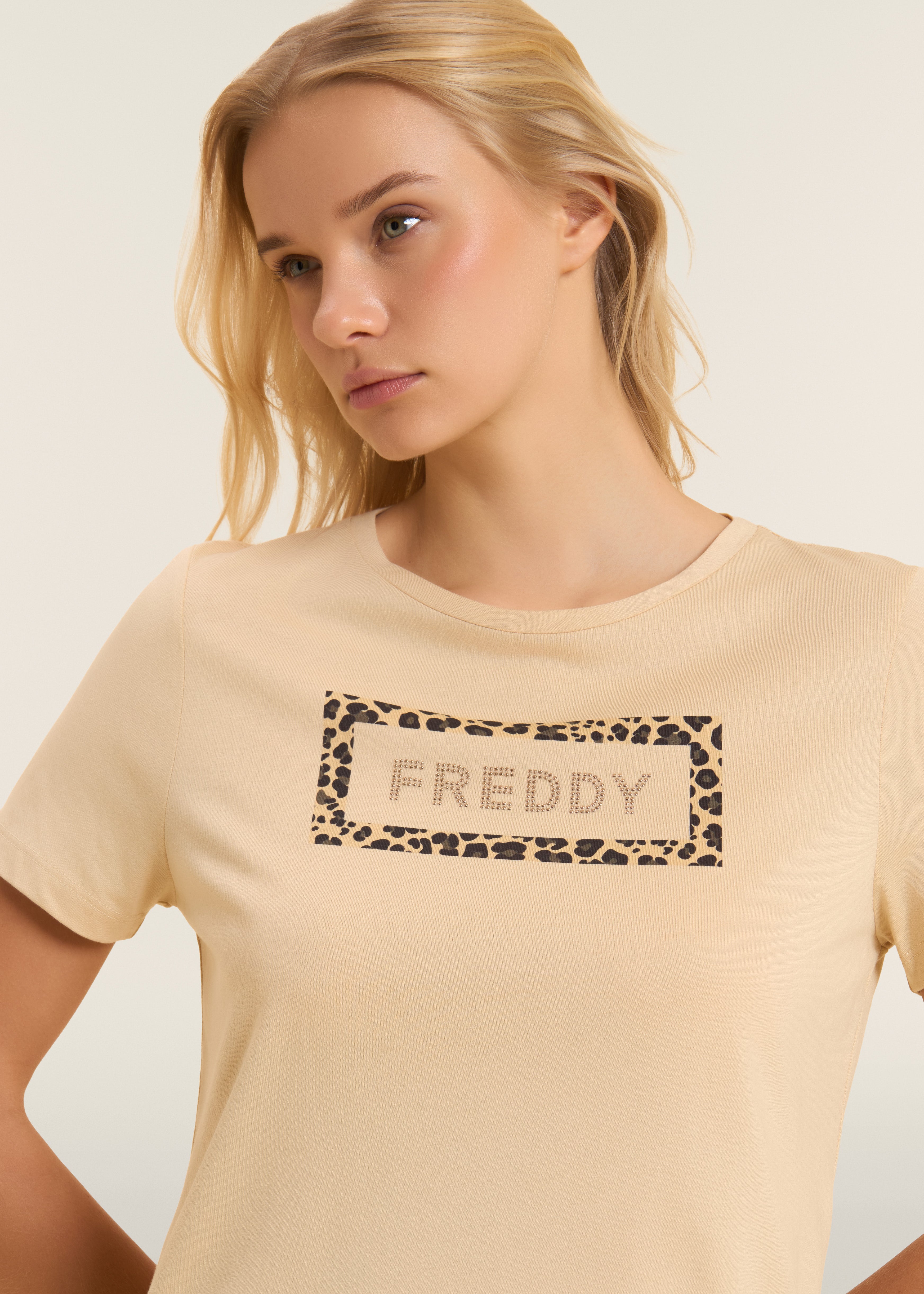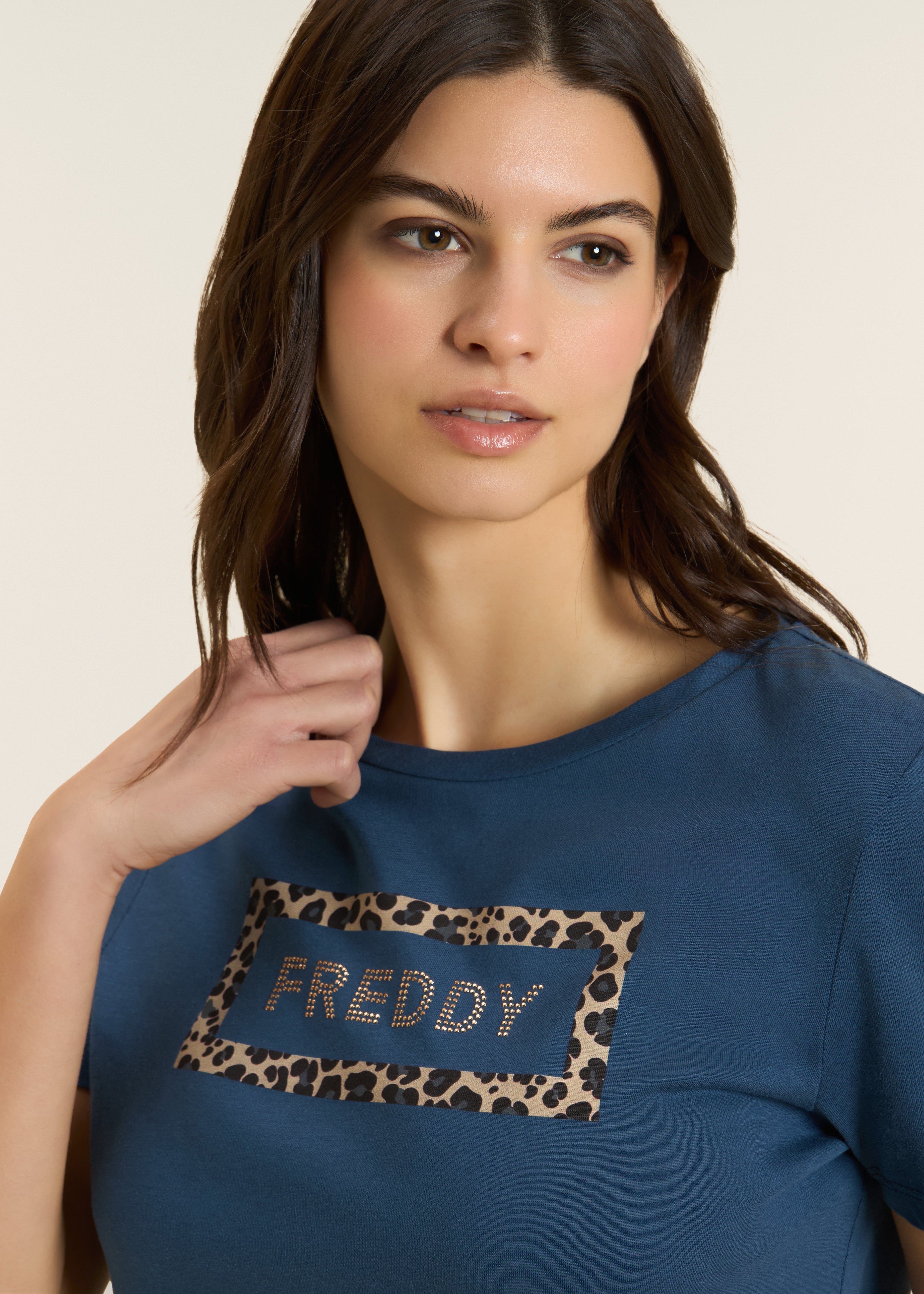 Regular fit and length t-shirt with straight hem and side slits offering greater freedom of movement. The crew neck and short sleeves complete the cool and comfortable design. The FREDDY logo on the front, surrounded by animal graphics and decorated with studs, is the star of the garment, giving it a bold and sophisticated touch. Made of cotton jersey and modal, this t-shirt is perfect for a touch of racy style to your look, and maintaining lightness and comfort.