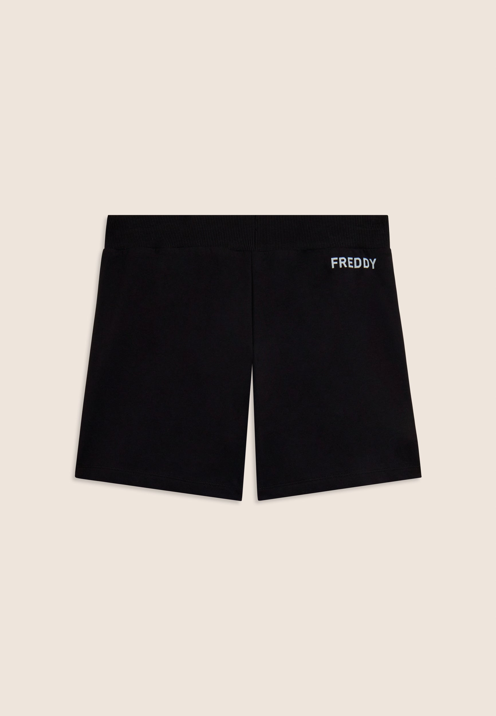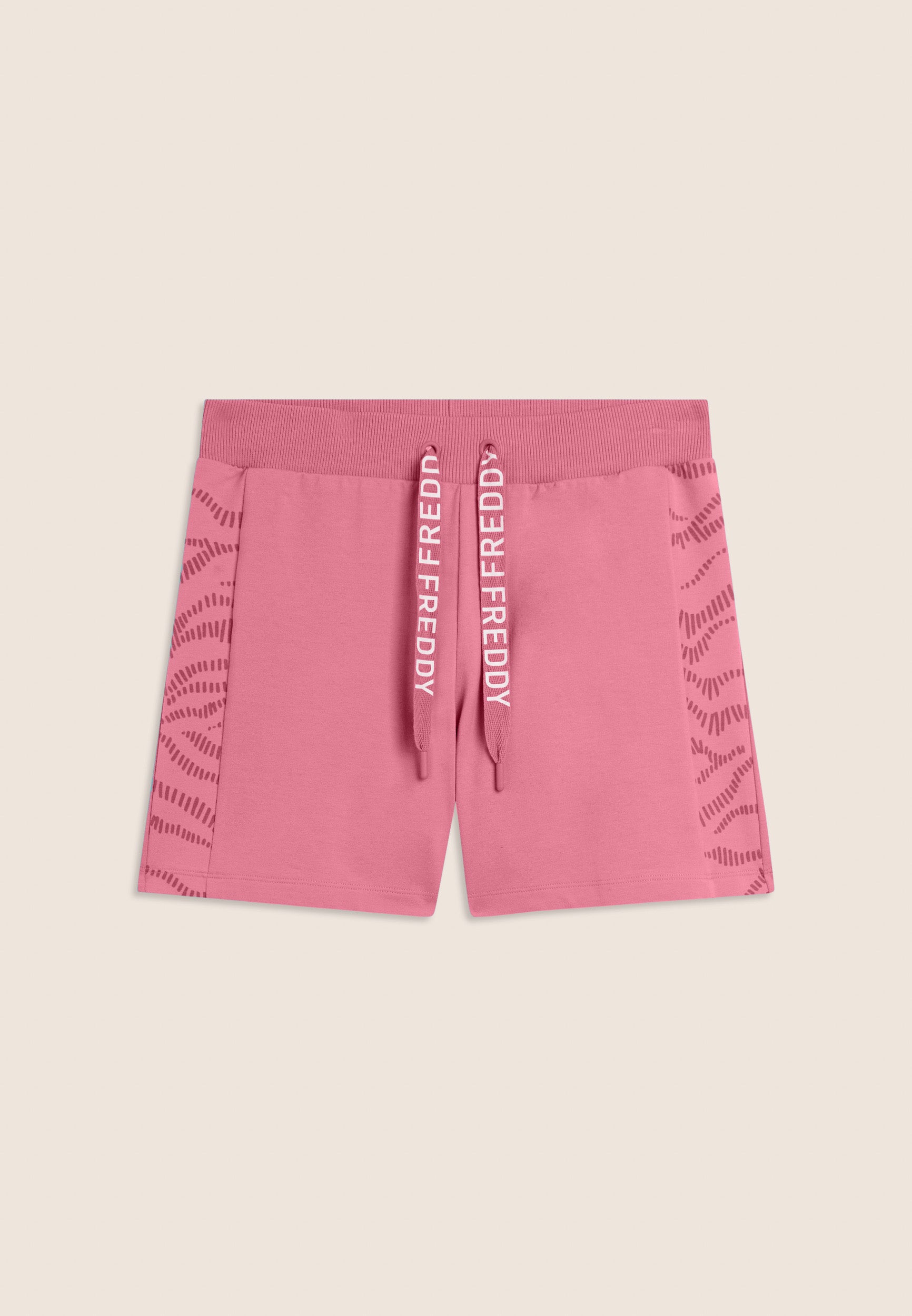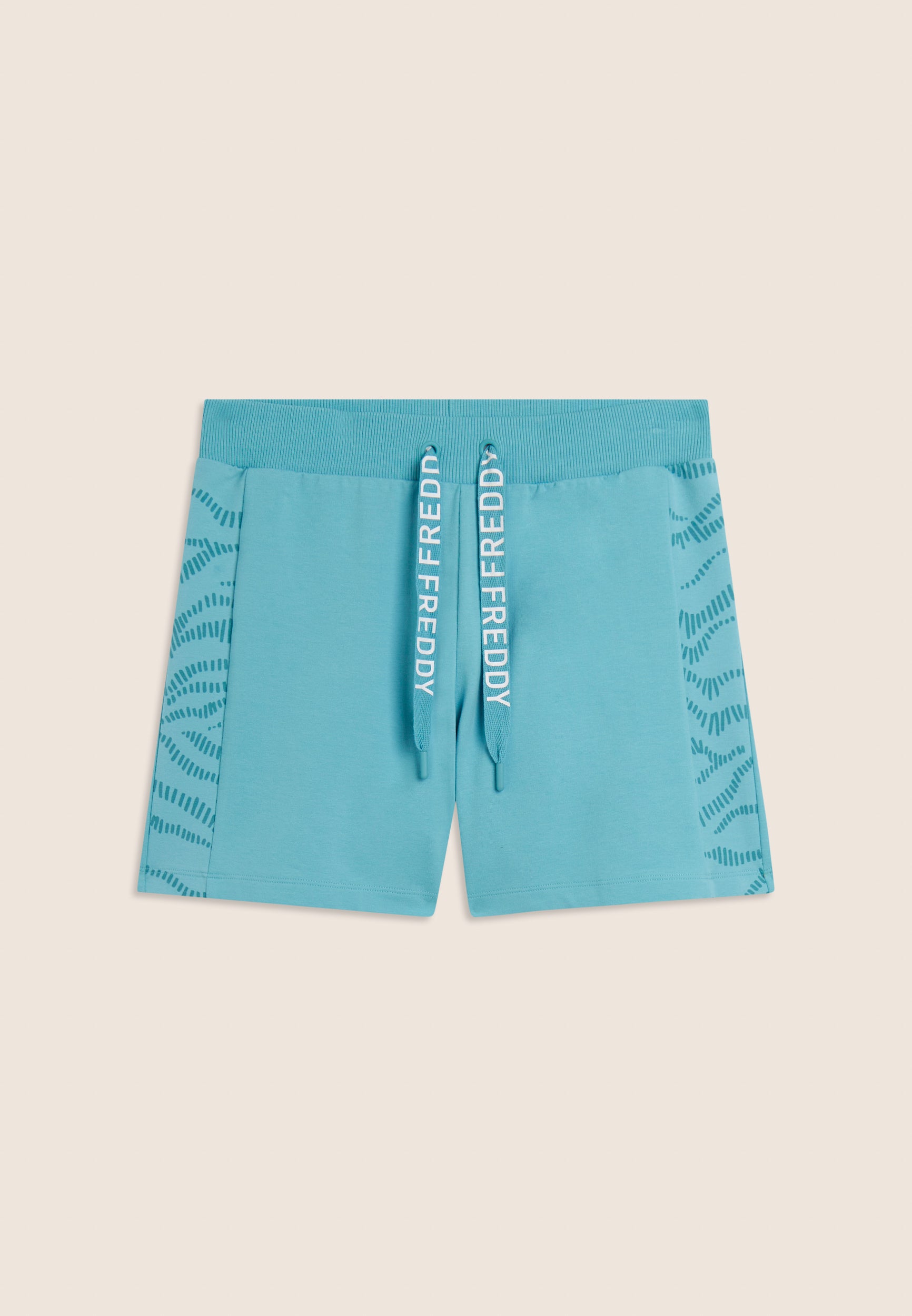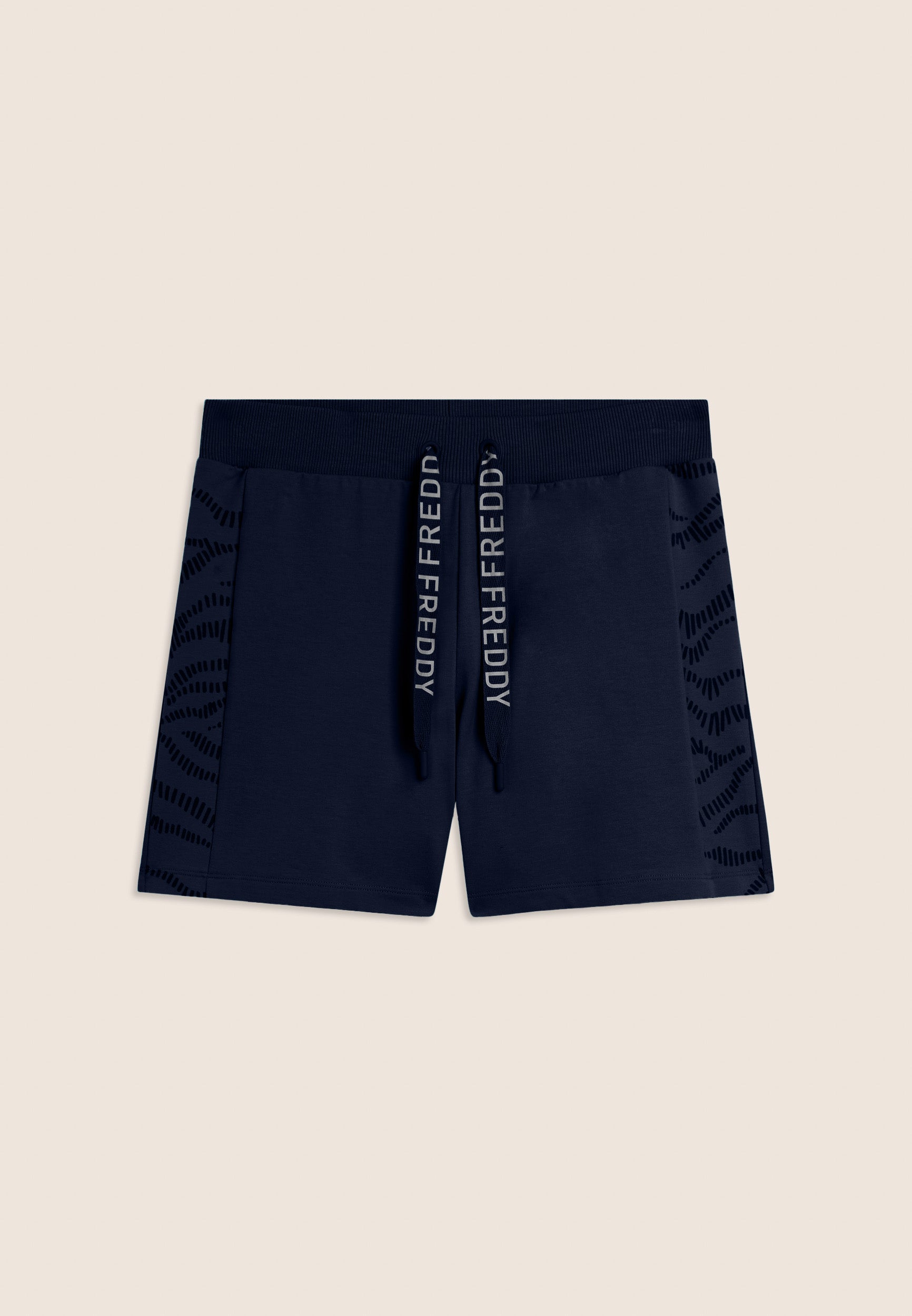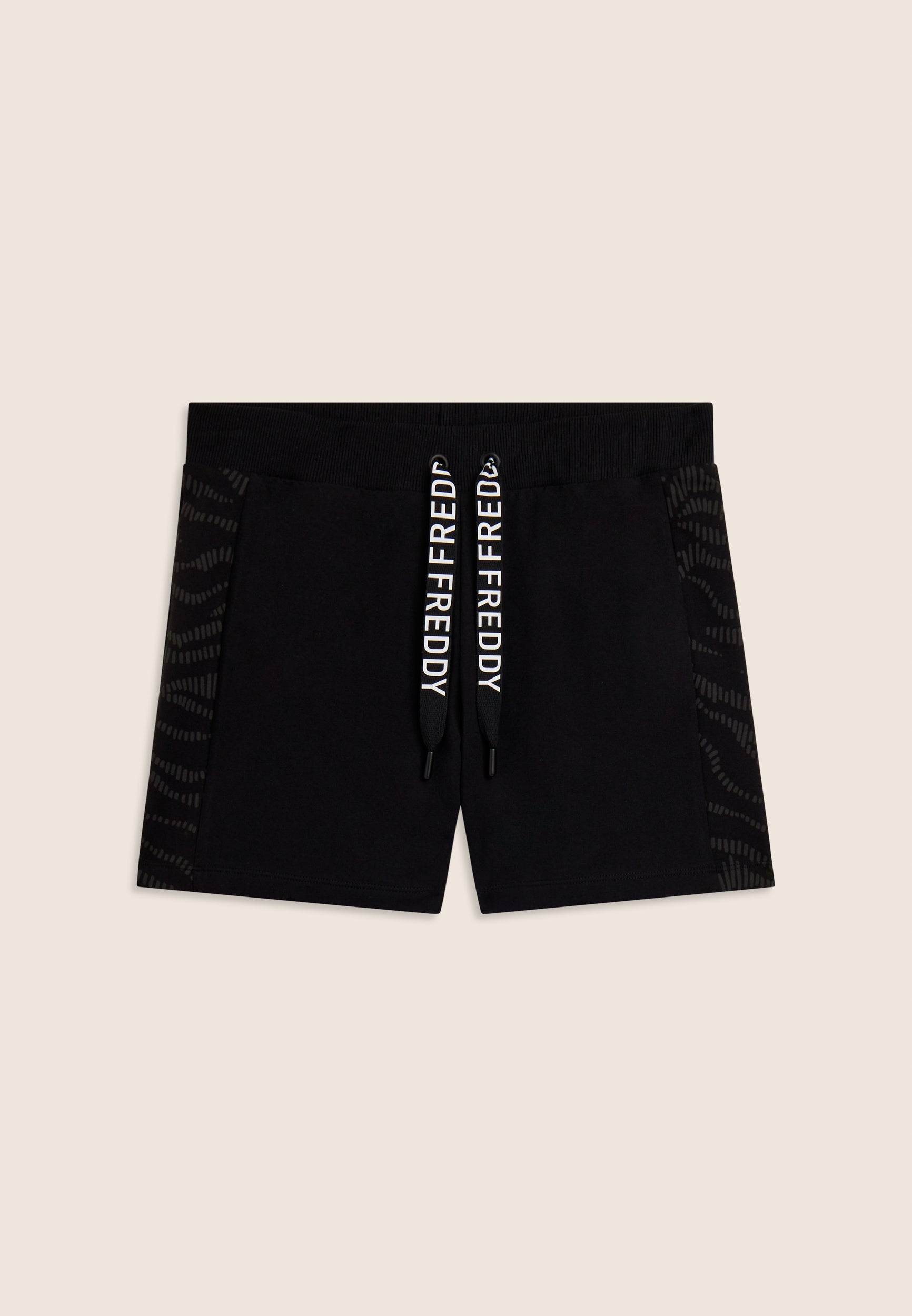 Regular-fit shorts, straight bottom, ribbed waist and FREDDY logo drawstring. Side inserts with a wavy graphic pattern add character to the garment. The FREDDY glitter logo is placed on the left rear side. In stretch French terry, for a fresh and dynamic look.