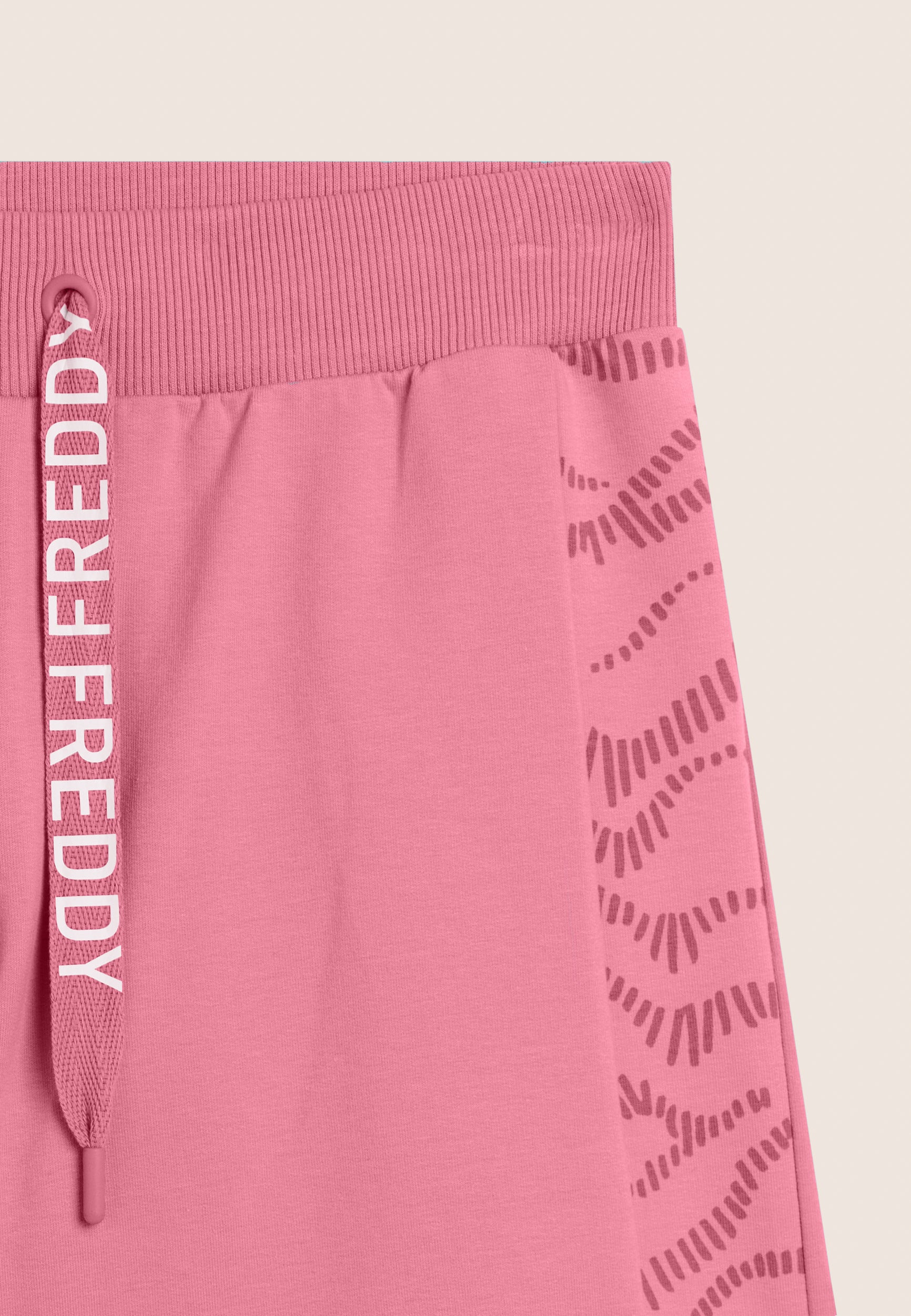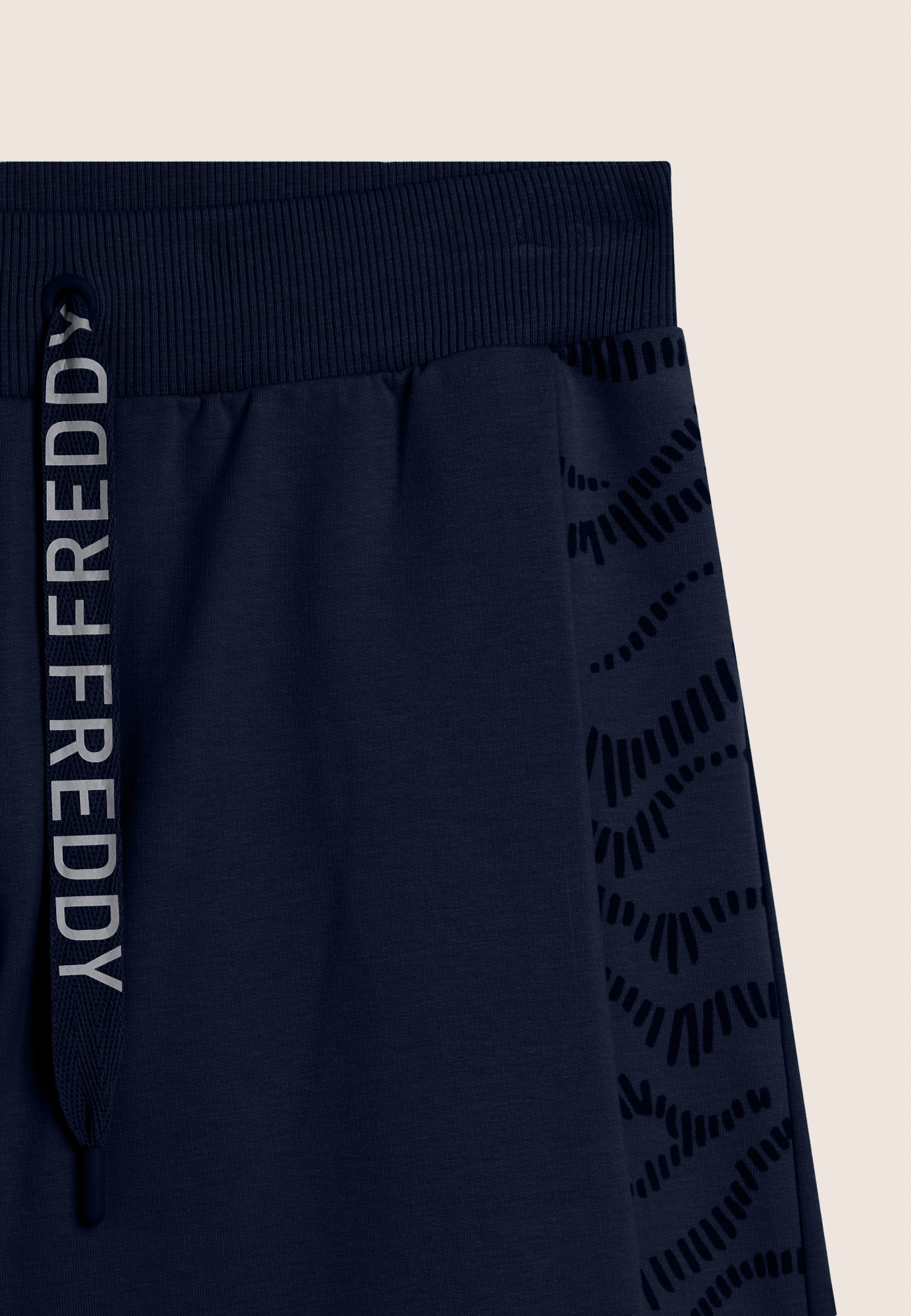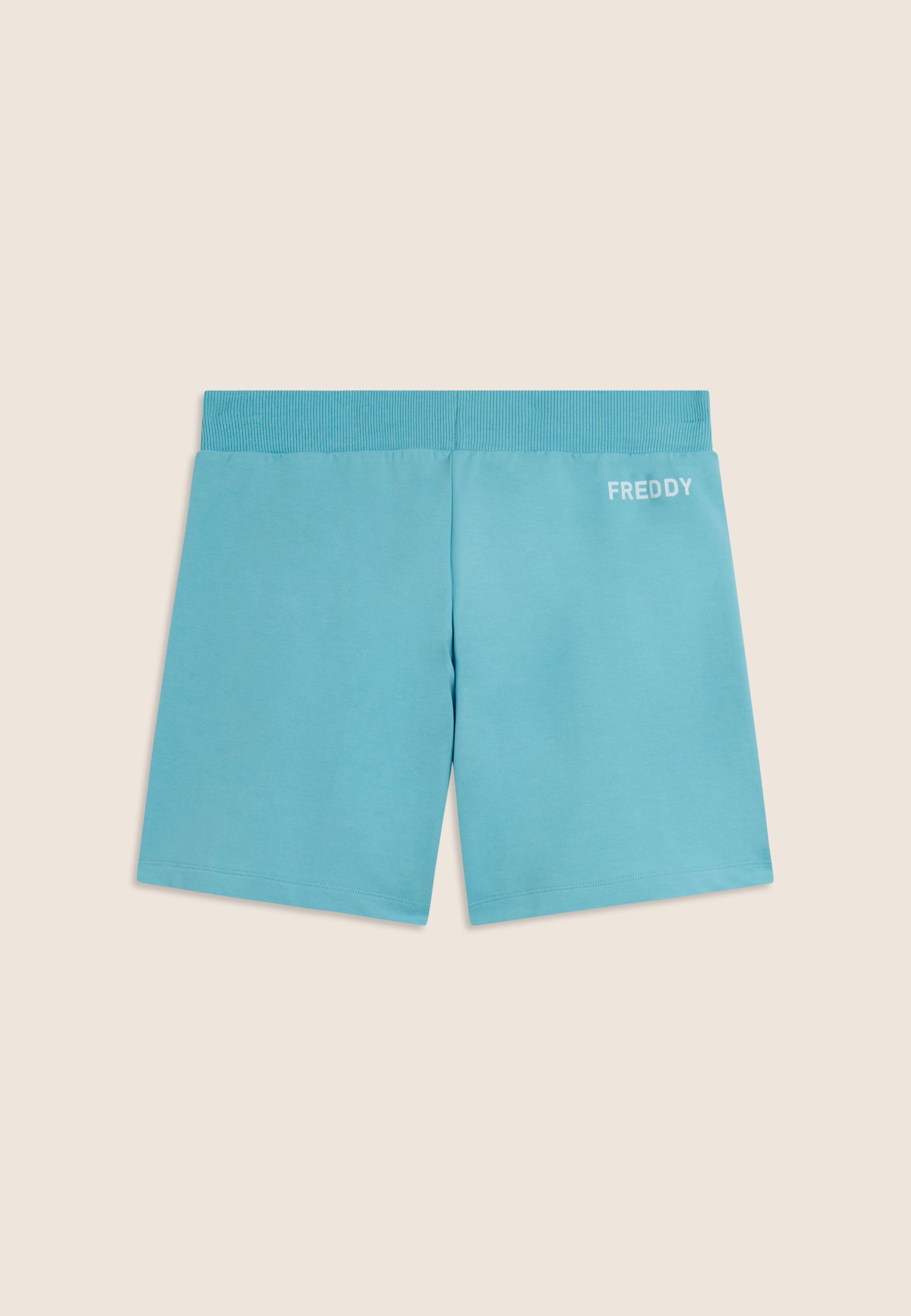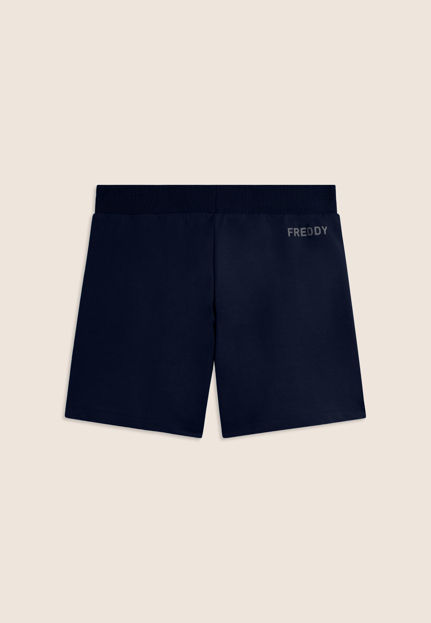 Regular-fit shorts, straight bottom, ribbed waist and FREDDY logo drawstring. Side inserts with a wavy graphic pattern add character to the garment. The FREDDY glitter logo is placed on the left rear side. In stretch French terry, for a fresh and dynamic look.