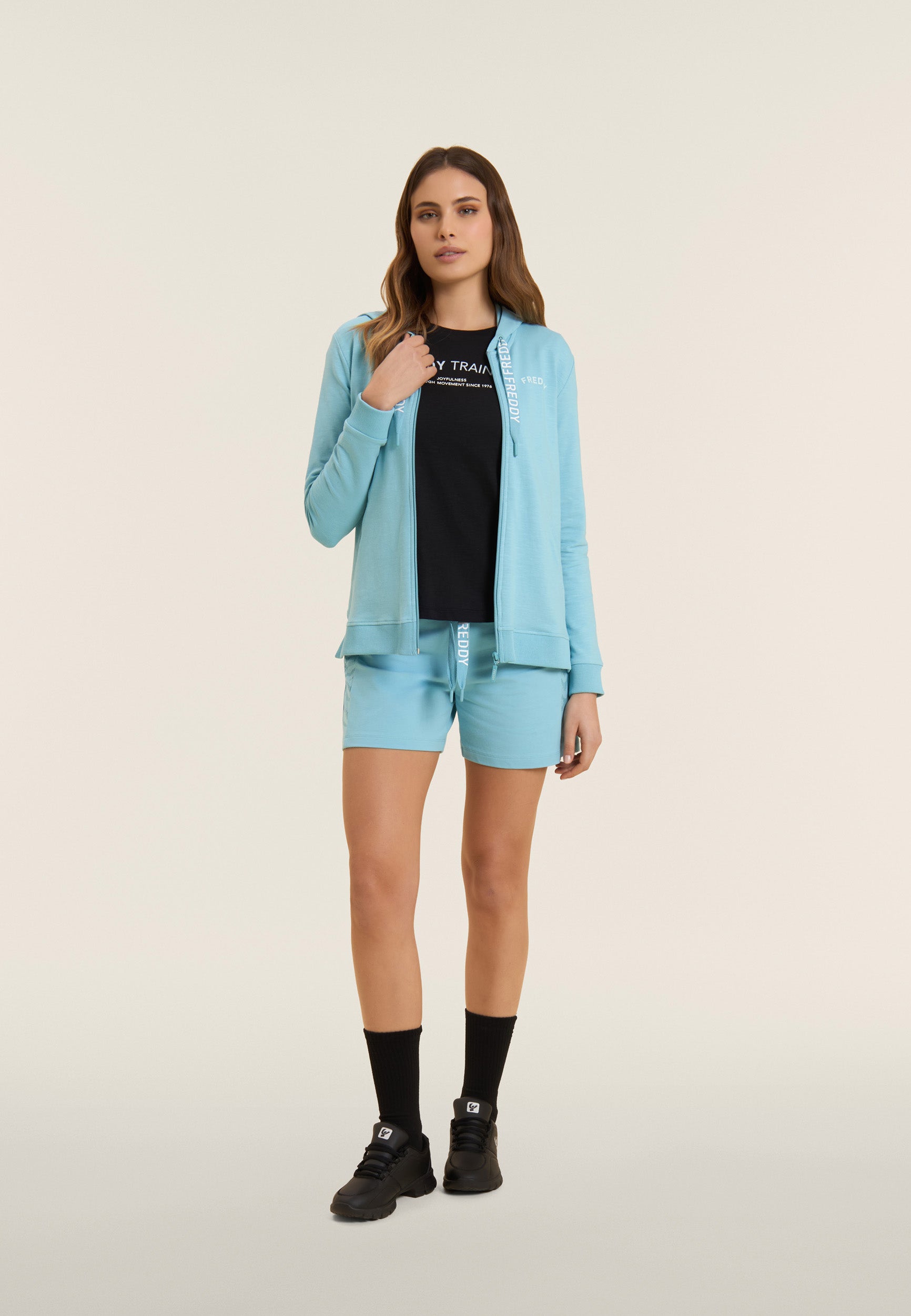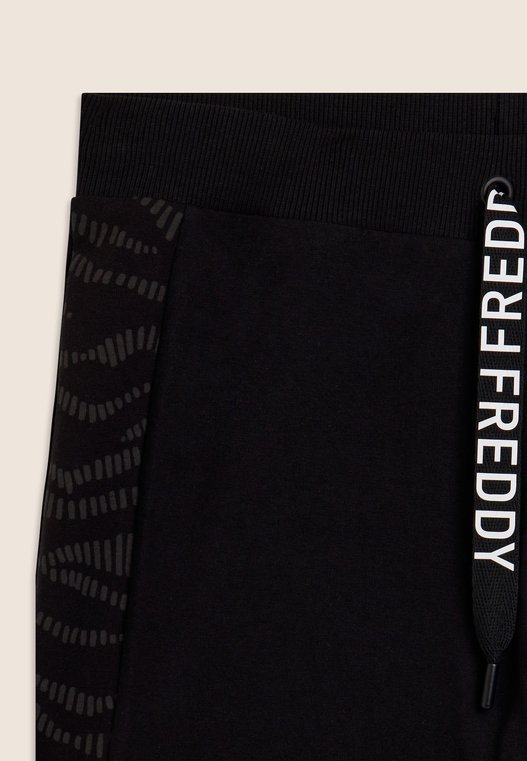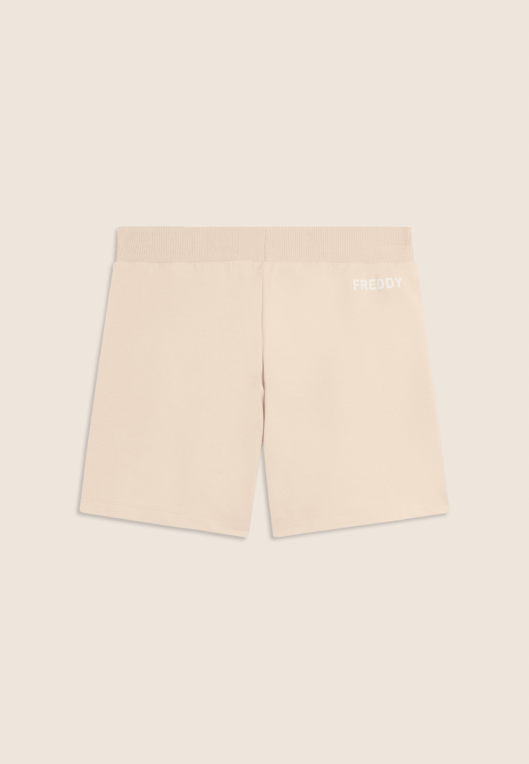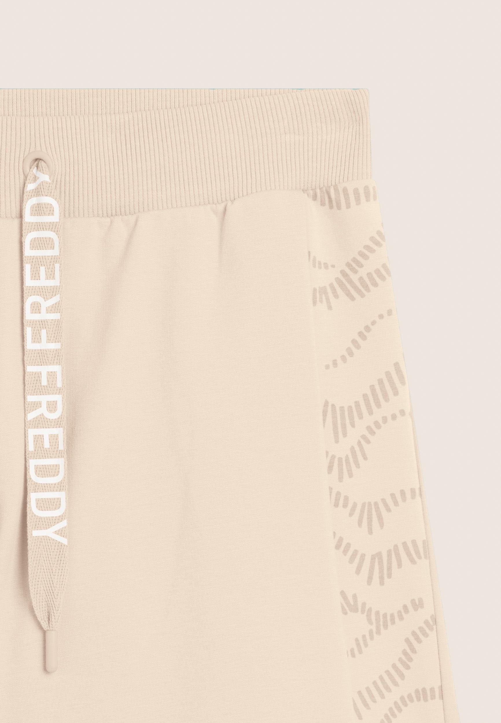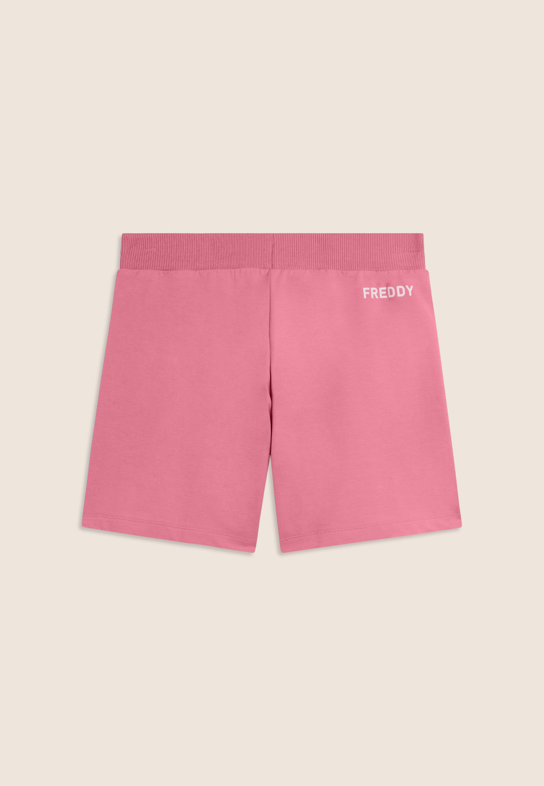 Regular-fit shorts, straight bottom, ribbed waist and FREDDY logo drawstring. Side inserts with a wavy graphic pattern add character to the garment. The FREDDY glitter logo is placed on the left rear side. In stretch French terry, for a fresh and dynamic look.