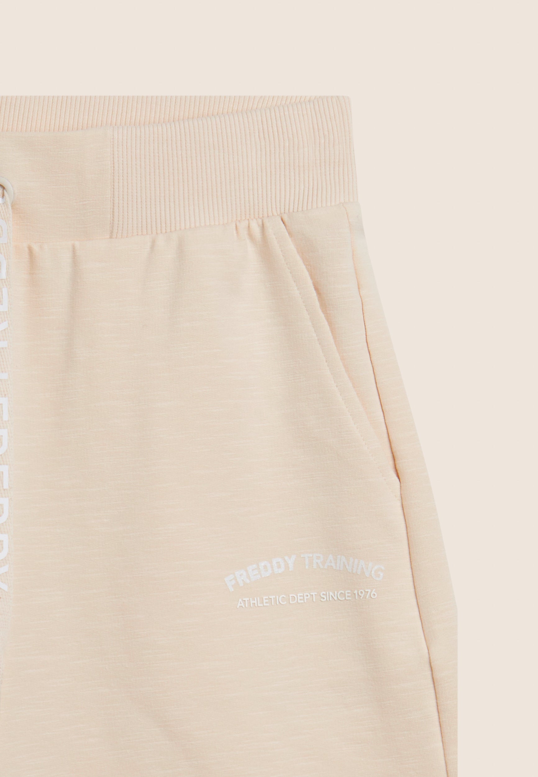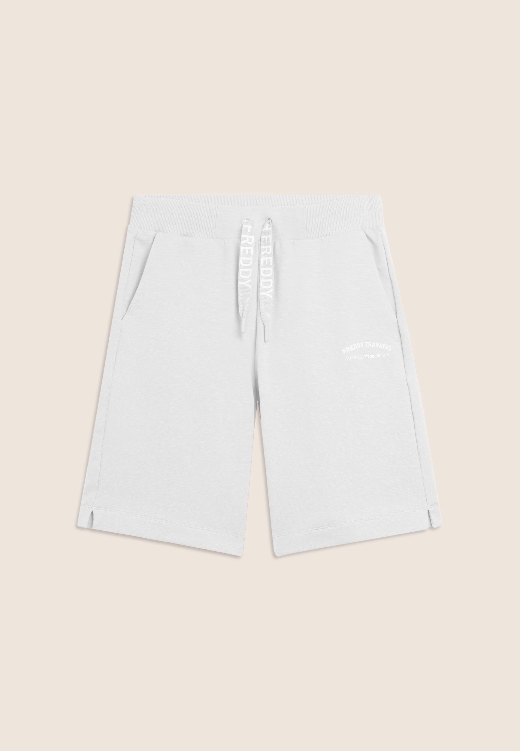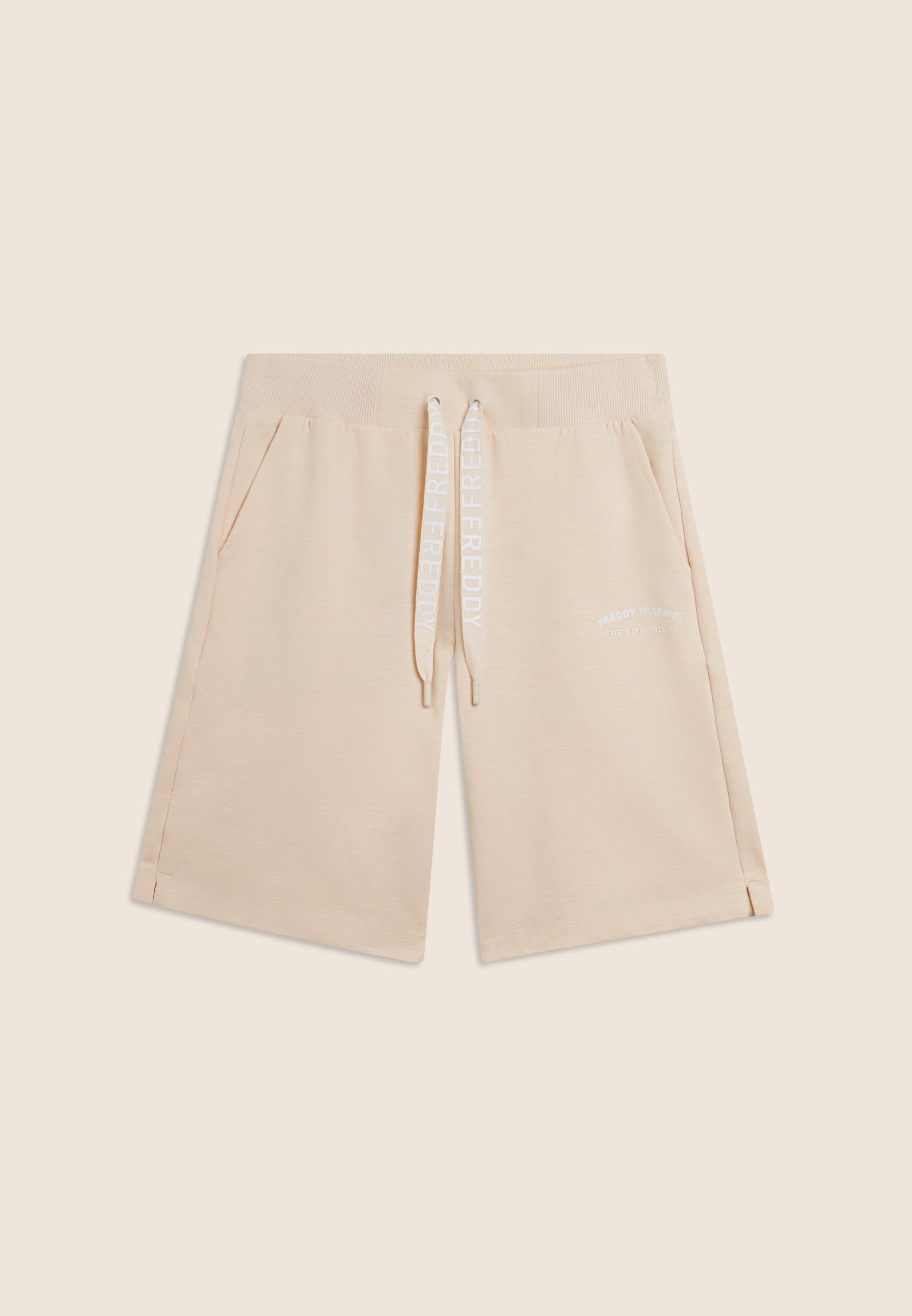 Regular-fit, above-the-knee-length shorts with a straight hem and small side slits. The FREDDY logoed drawstring adjusts the ribbed waistband. Small glitter graphic with FREDDY logo on the left side. Made of slub stretch French terry for a light and fresh style.