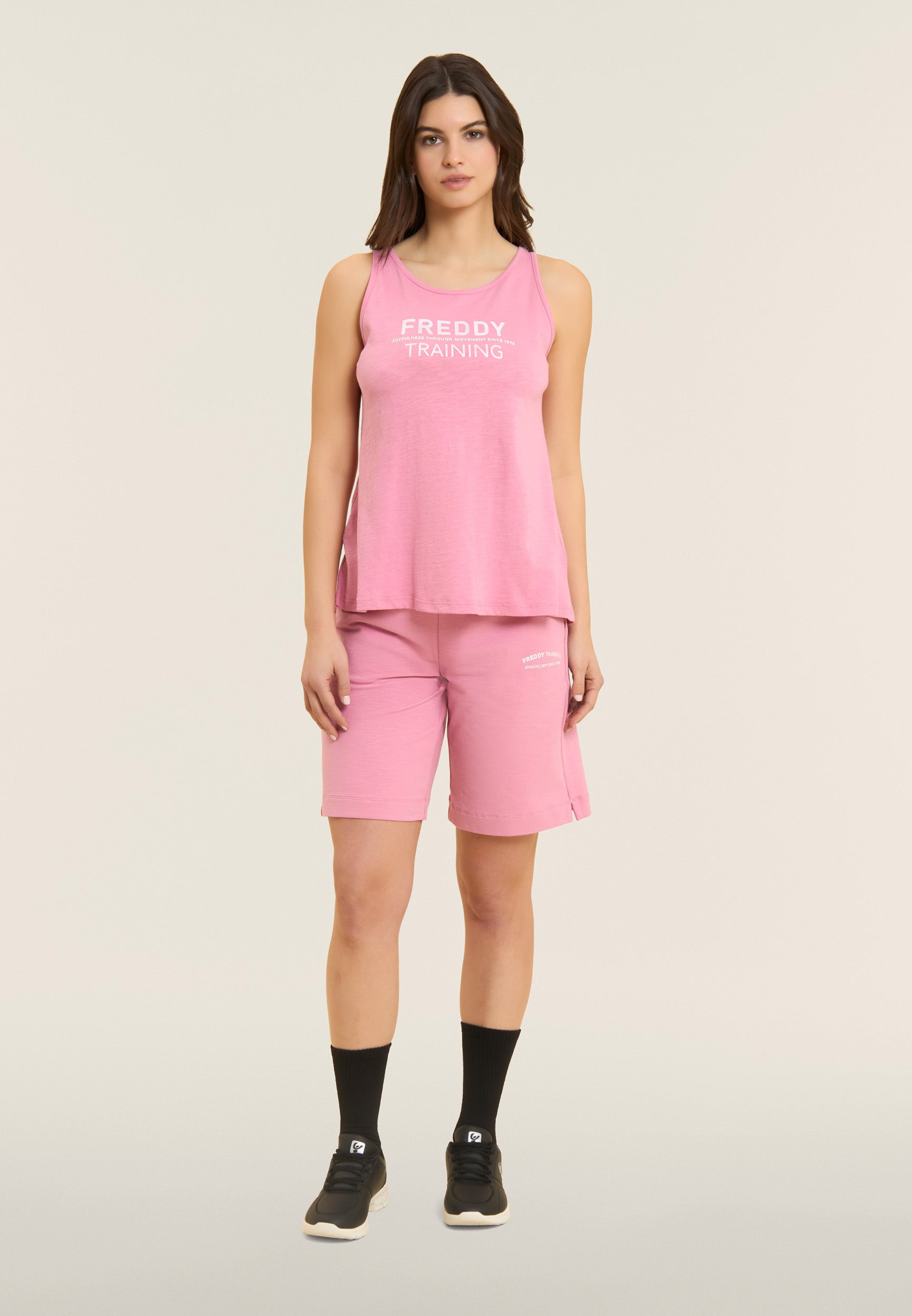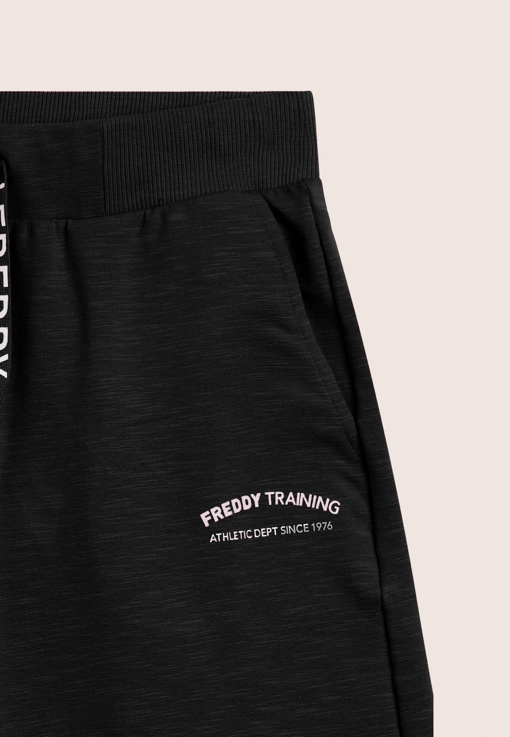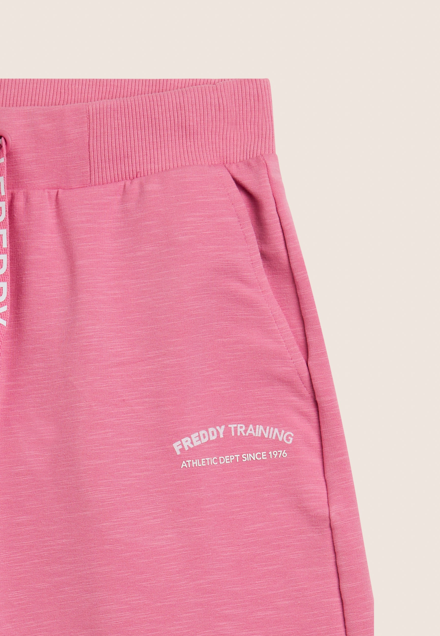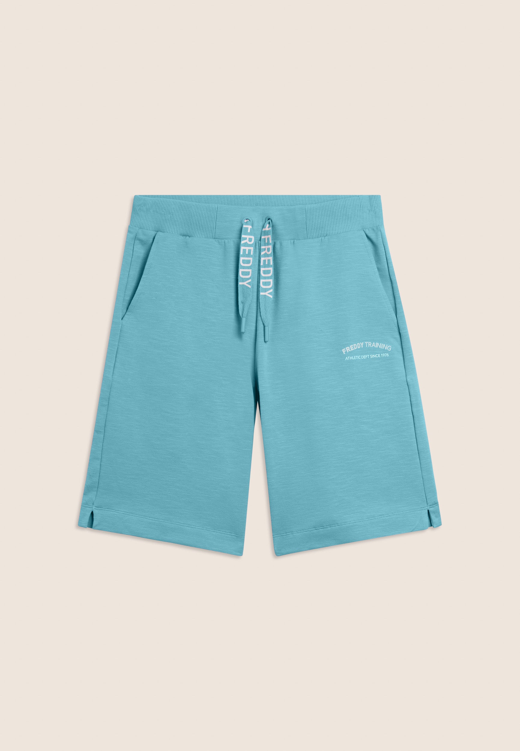 Regular-fit, above-the-knee-length shorts with a straight hem and small side slits. The FREDDY logoed drawstring adjusts the ribbed waistband. Small glitter graphic with FREDDY logo on the left side. Made of slub stretch French terry for a light and fresh style.
