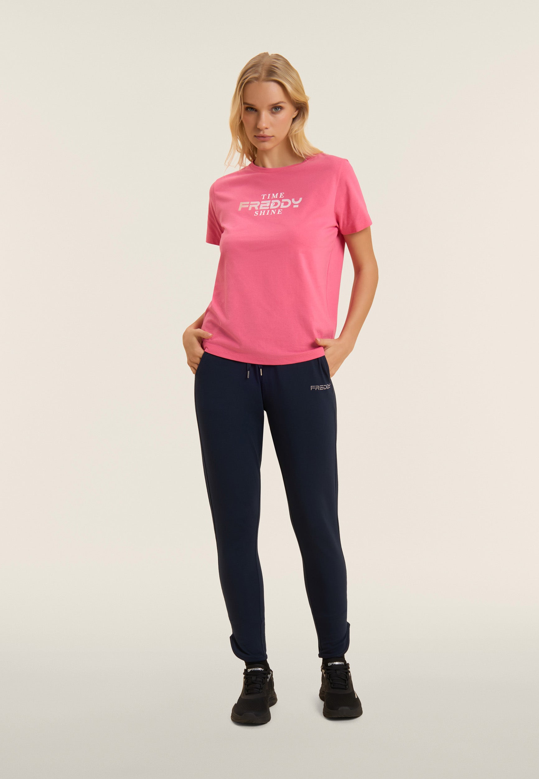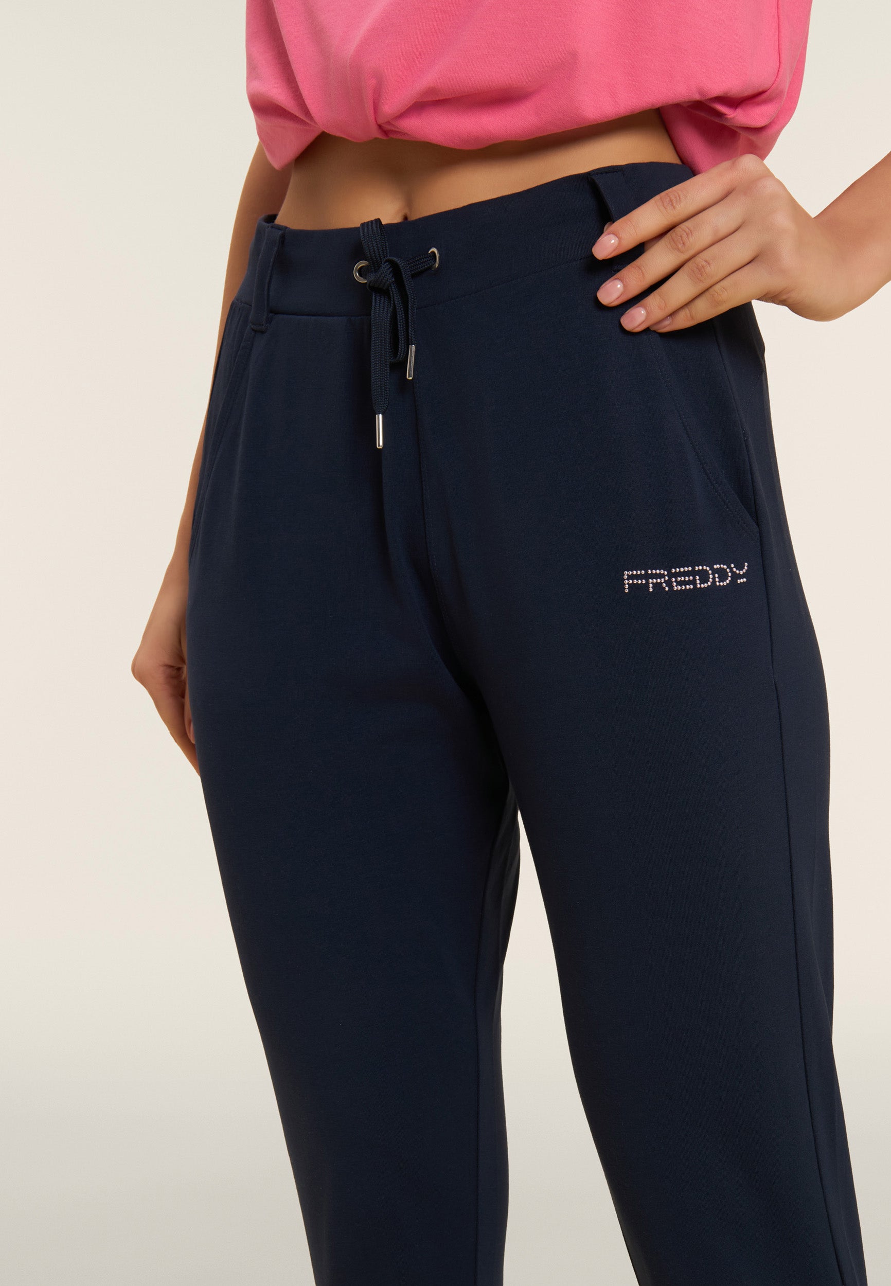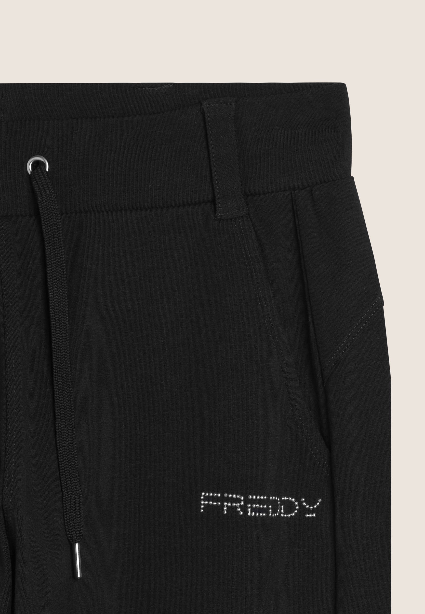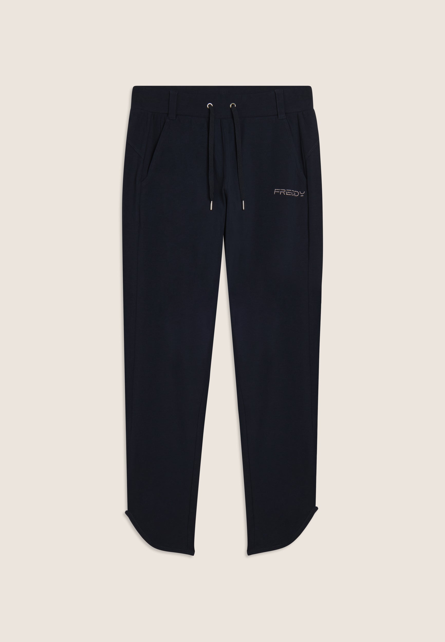 Slim fit athletic trousers with a straight leg and bottom with small side openings, ideal for a modern and functional look. The regular waist with belt loops and drawstrings allows for an adjustable fit. The FREDDY logo in light pink beads on the left pocket and the back yoke with heart-shaped stitching add a touch of style. Front besom pockets complete the practical design. Made of heavy cotton stretch jersey, they are perfect for any casual occasion.