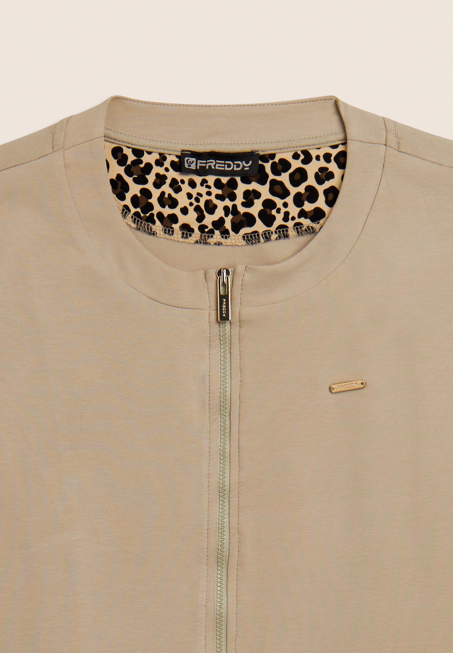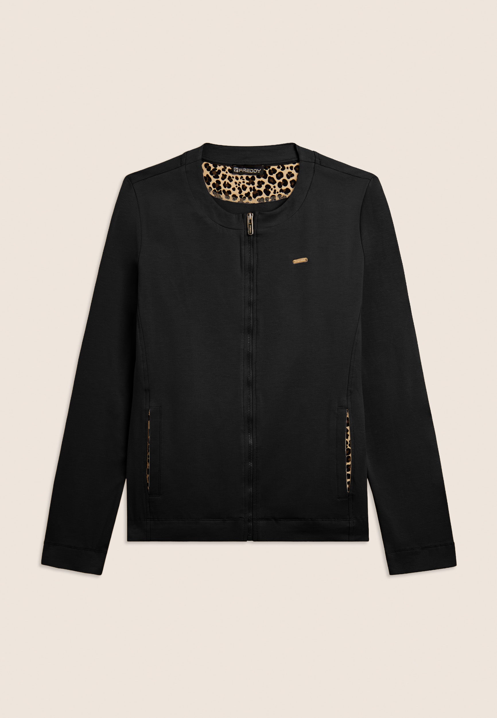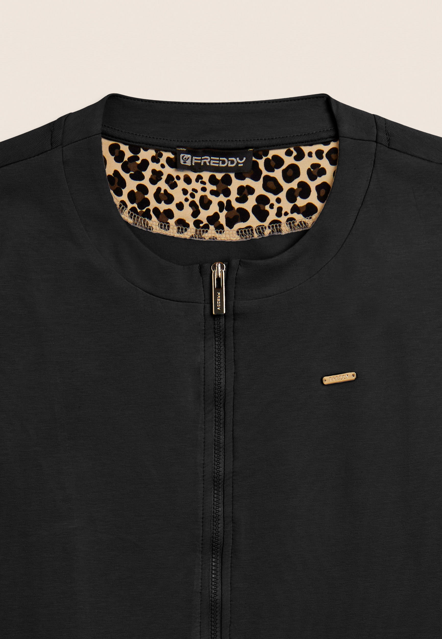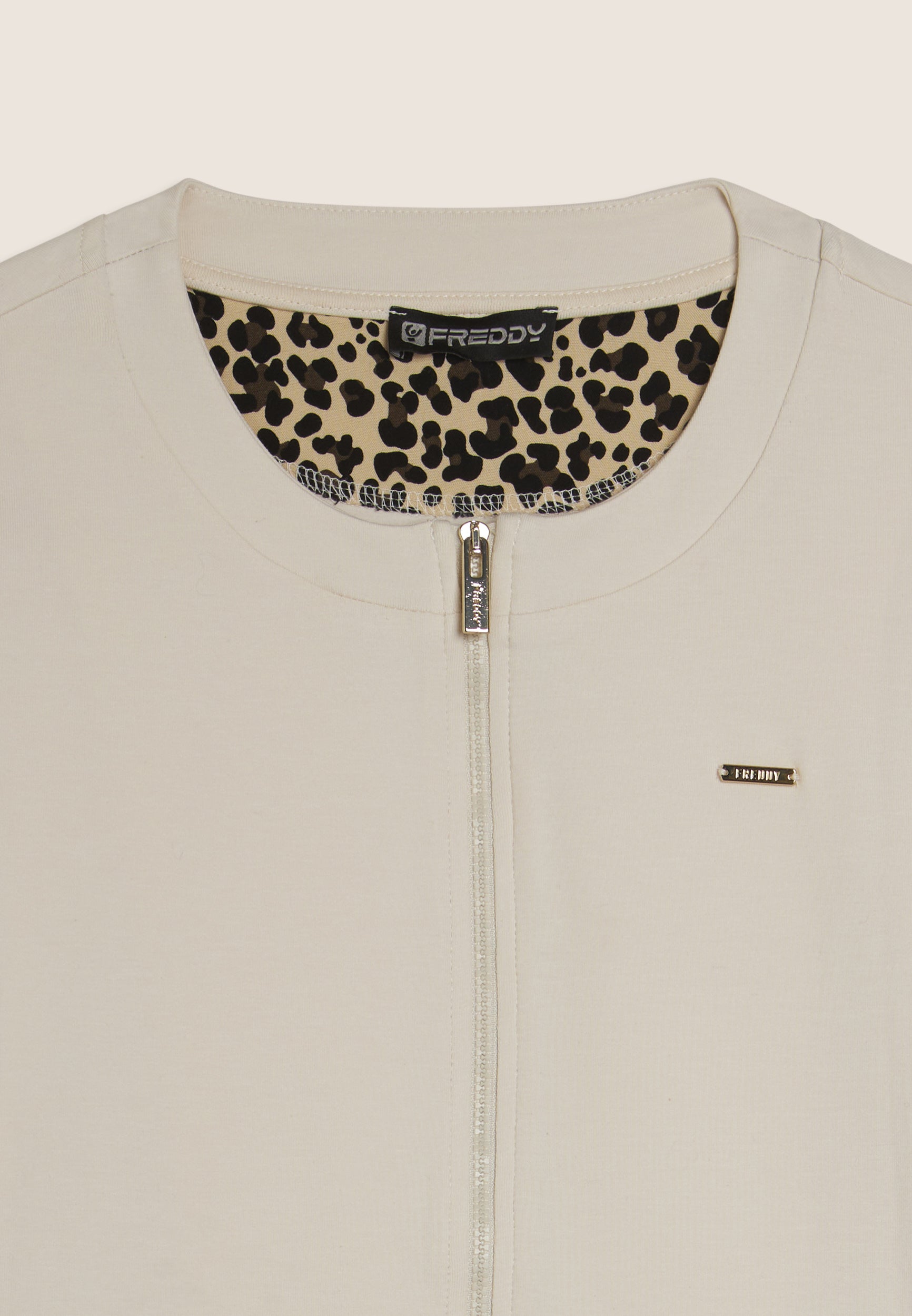Zip sweatshirt with crew neckline, featuring a slim fit and regular length and designed to enhance the silhouette. The zip is finished with an internal zip-cover flap in animal patterned viscose, and the crew neck features a matching internal insert. The stitching on the hips emphasises the close fit. The besom pockets guarantee functionality without weighing down the design. The small studded Freddy logo on the heart and the golden FREDDY logo tab on the left pocket opening complete the garment. Made of heavy cotton stretch jersey.