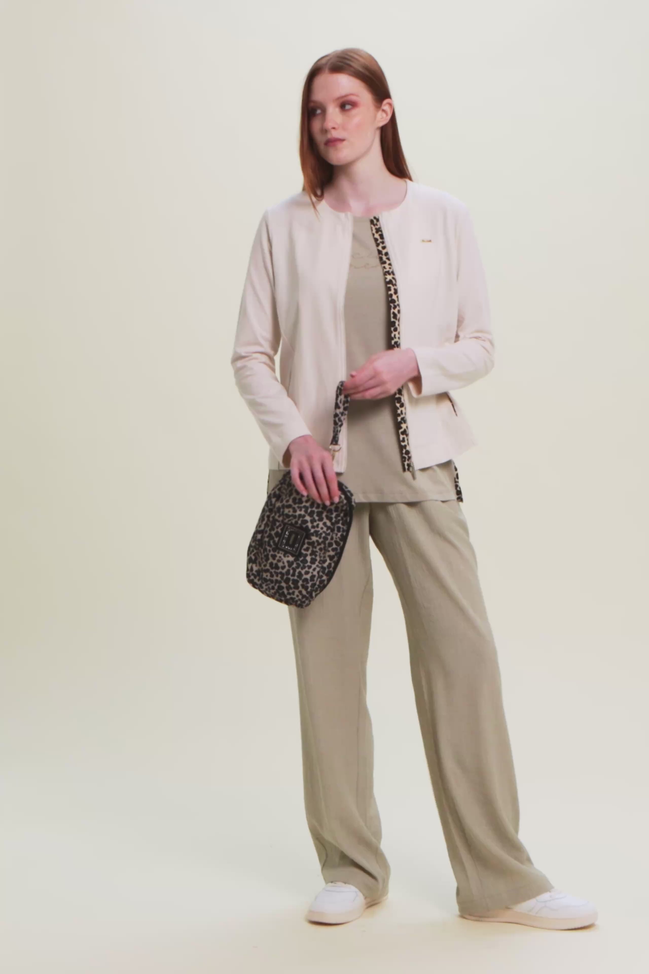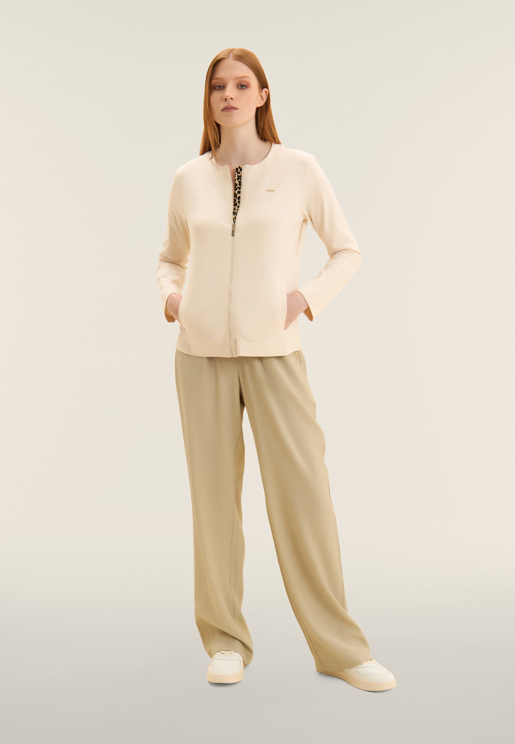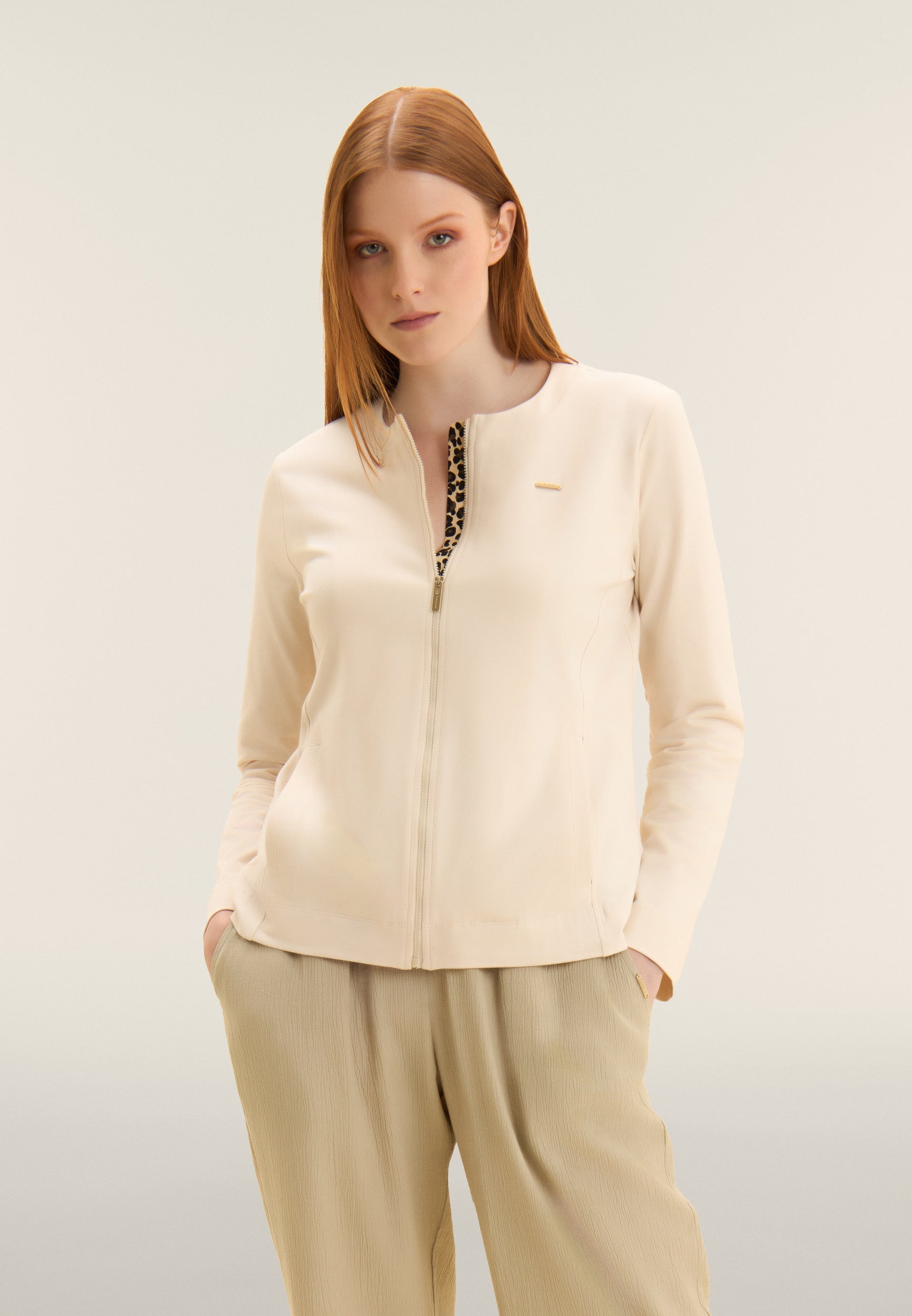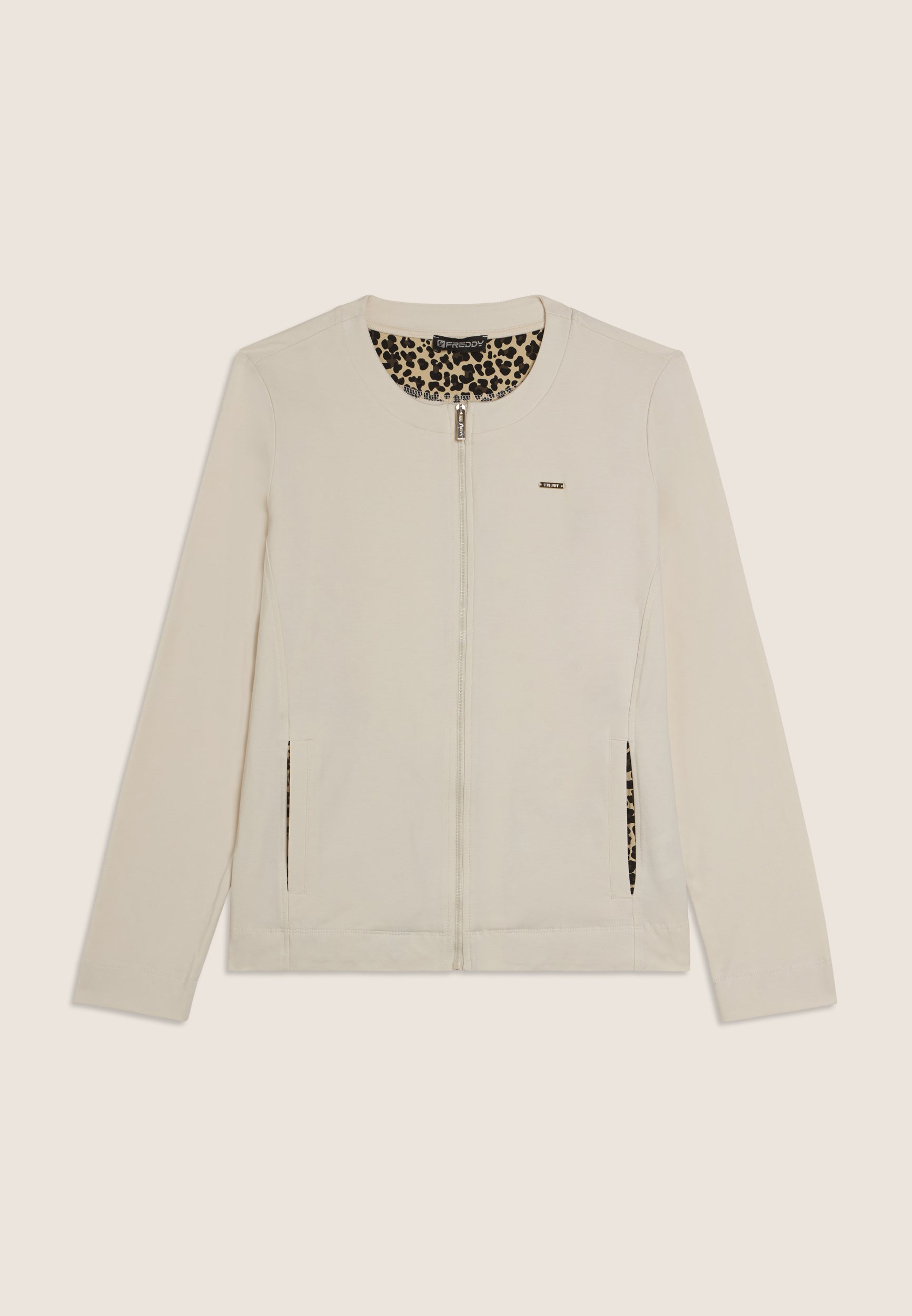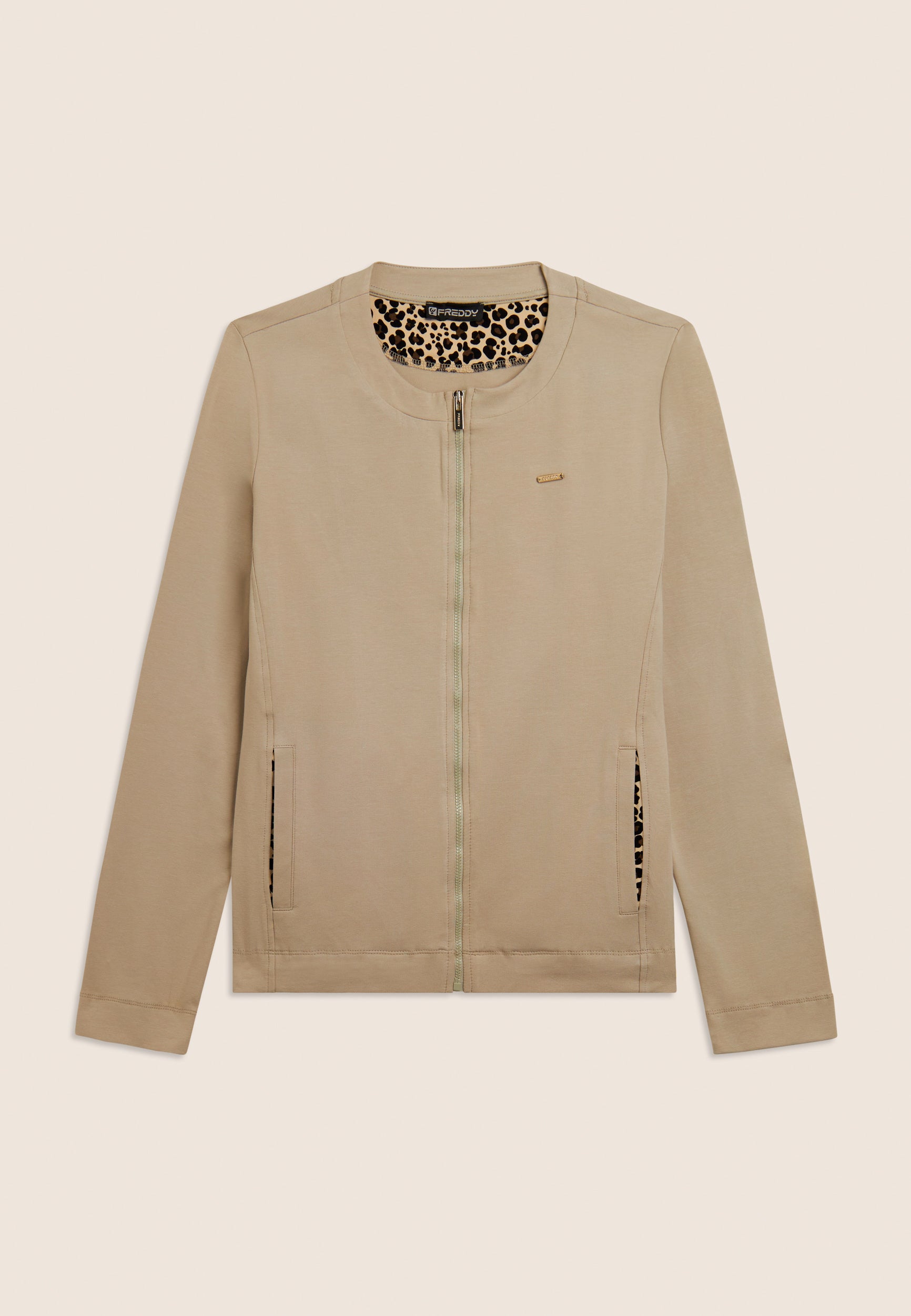 Zip sweatshirt with crew neckline, featuring a slim fit and regular length and designed to enhance the silhouette. The zip is finished with an internal zip-cover flap in animal patterned viscose, and the crew neck features a matching internal insert. The stitching on the hips emphasises the close fit. The besom pockets guarantee functionality without weighing down the design. The small studded Freddy logo on the heart and the golden FREDDY logo tab on the left pocket opening complete the garment. Made of heavy cotton stretch jersey.