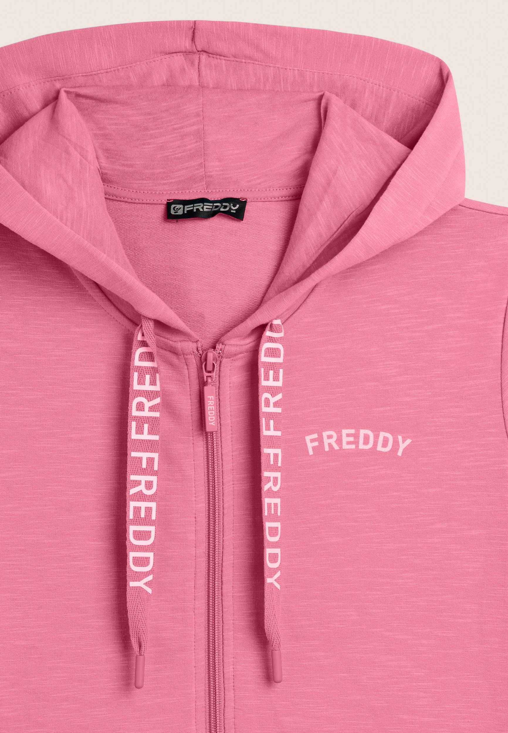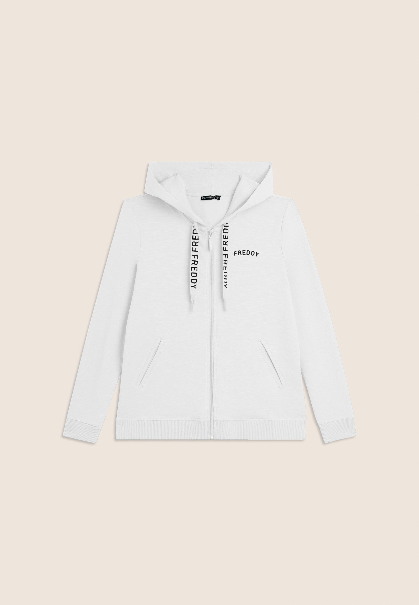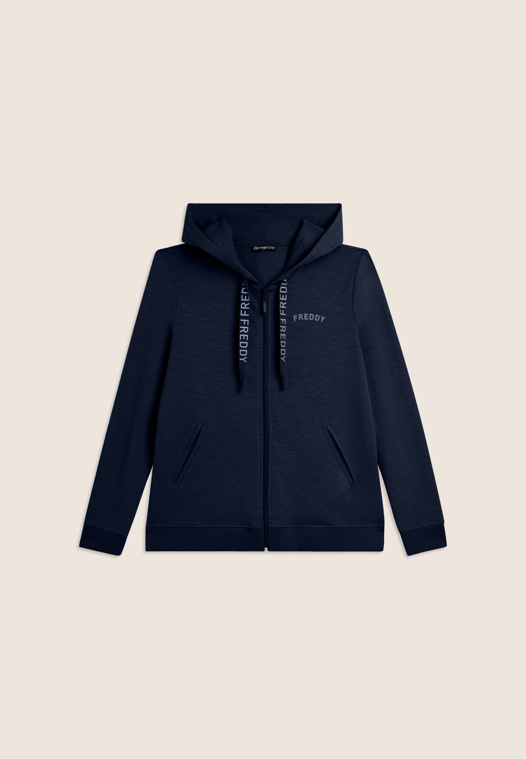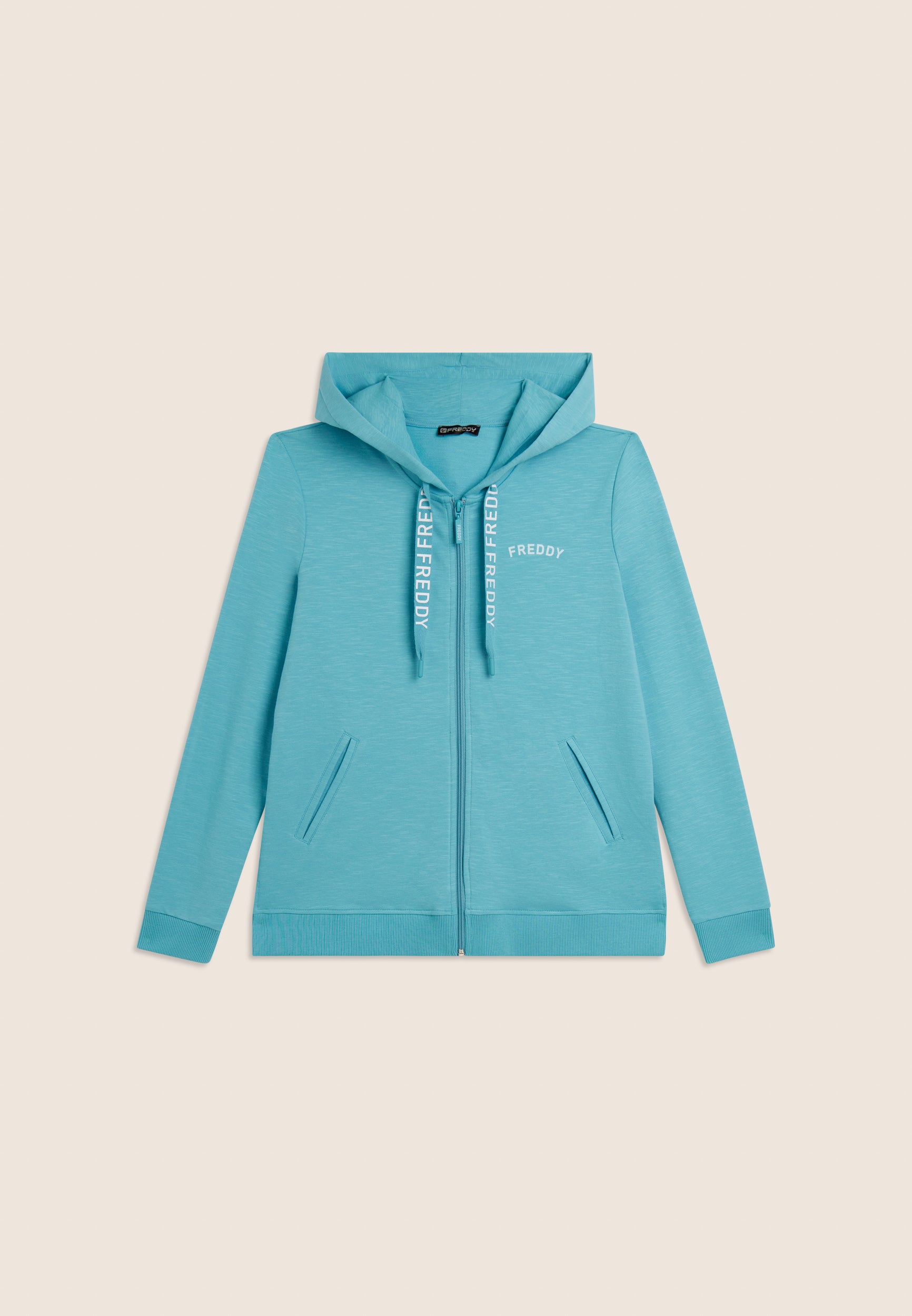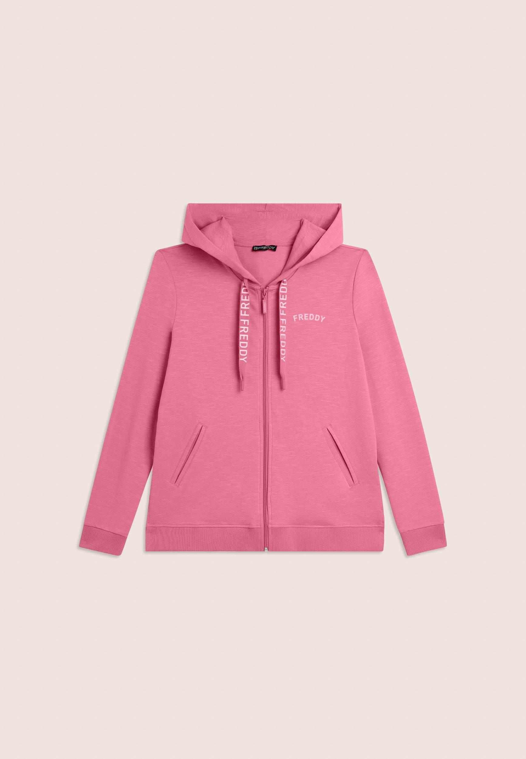 Zip hoodie, regular fit and perfect length for any casual occasion. The ribbed bottom, with side slits and a longer back, guarantees comfort and style. The slub jersey lined hood with FREDDY logo drawstrings adds a distinctive touch. Long sleeves with ribbed cuffs complete the design. A small FREDDY logo printed on the heart in white glitter and front besom pockets add to the practicality. Made of stretch French terry with a slub effect, this sweatshirt is ideal for mid-season or versatile year-round use.