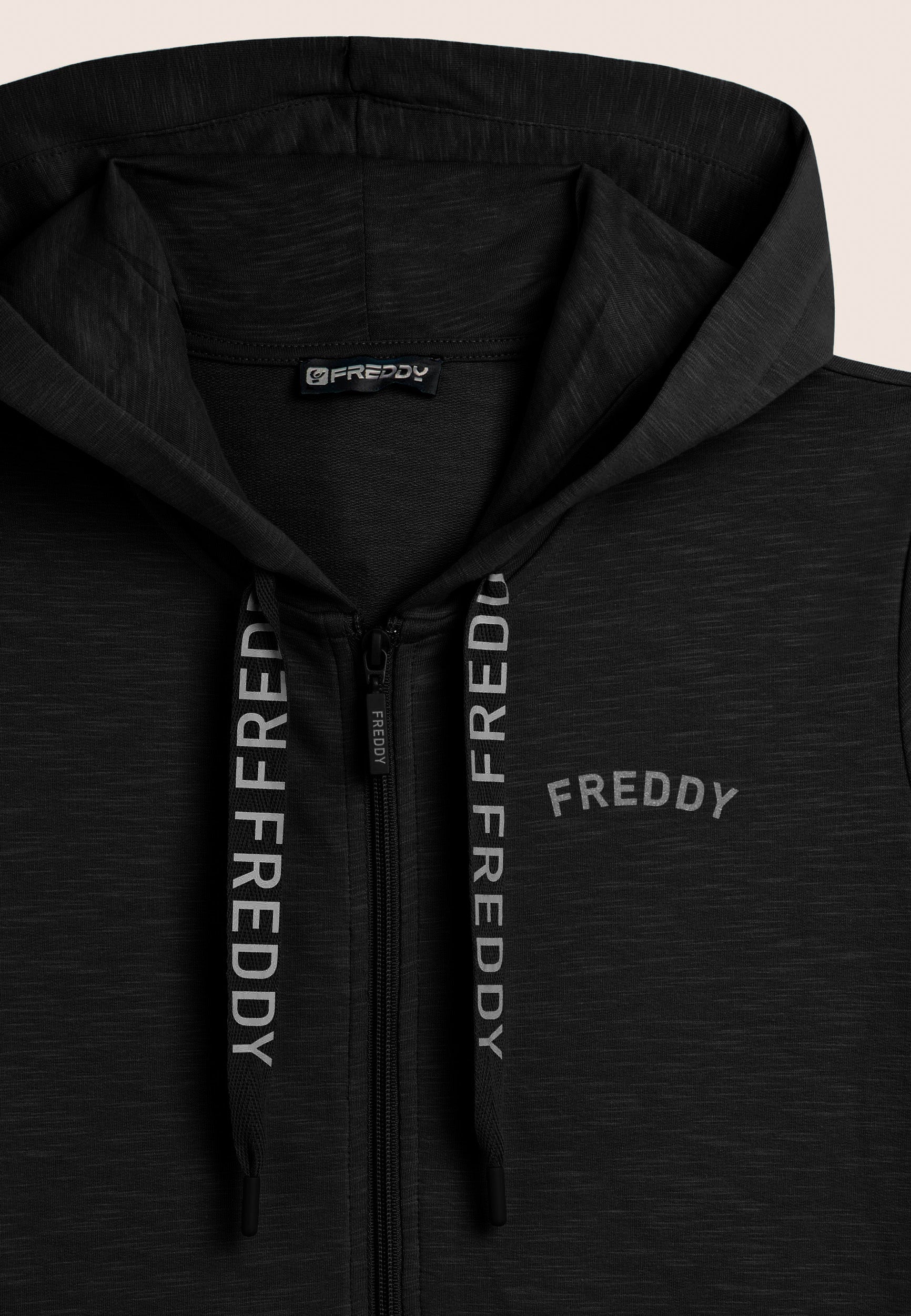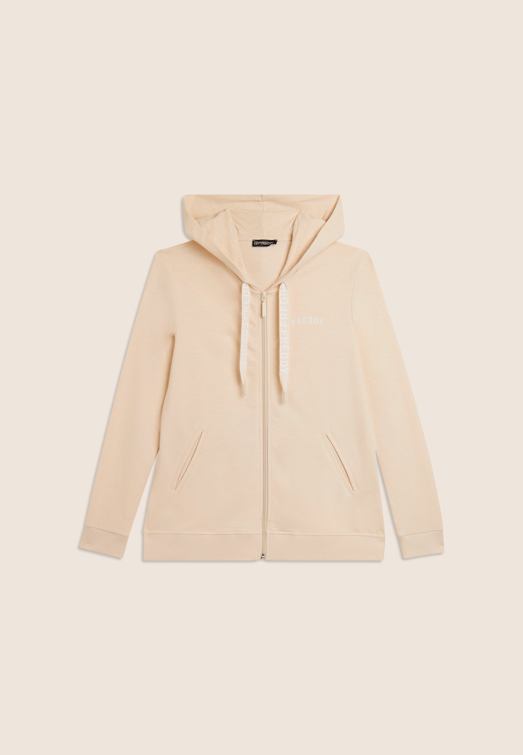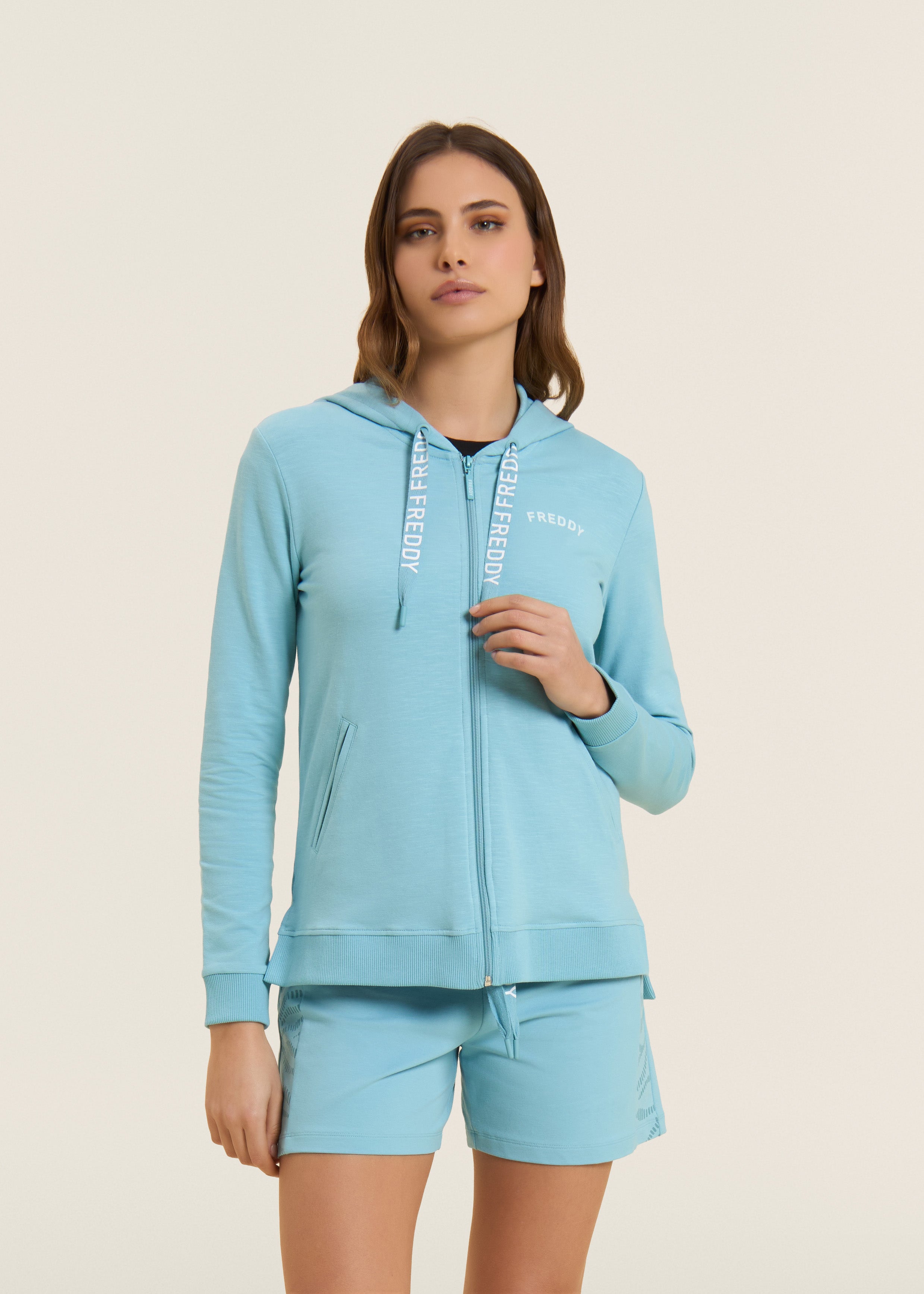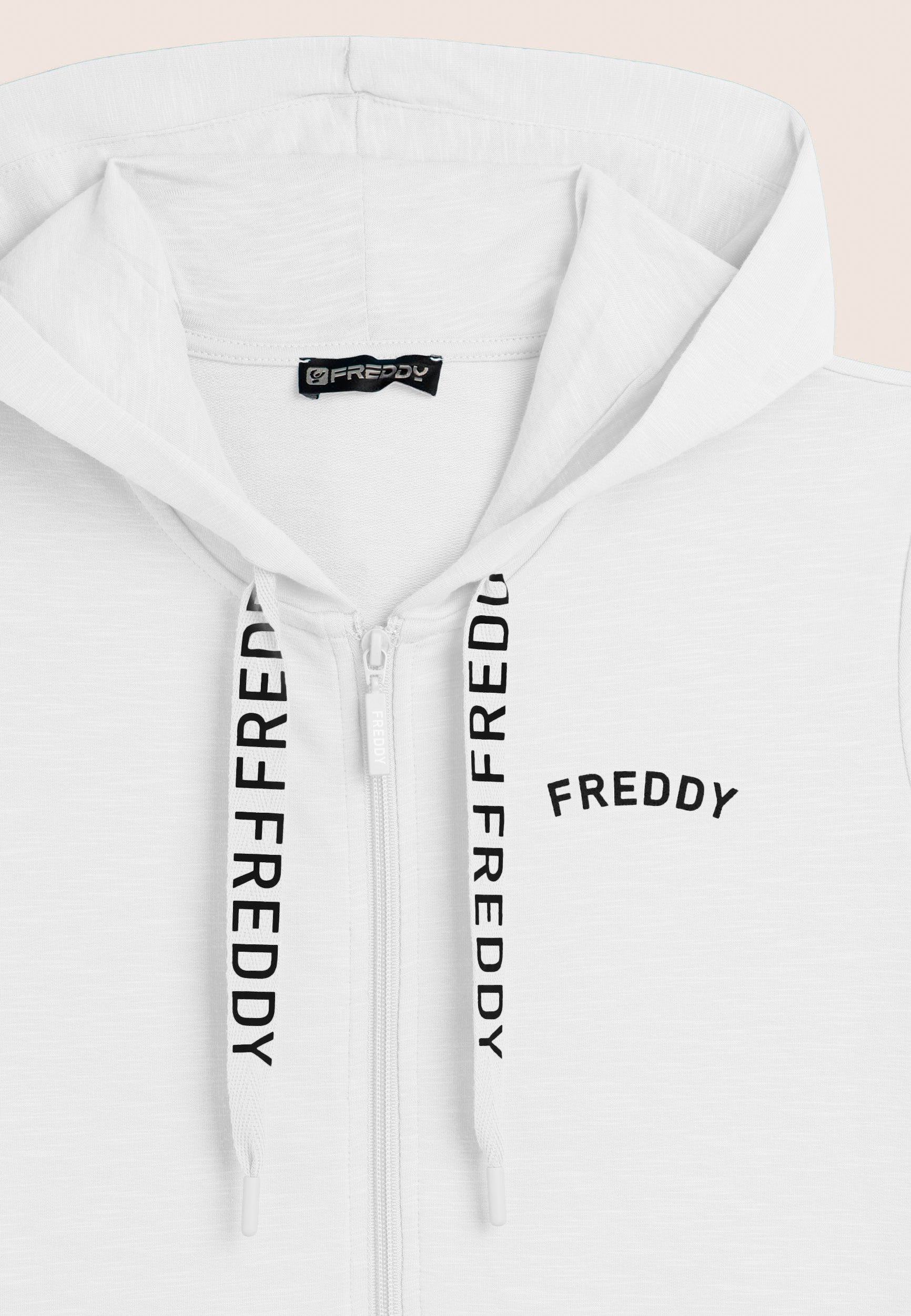 Zip hoodie, regular fit and perfect length for any casual occasion. The ribbed bottom, with side slits and a longer back, guarantees comfort and style. The slub jersey lined hood with FREDDY logo drawstrings adds a distinctive touch. Long sleeves with ribbed cuffs complete the design. A small FREDDY logo printed on the heart in white glitter and front besom pockets add to the practicality. Made of stretch French terry with a slub effect, this sweatshirt is ideal for mid-season or versatile year-round use.