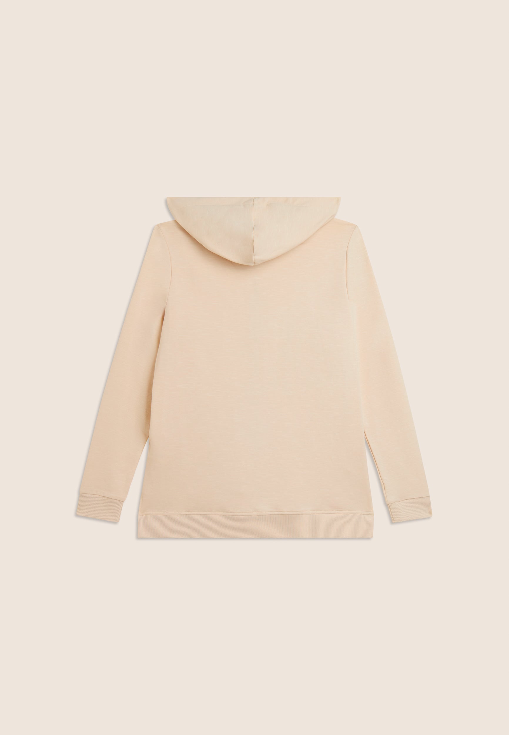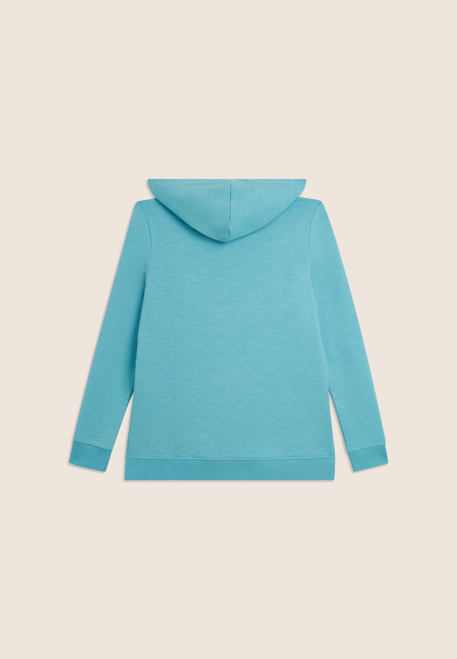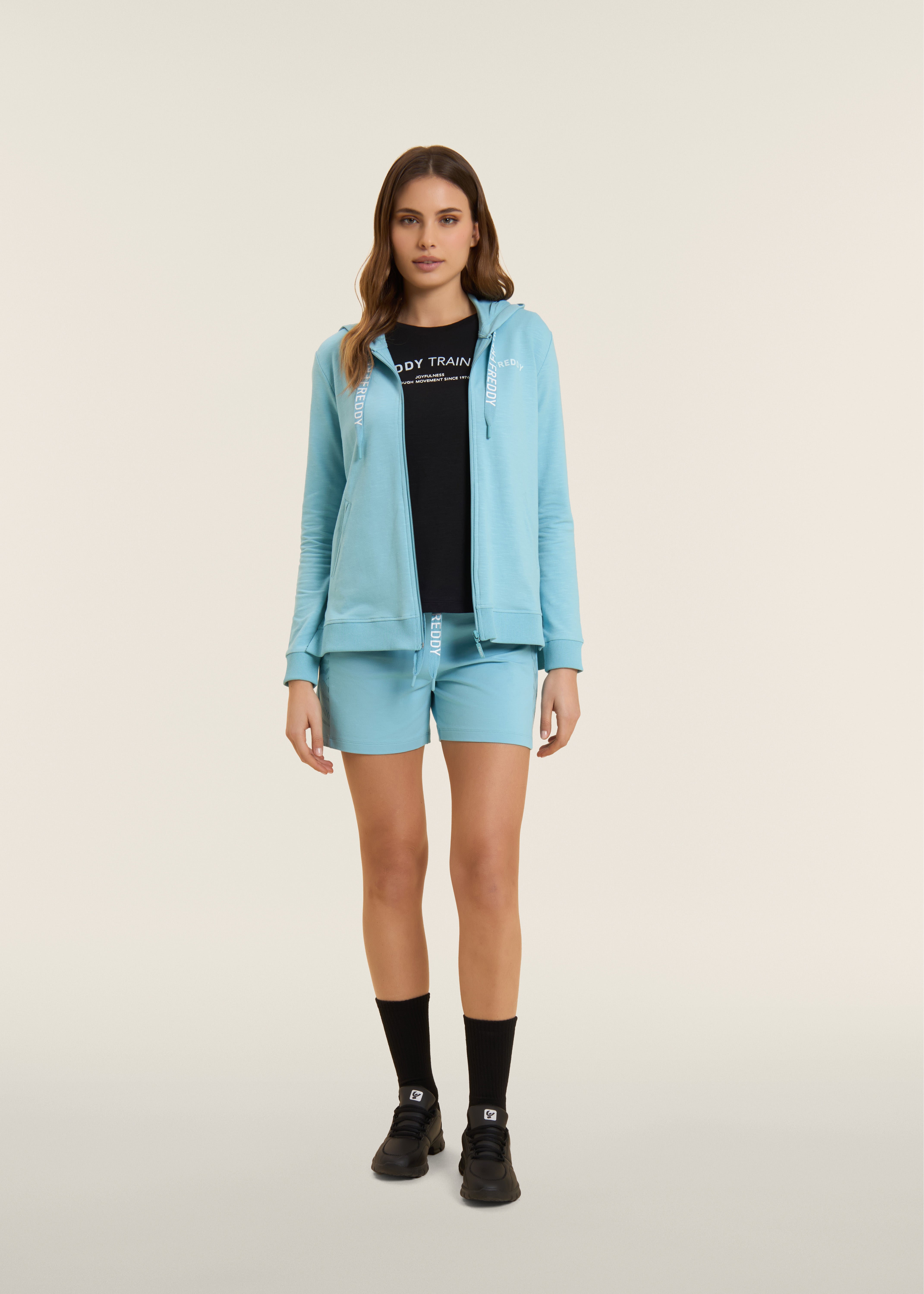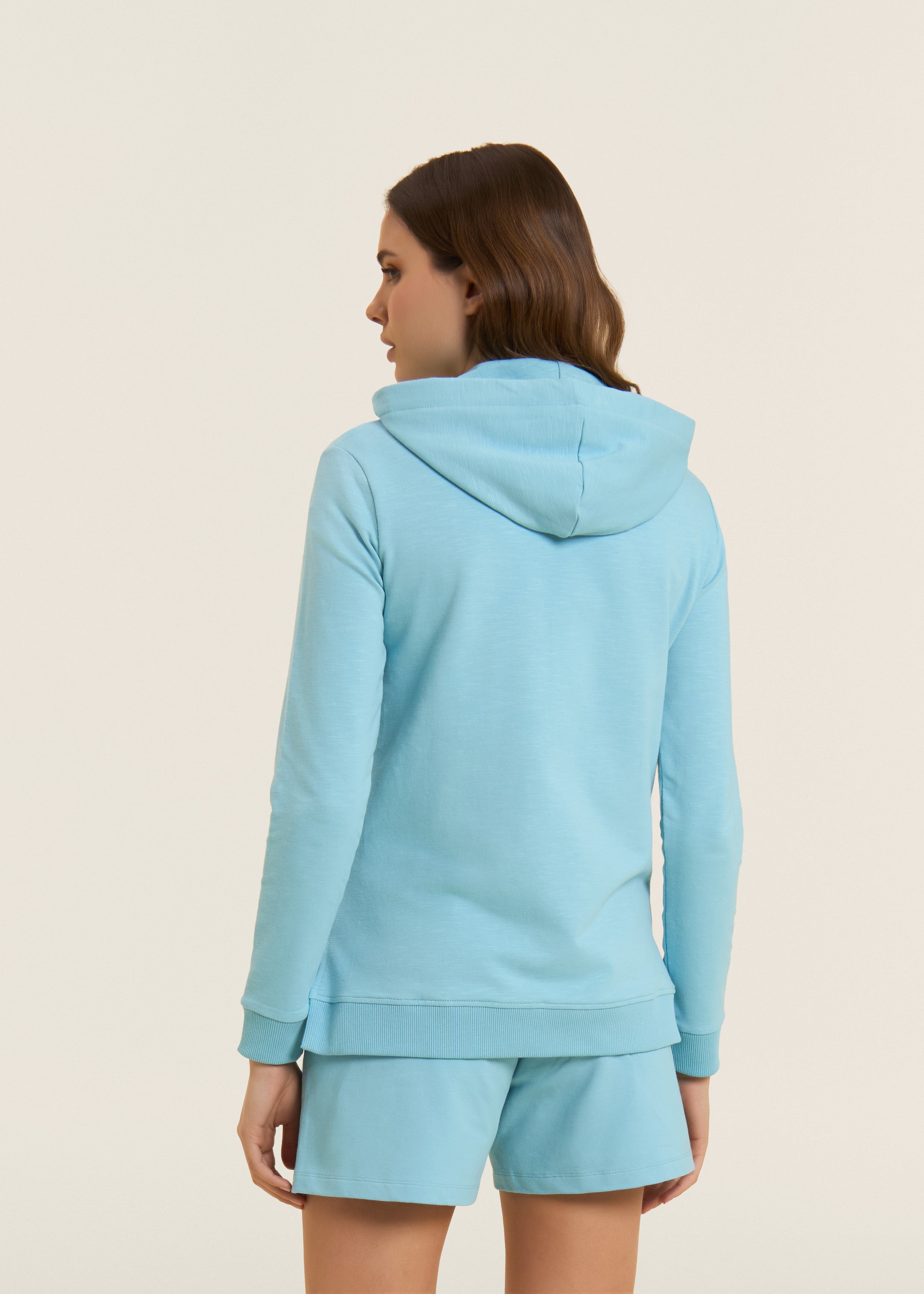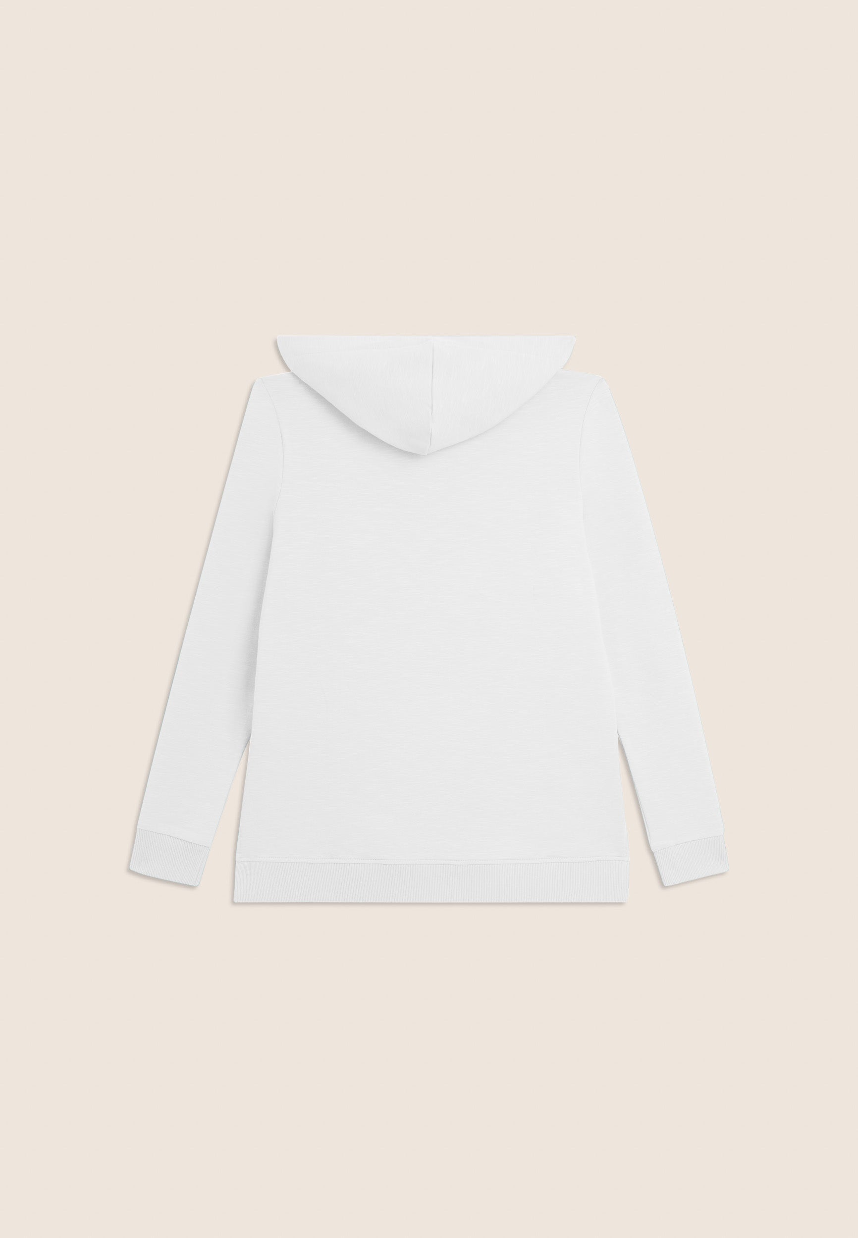 Zip hoodie, regular fit and perfect length for any casual occasion. The ribbed bottom, with side slits and a longer back, guarantees comfort and style. The slub jersey lined hood with FREDDY logo drawstrings adds a distinctive touch. Long sleeves with ribbed cuffs complete the design. A small FREDDY logo printed on the heart in white glitter and front besom pockets add to the practicality. Made of stretch French terry with a slub effect, this sweatshirt is ideal for mid-season or versatile year-round use.