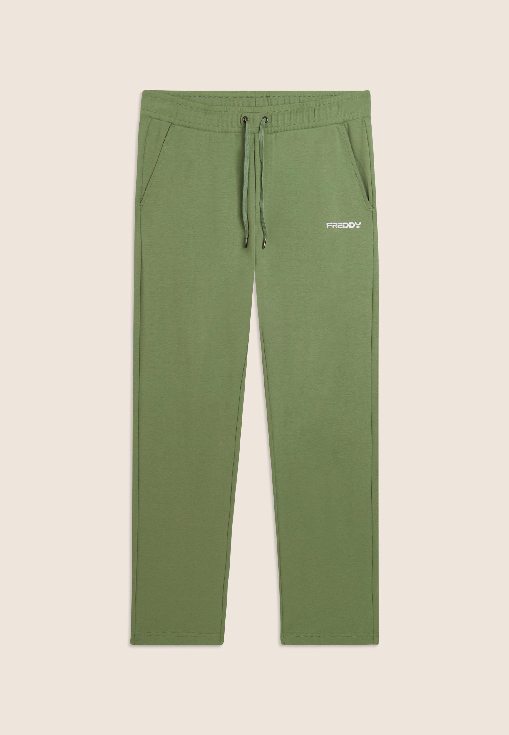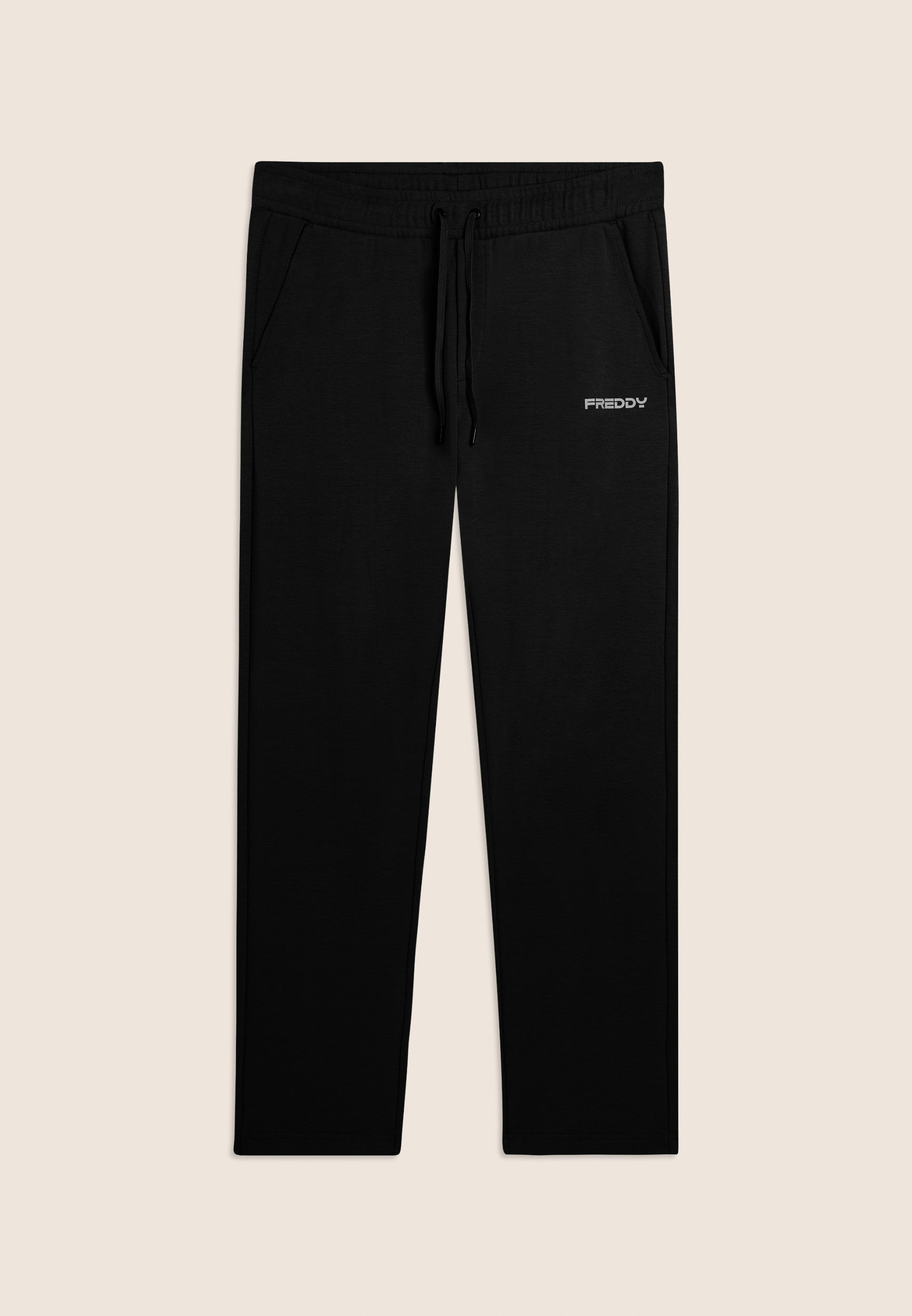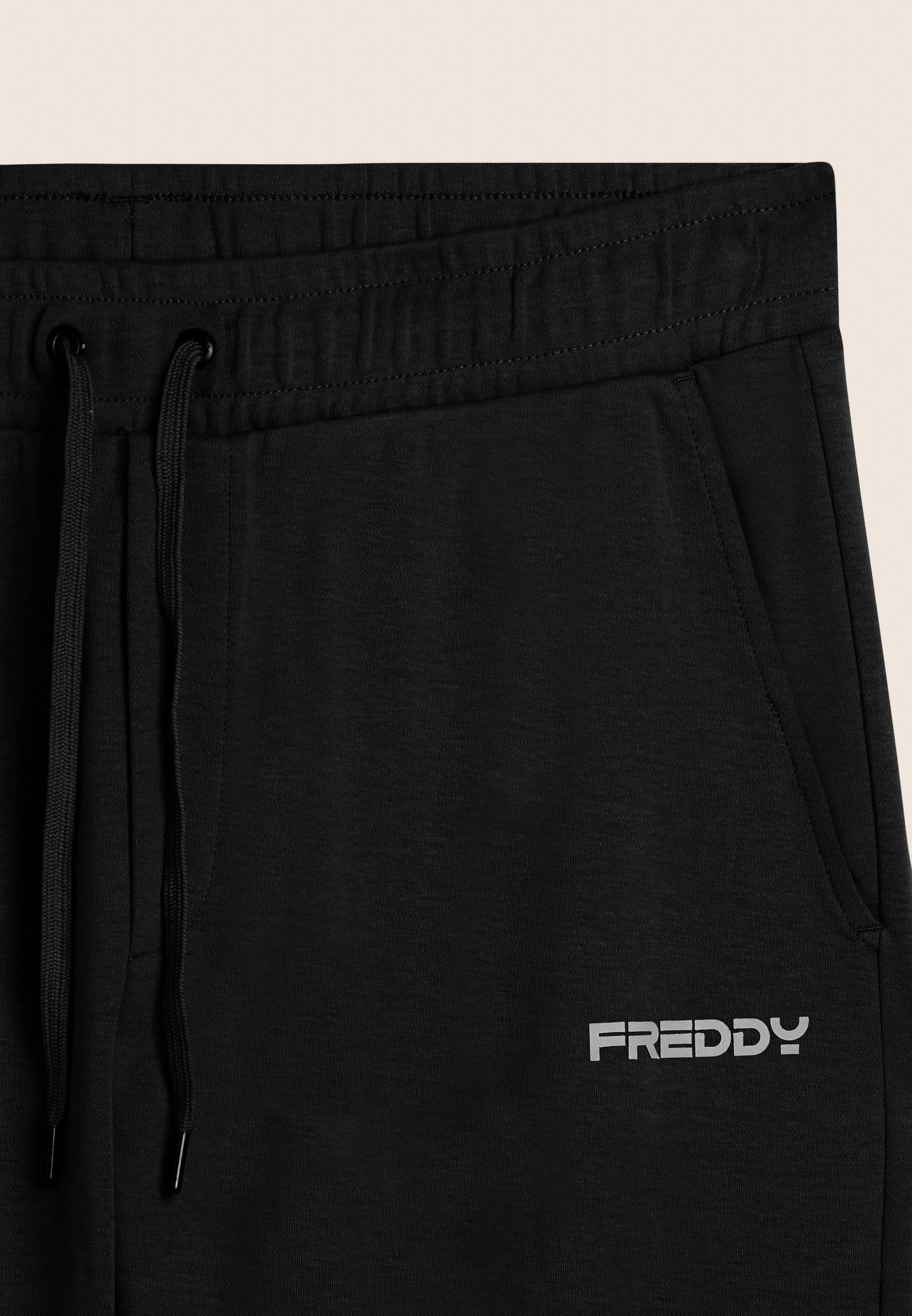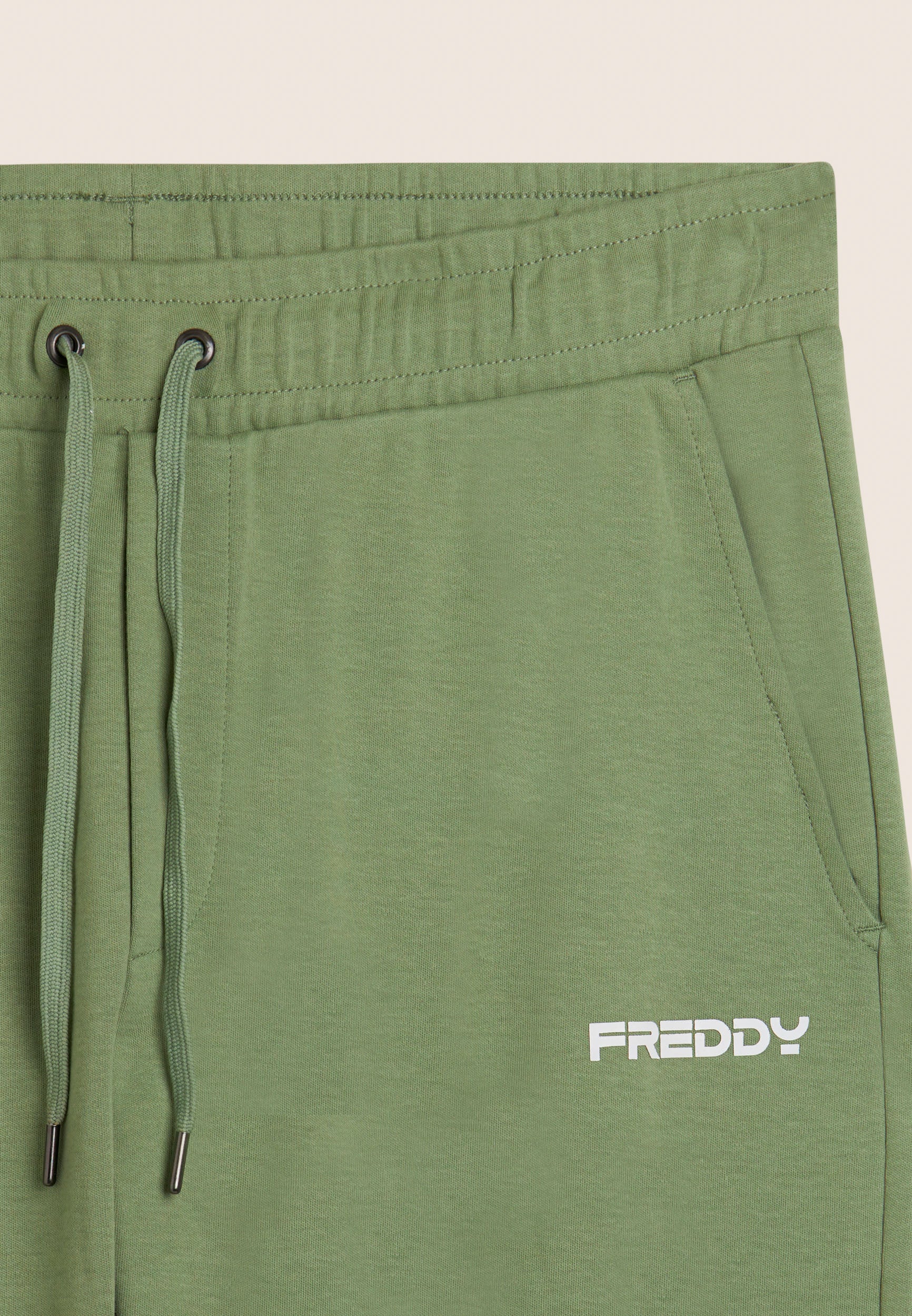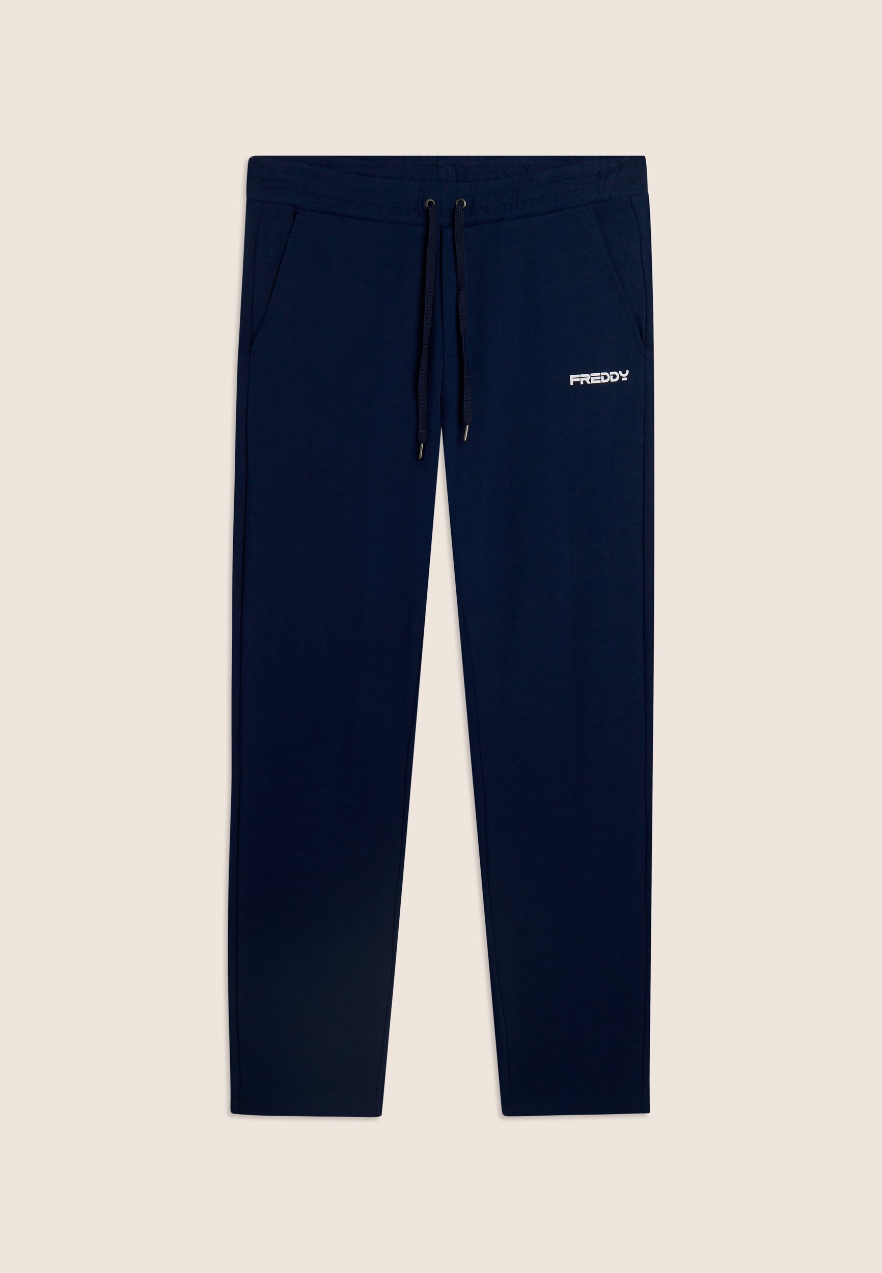 100% cotton interlock athletic trousers, ideal for a relaxed and functional look. Regular fit, full length. Waistband with inner elastic and drawstring, straight regular leg. Front French pockets and back right breast pocket. The matt rubberised FREDDY logo print is positioned on the left hip. A comfortable and well-finished garment, perfect for mid-season.
