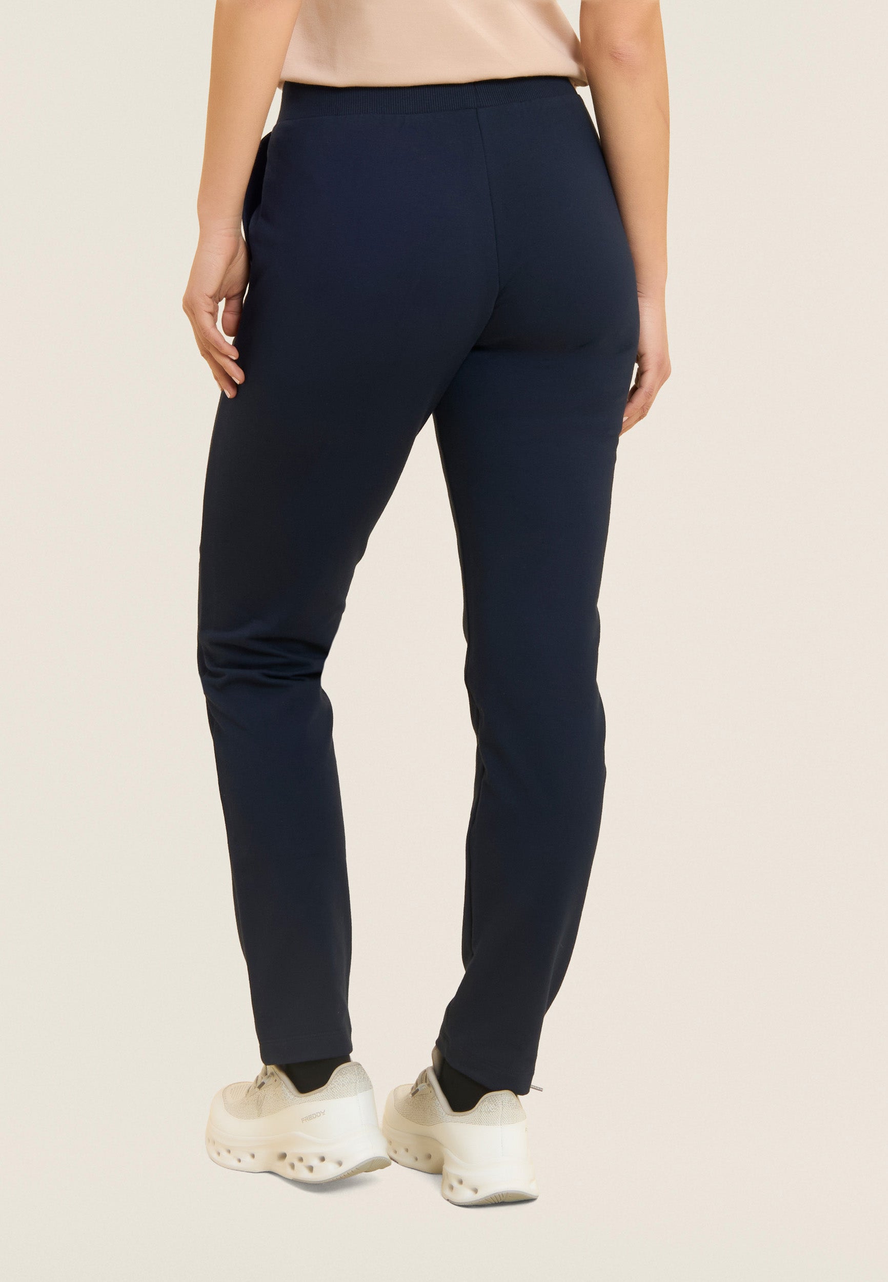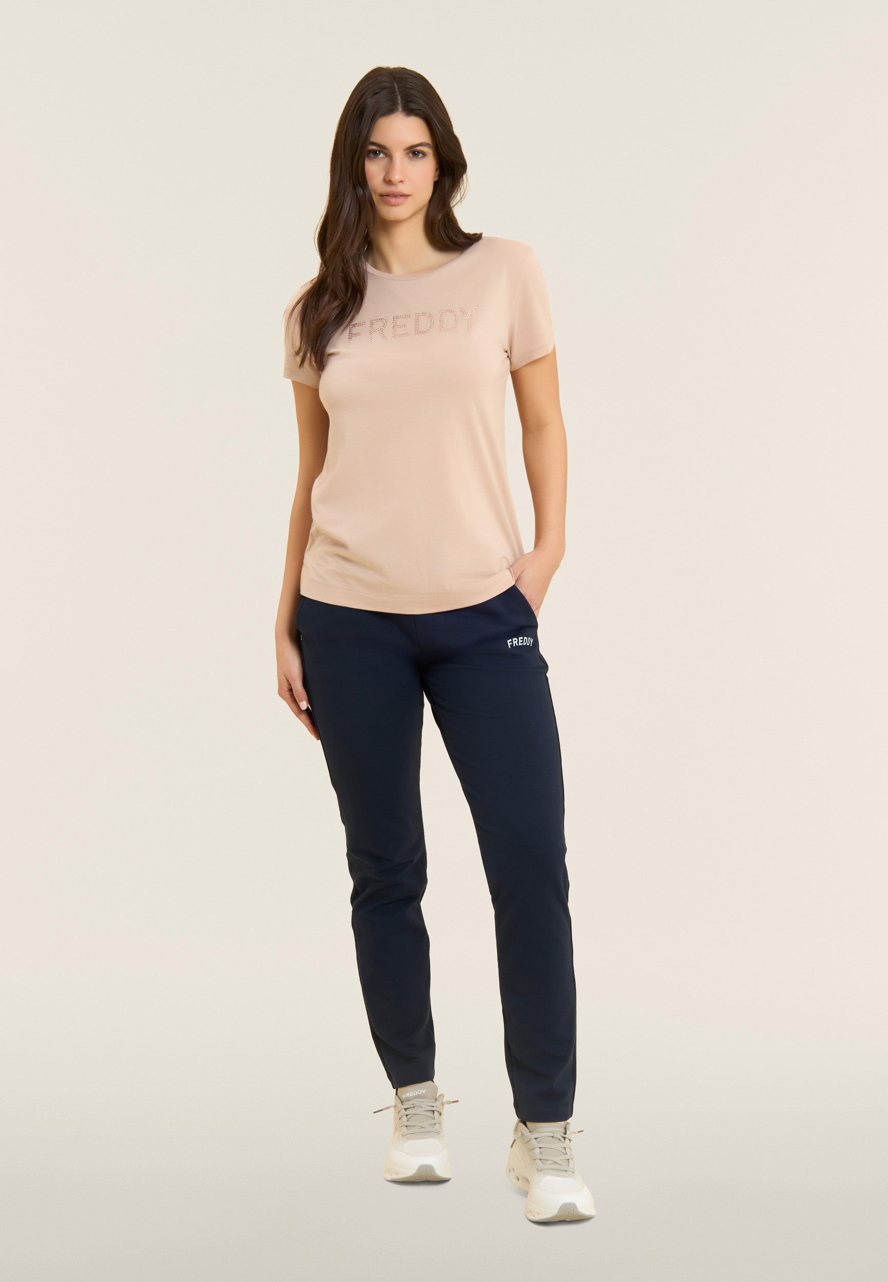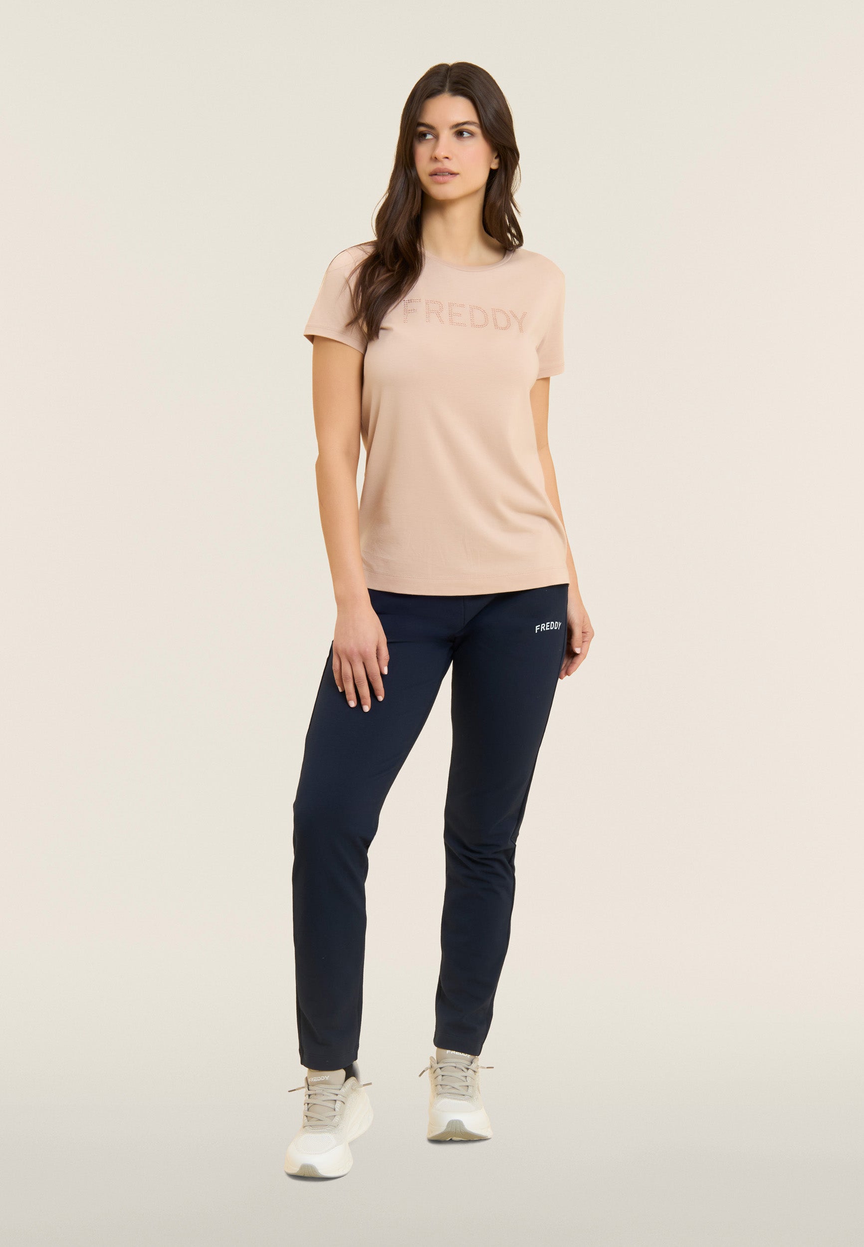 Regular-fit athletic trousers with straight leg and ribbed waistband with FREDDY logo drawstring. The small white glitter logo decorates the left side, adding style to a functional and comfortable garment. Besom pockets complete the essential design. Made of stretch French terry, they are ideal for dynamic leisure and everyday use.